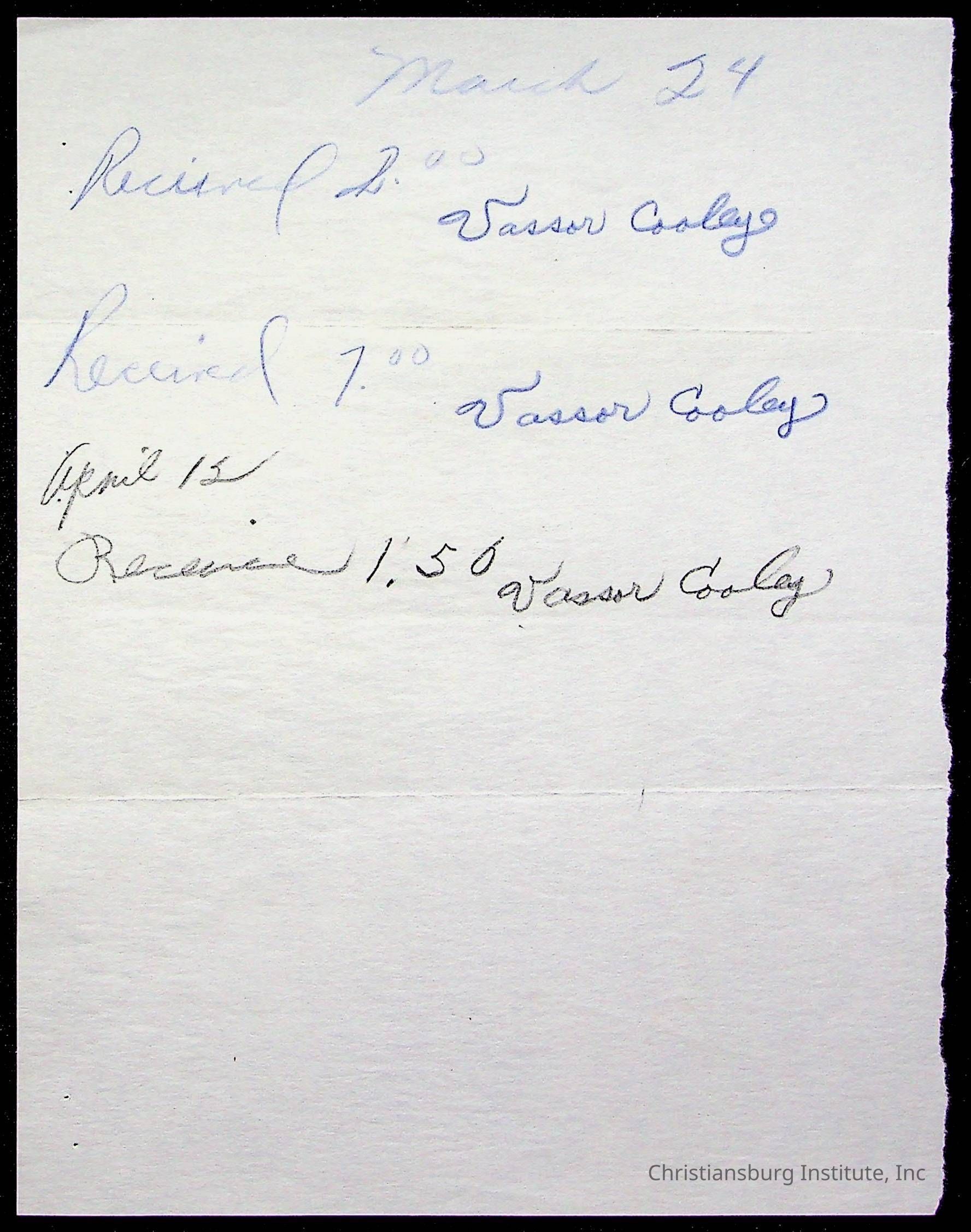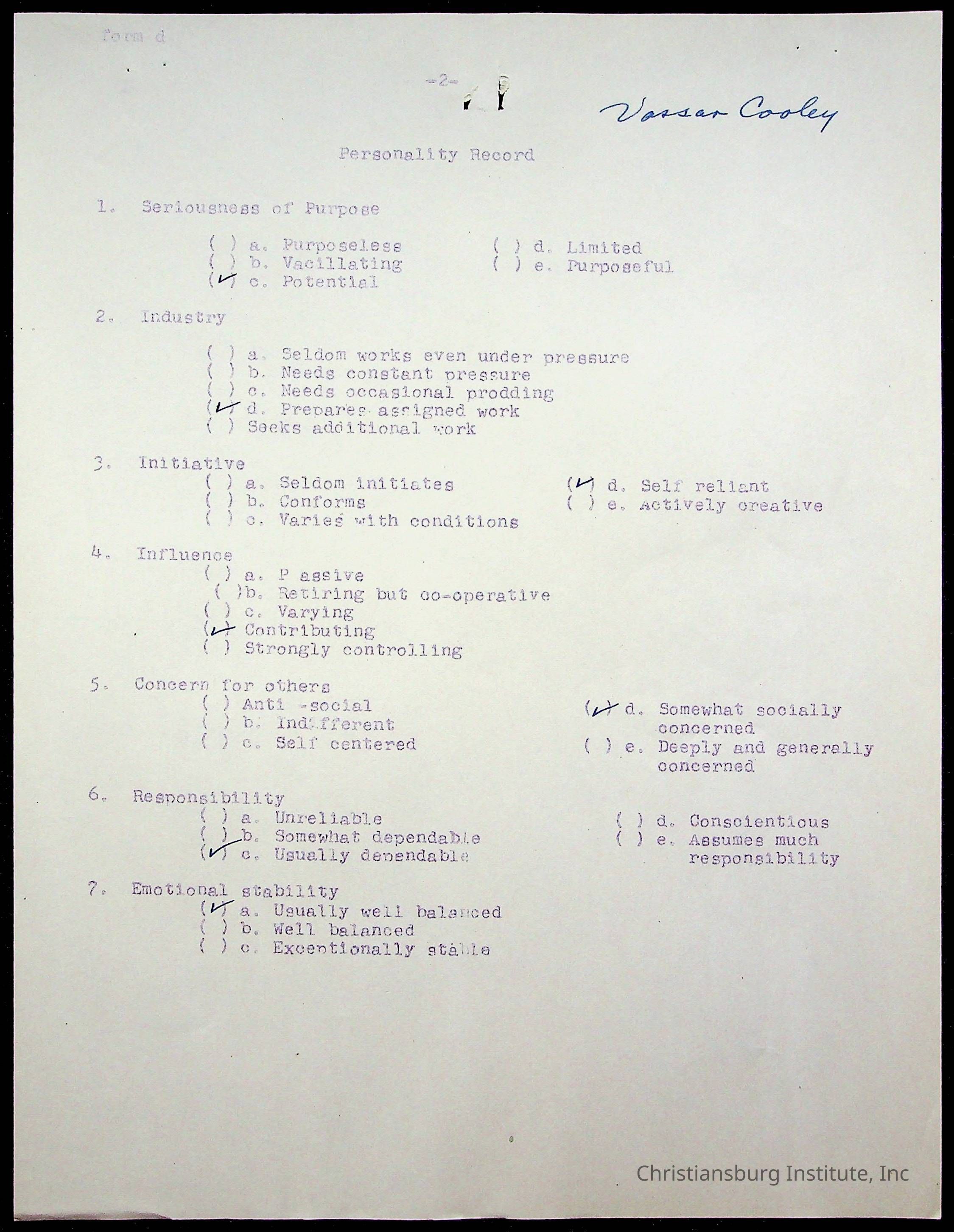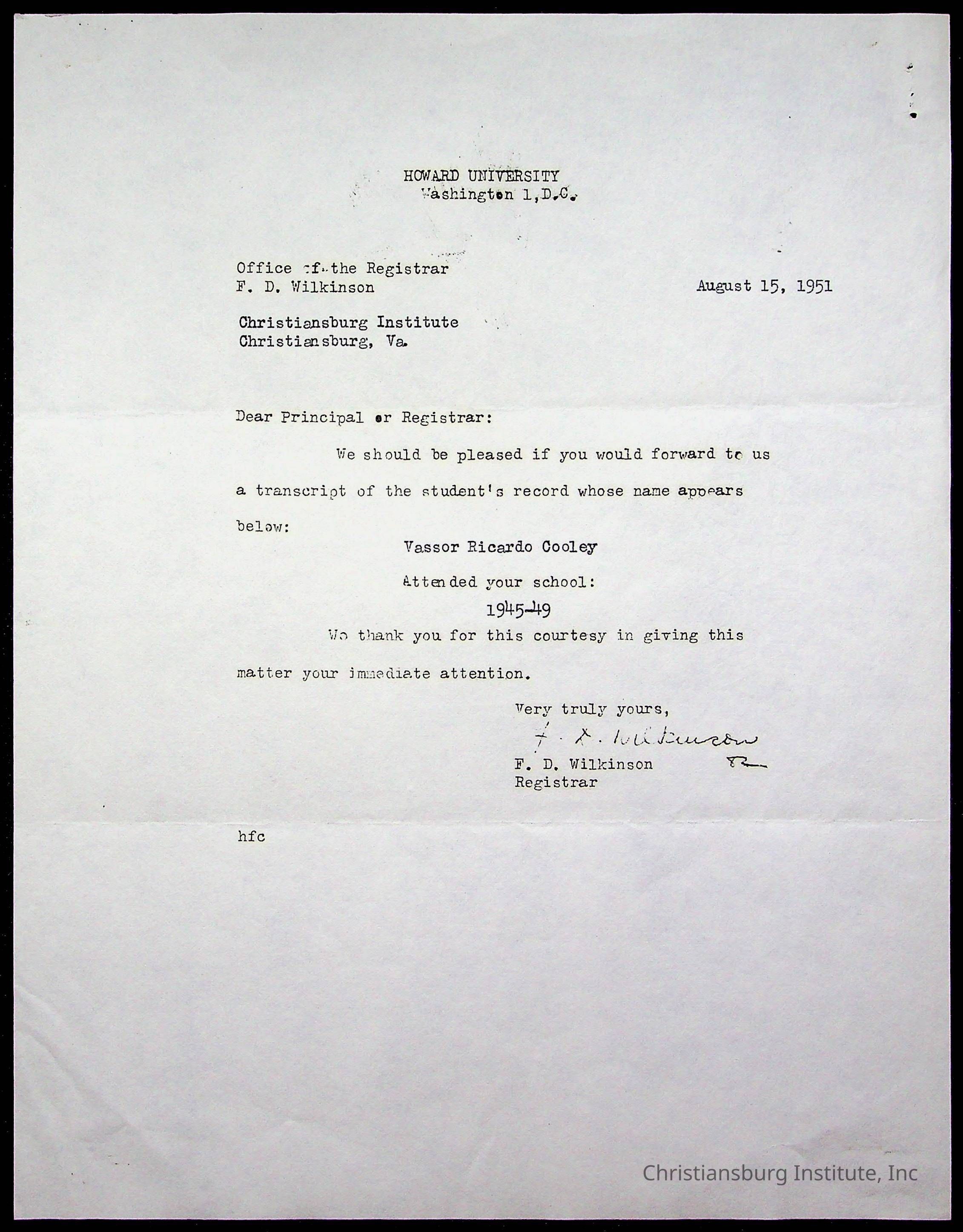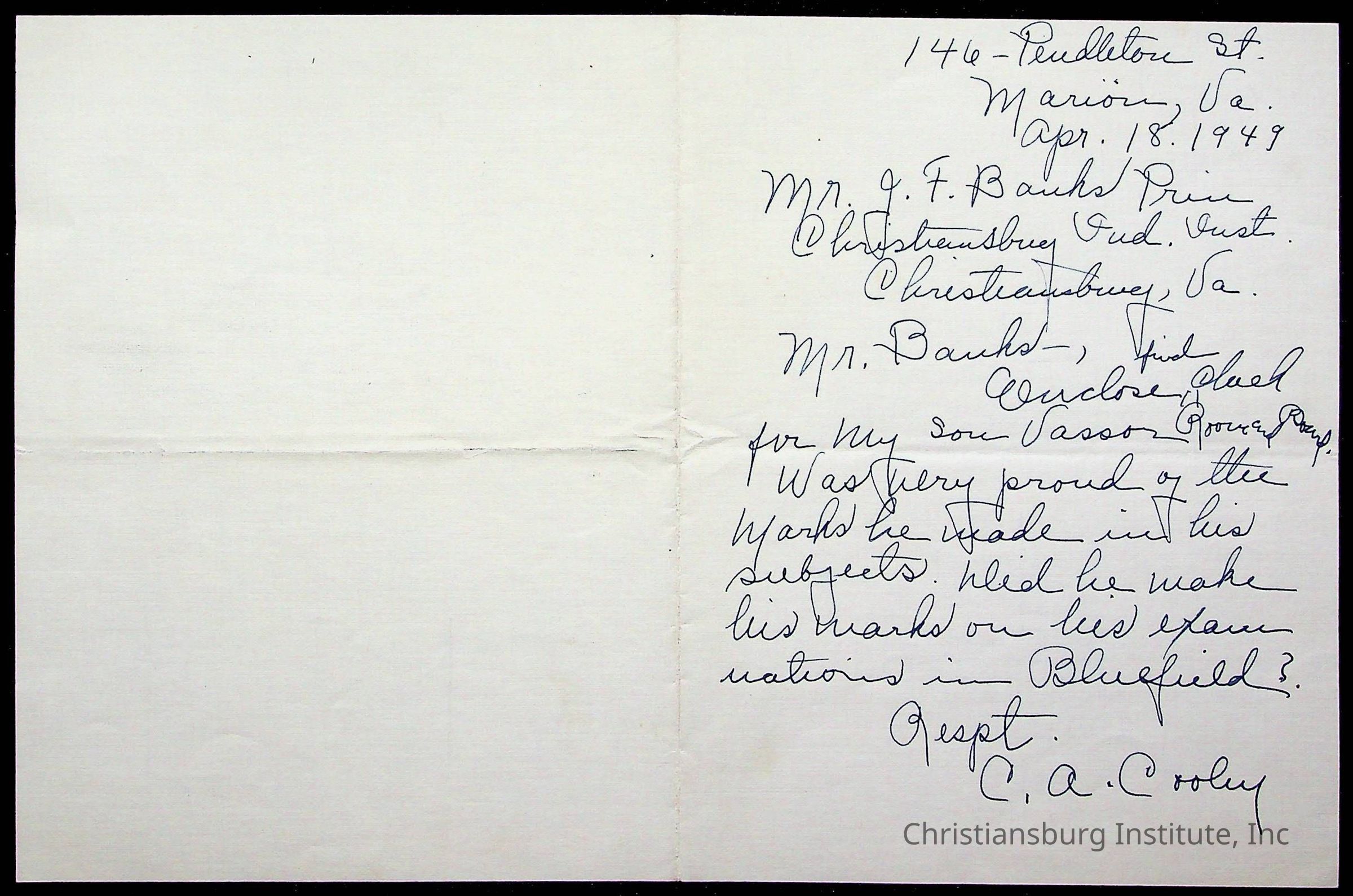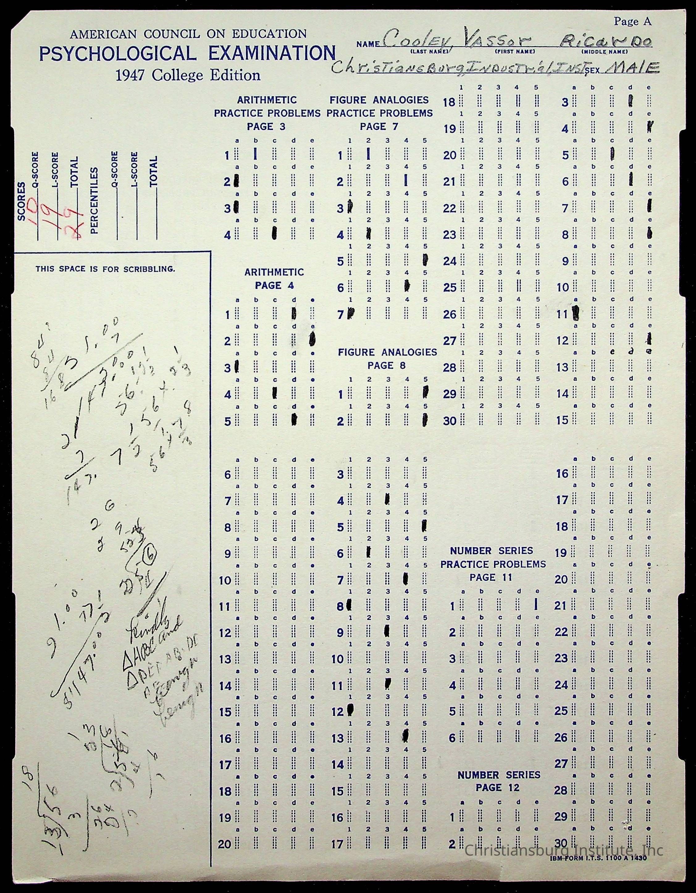 The student file for the Christiansburg Institute student, Vassor R. Cooley circa 1940s.