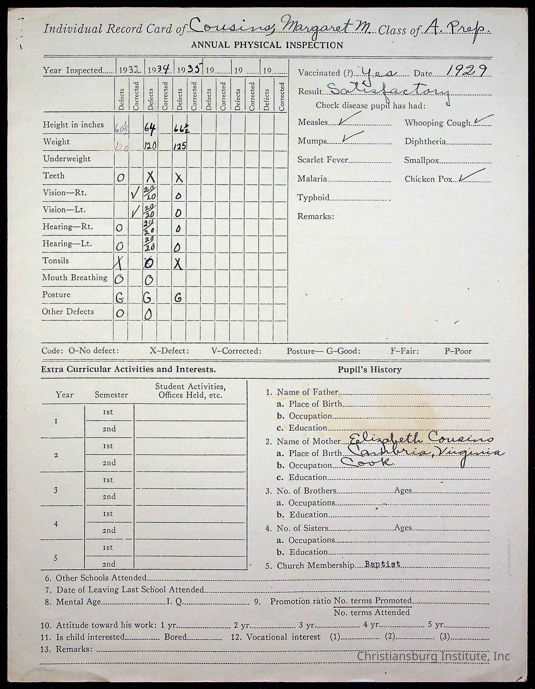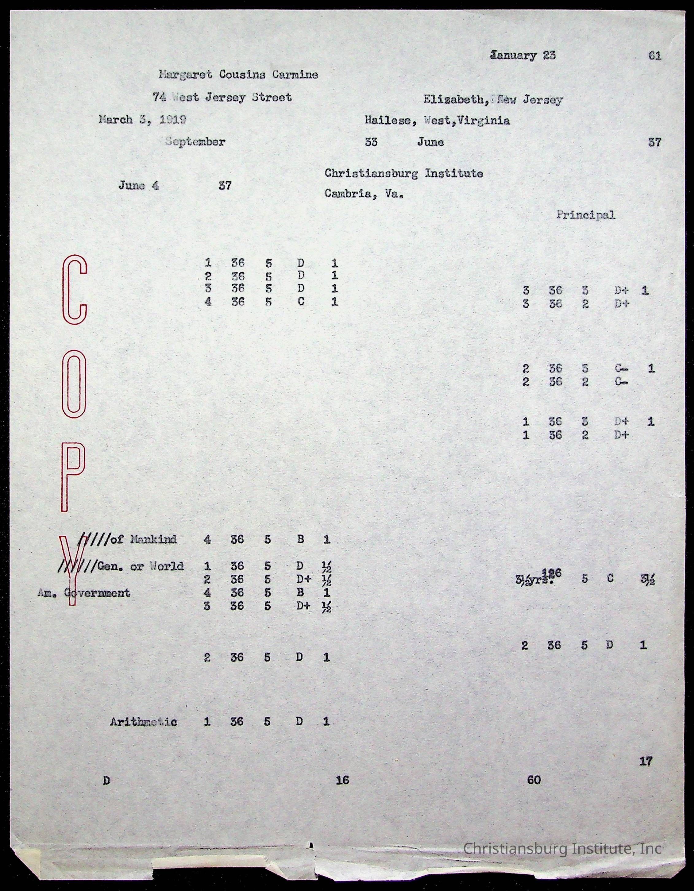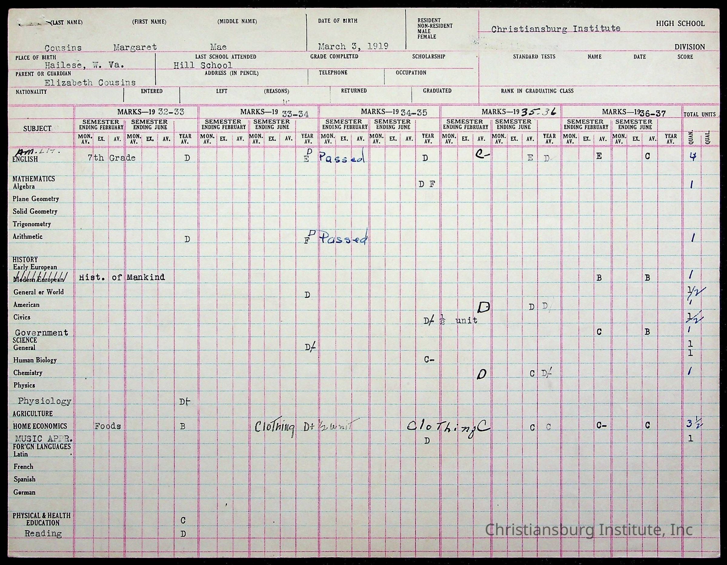 The student file for the Christiansburg Institute student, Margaret Mae Cousins circa 1930s.