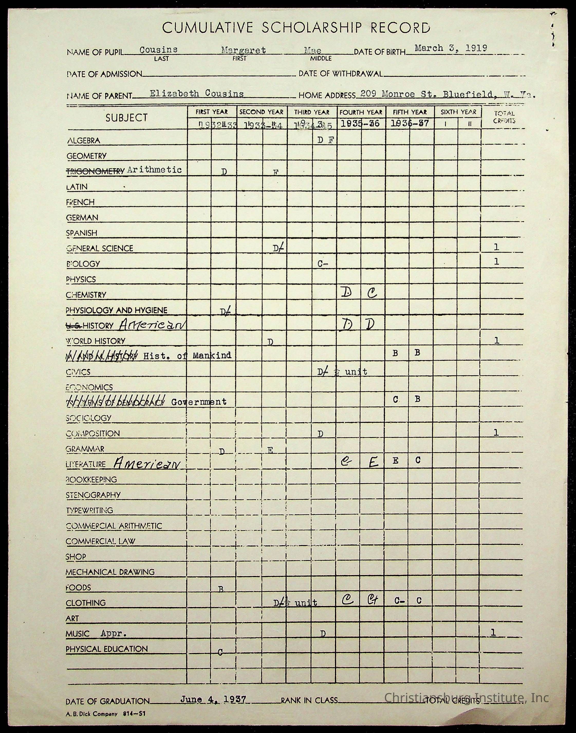 Christiansburg Institute, Montgomery County Public Schools, Cousins, Margaret Mae