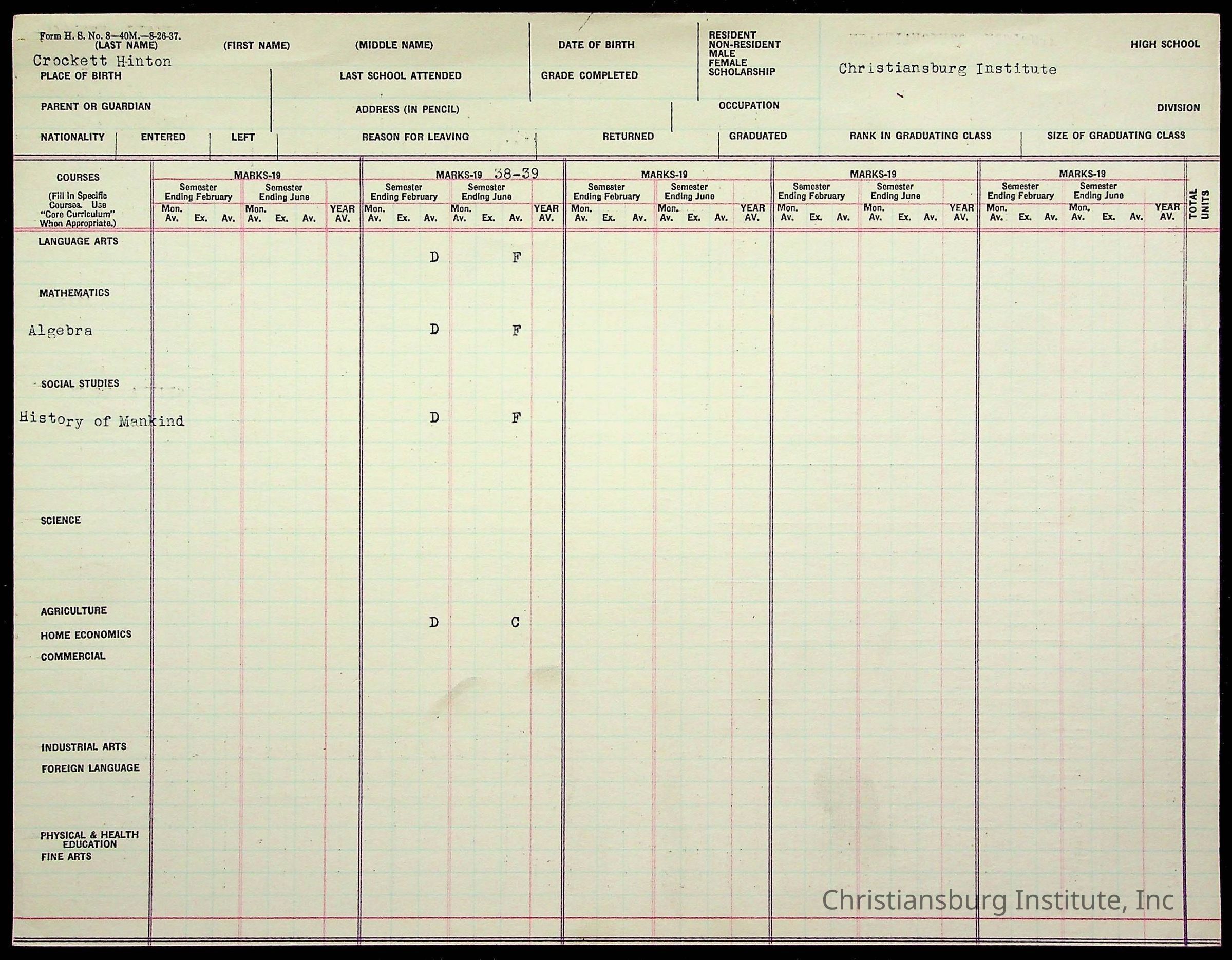 The student file for the Christiansburg Institute student, Hinton Crockett circa 1930s.