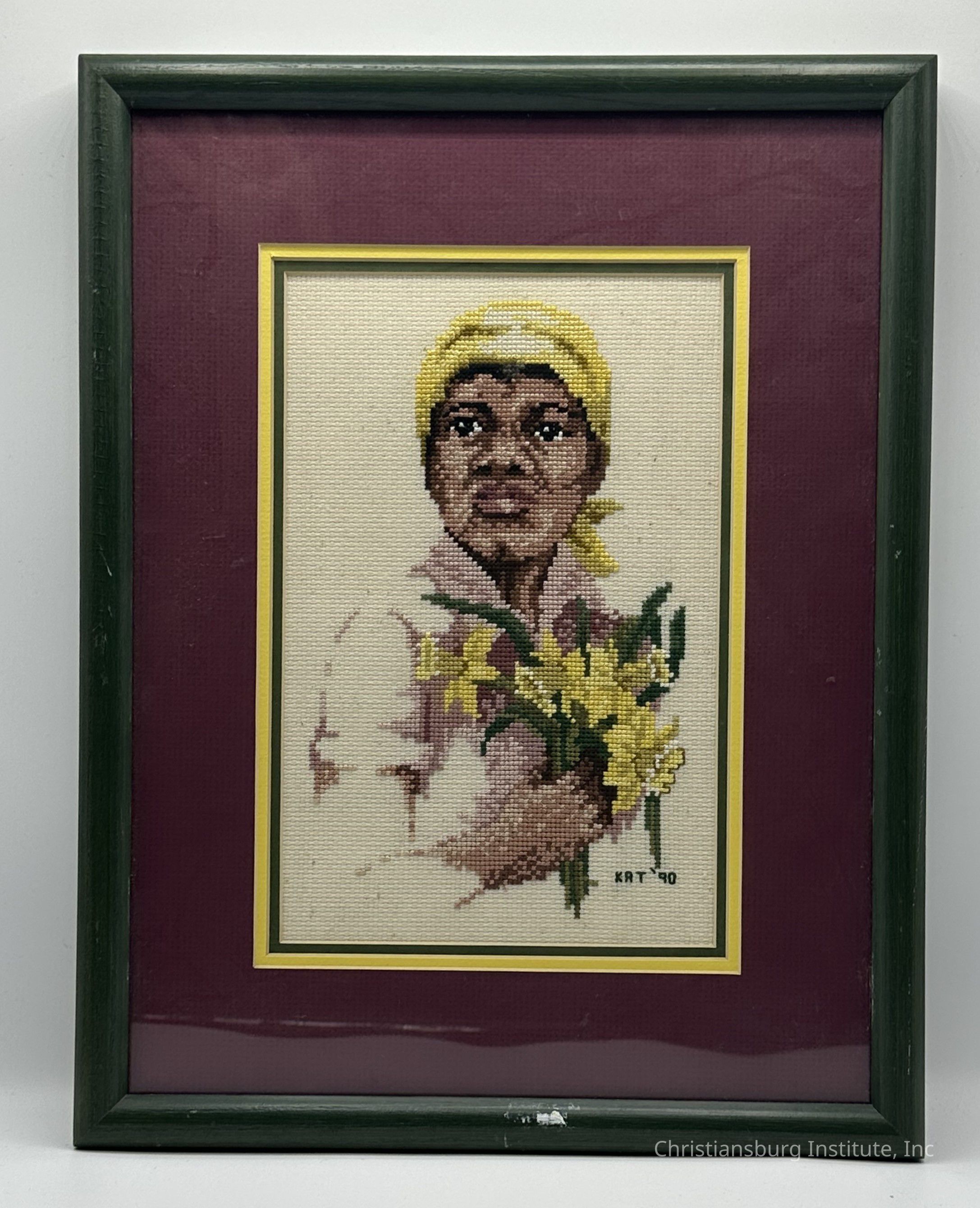 A framed counted cross stitch of an unknown African American woman holding yellow flowers dated 1990.Collection