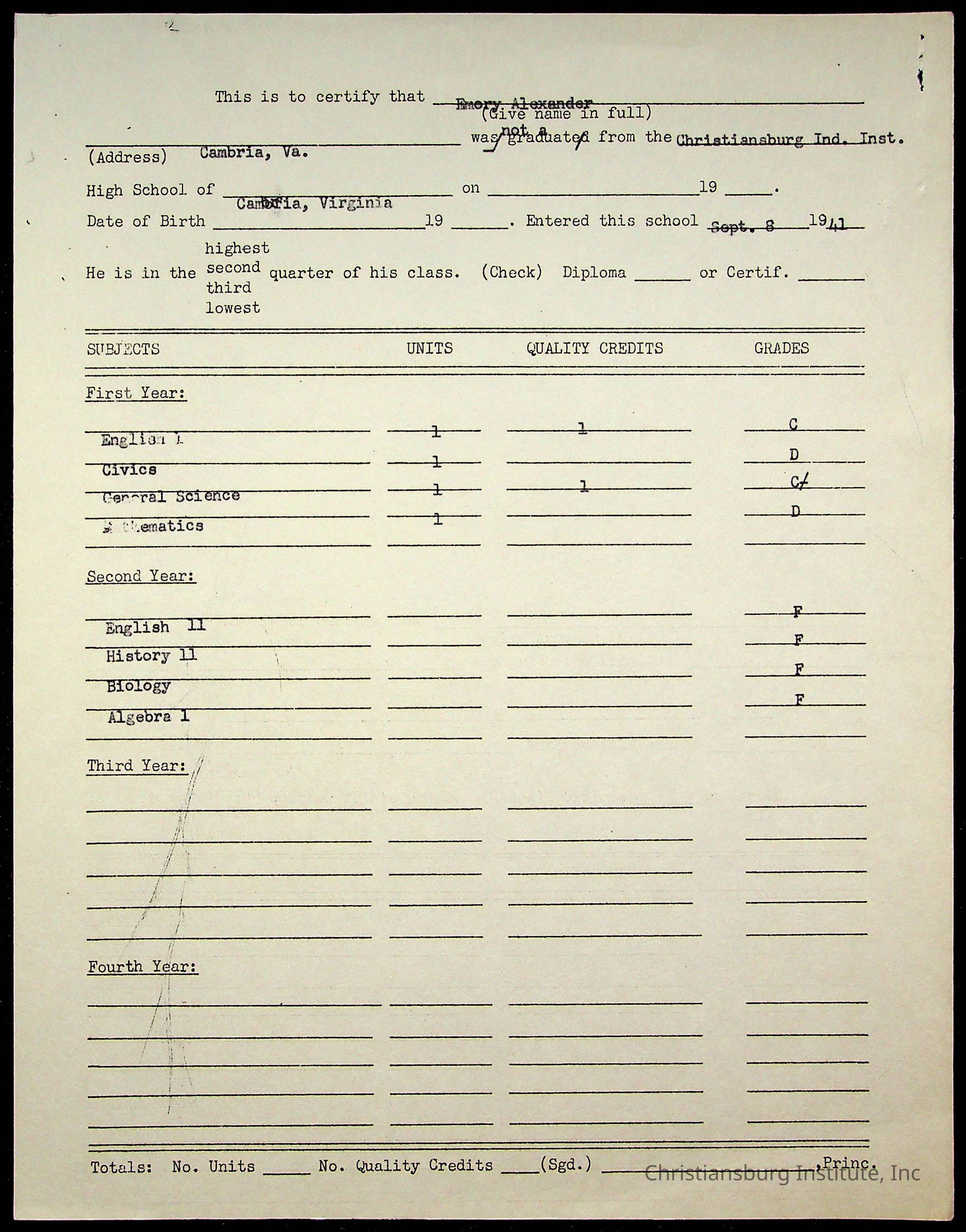 The student file for the Christiansburg Institute student, Emory Alexander circa 1940s.