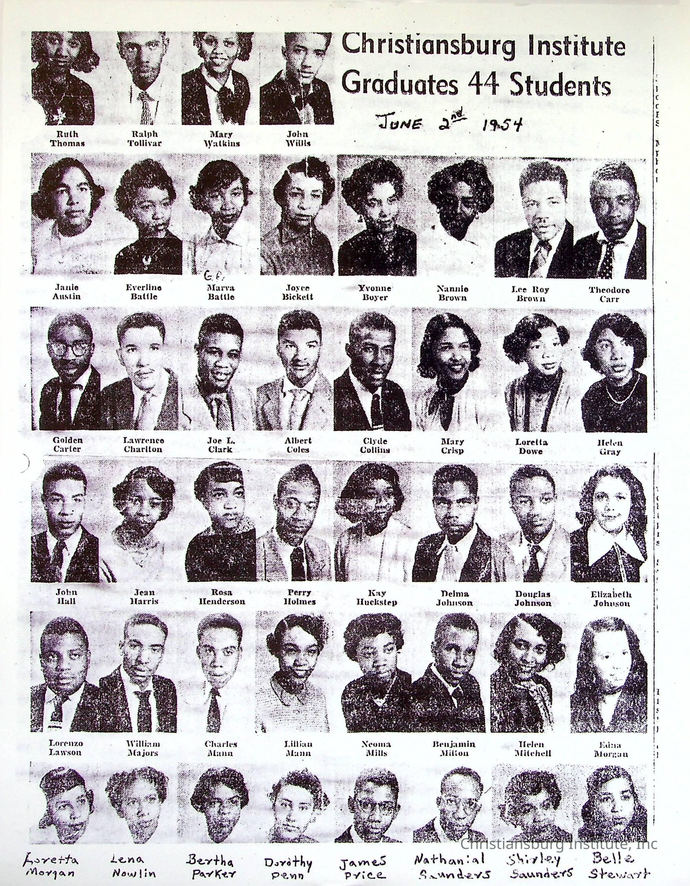 A photograph of the Christiansburg Institute graduating class of 1954.Collection