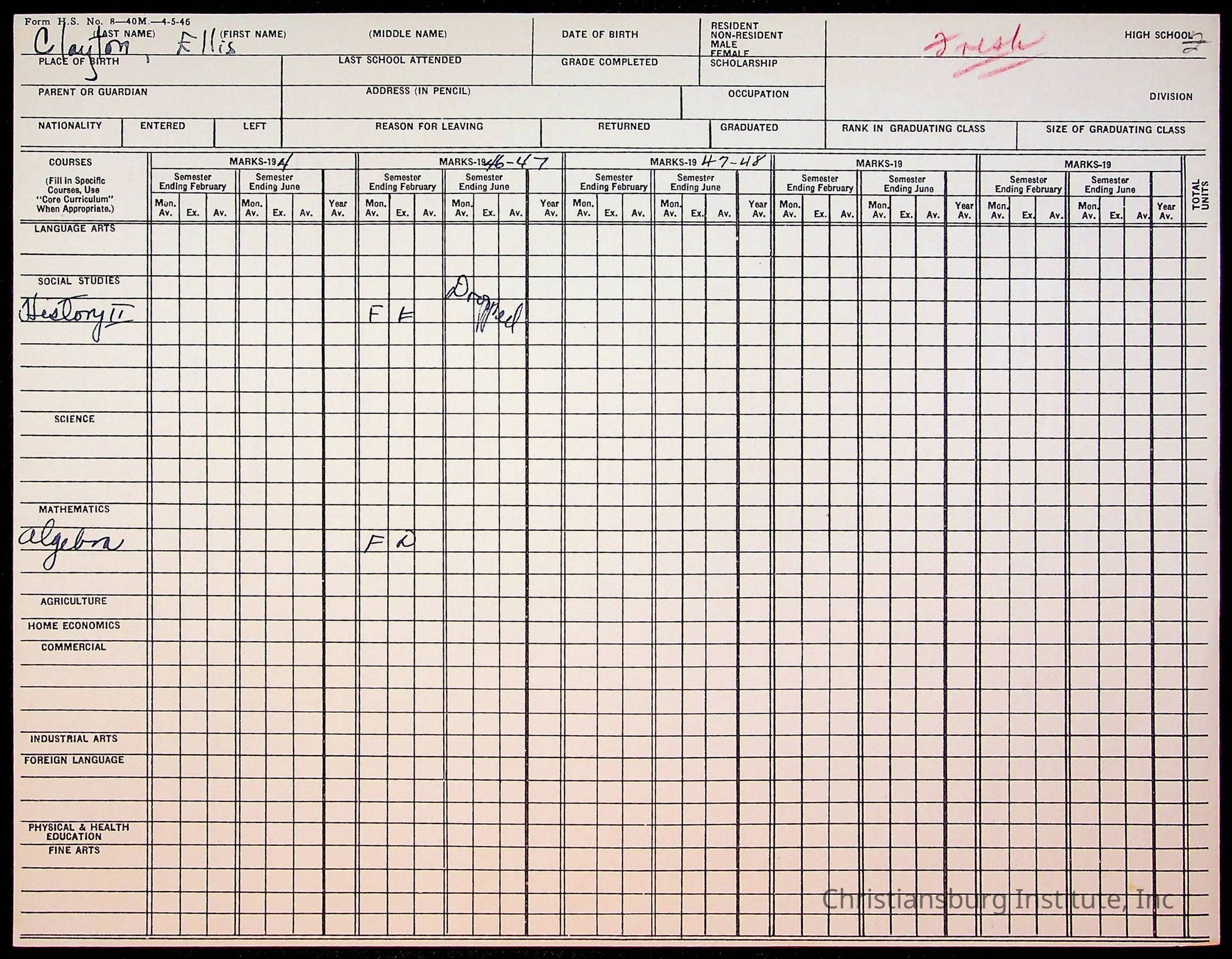 The student file for the Christiansburg Institute student, Ellis Clayton circa 1940s.