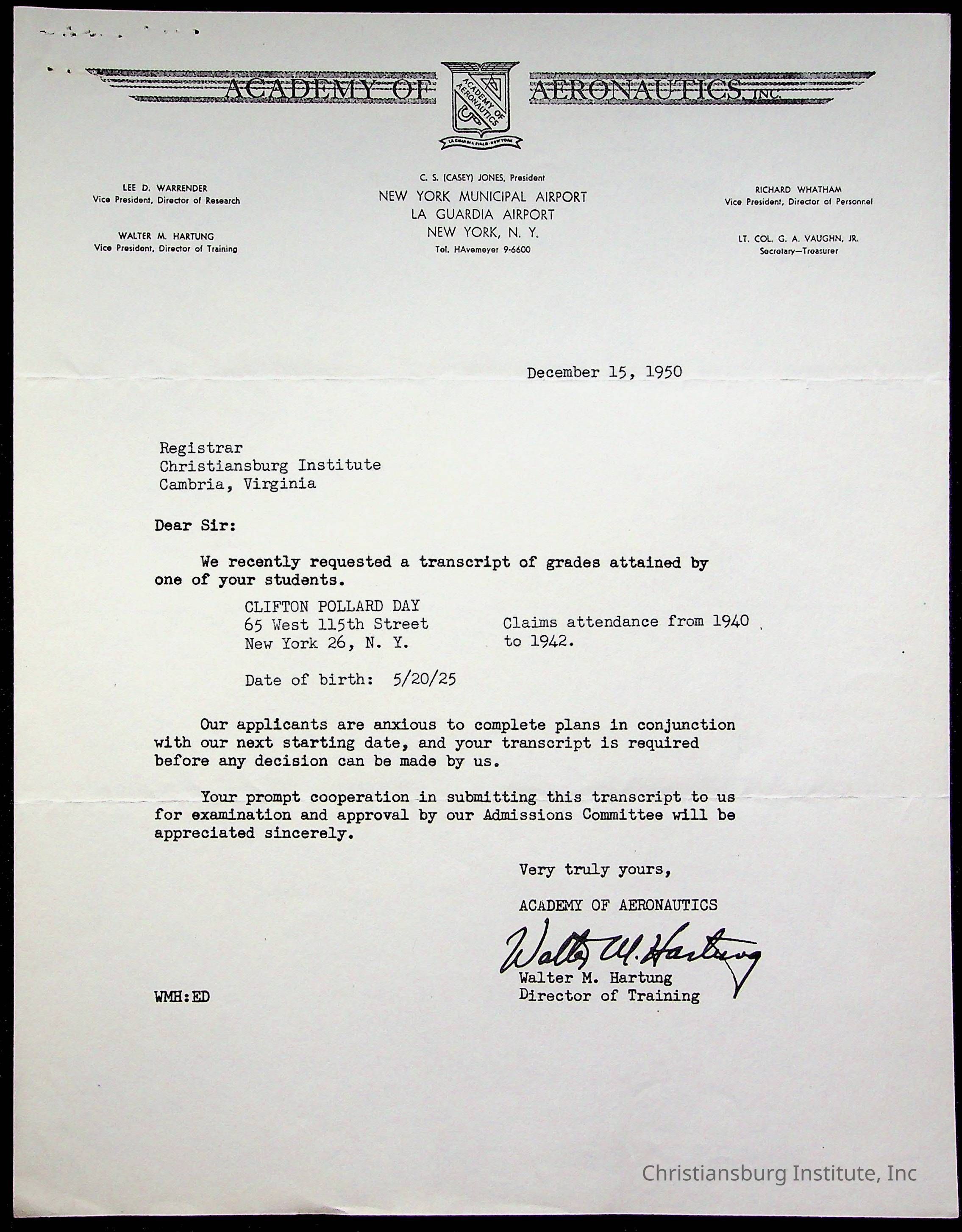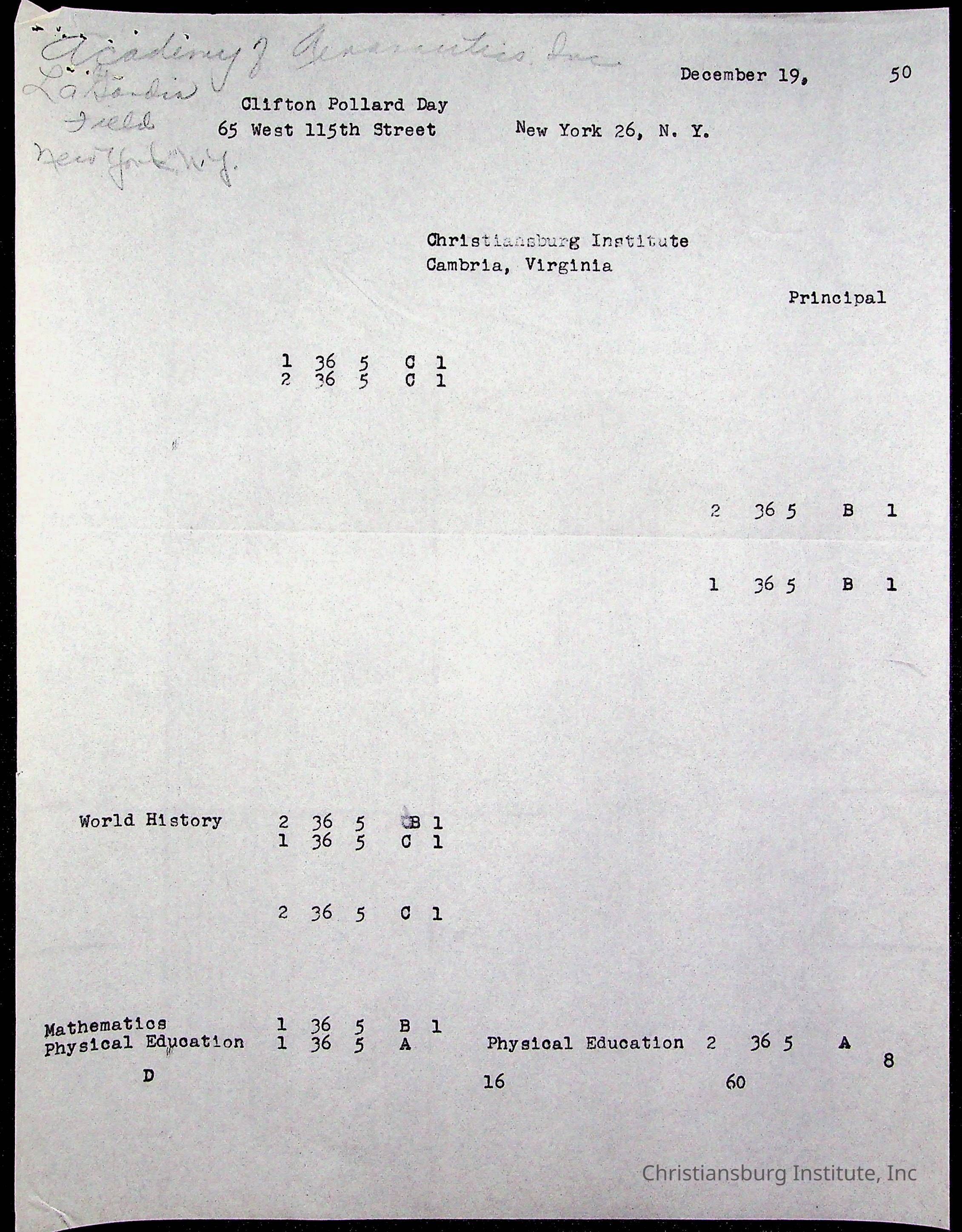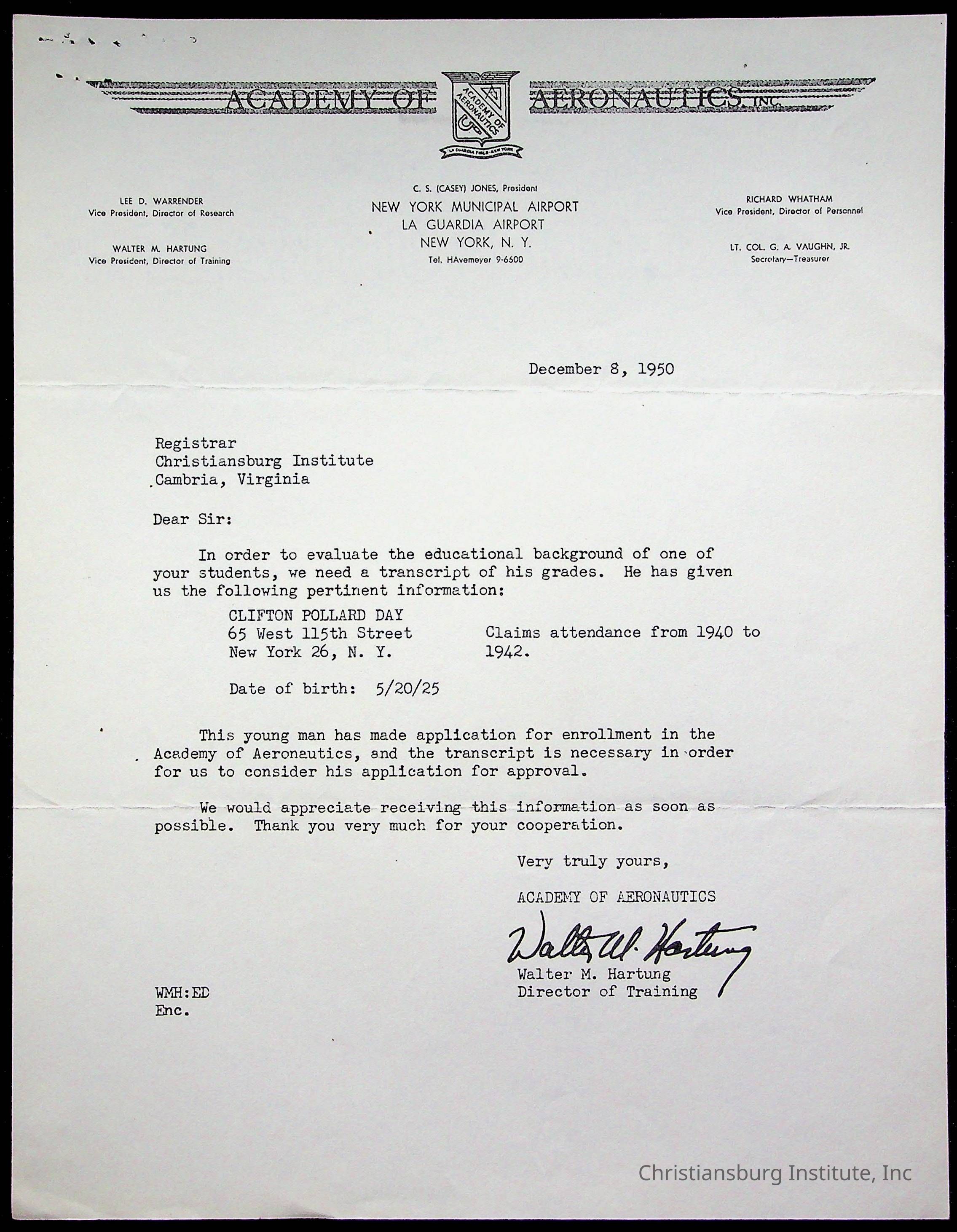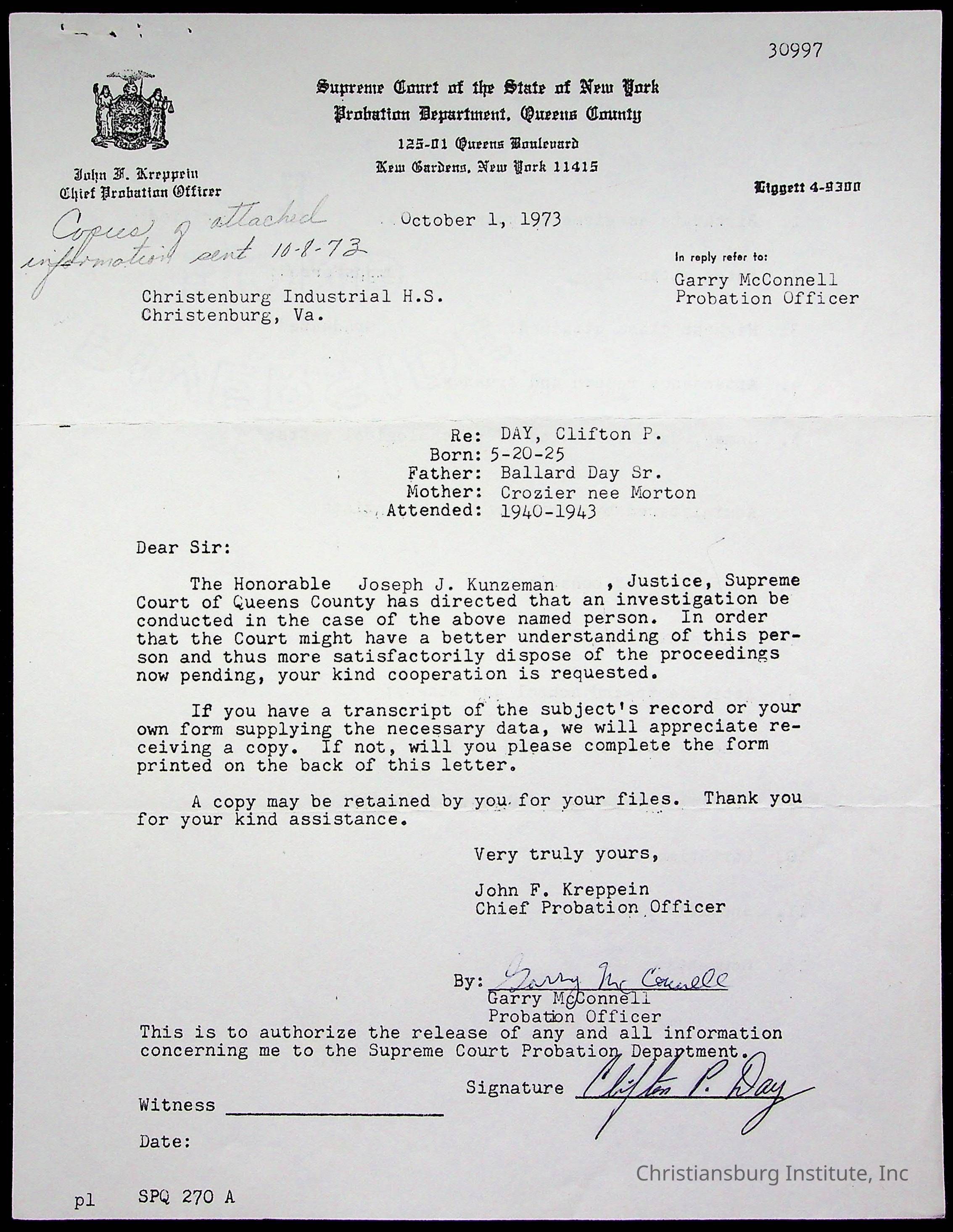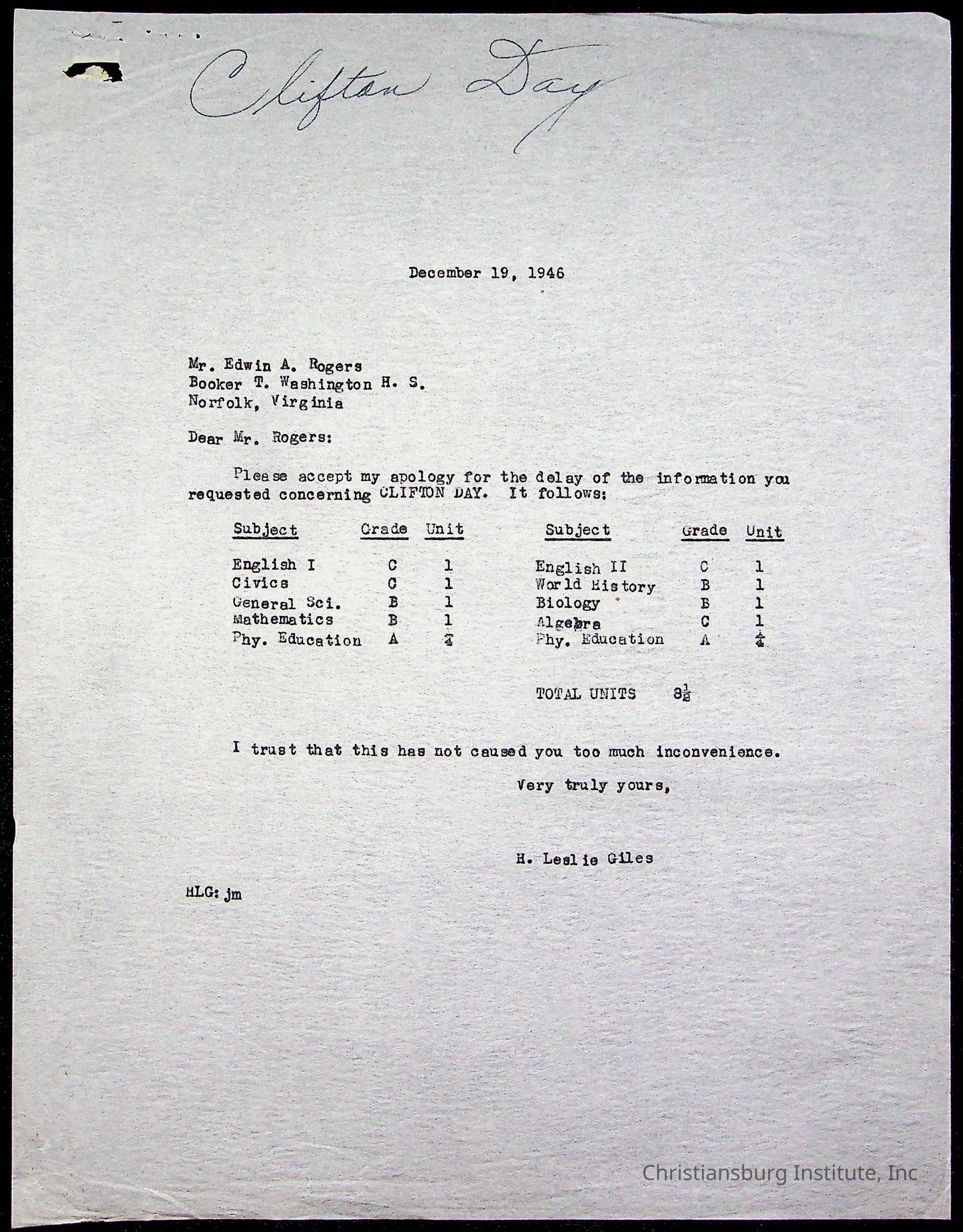 The student file for the Christiansburg Institute student, Clifton P. Day circa 1940s.