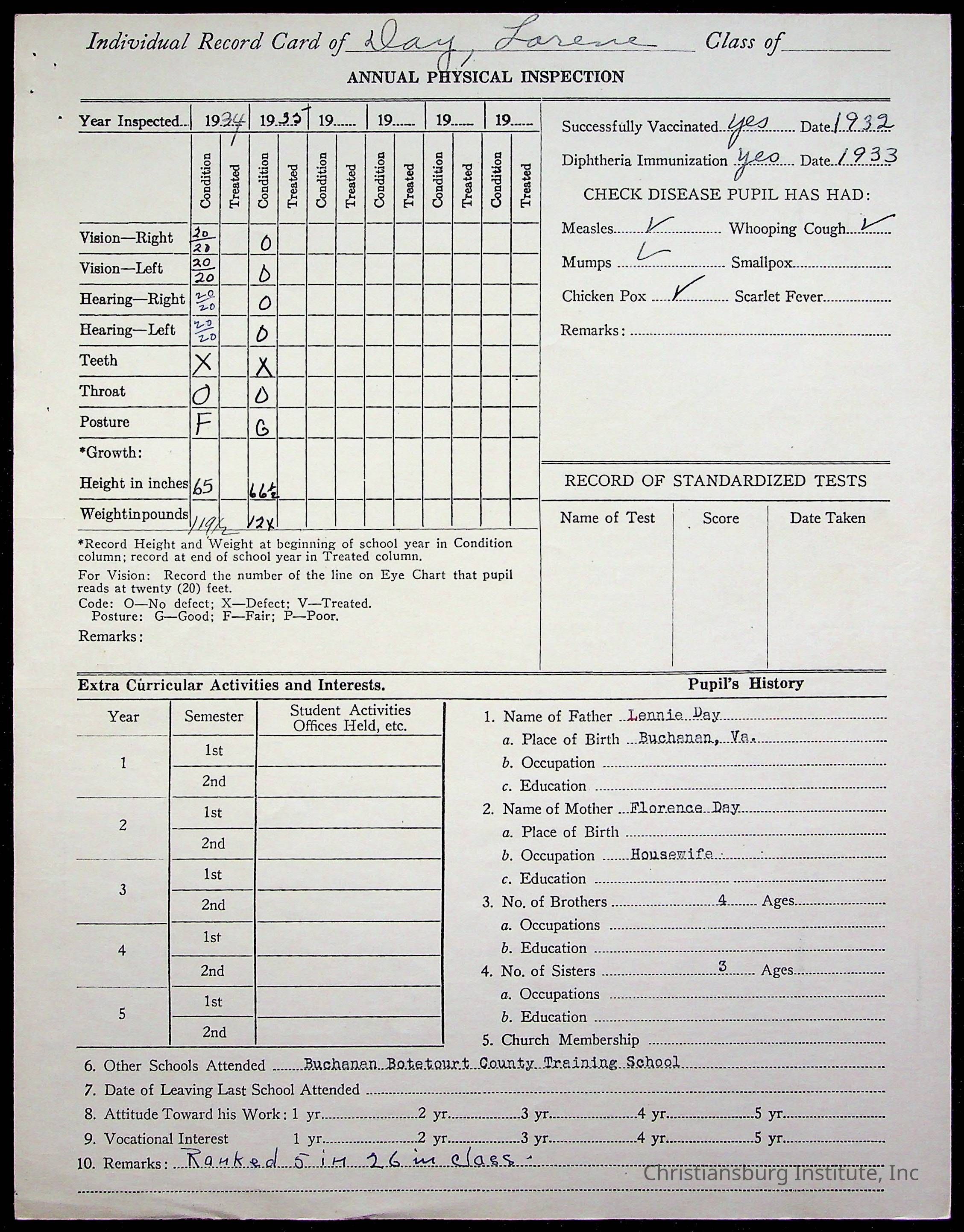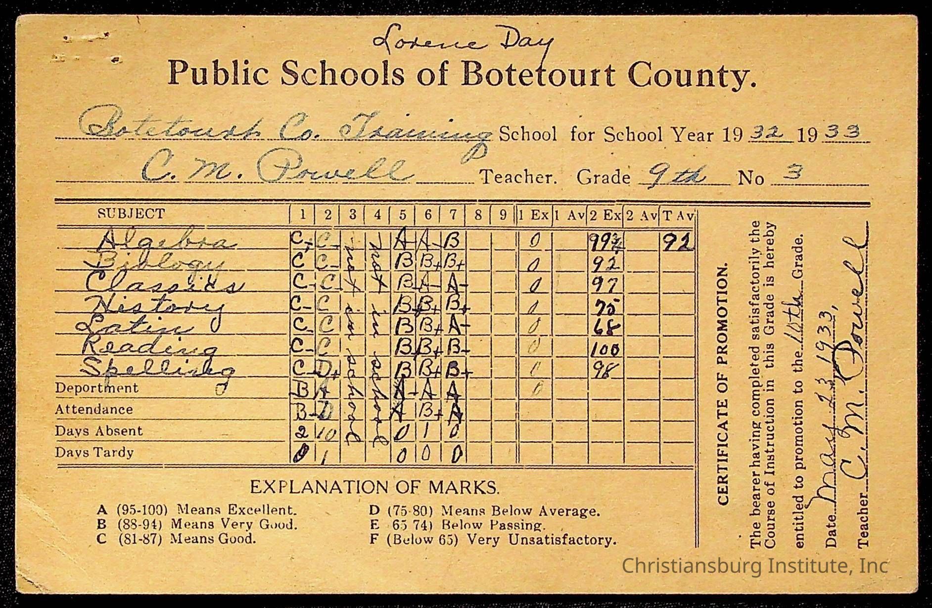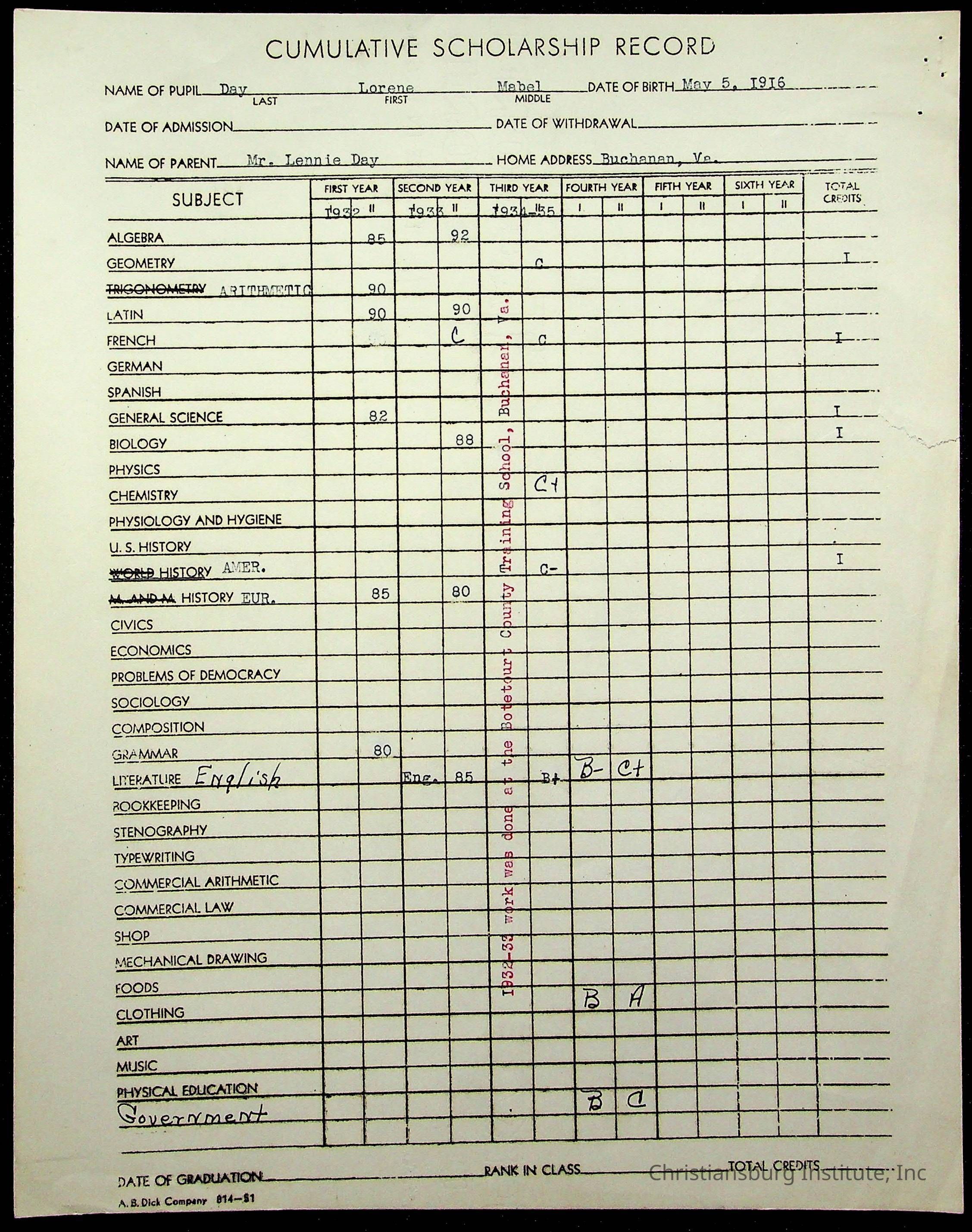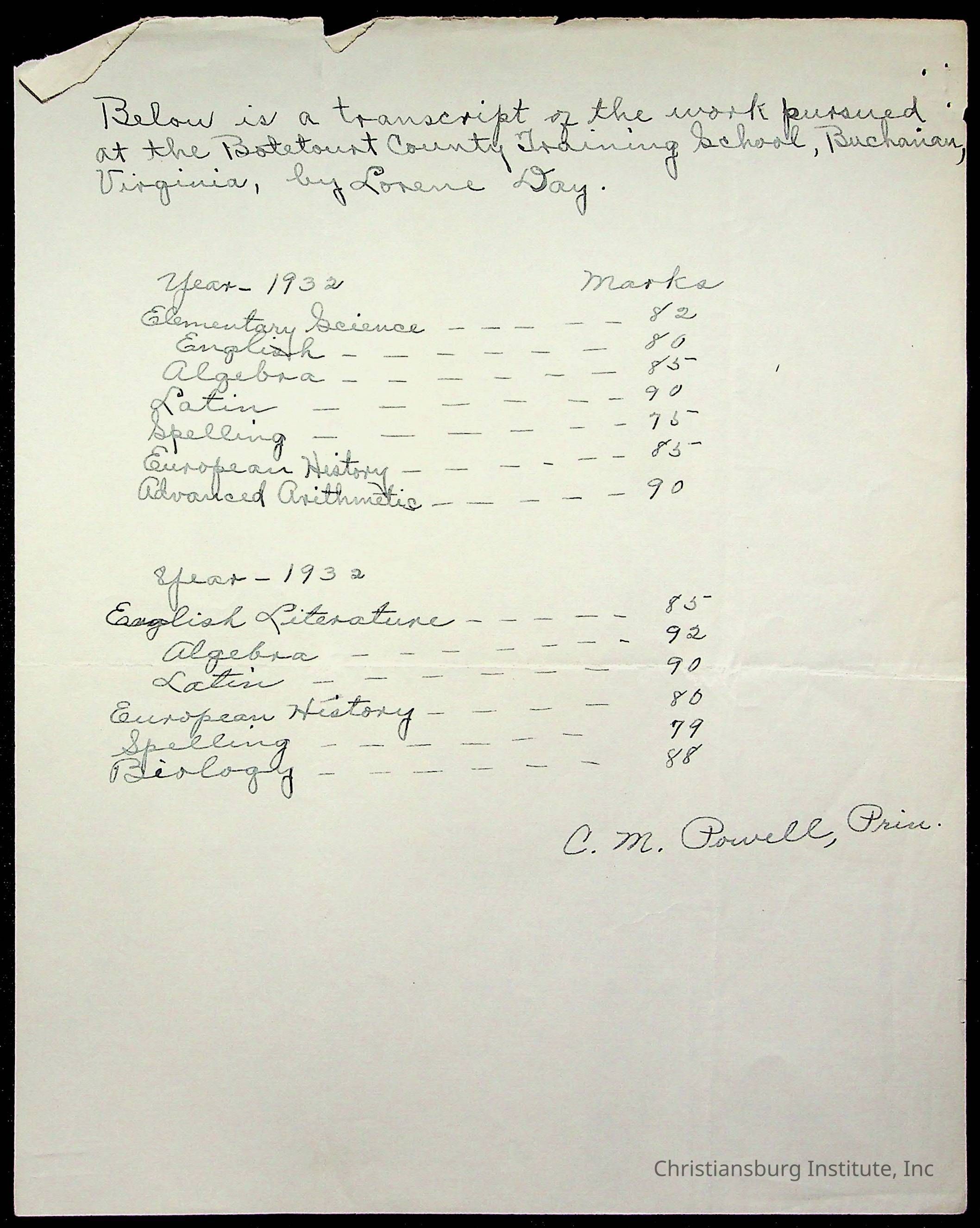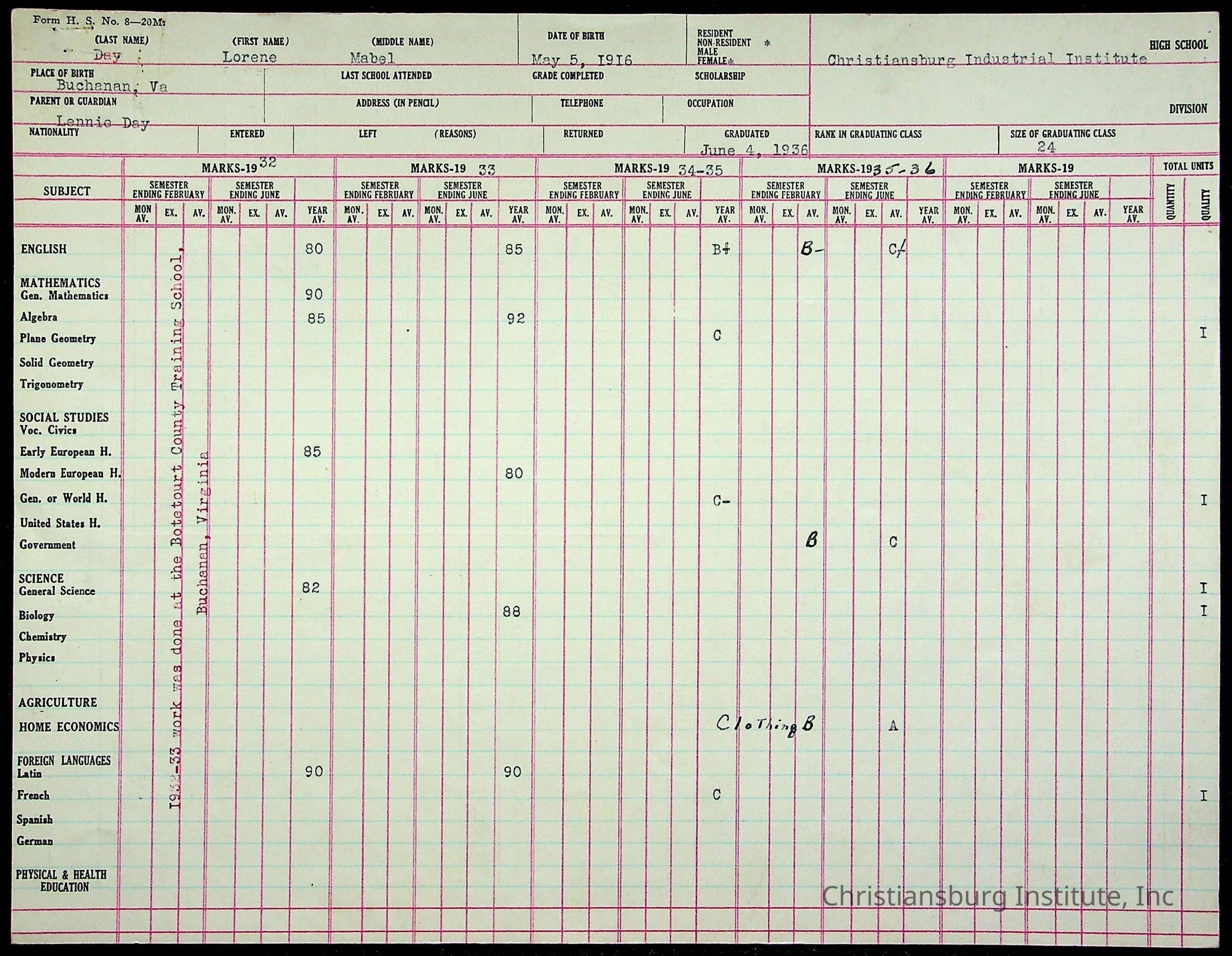 Montgomery County Public Schools, Christiansburg Institute, Day, Lorene M.