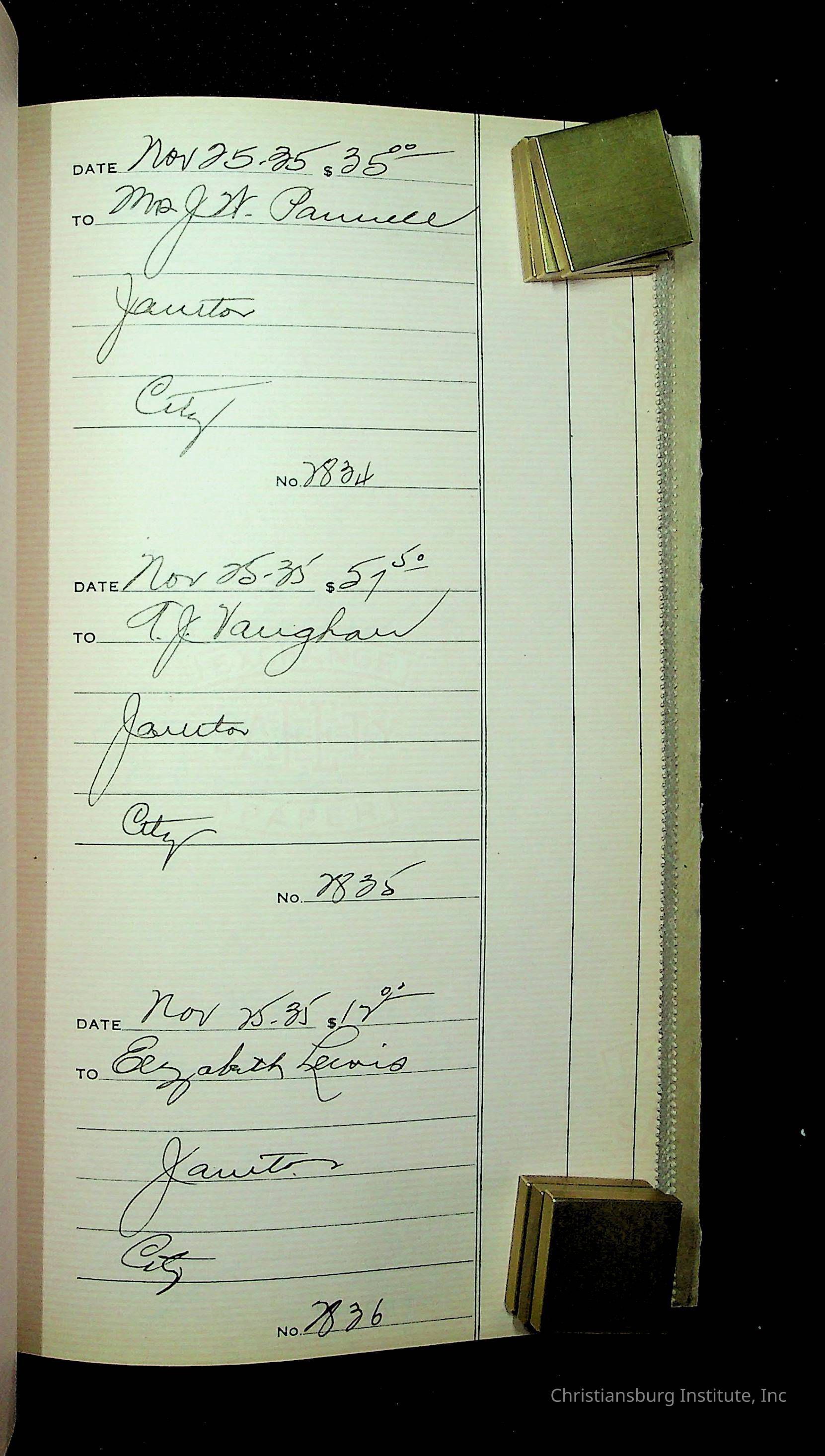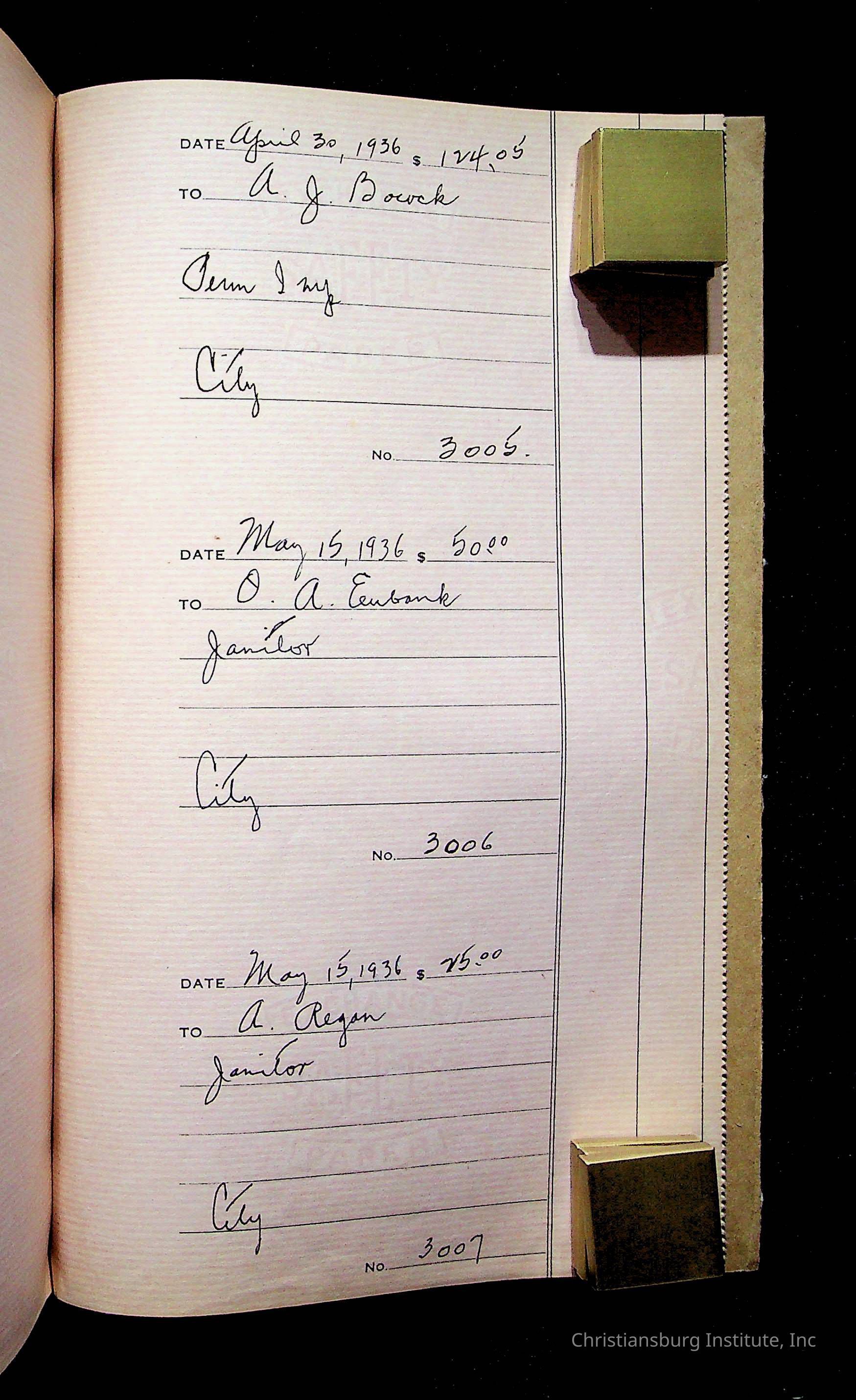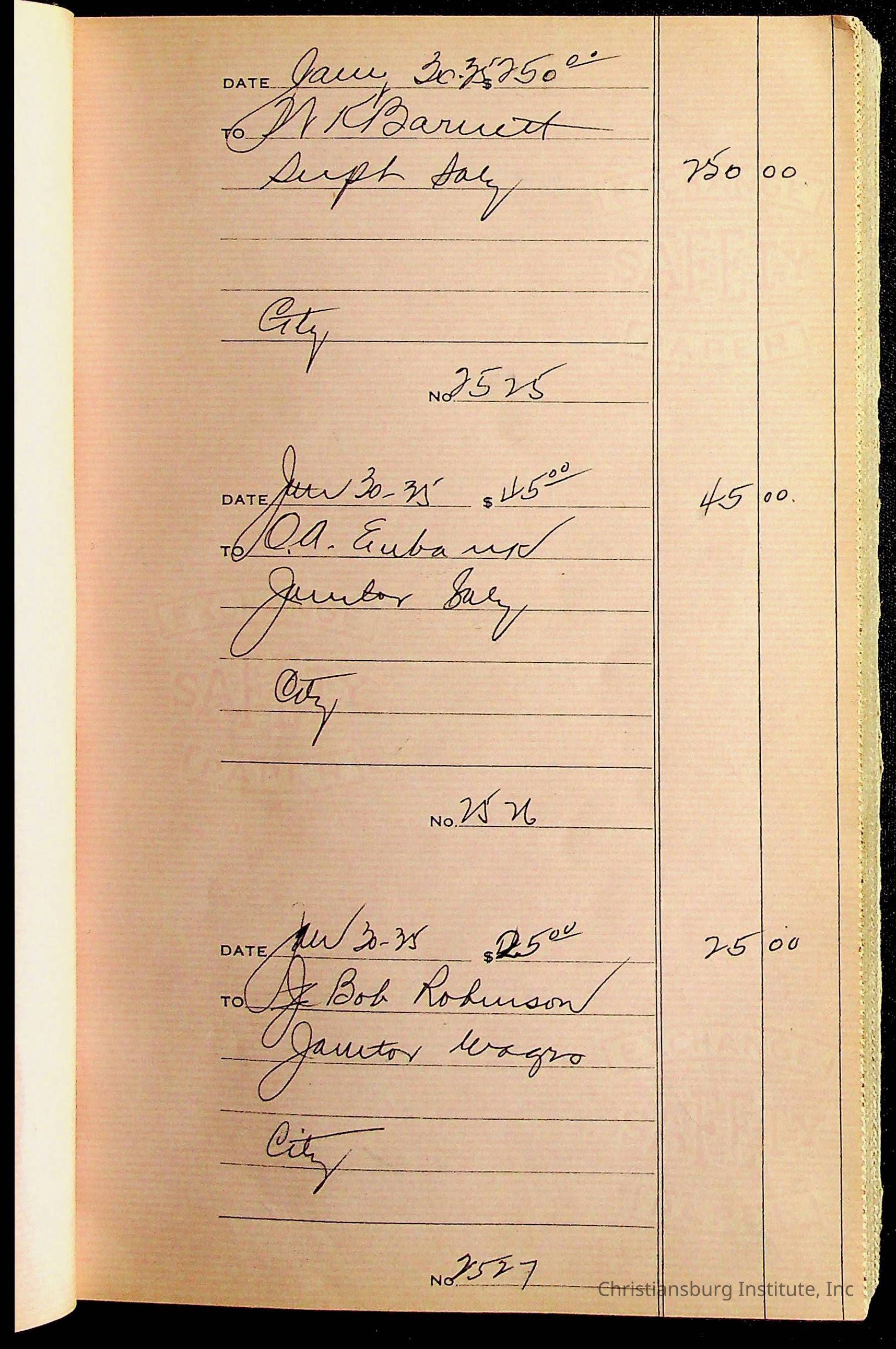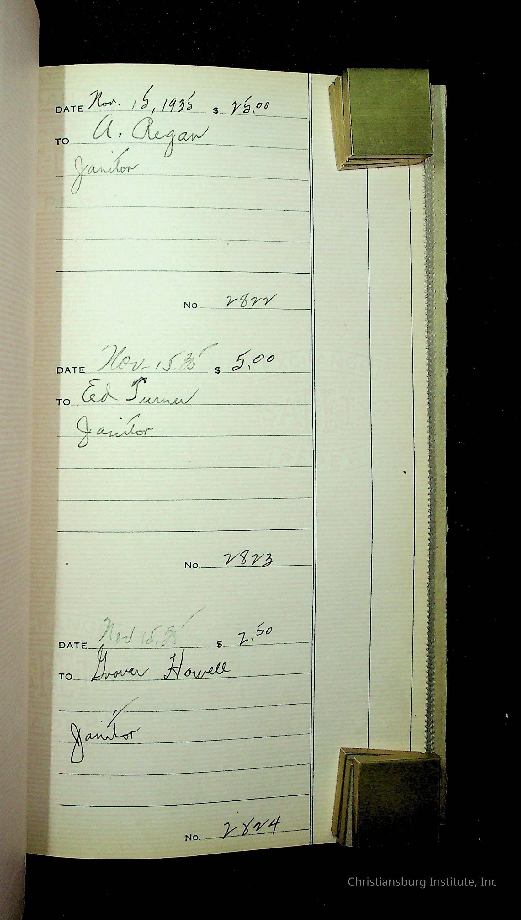 A receipt booklet containing wages of Christiansburg Institute staff spanning November 26th, 1924 through May 15th, 1936.