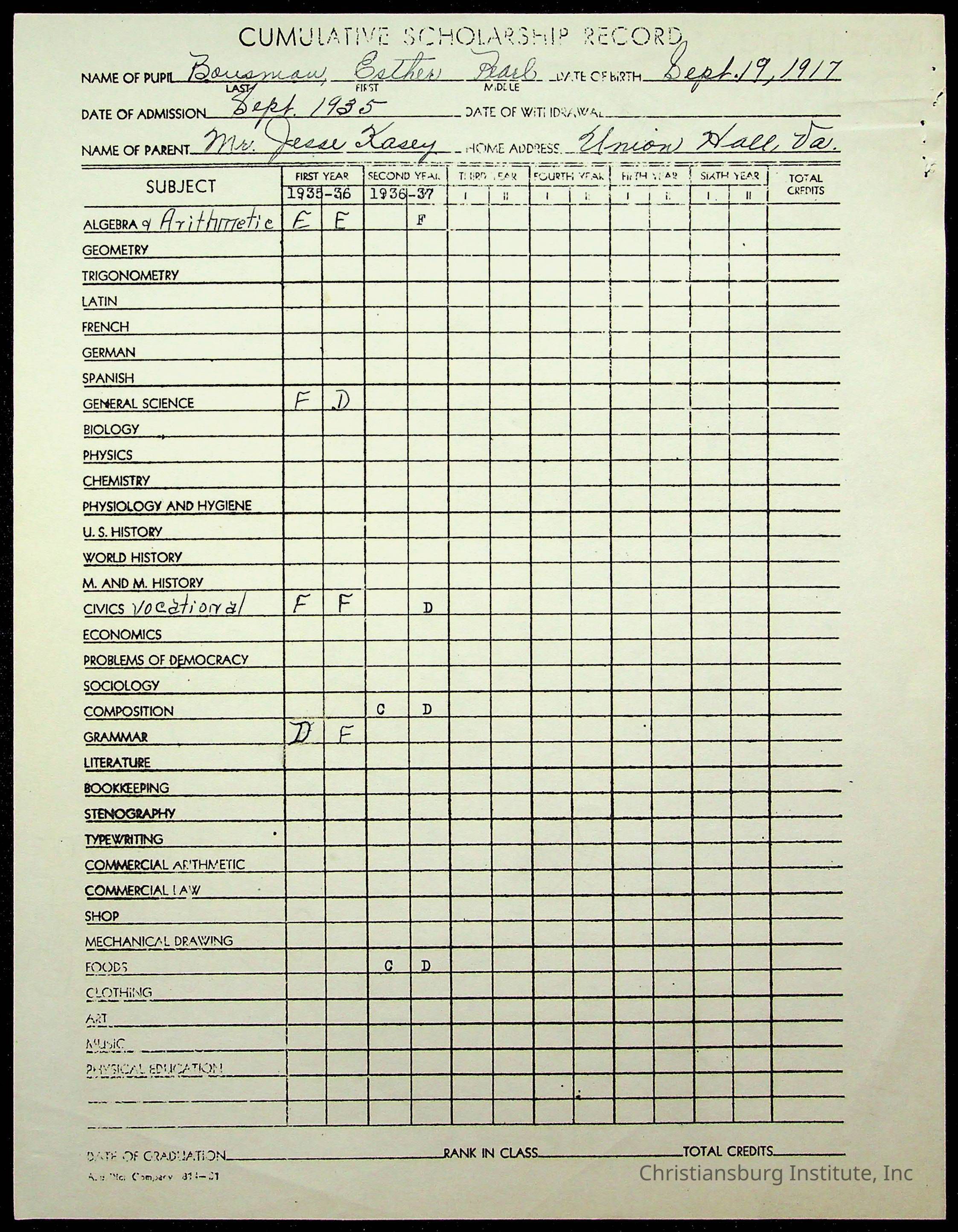 The student file for the Christiansburg Institute student, Ester Pearl Bousman circa 1930s.