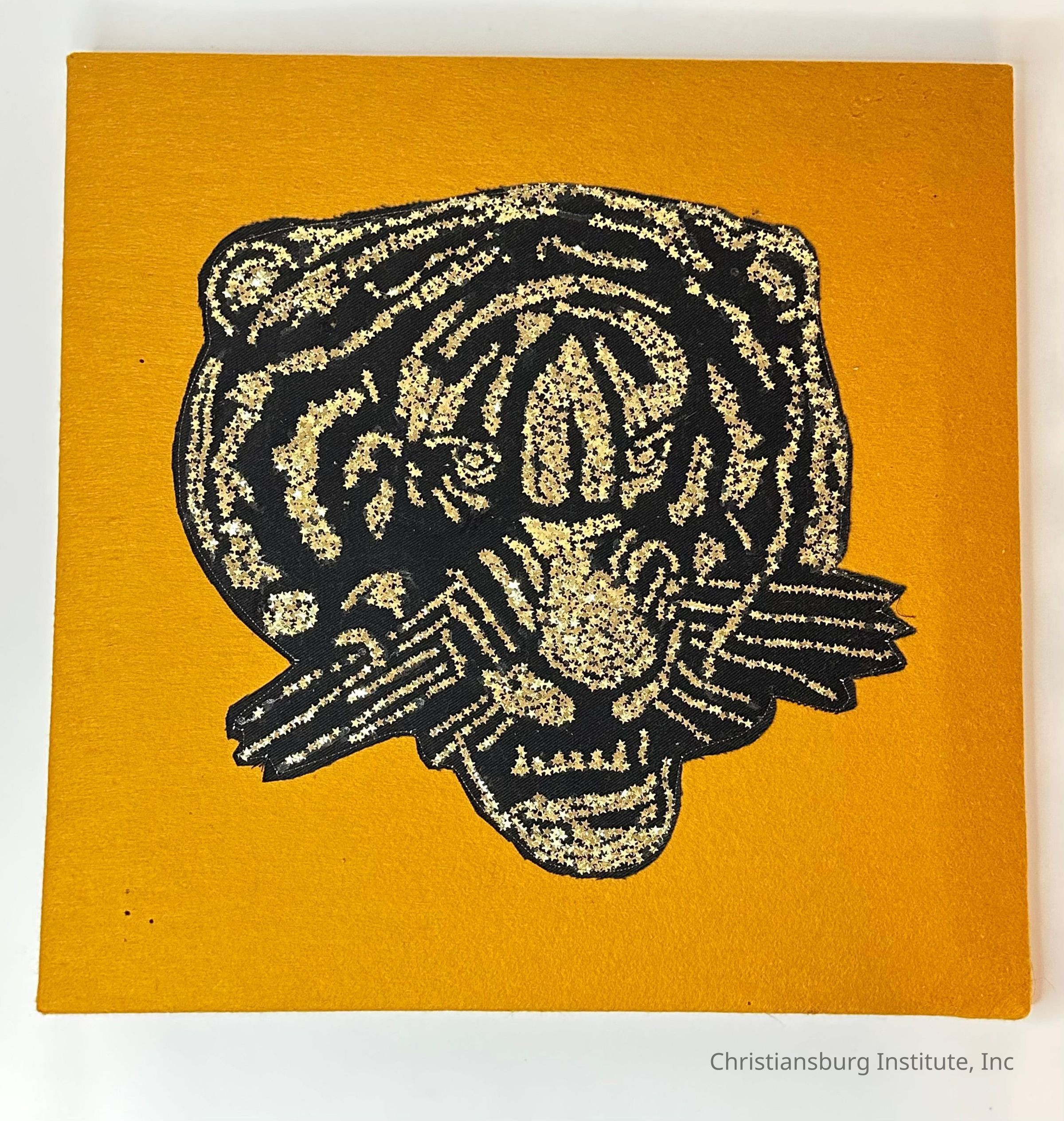 A yellow felted canvas with star-shaped sequins in the shape of a tiger made by Amanda DeHart of the Christiansburg Institute Alumni Association, undated.