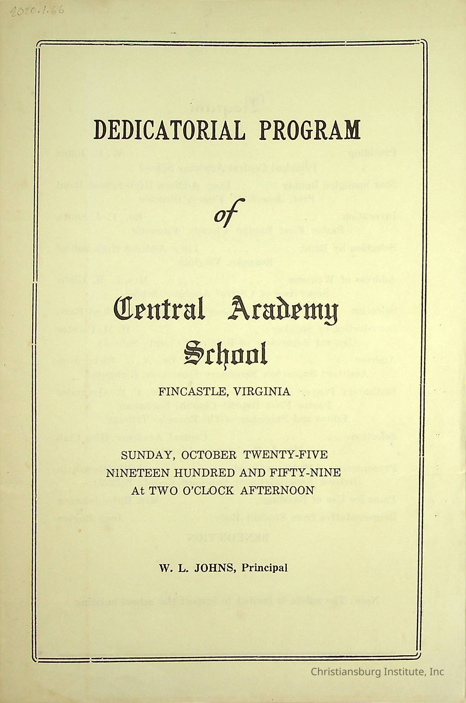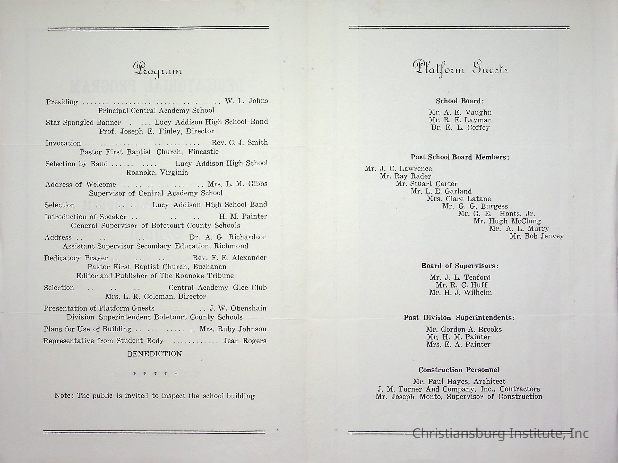 An event program for the dedicatorial program of Central Academy School in Fincastle, Virginia on October 25th, 1959.