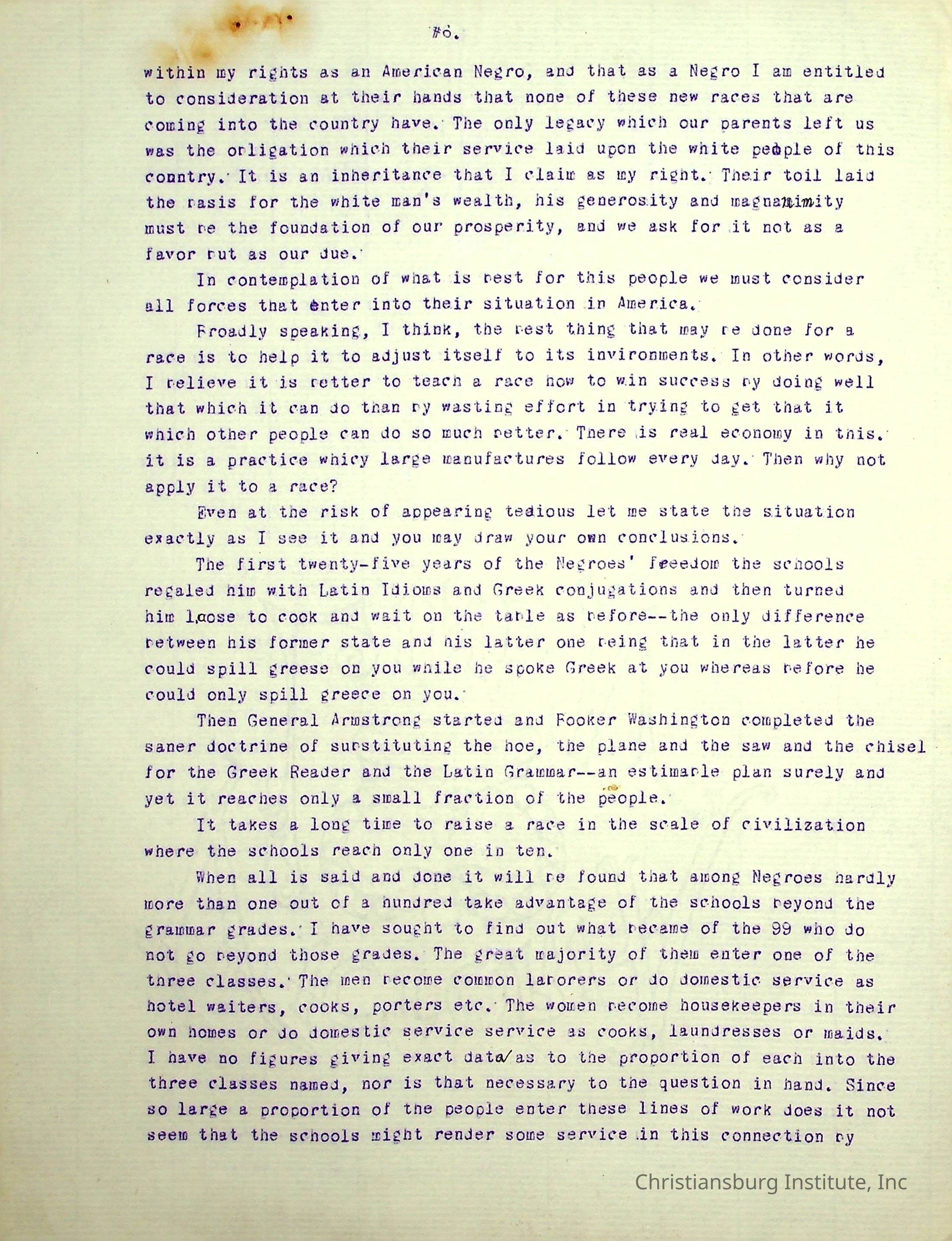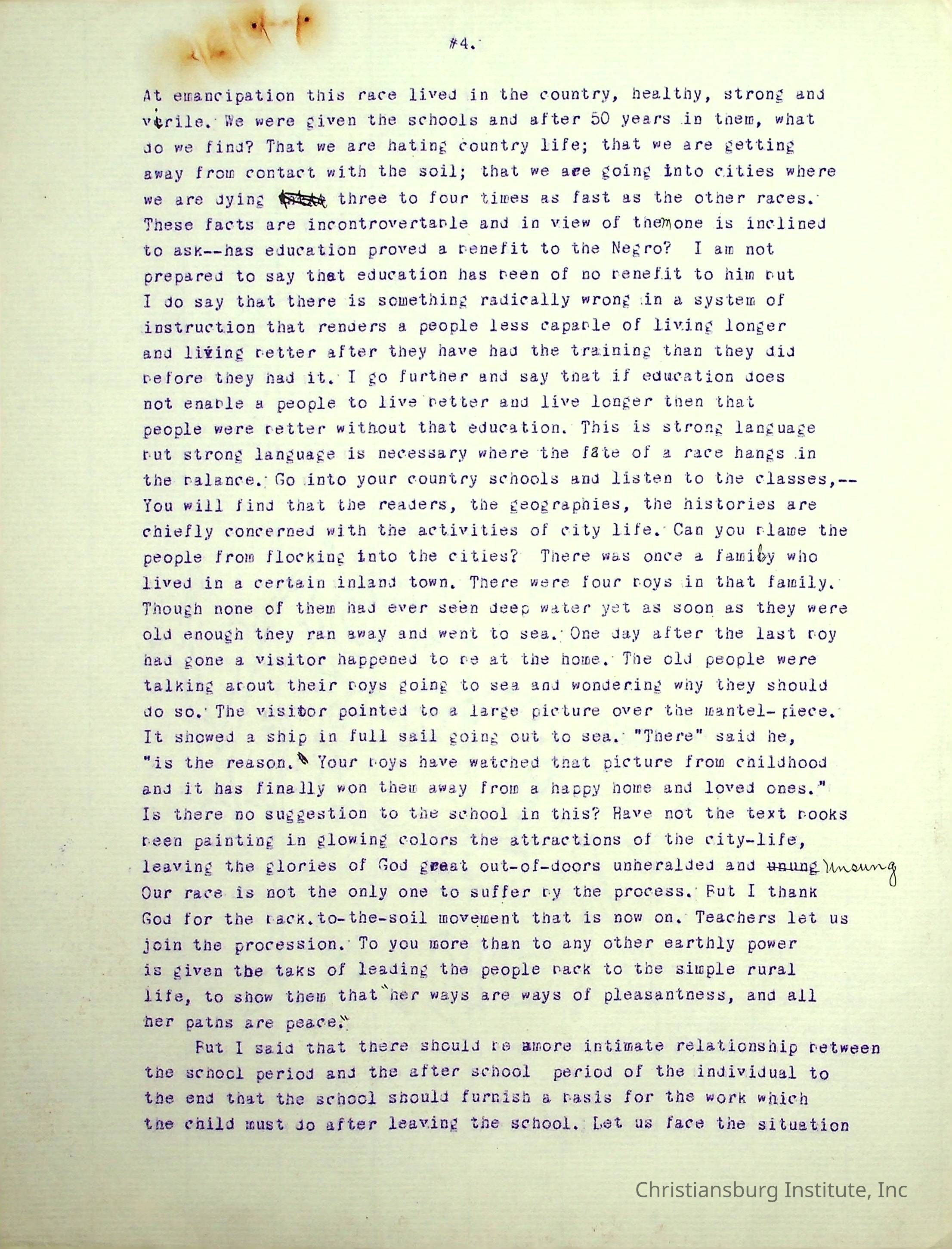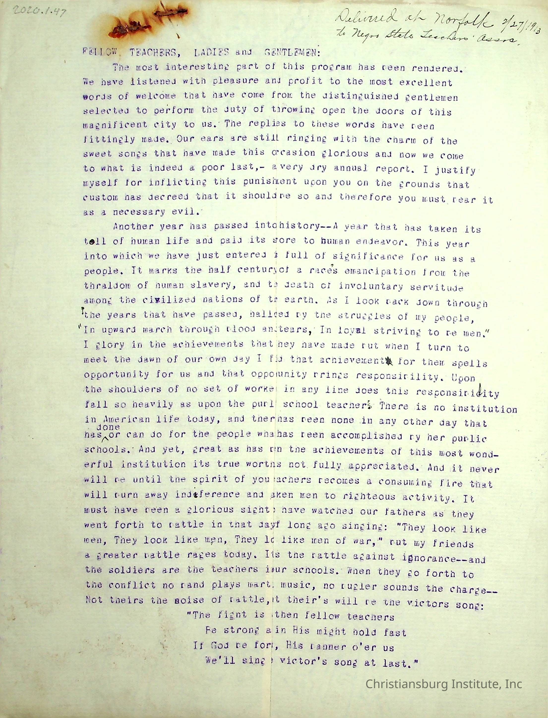 A typed speech written by Edgar A. Long spoken at the State Teachers Association in 1913 in Norfolk, Virginia. Gifted by Carlton Banks in 2001.Collection