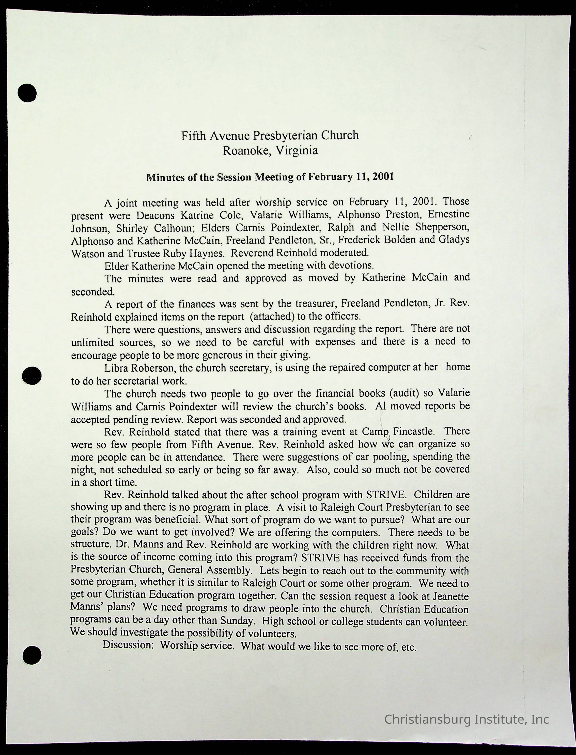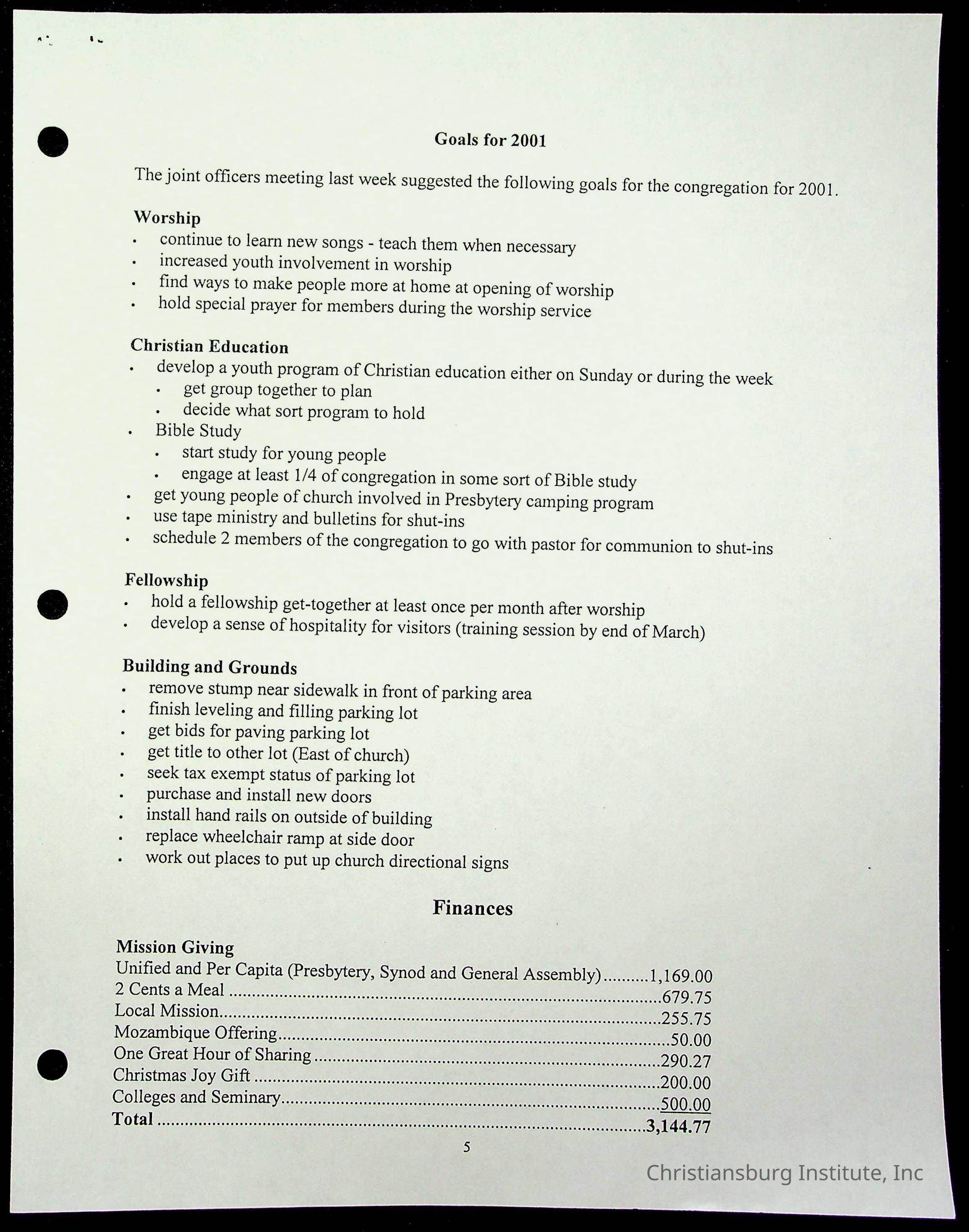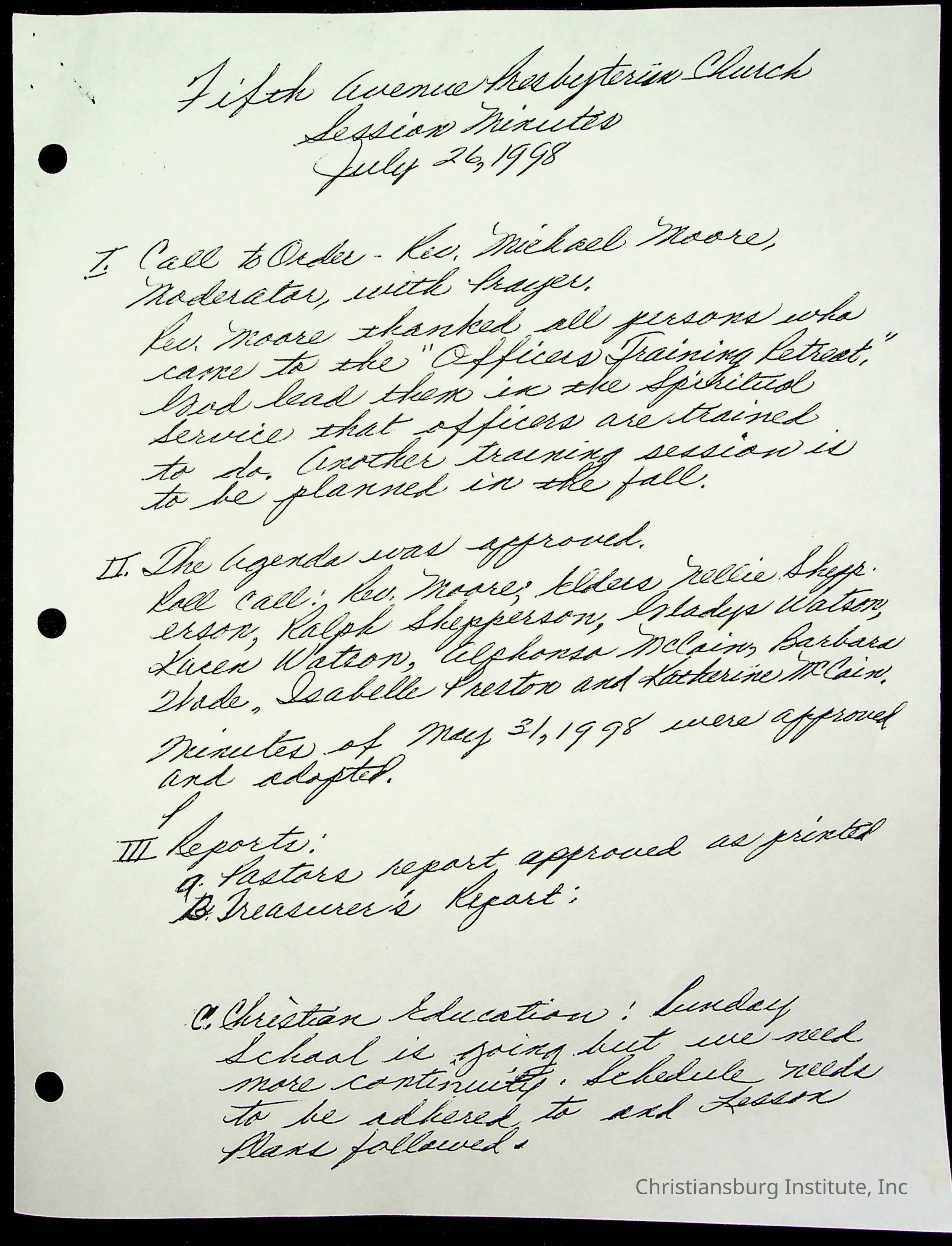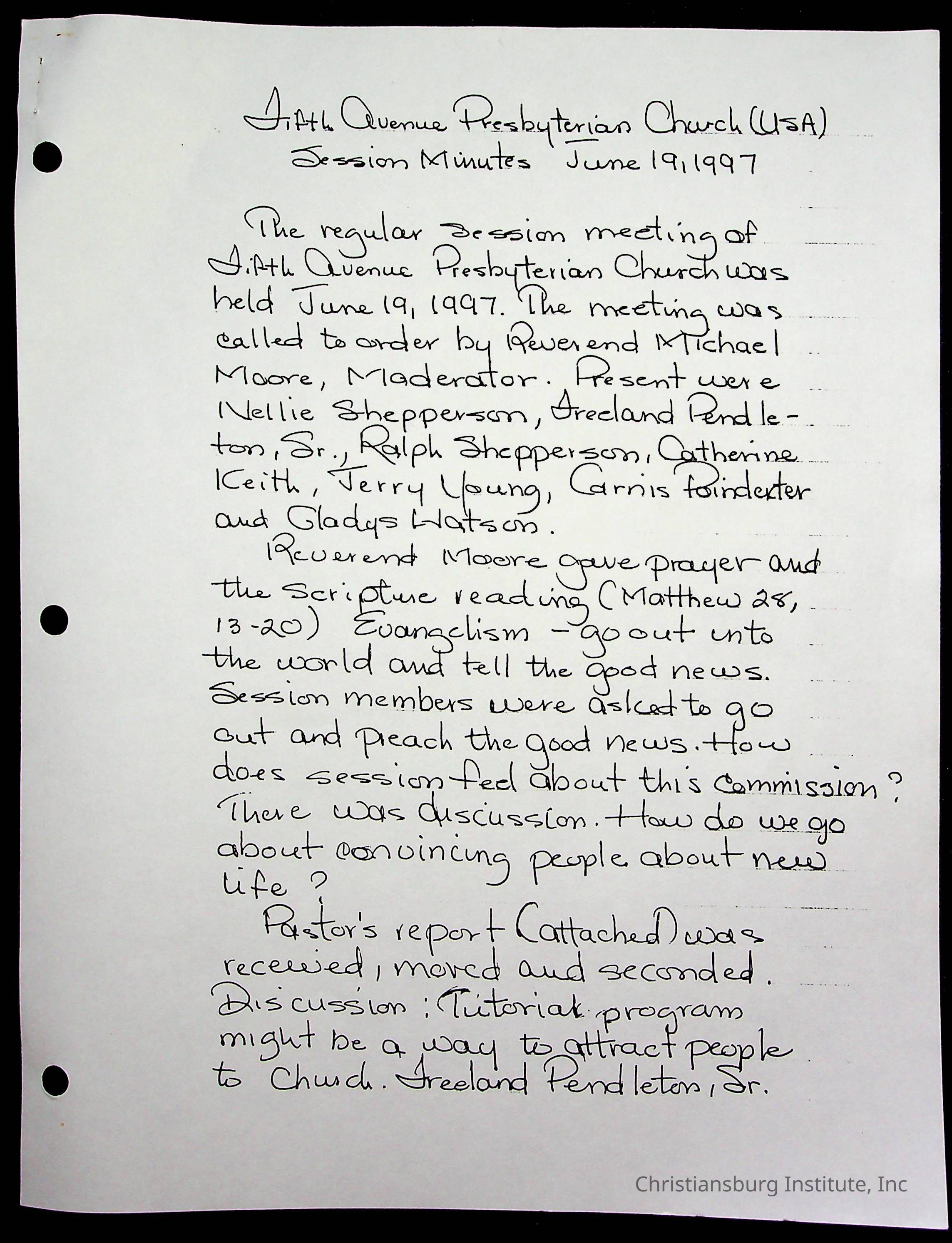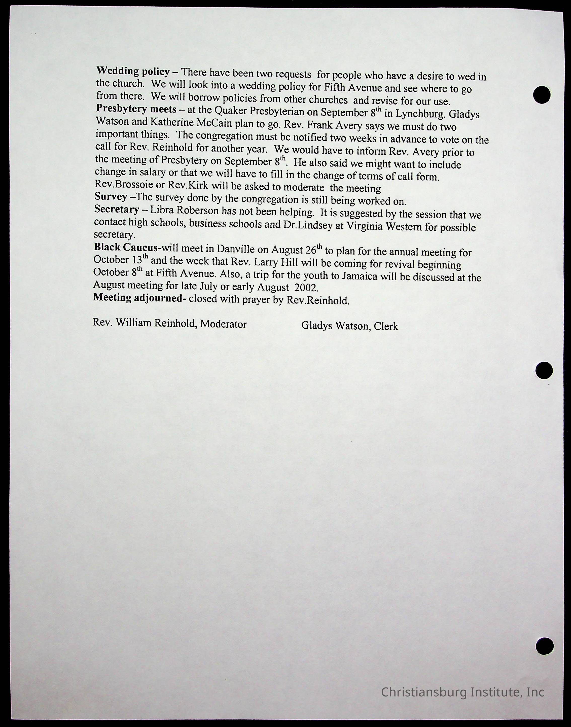 Copyright has been assigned to Christiansburg Institute Museum & Archives by Fifth Avenue Presbyterian Church. For permission to publish materials created by the donor, contact CIMA@christiansburginstitute.com. Materials not created by Fifth Avenue Presbyterian Church may still be under copyright.
