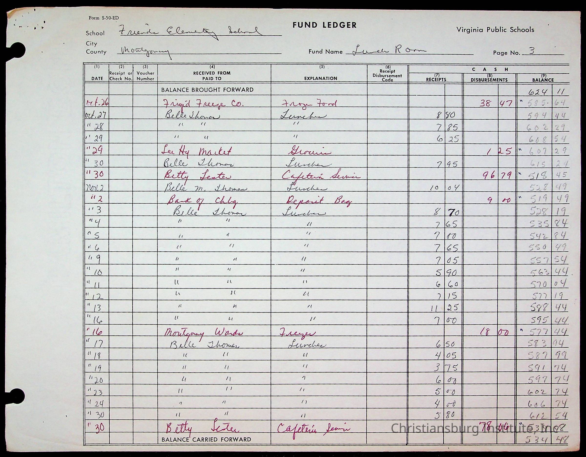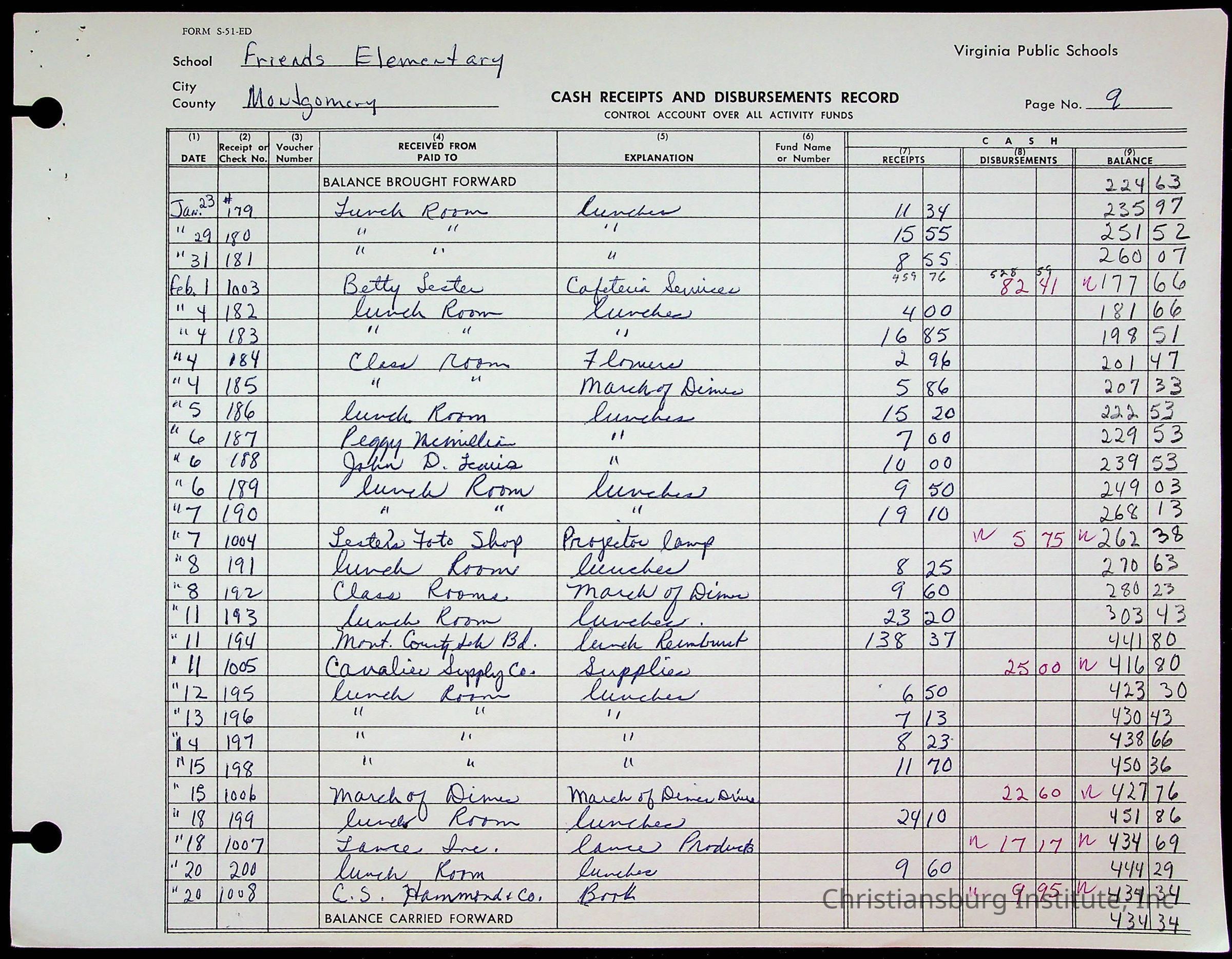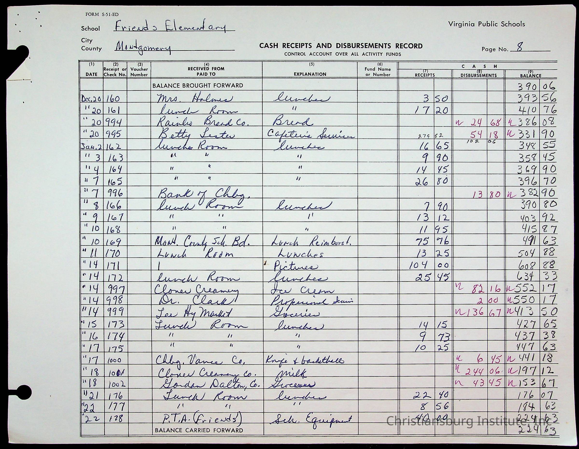 A fund ledger that recorded expenses from Friends Elementary School from 1962-1963.Collection