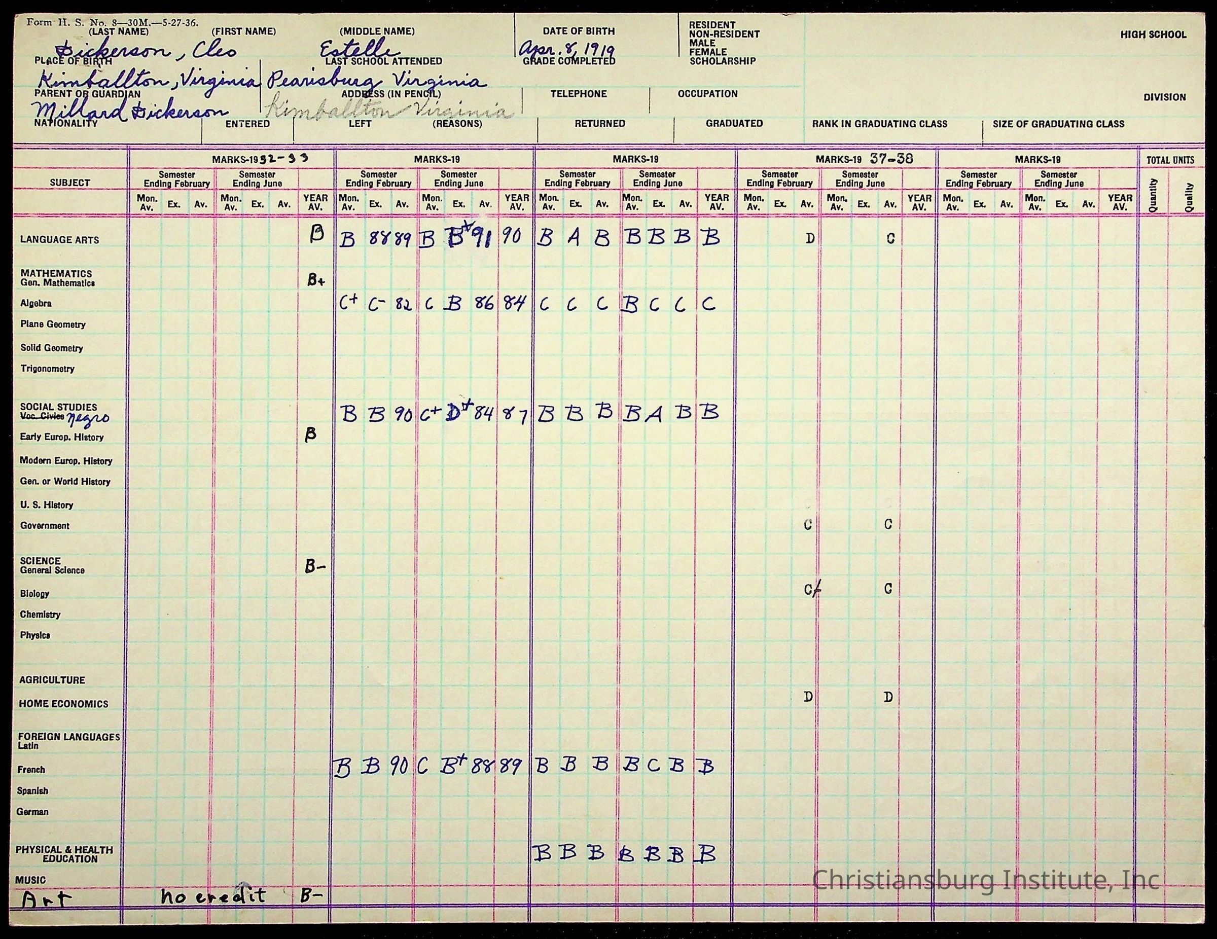 The student file for the Christiansburg Institute student, Cleo Estelle Dickerson circa 1930s.