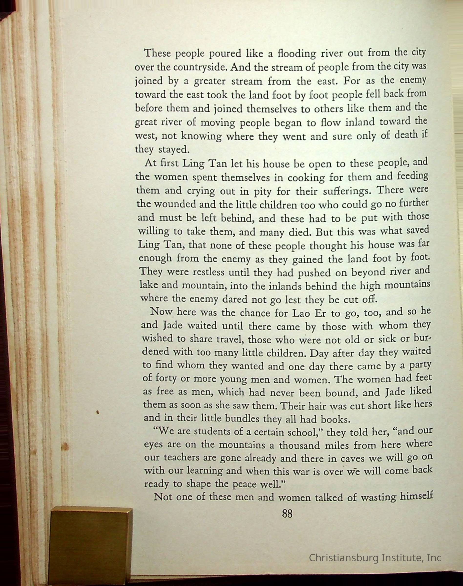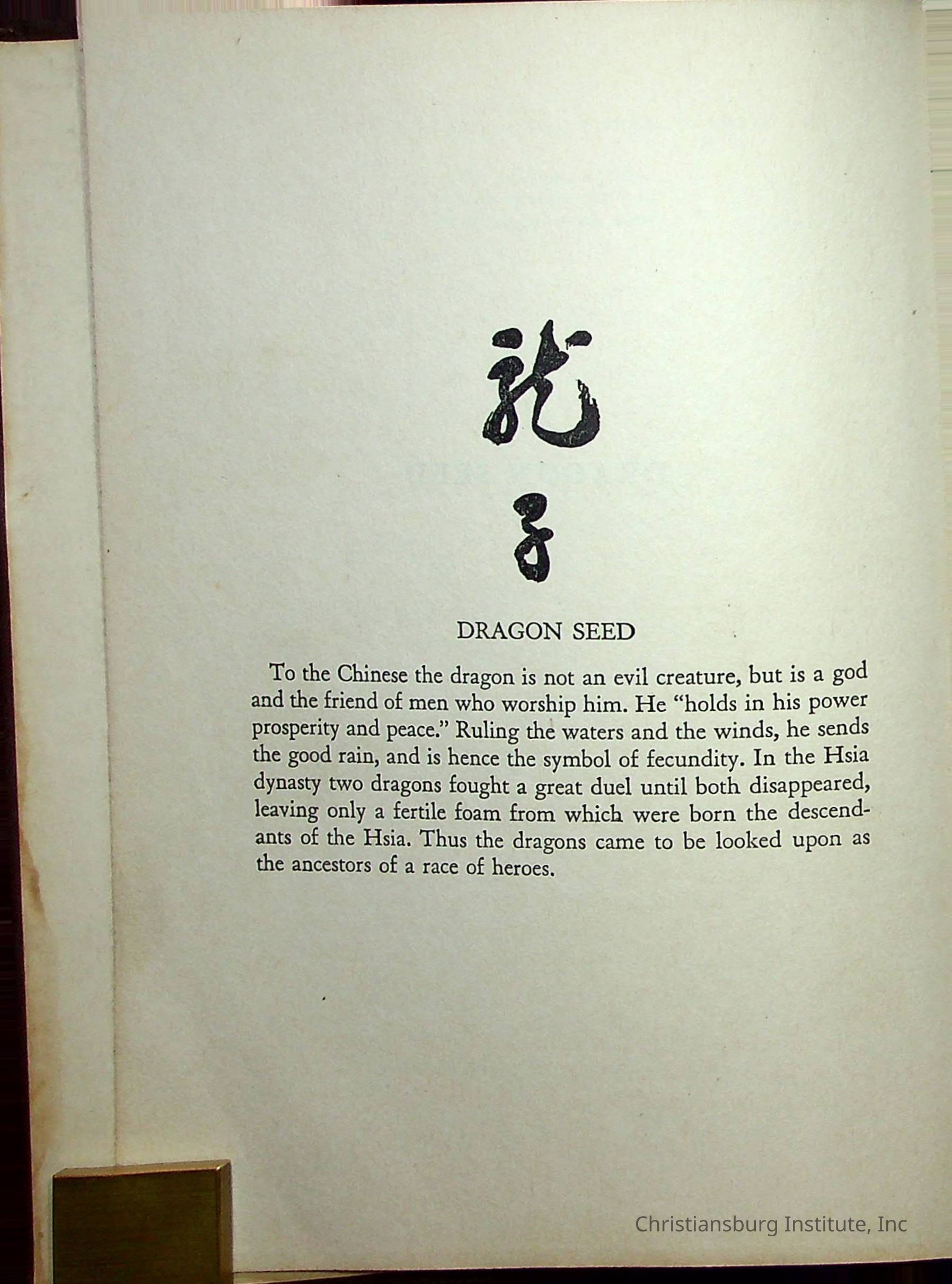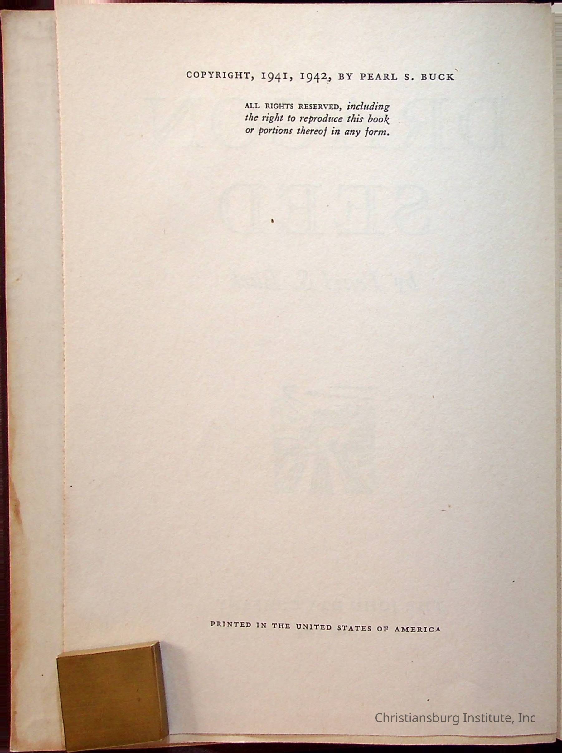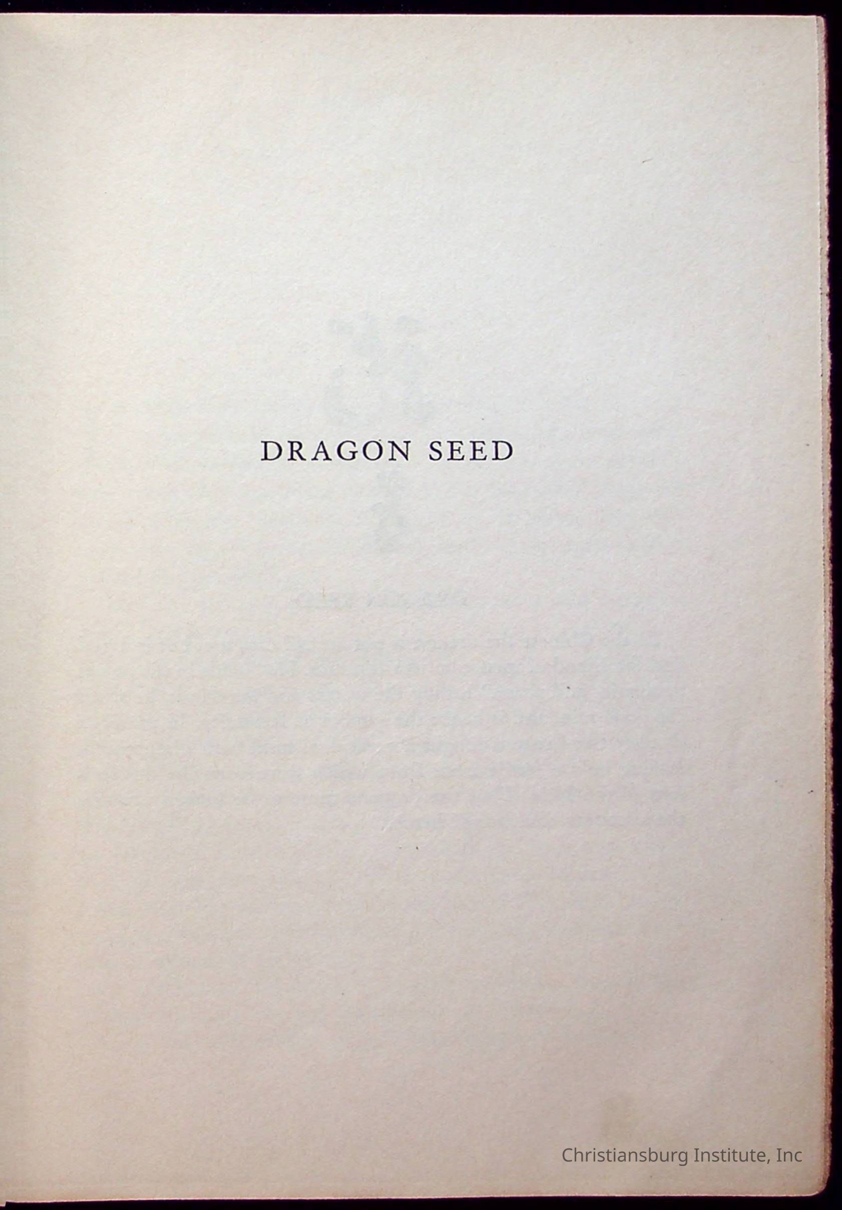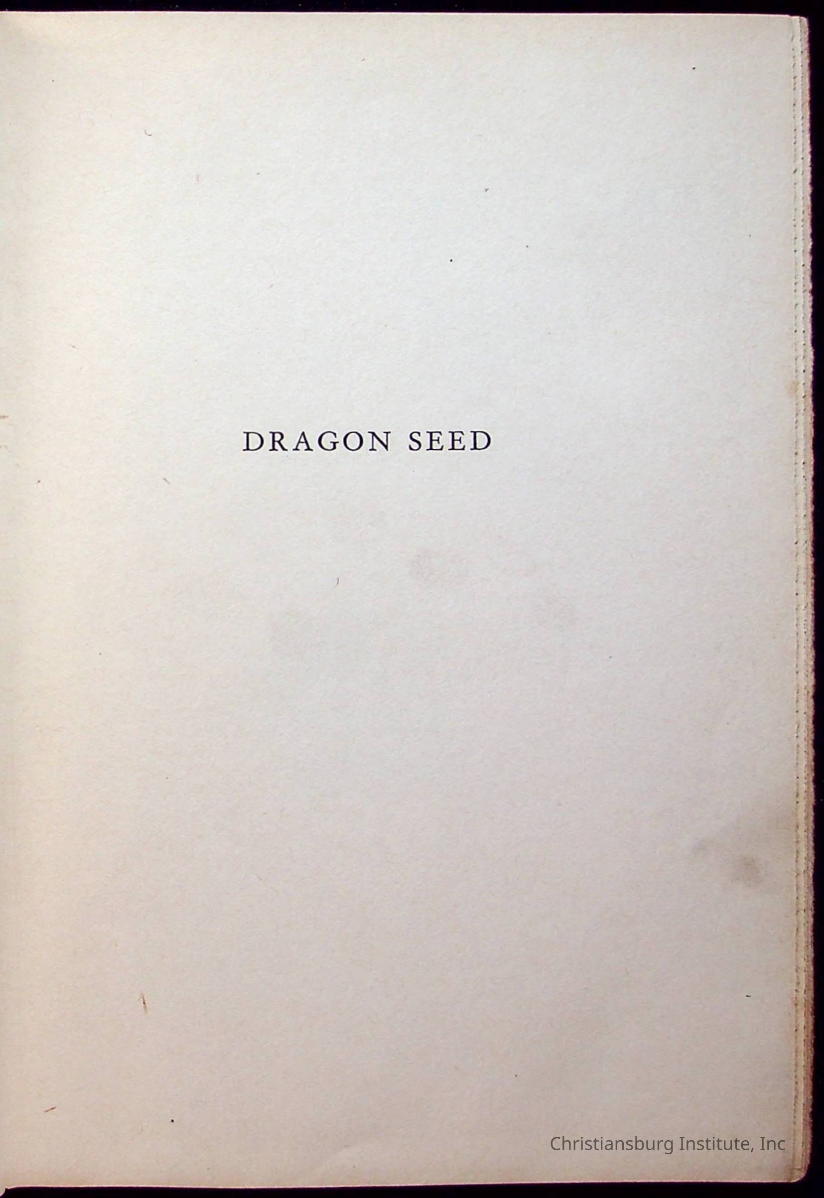 Dragon Seed, written by Pearl S. Buck and published in the year 1942. This book was used by Christiansburg Institute teacher, Viola Charlton in her class.Collection