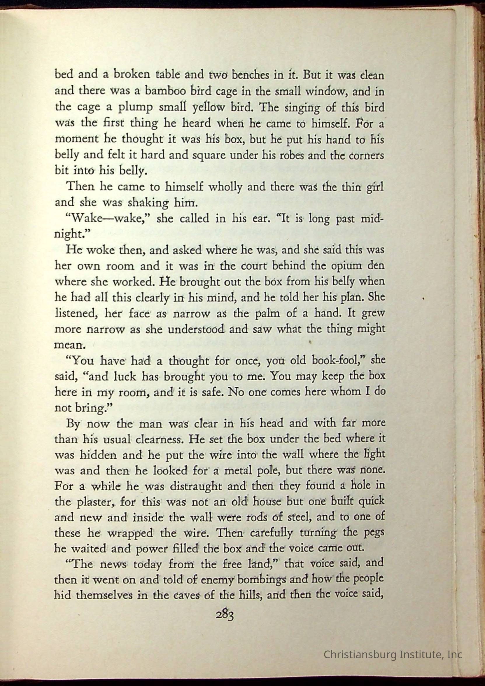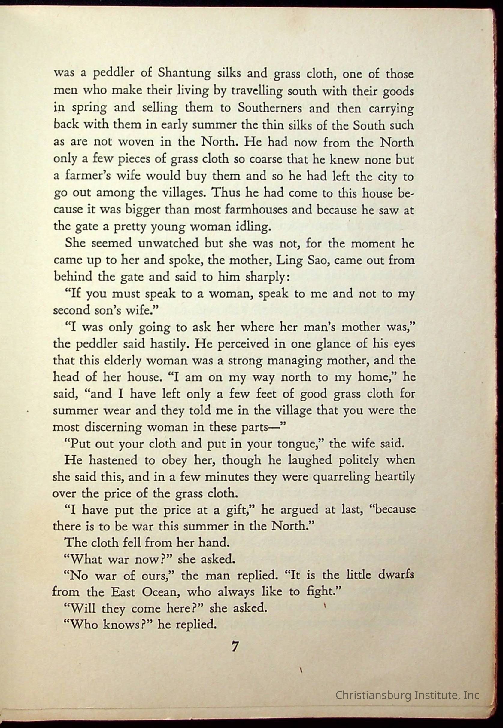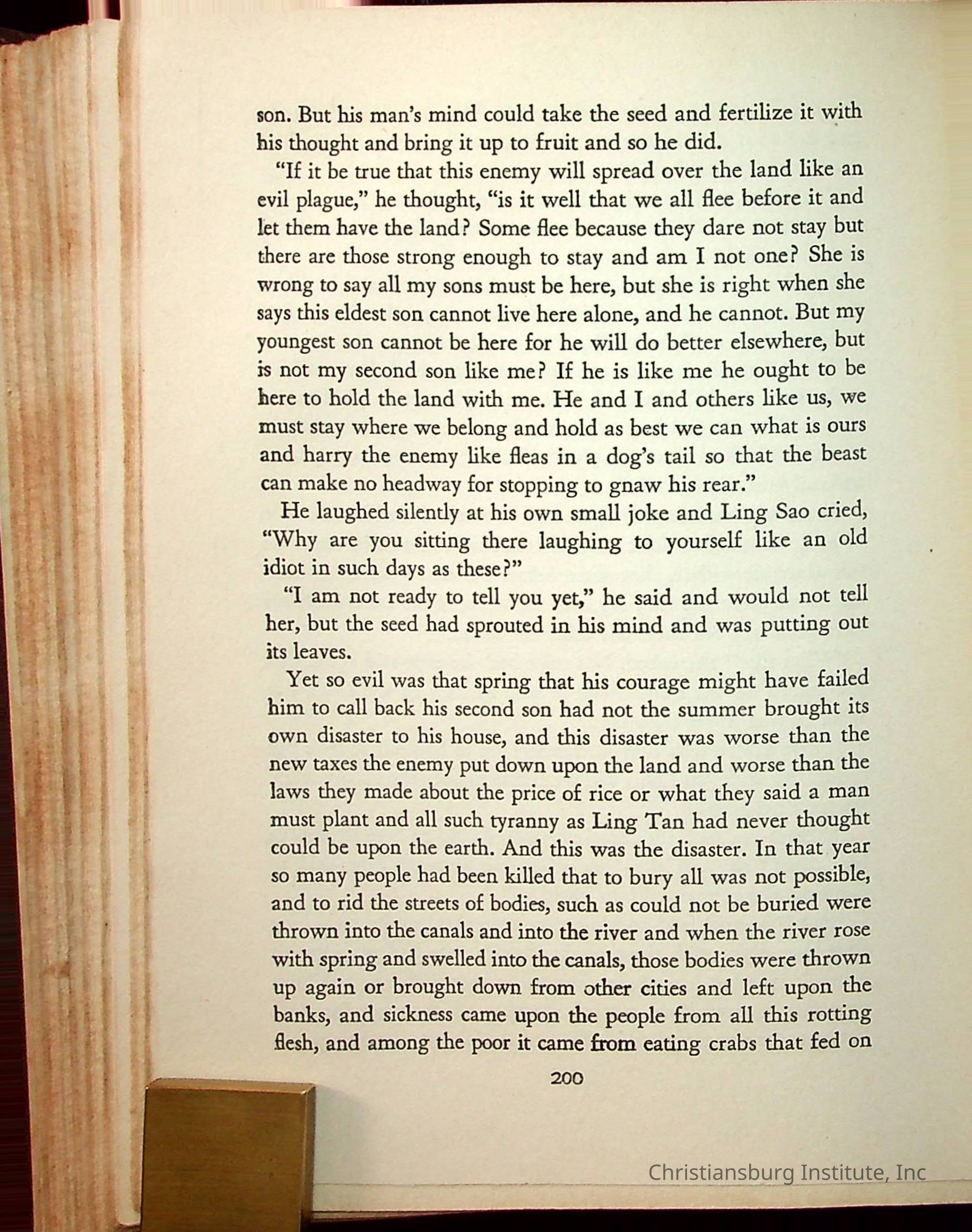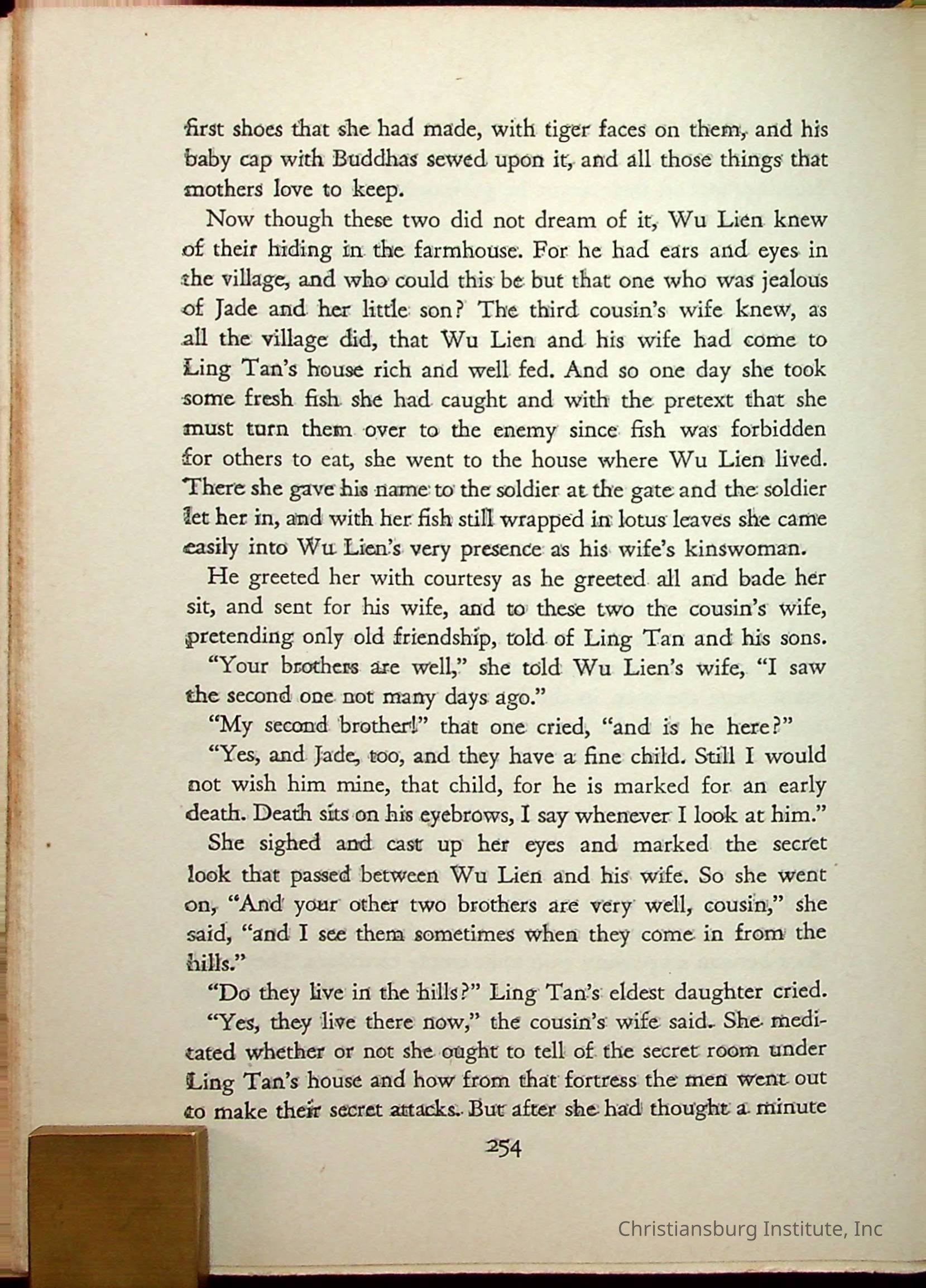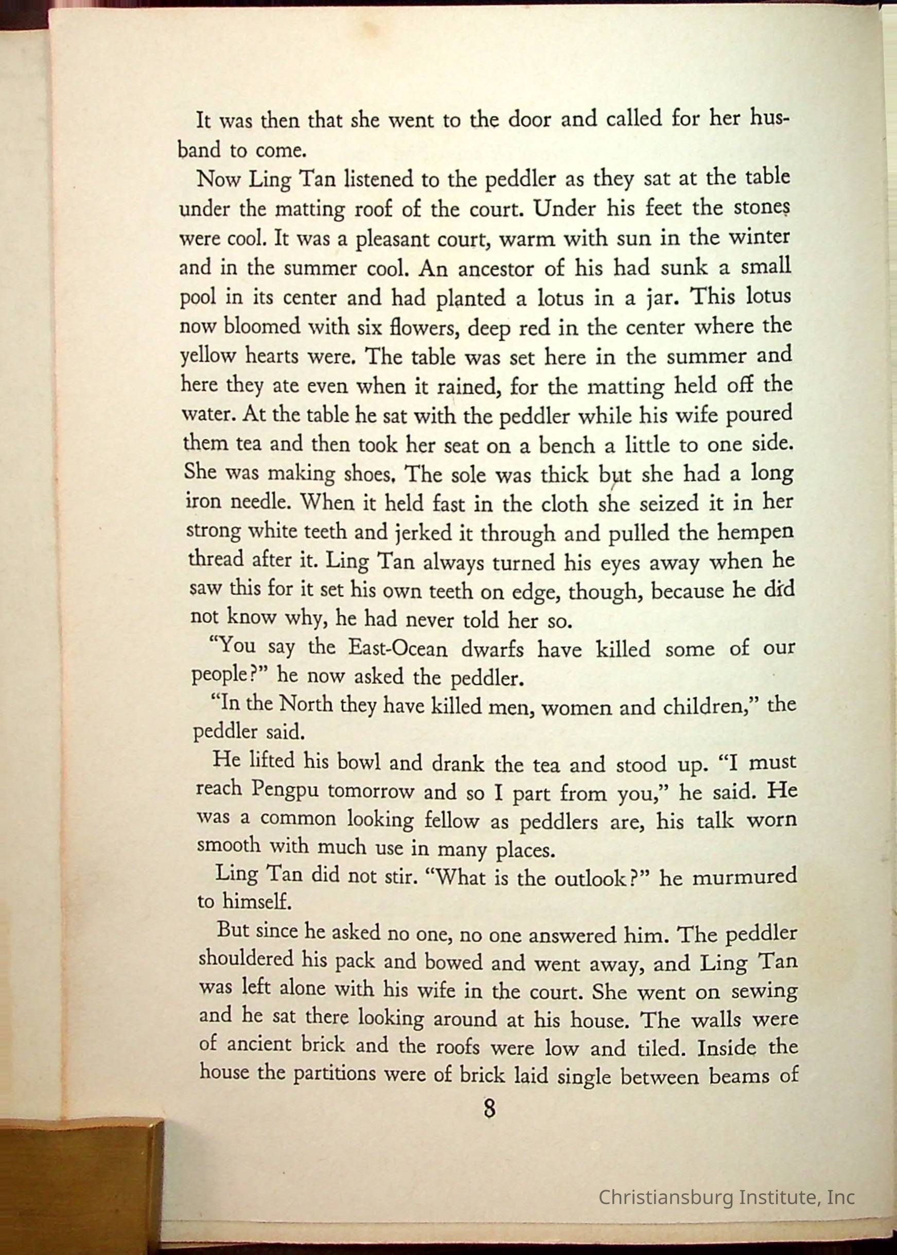 Dragon Seed, written by Pearl S. Buck and published in the year 1942. This book was used by Christiansburg Institute teacher, Viola Charlton in her class.Collection