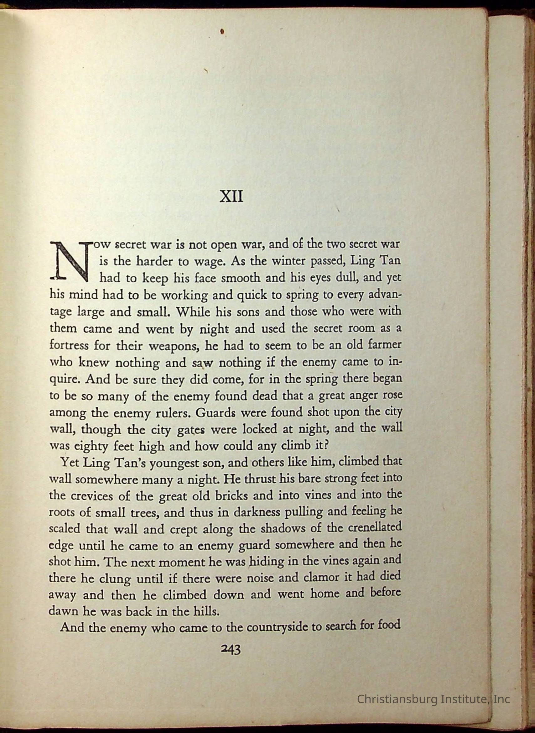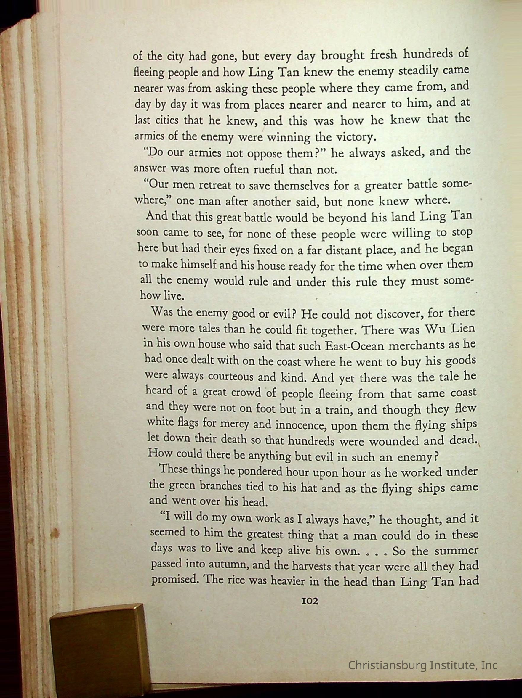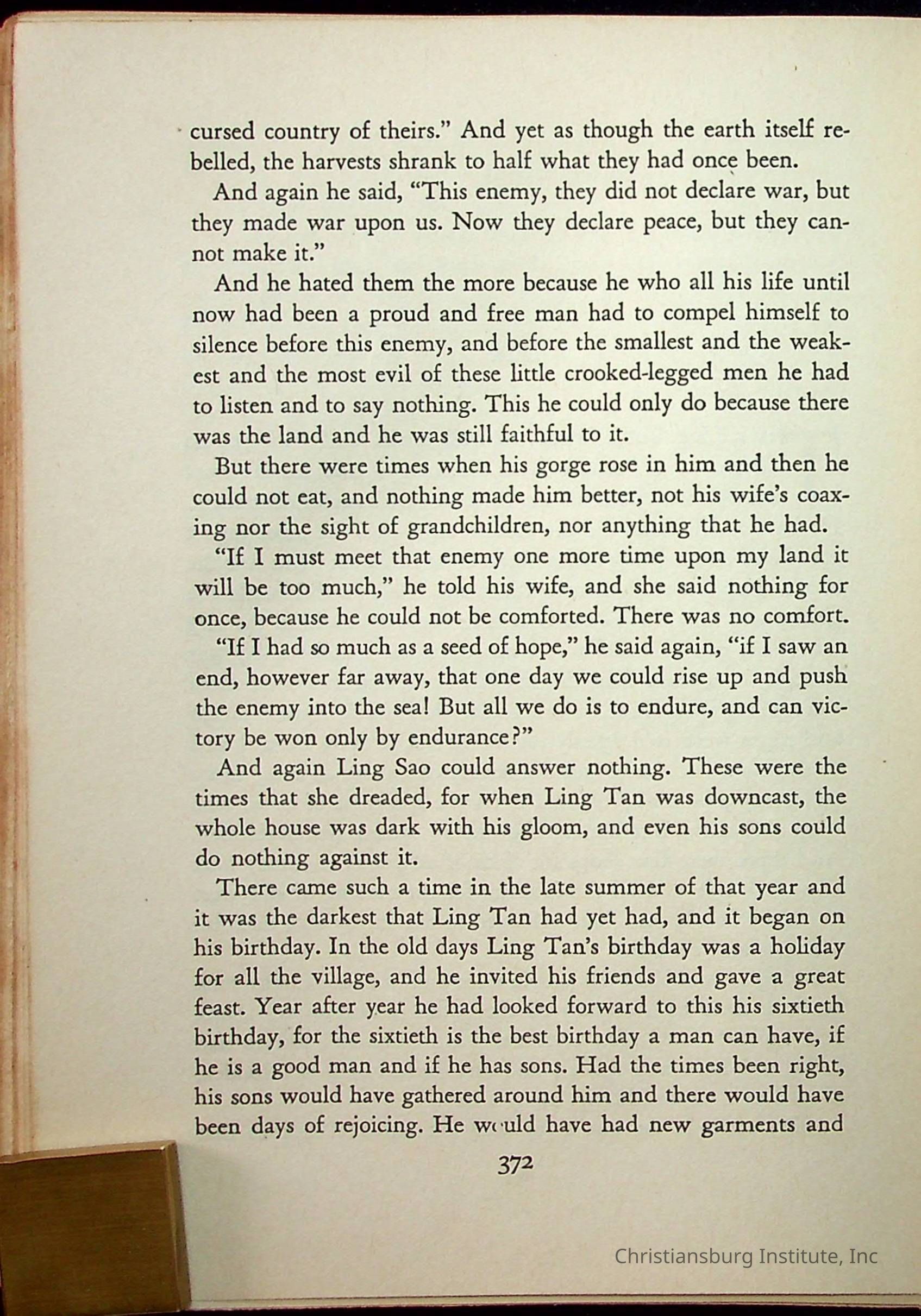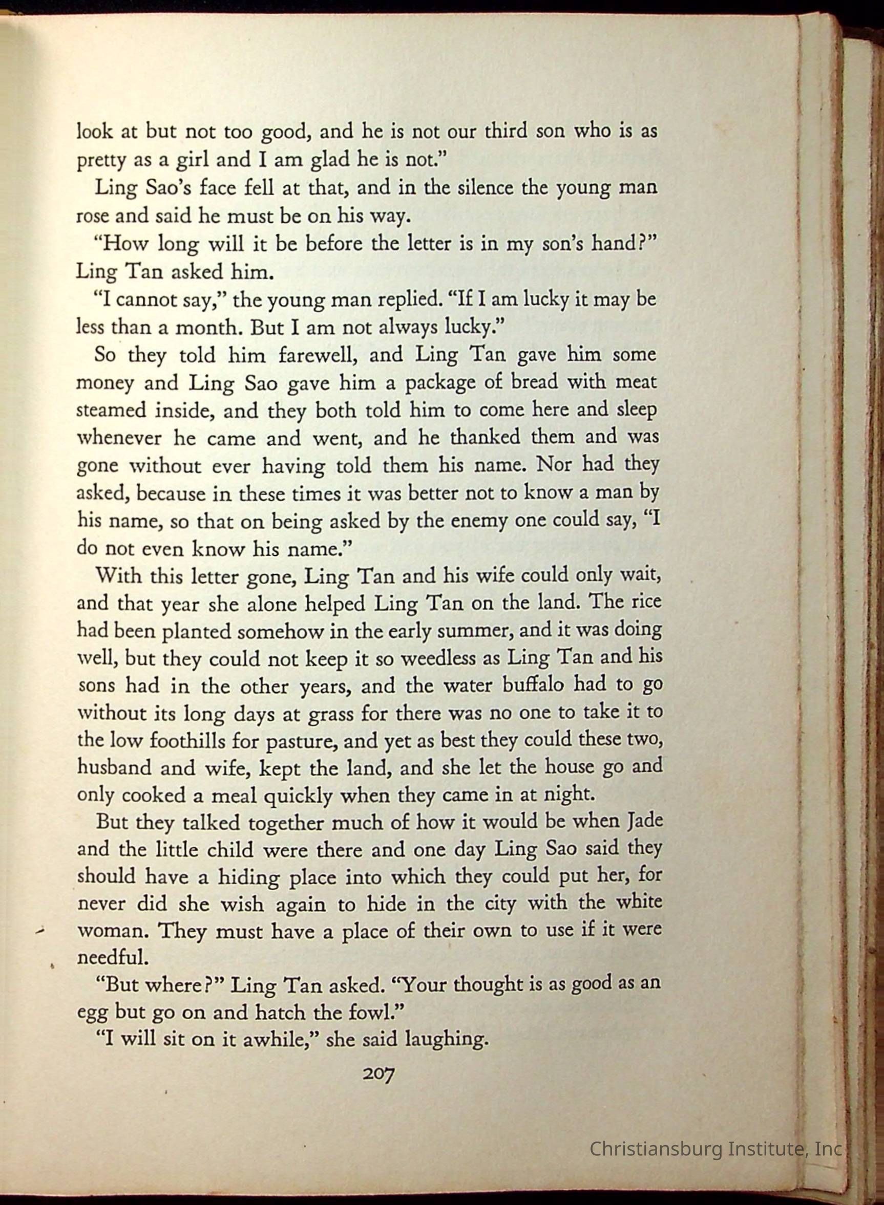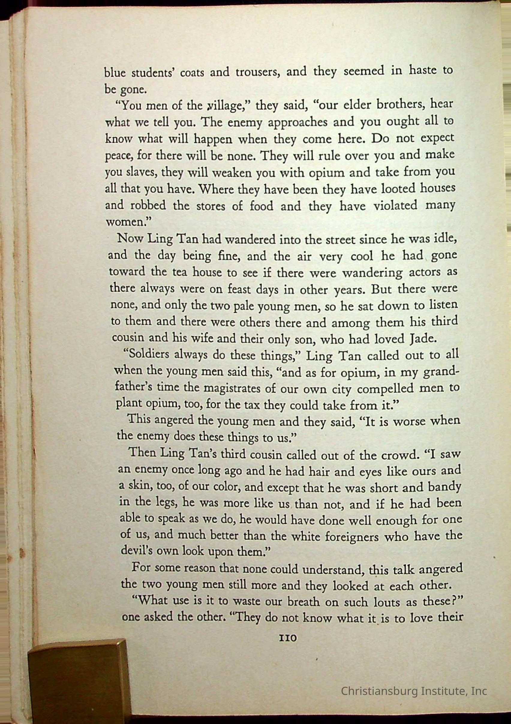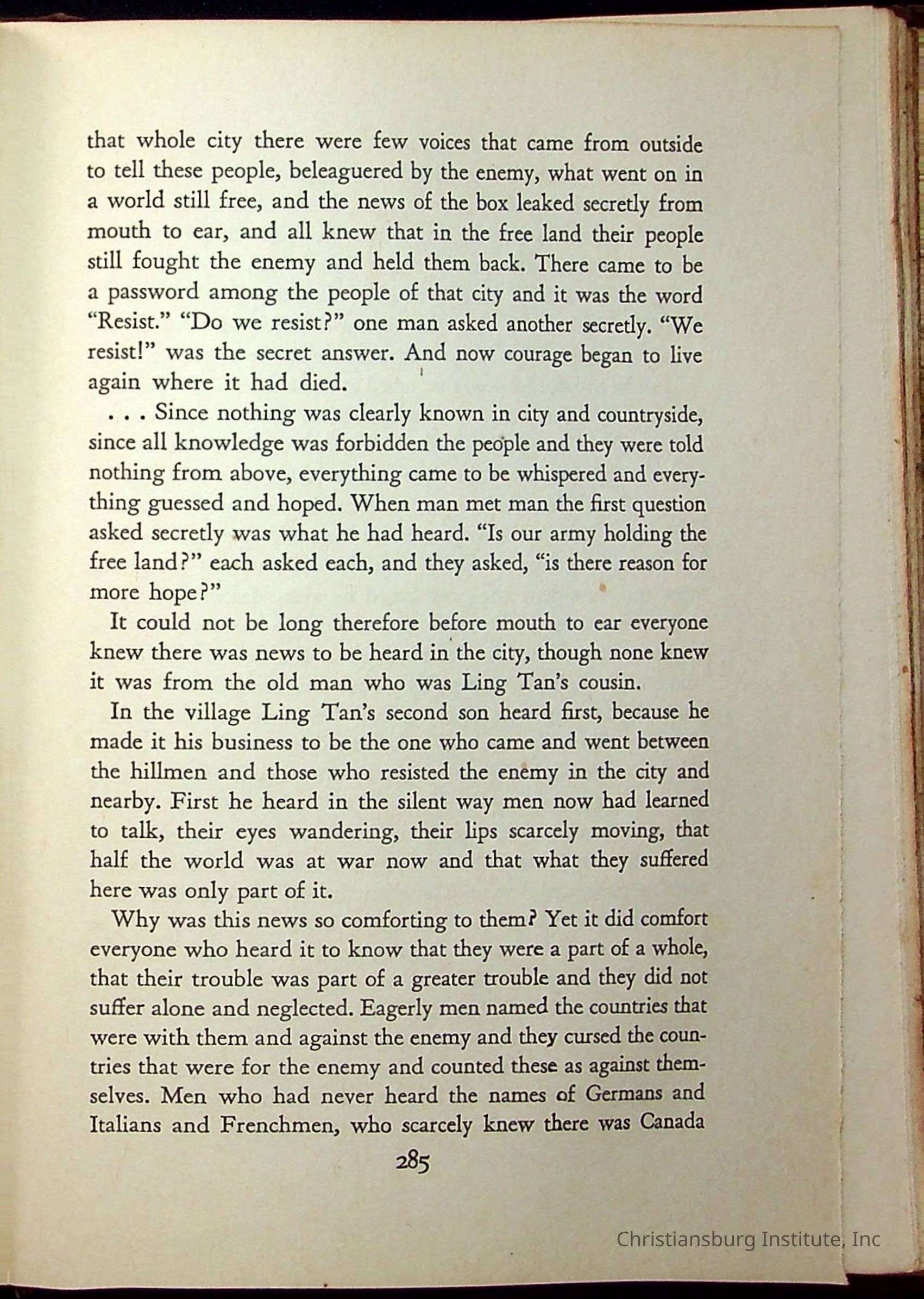 Dragon Seed, written by Pearl S. Buck and published in the year 1942. This book was used by Christiansburg Institute teacher, Viola Charlton in her class.Collection