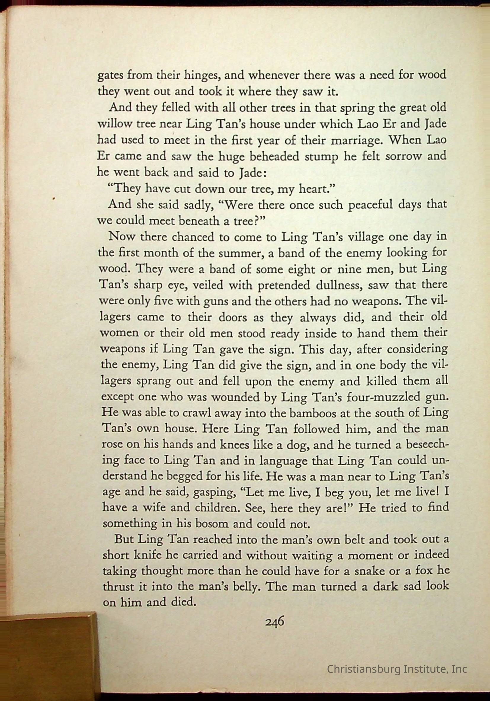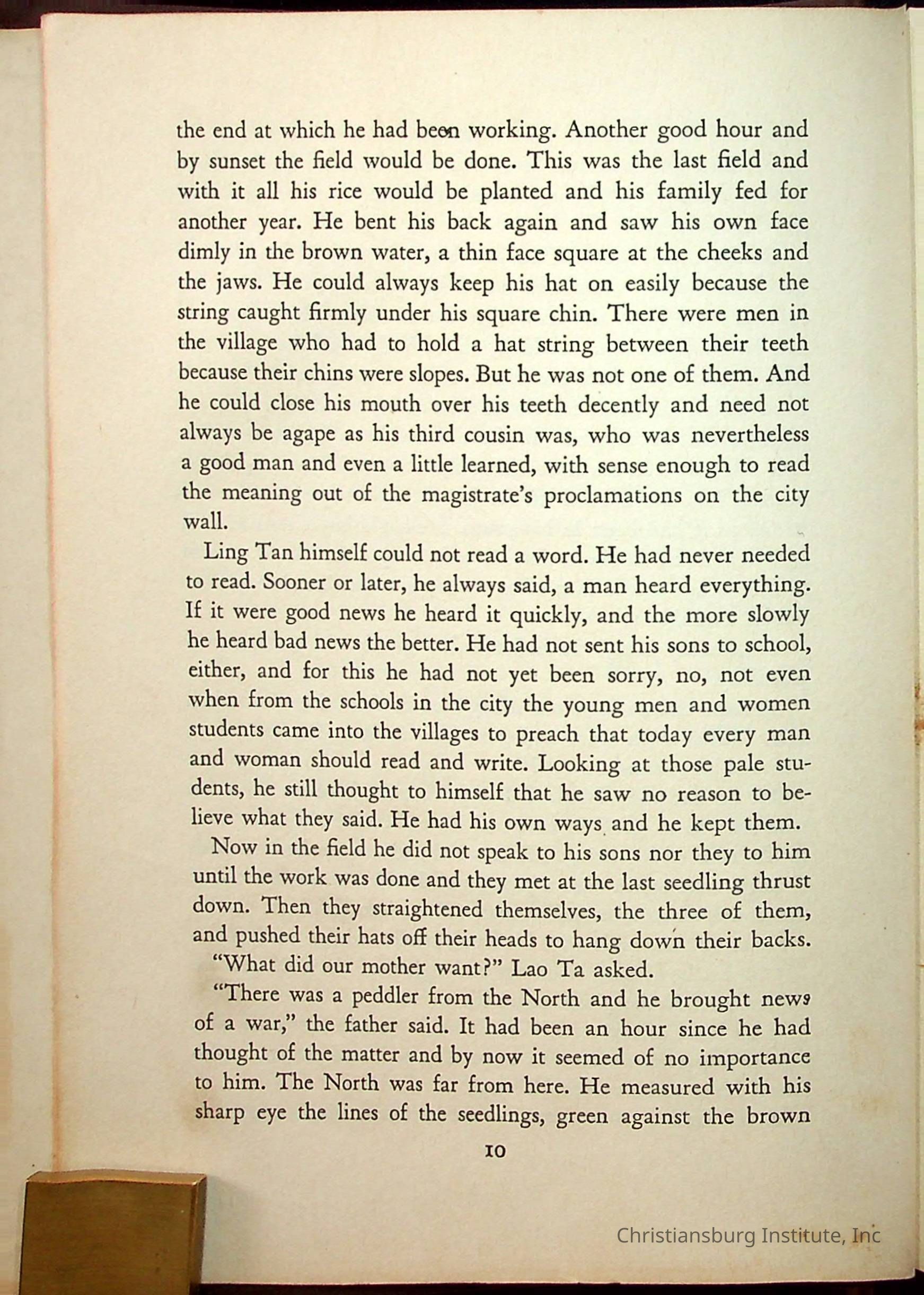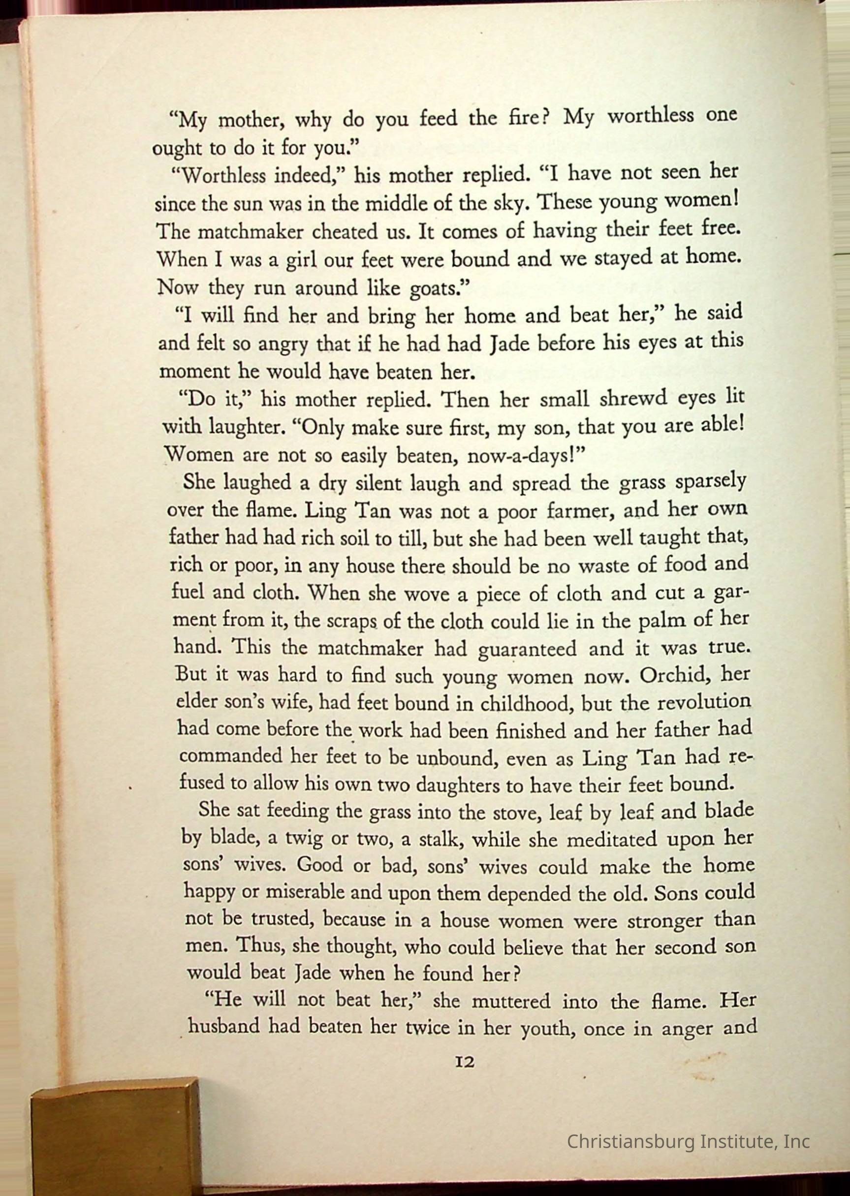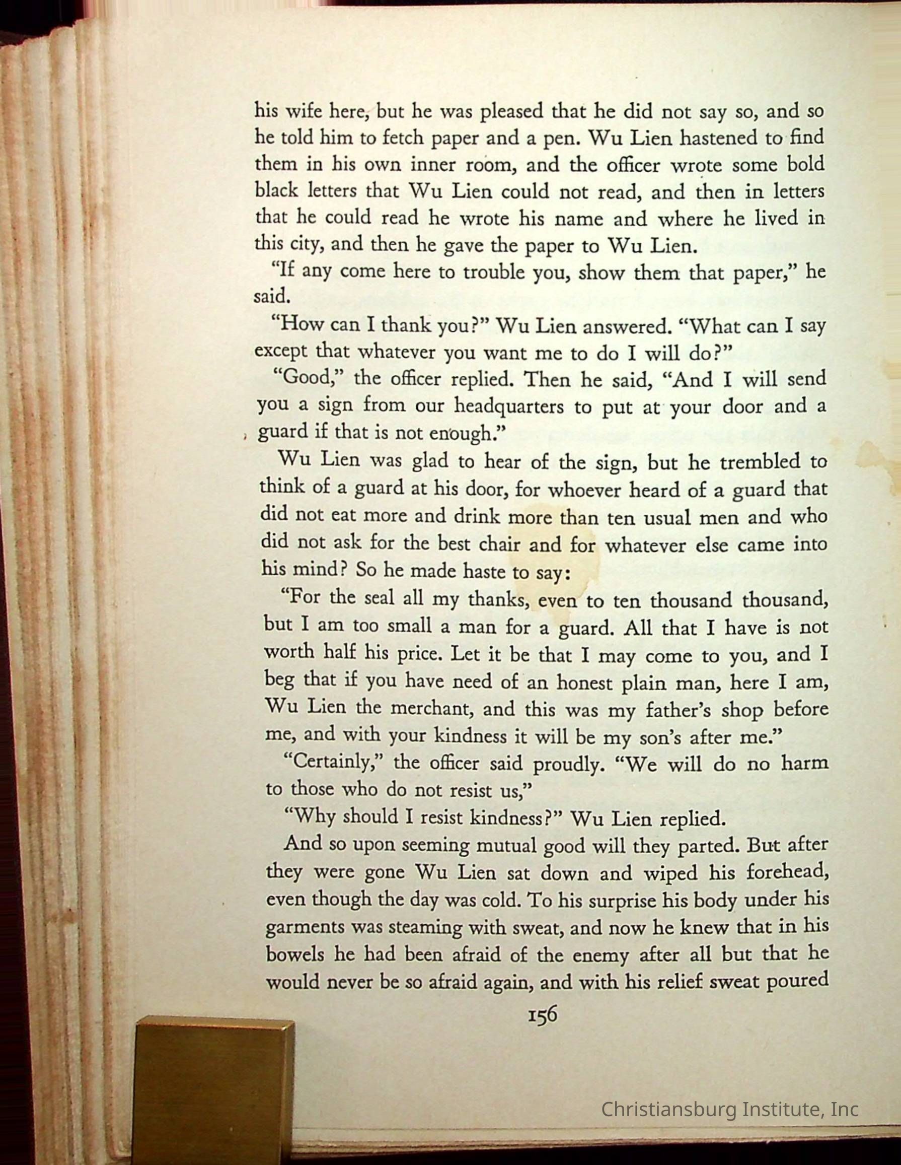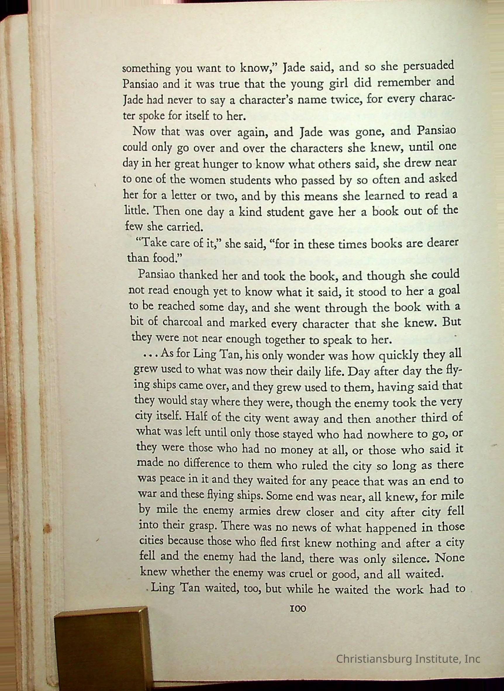 Dragon Seed, written by Pearl S. Buck and published in the year 1942. This book was used by Christiansburg Institute teacher, Viola Charlton in her class.Collection