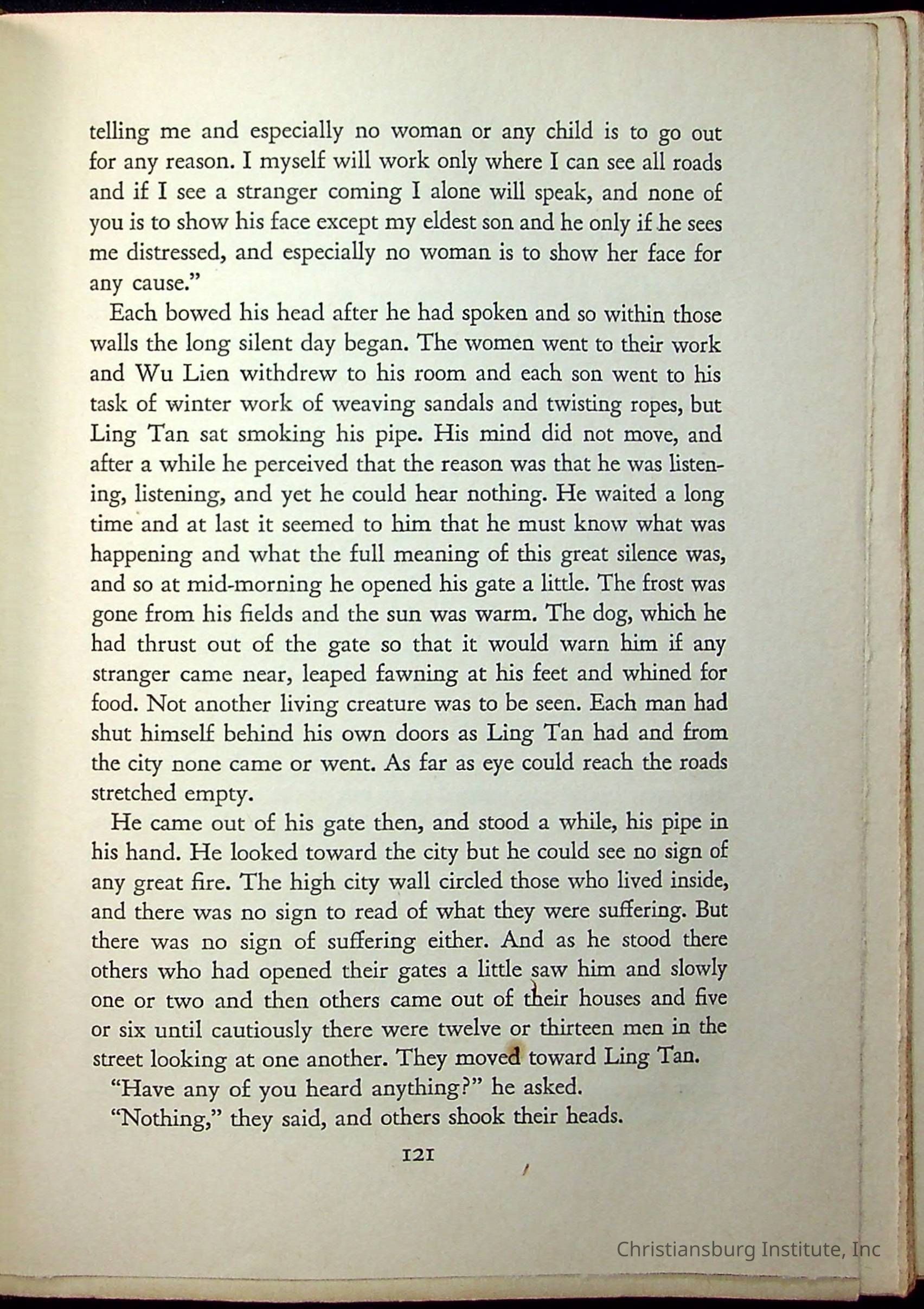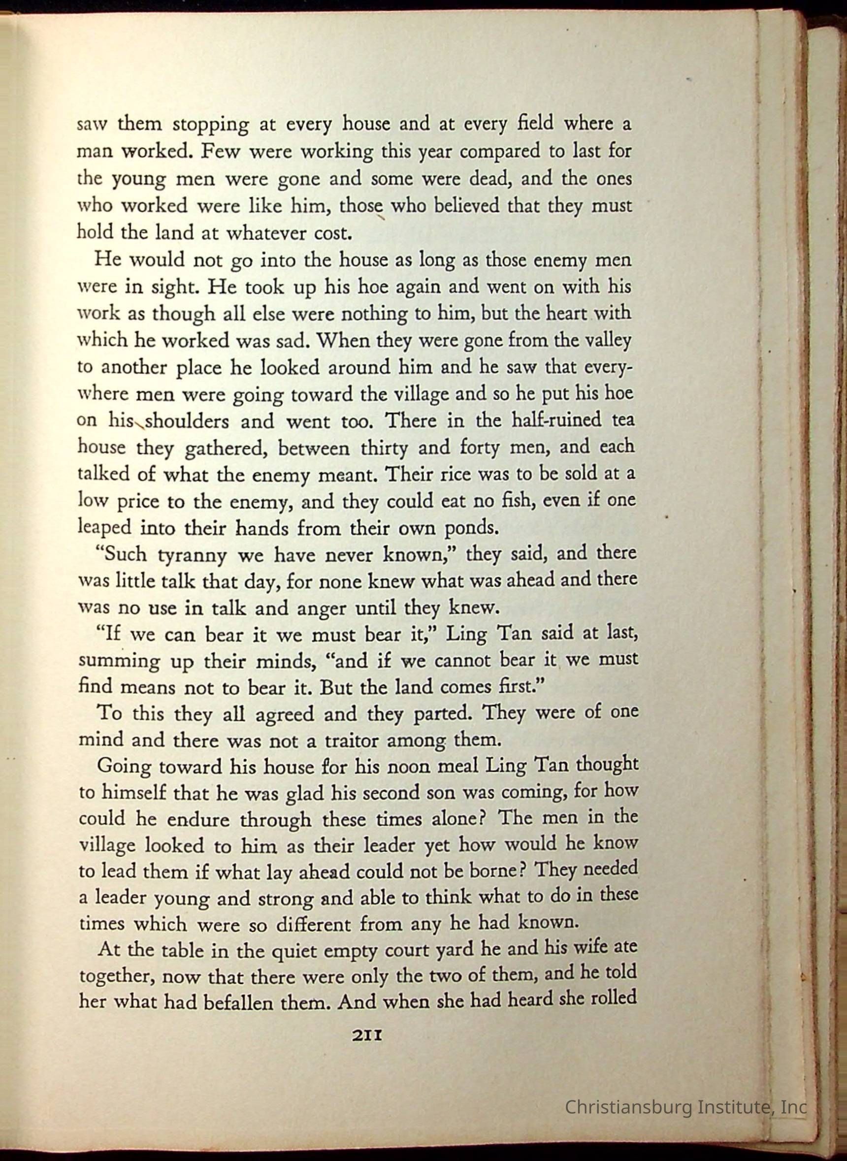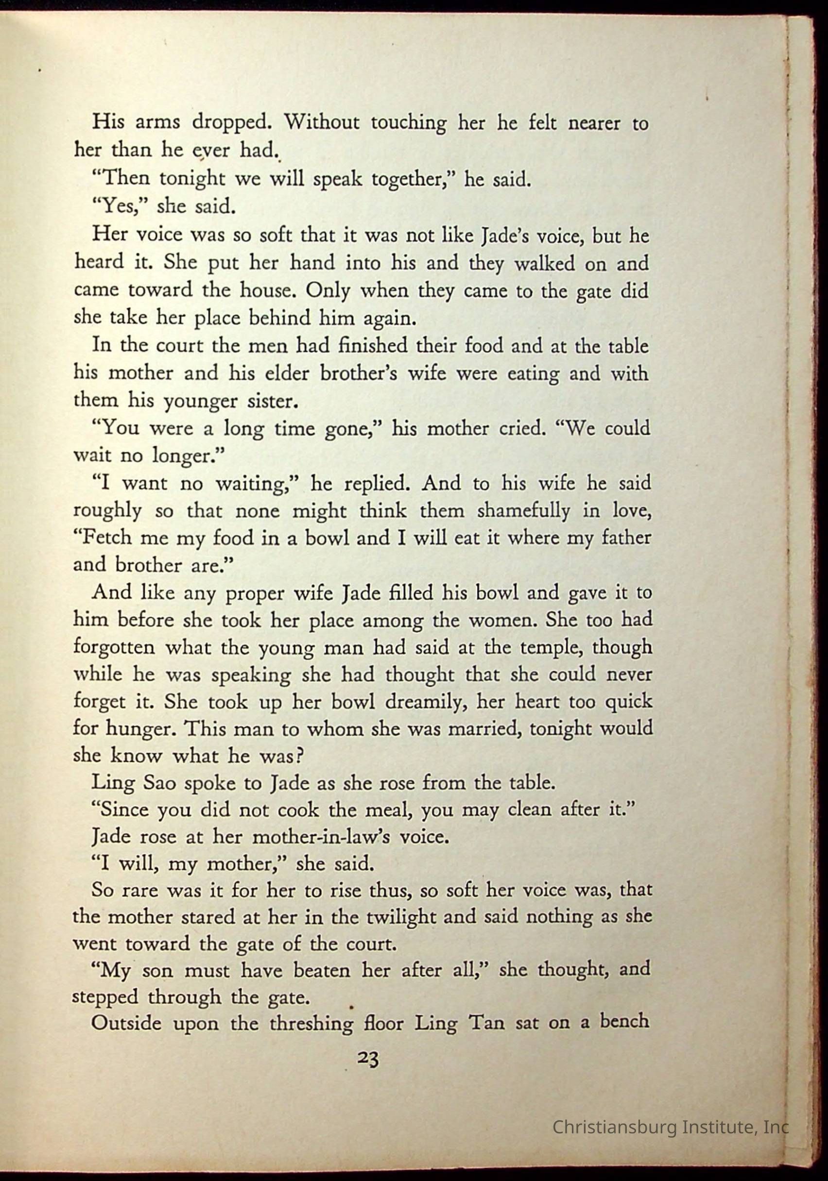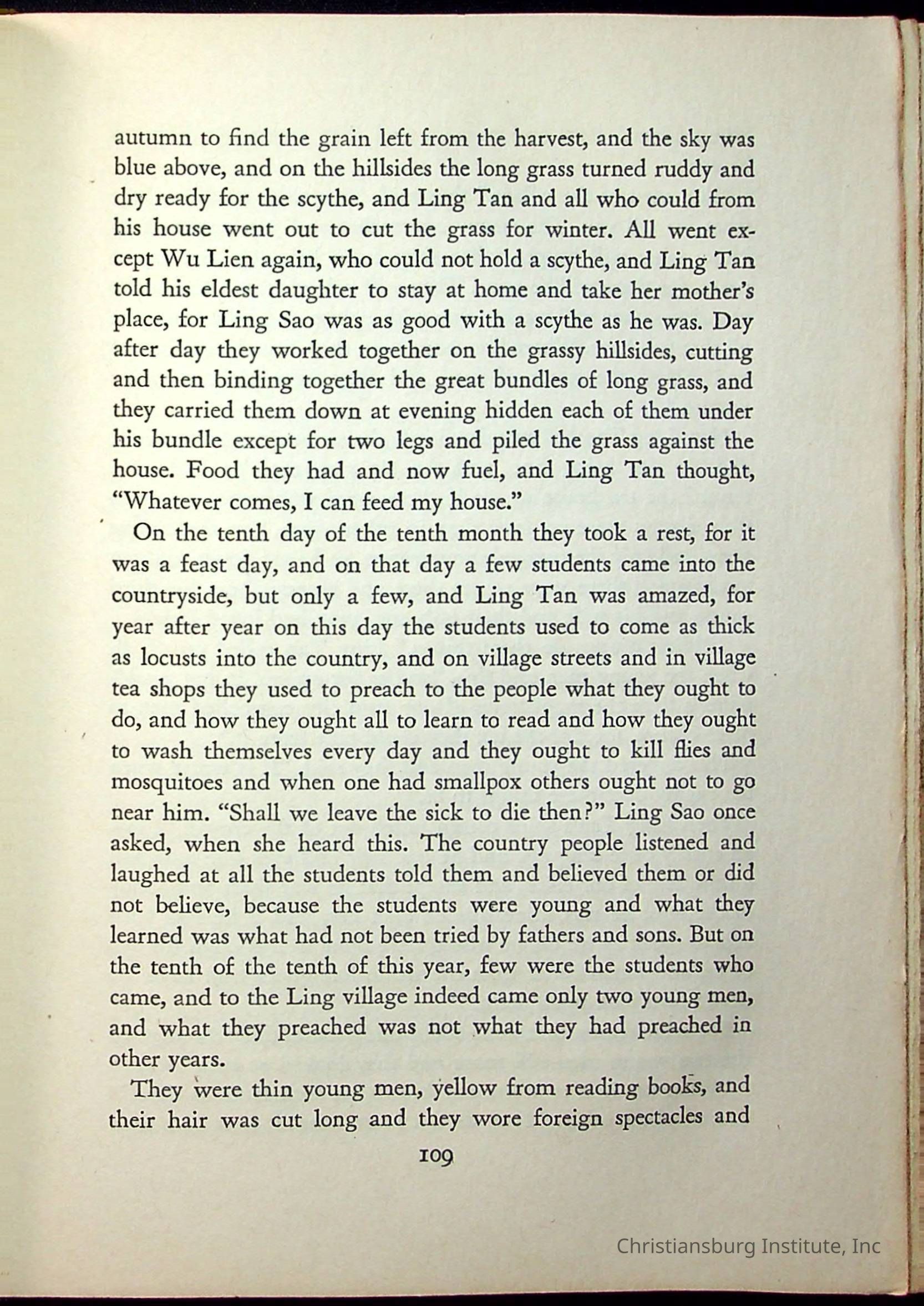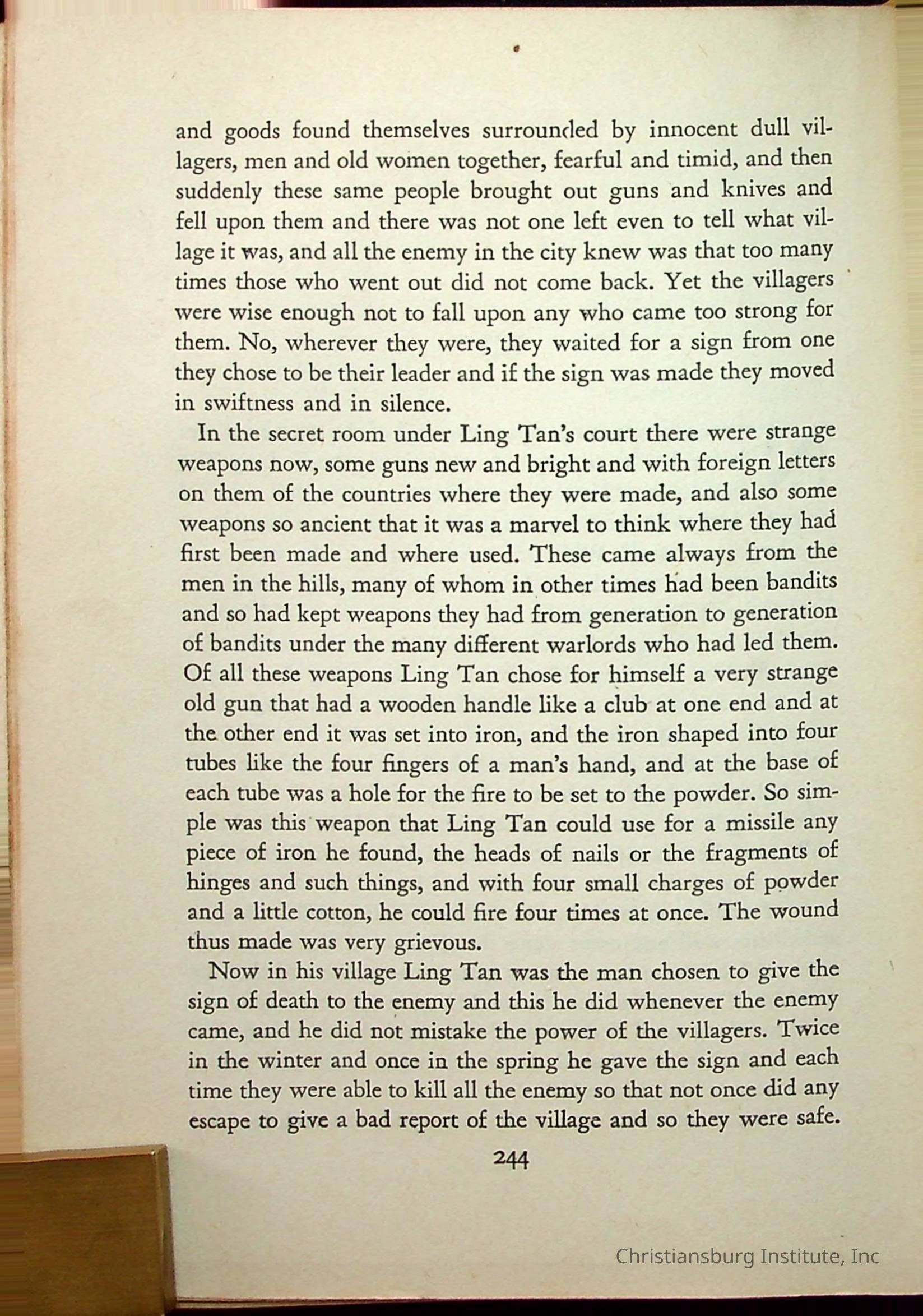 Dragon Seed, written by Pearl S. Buck and published in the year 1942. This book was used by Christiansburg Institute teacher, Viola Charlton in her class.Collection