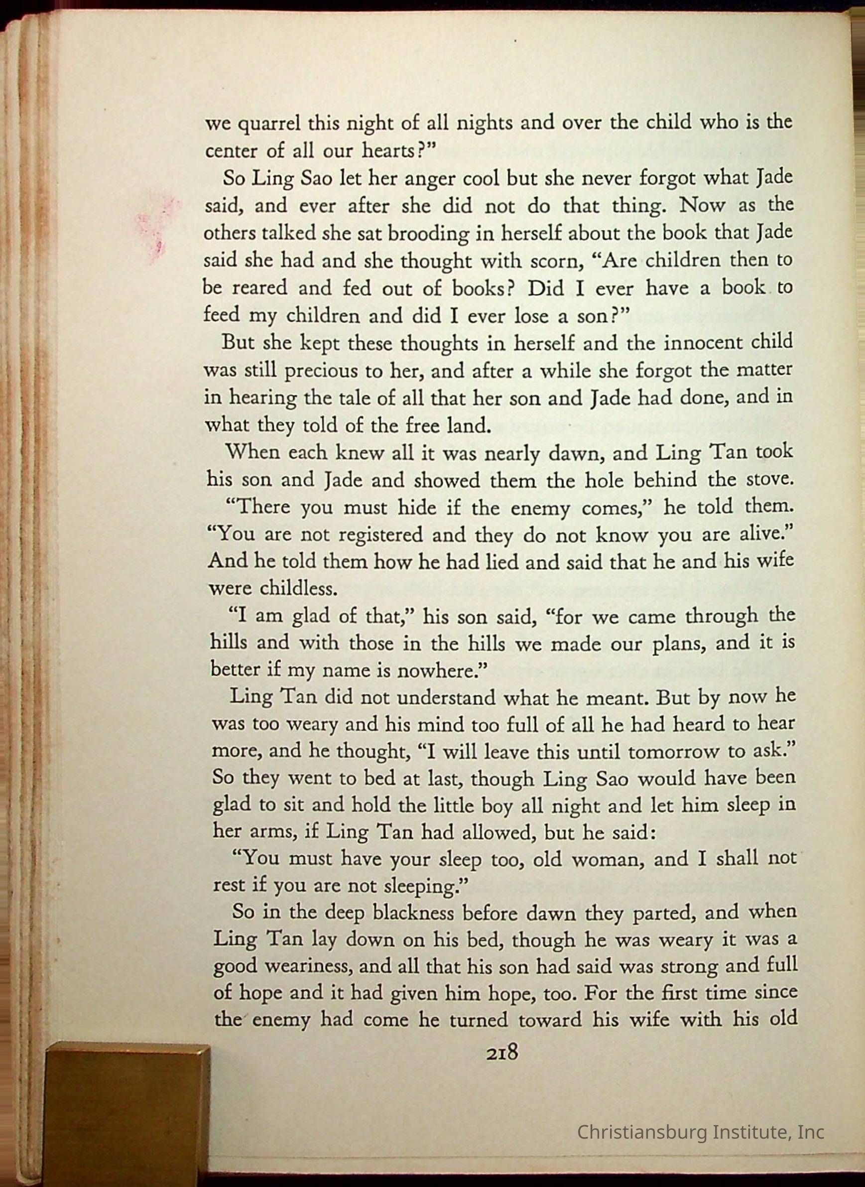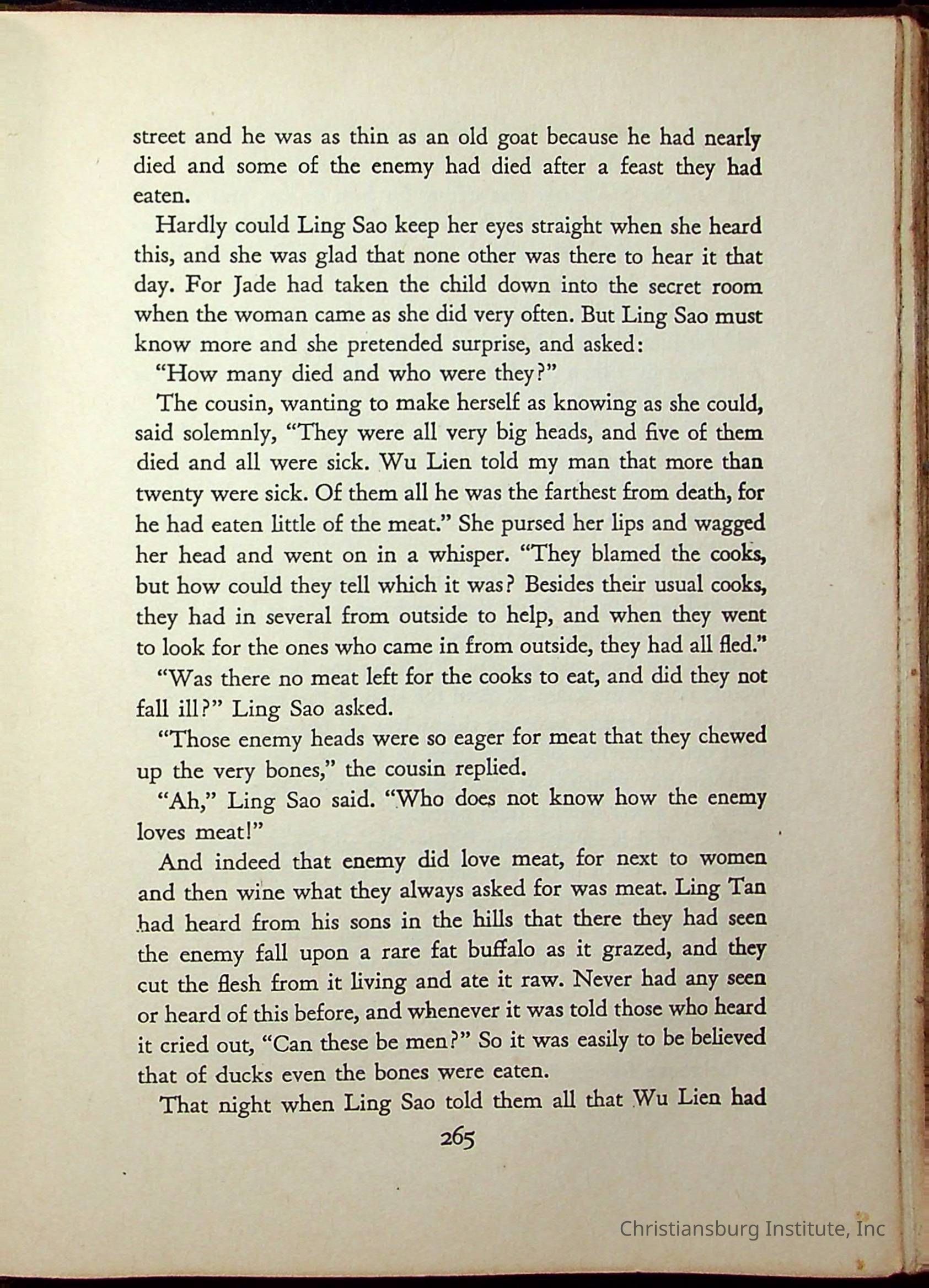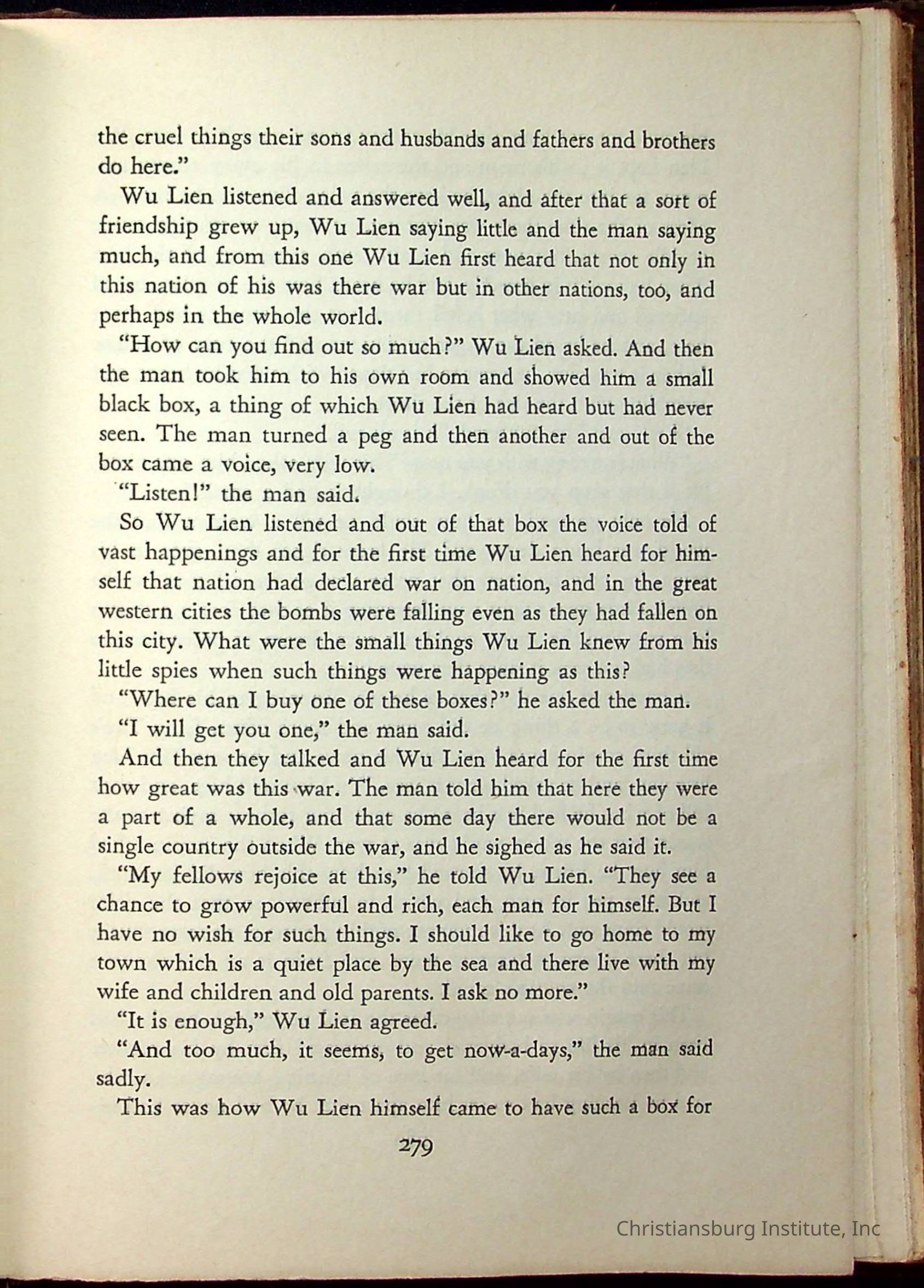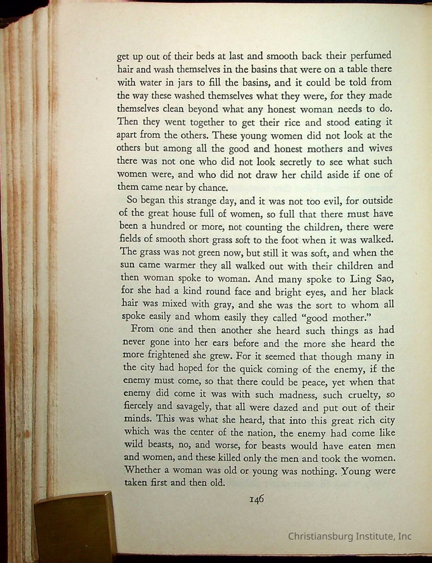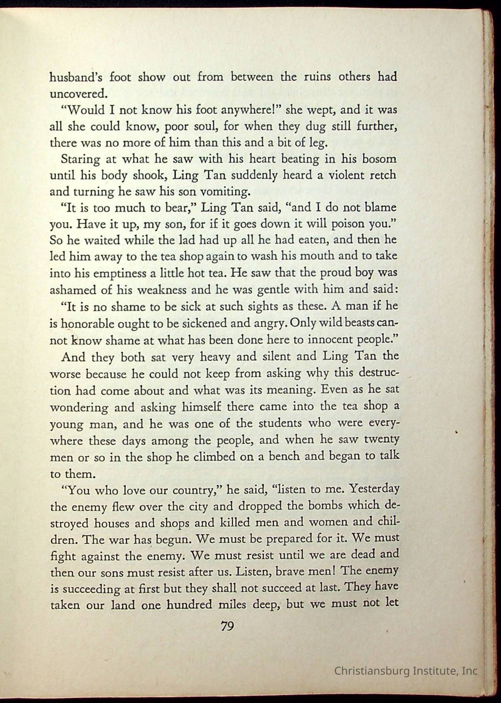 Dragon Seed, written by Pearl S. Buck and published in the year 1942. This book was used by Christiansburg Institute teacher, Viola Charlton in her class.Collection