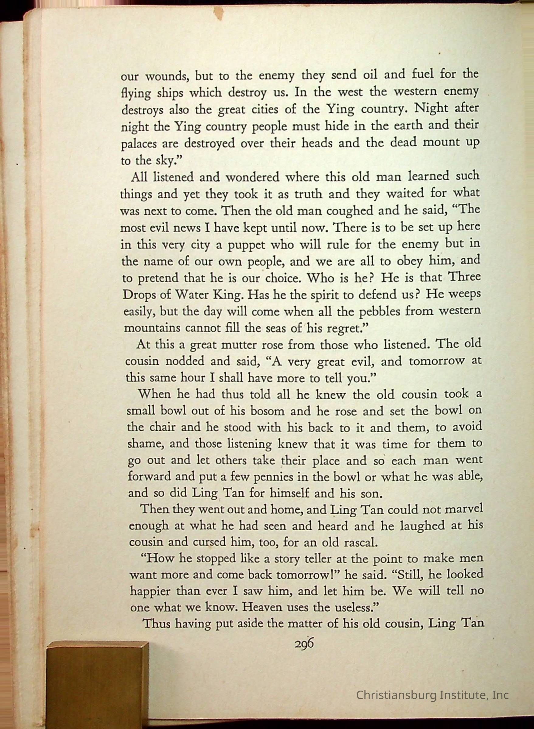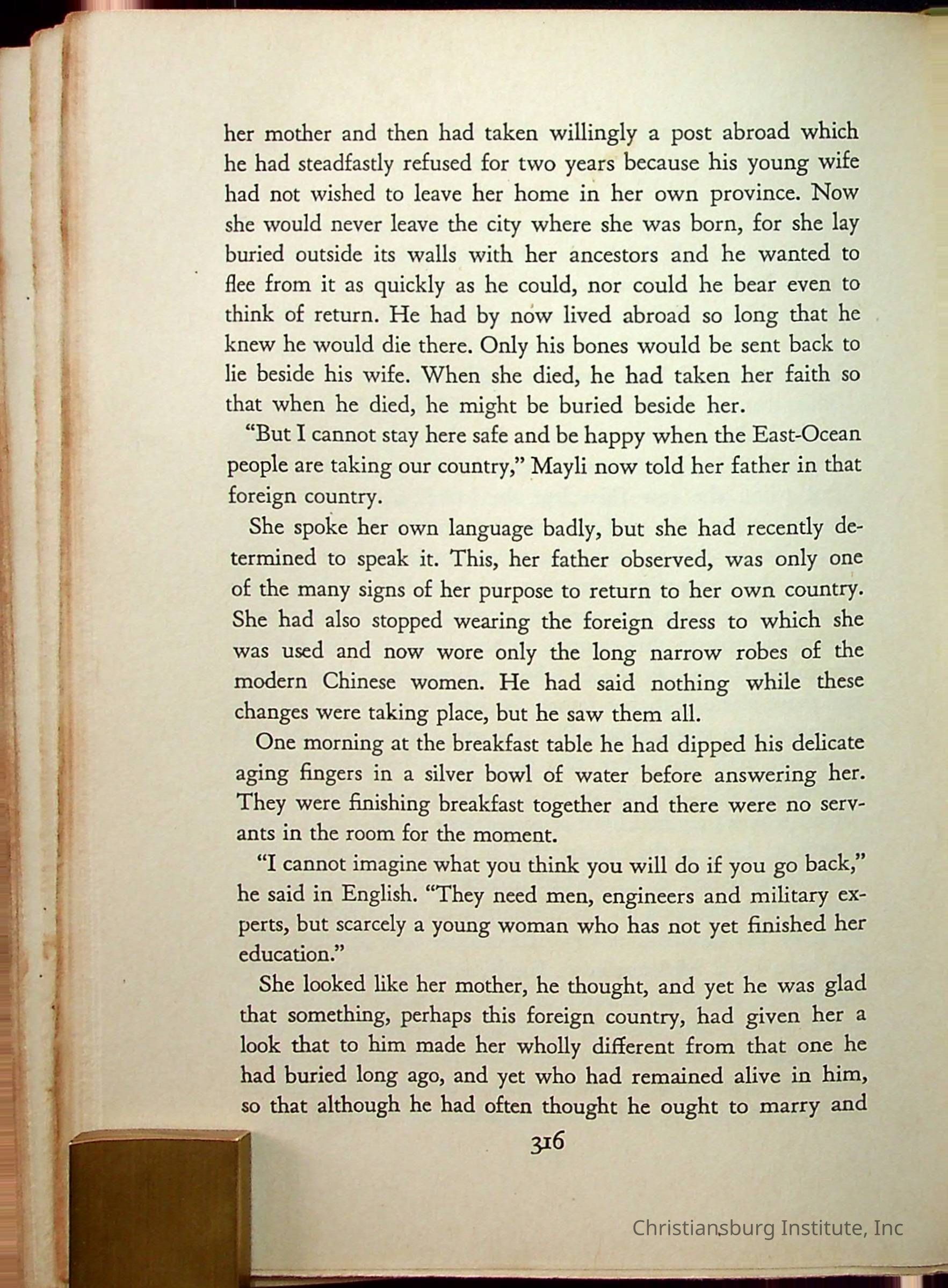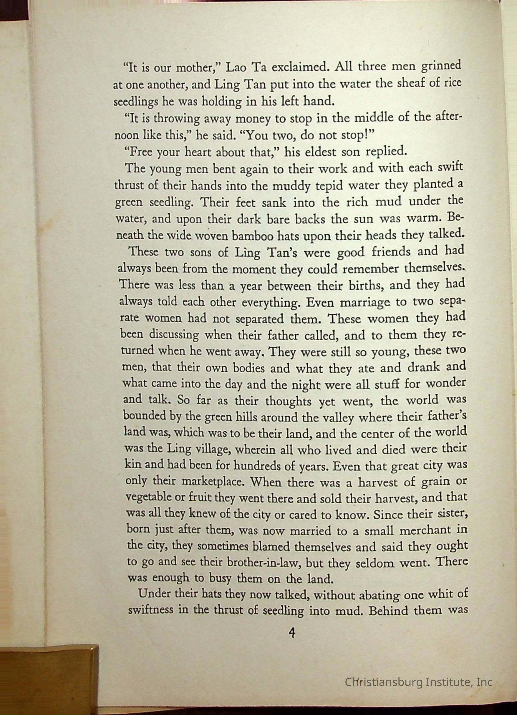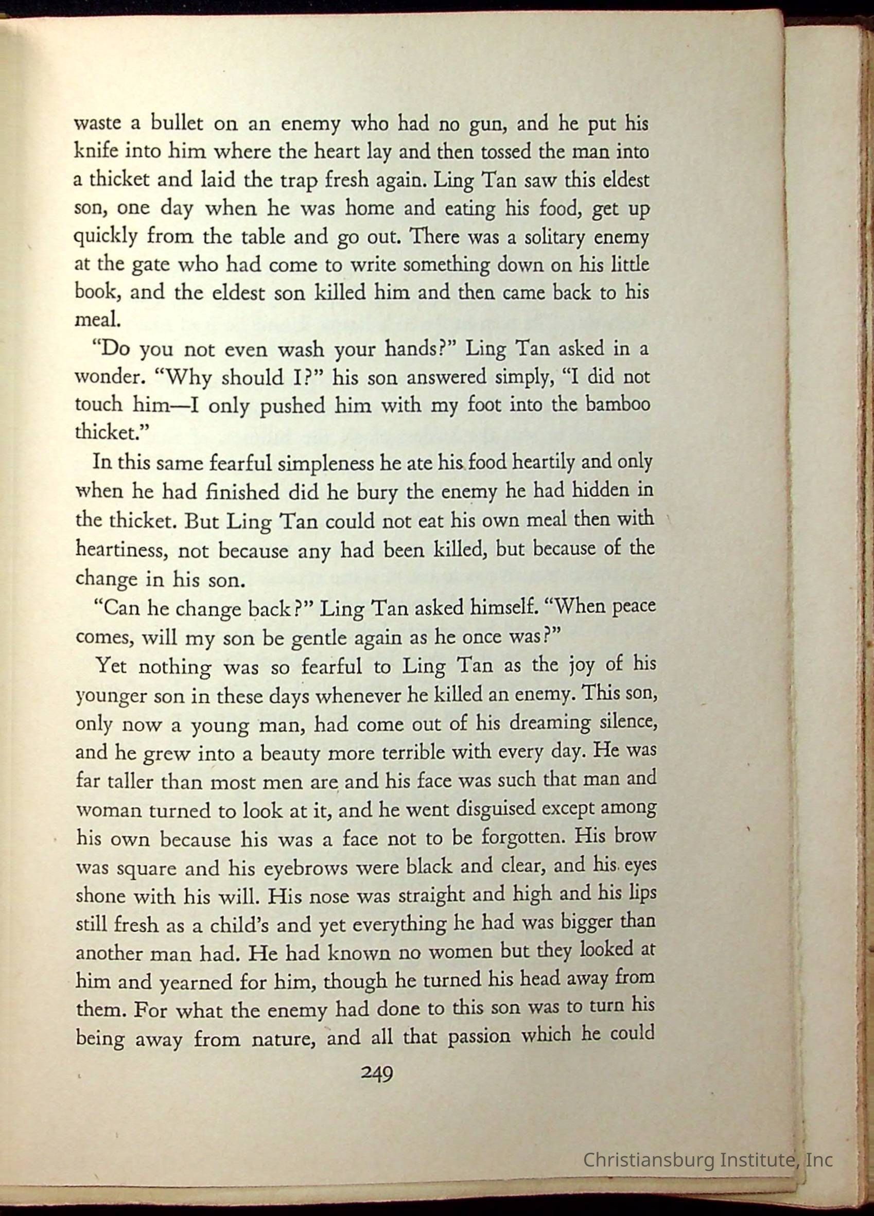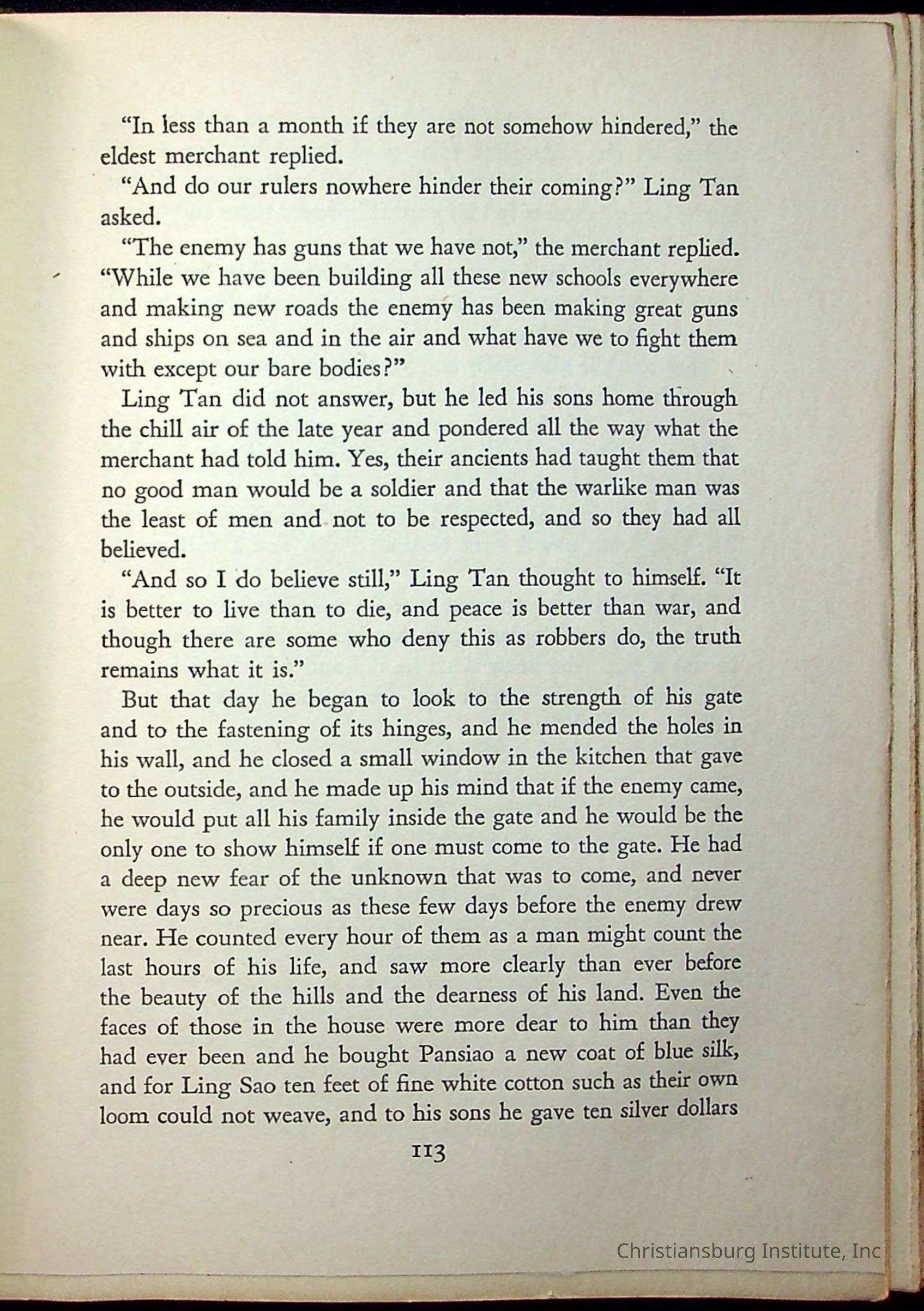 Dragon Seed, written by Pearl S. Buck and published in the year 1942. This book was used by Christiansburg Institute teacher, Viola Charlton in her class.Collection