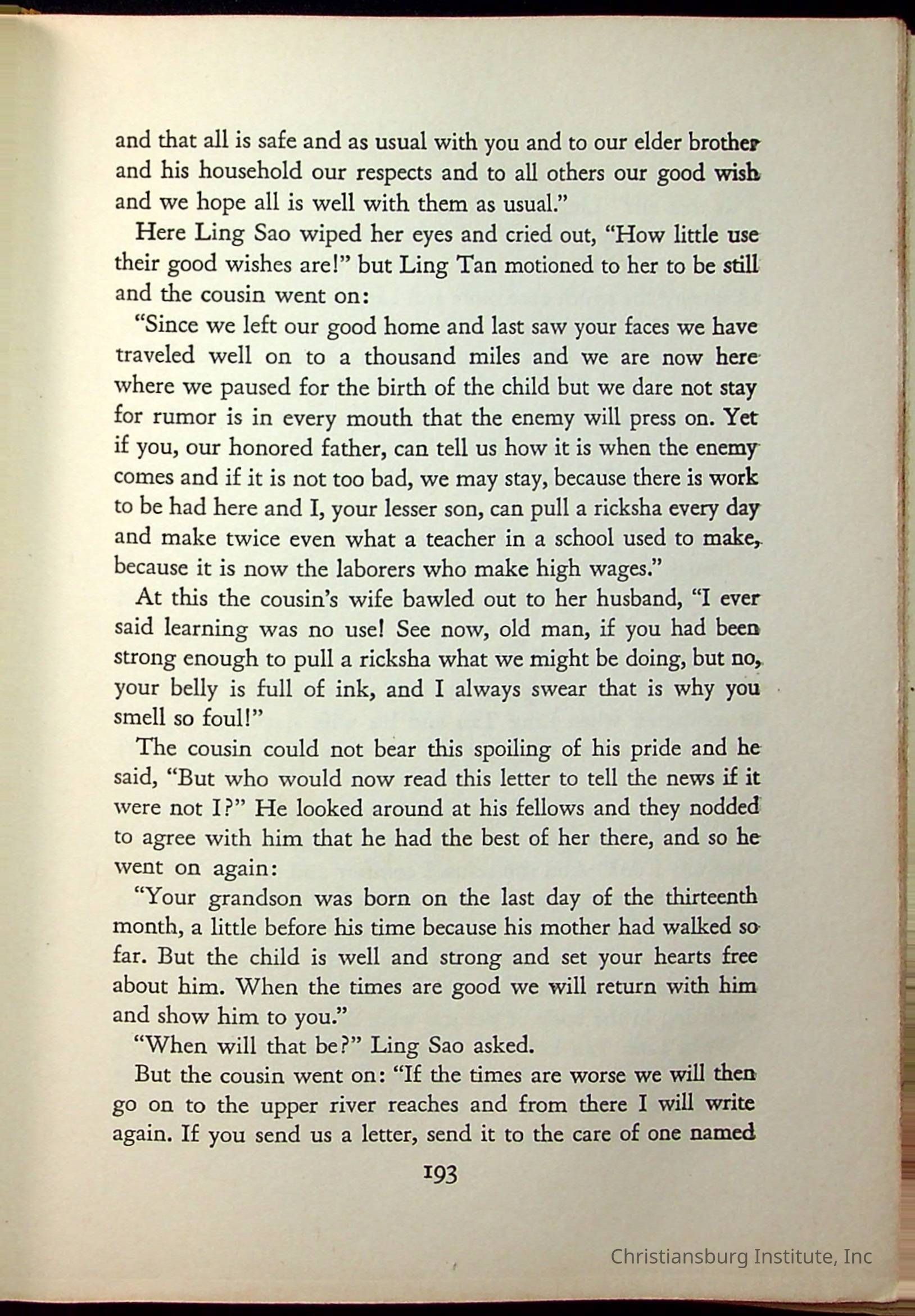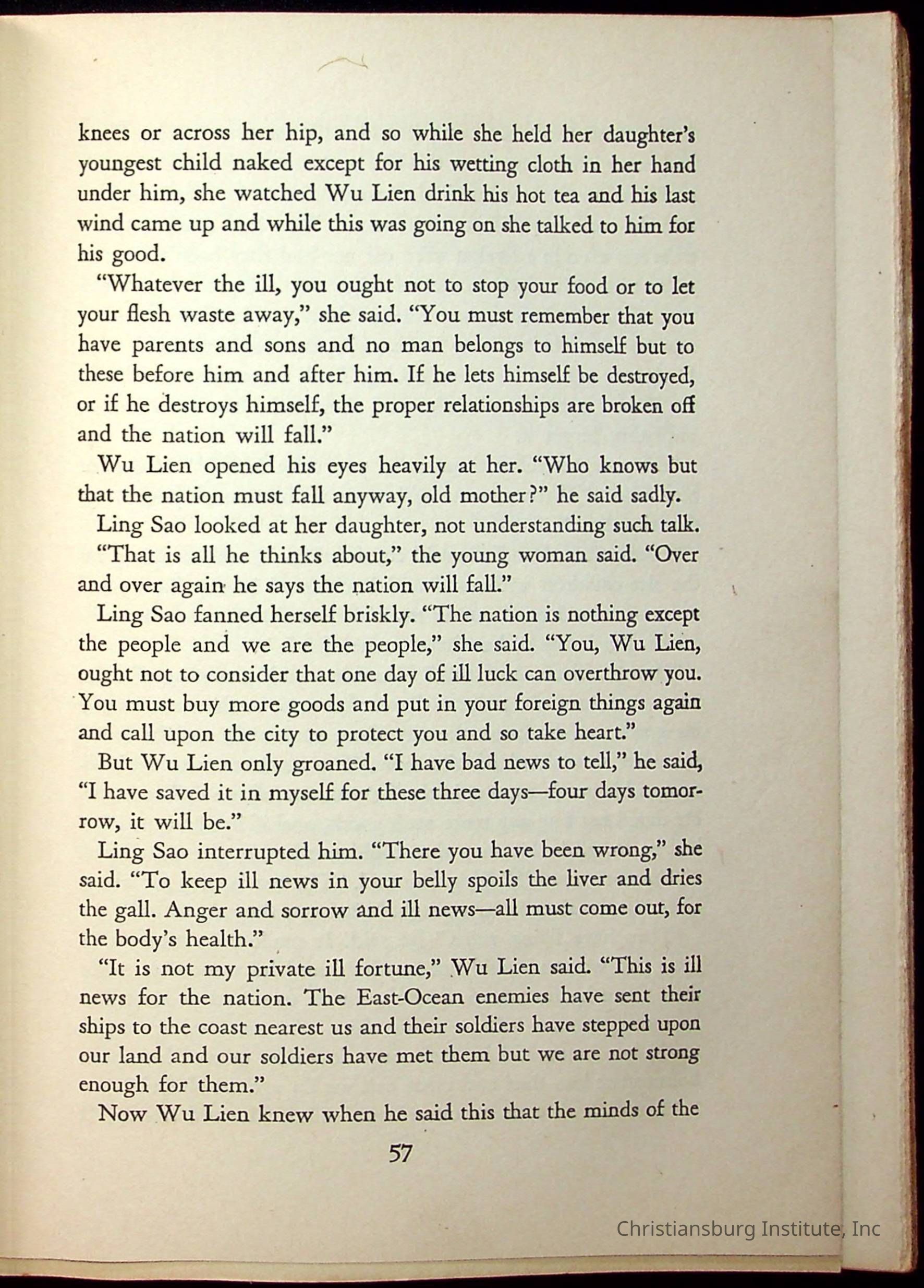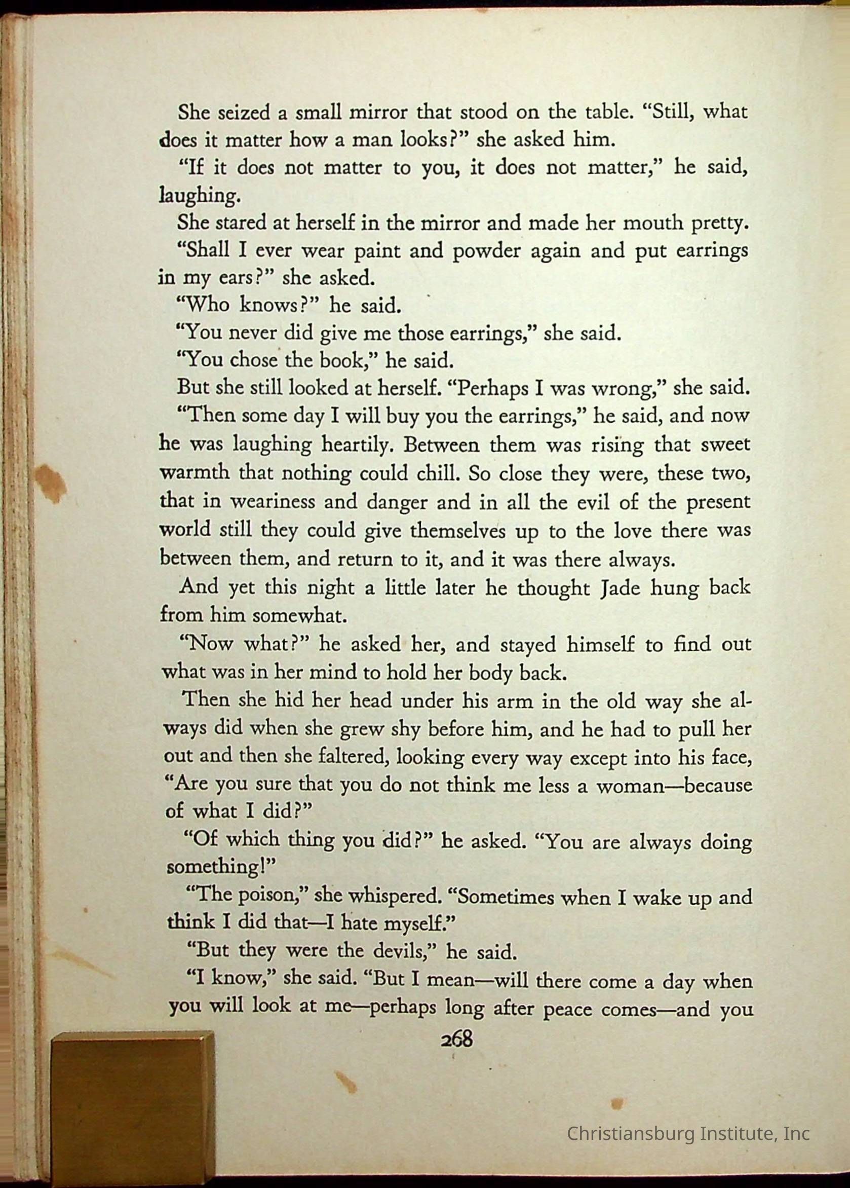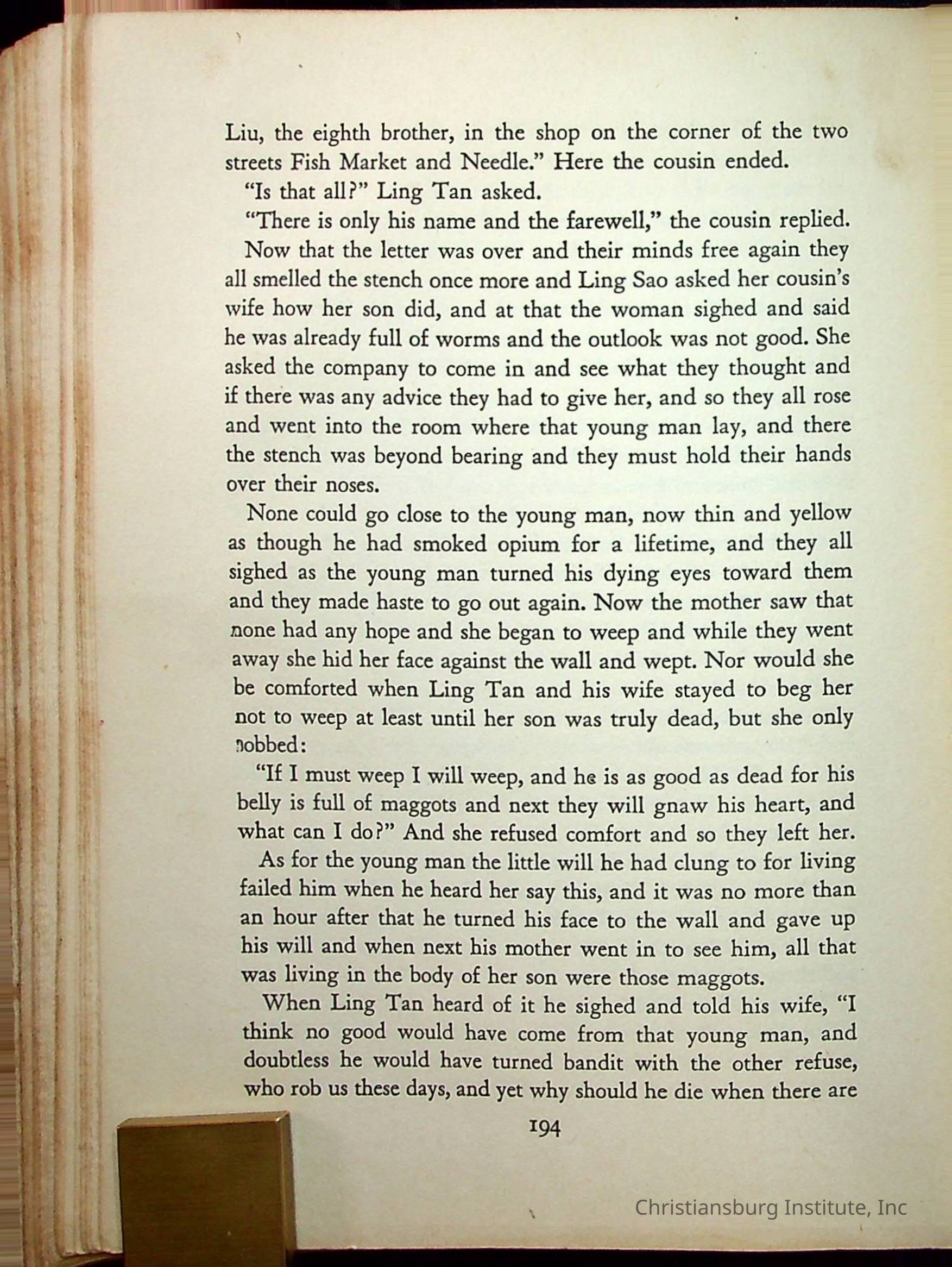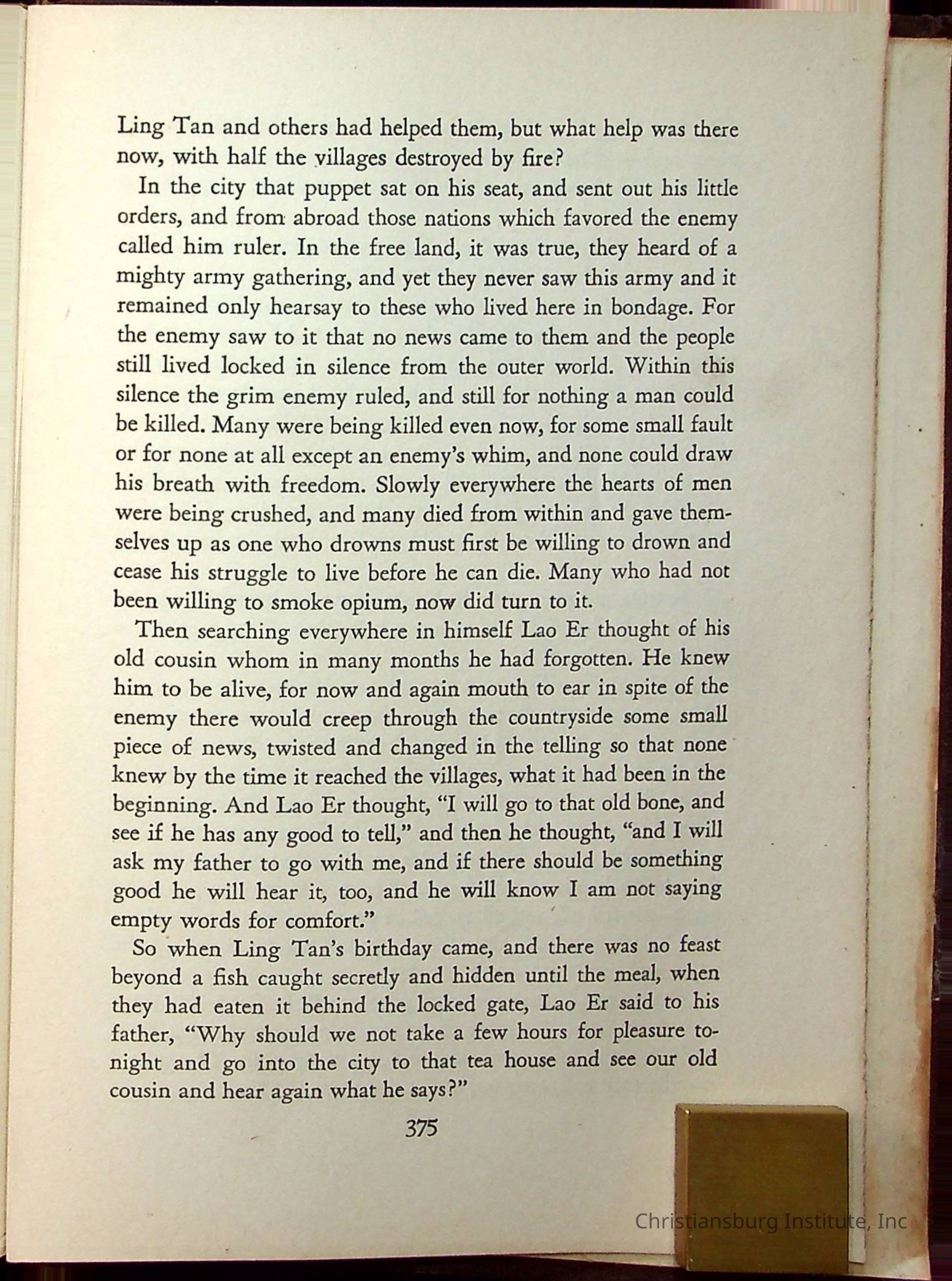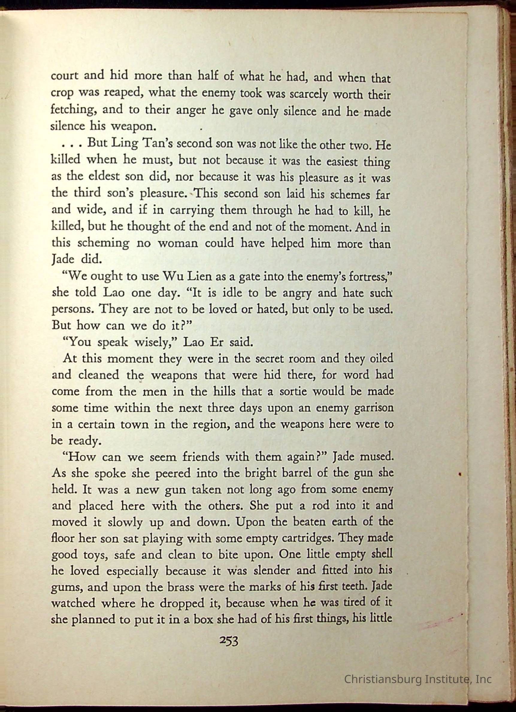 Dragon Seed, written by Pearl S. Buck and published in the year 1942. This book was used by Christiansburg Institute teacher, Viola Charlton in her class.Collection