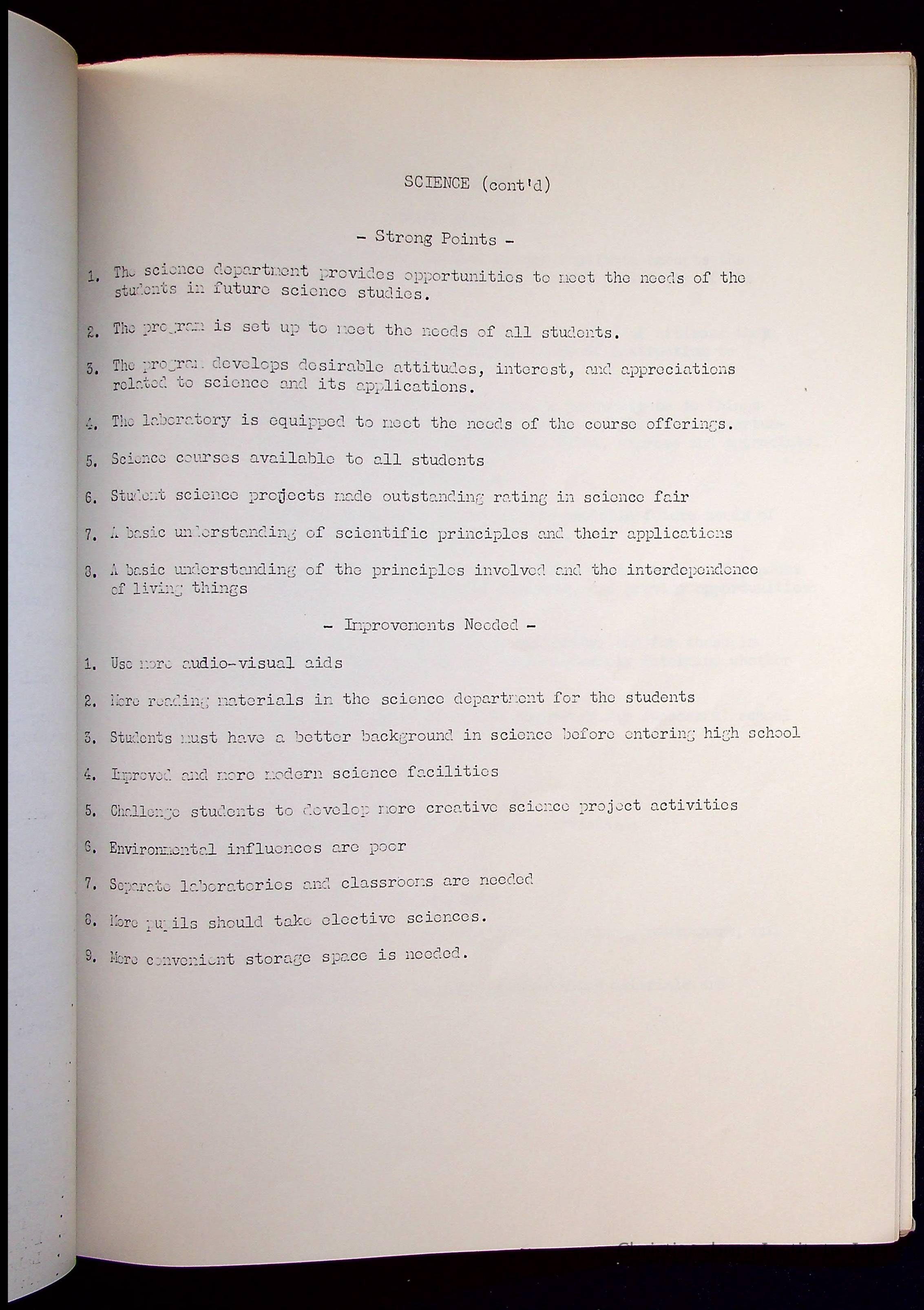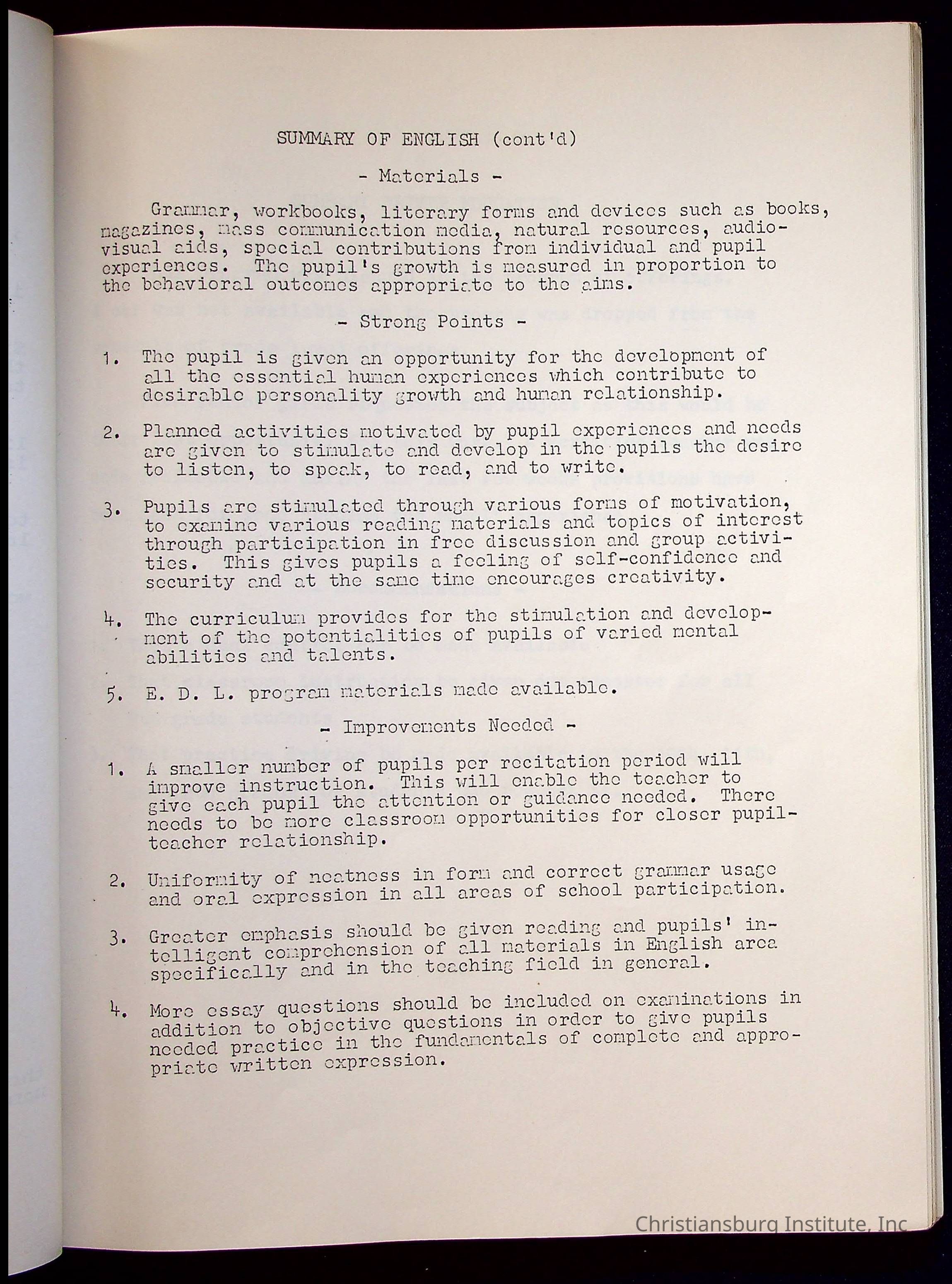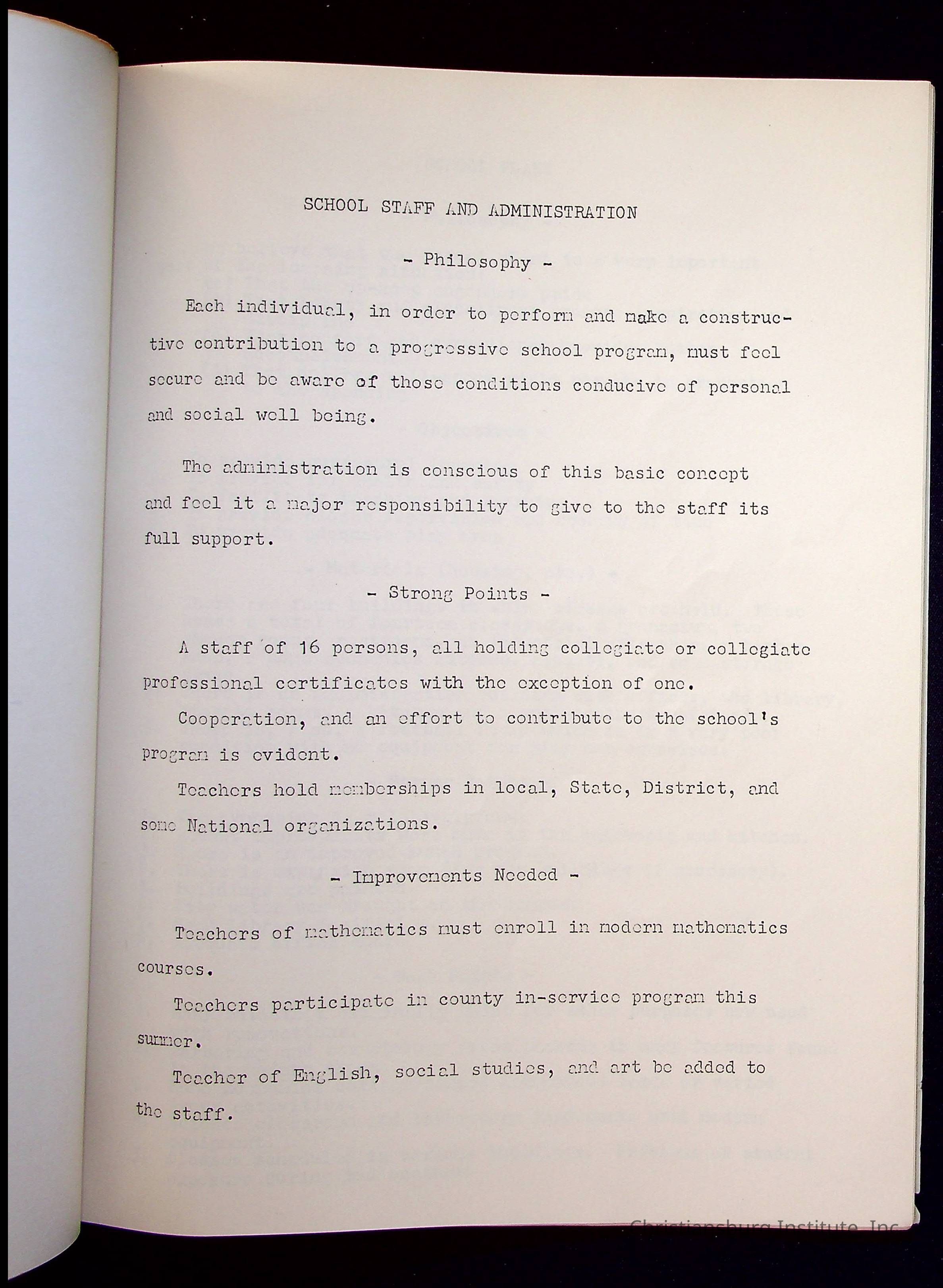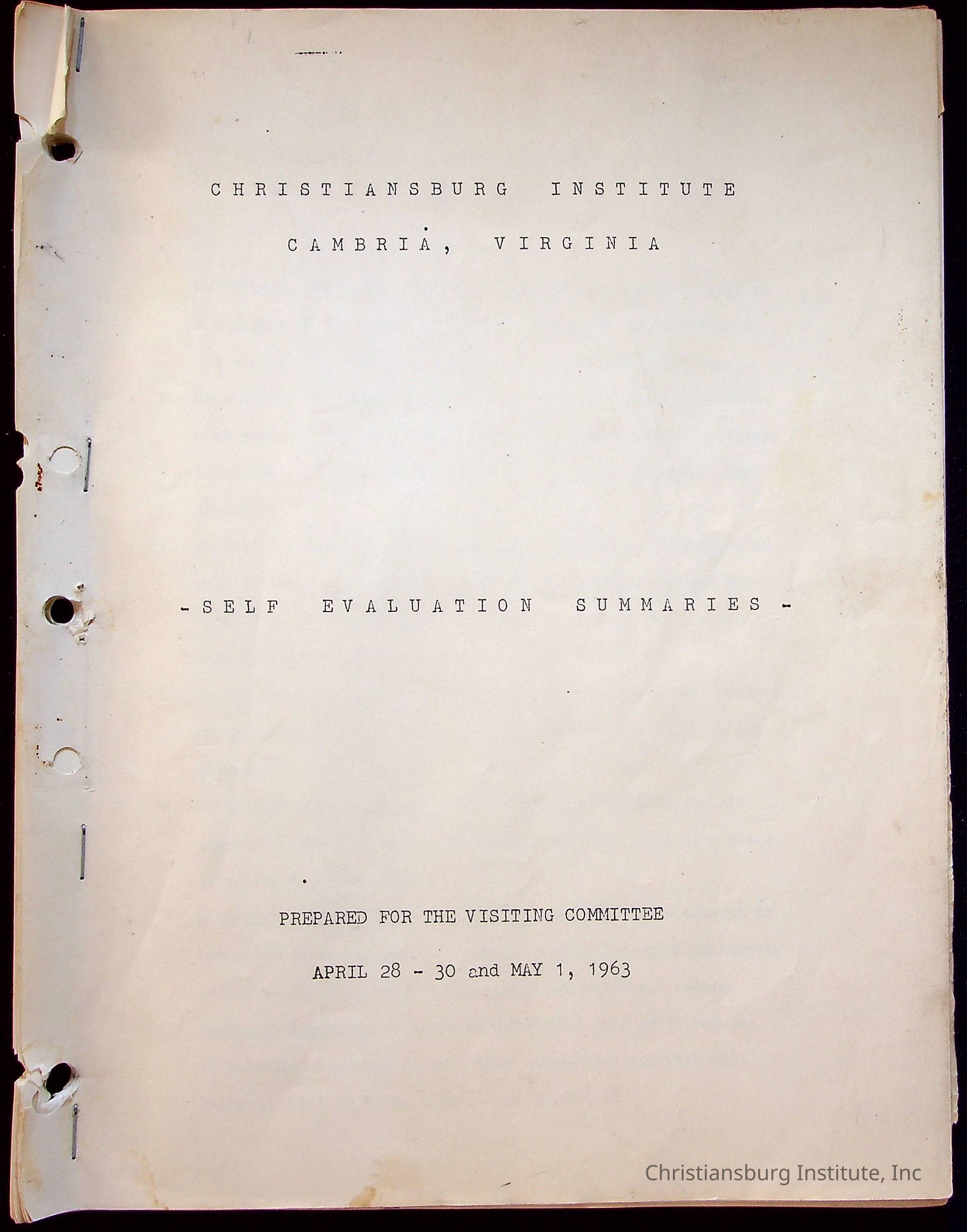 Christiansburg Institute Self Evaluation Summaries, this document was prepared for the Visiting Committee, dated April 28-30 and May 1, 1963.Creator