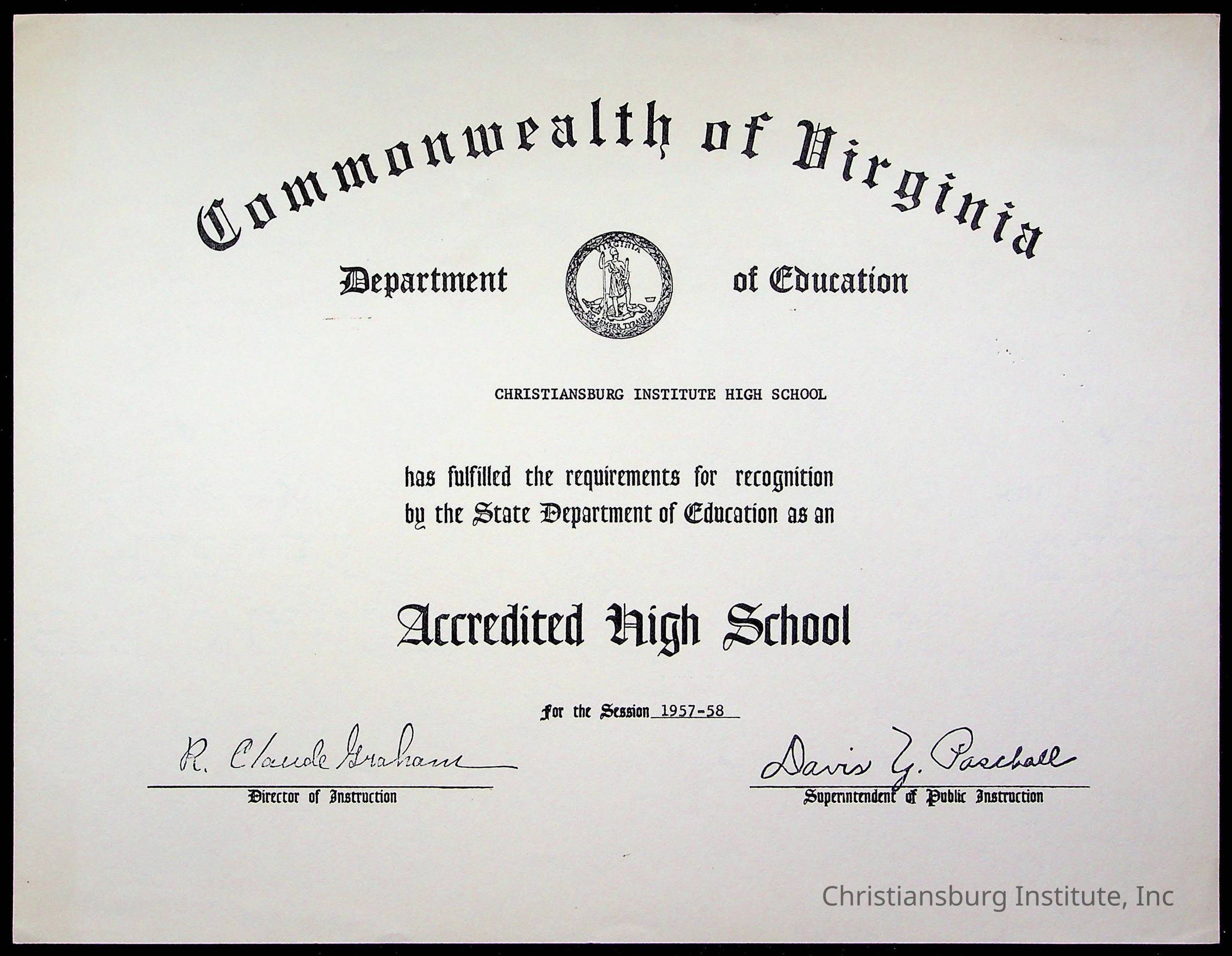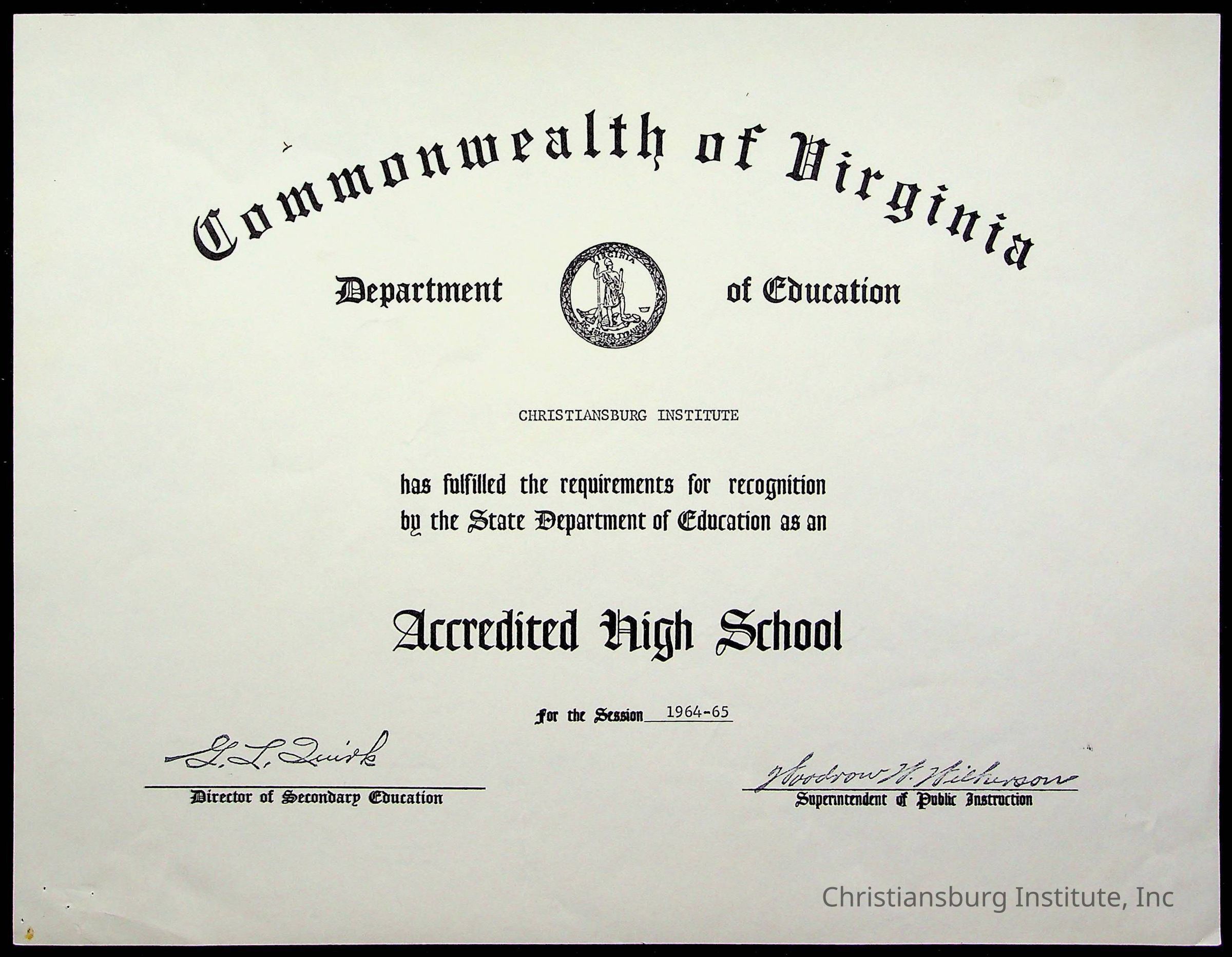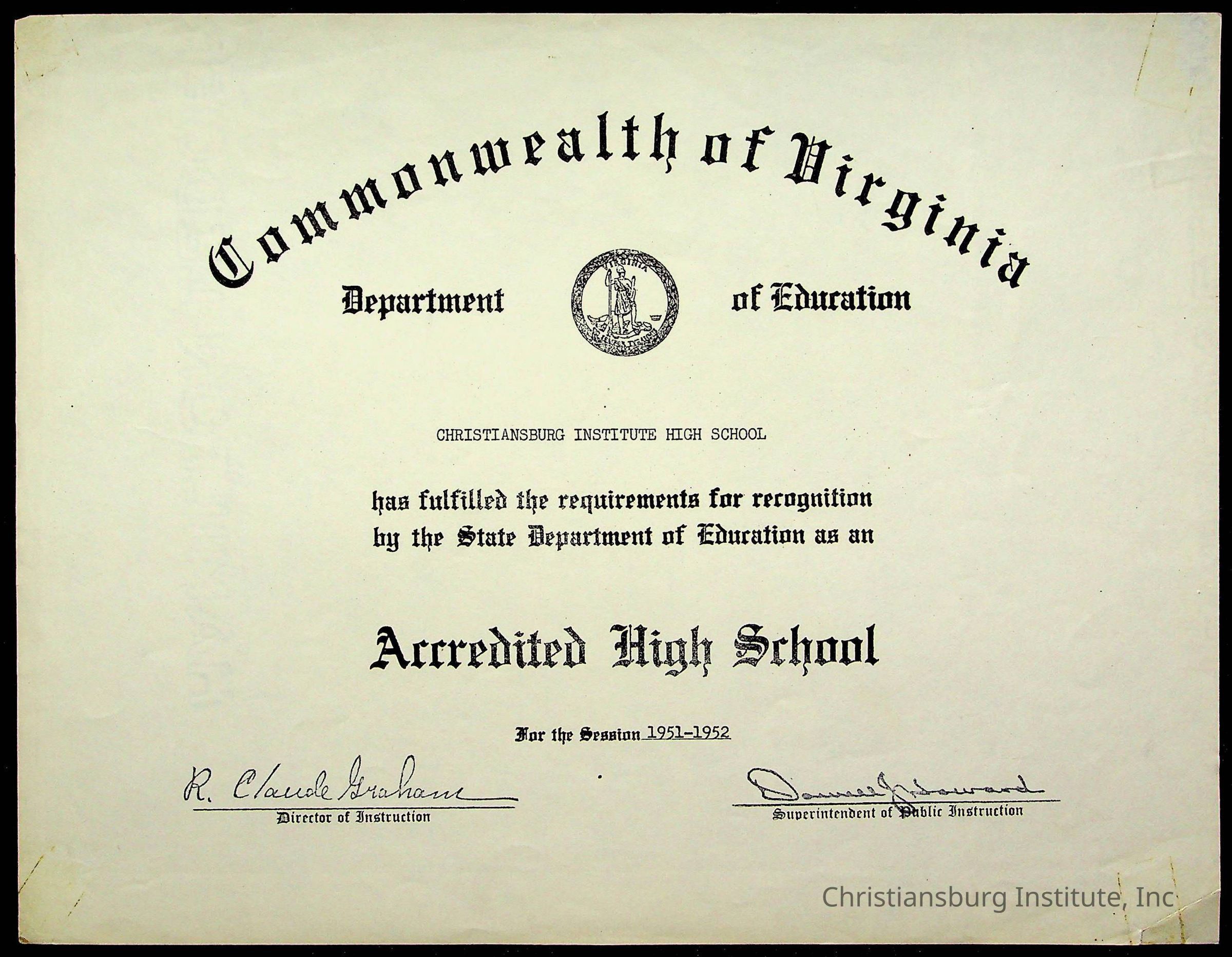 An archive of certificates issued to Christiansburg Institute including from the Commonwealth of Virginia, Boys Town, and the Virginia Interscholastic Association, date range 1951-1965.Collection