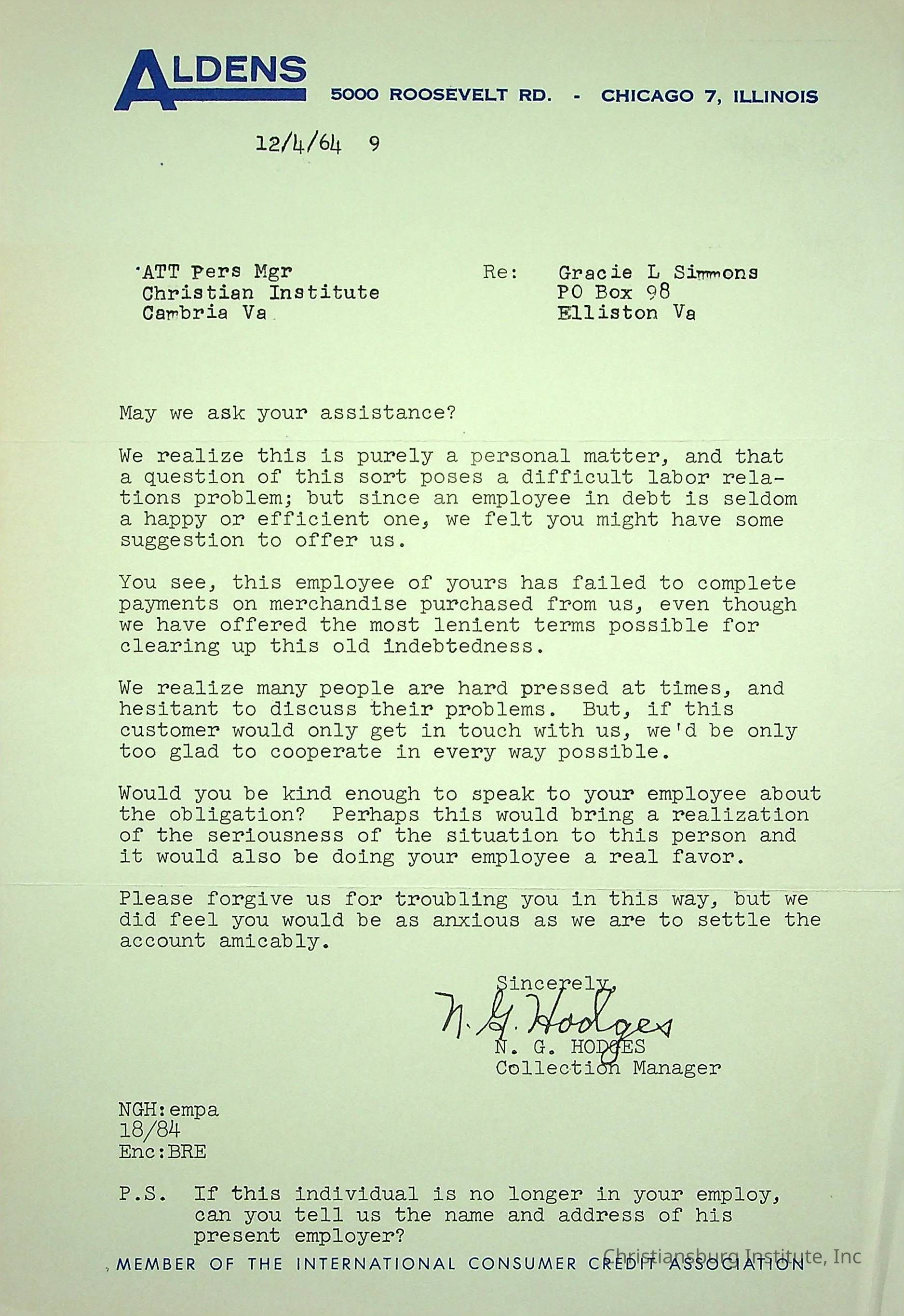 A letter from the collections manager of Aldens, N. G. Hodges to Gracie L. Simmons in regards to a debt to be paid dated December 4th, 1964.Creator