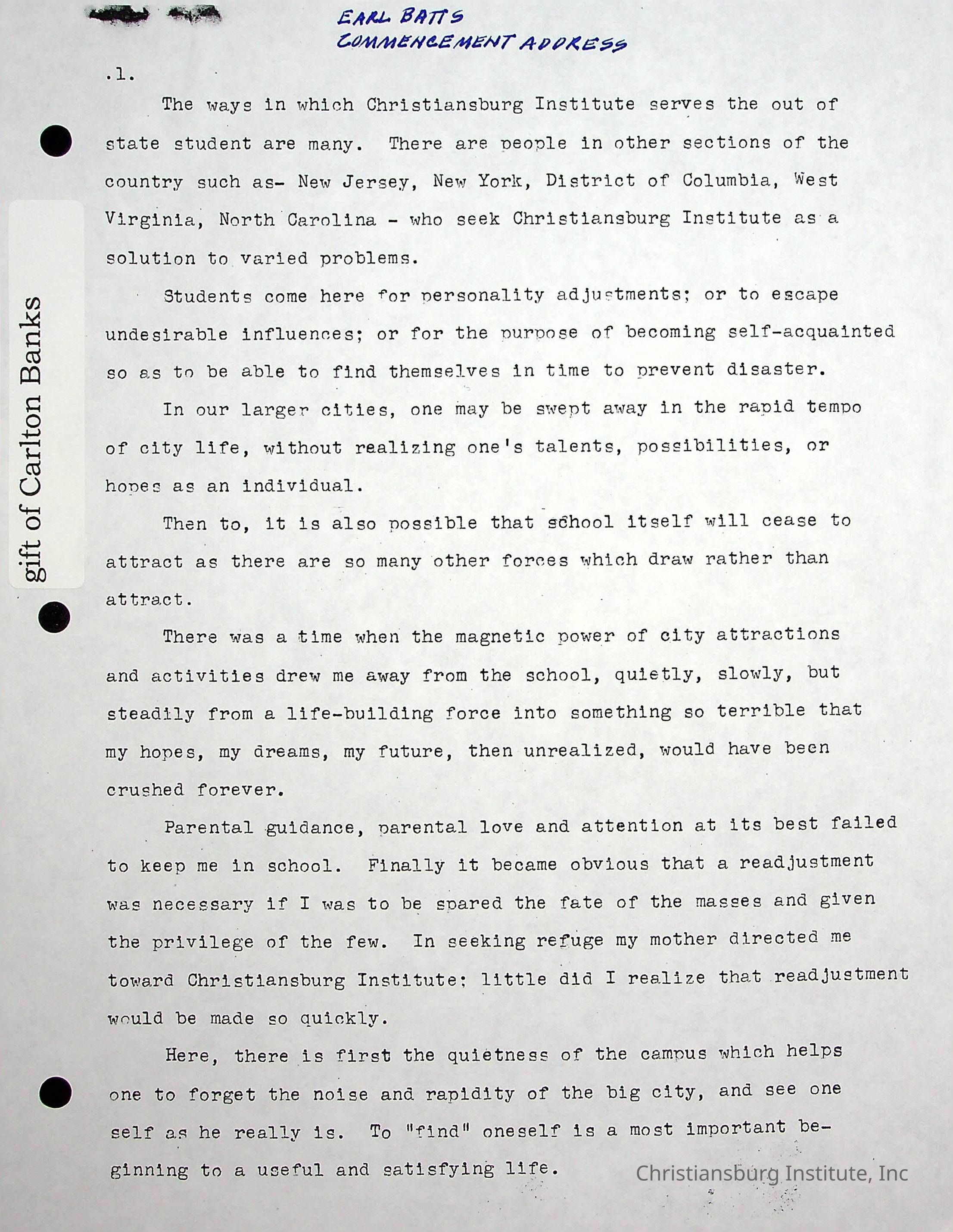 A copy of the commencement speech given by Earl Batts of New Jersey at the 1950 commencement exercises. Gifted by Carlton Banks in 2001.Creator