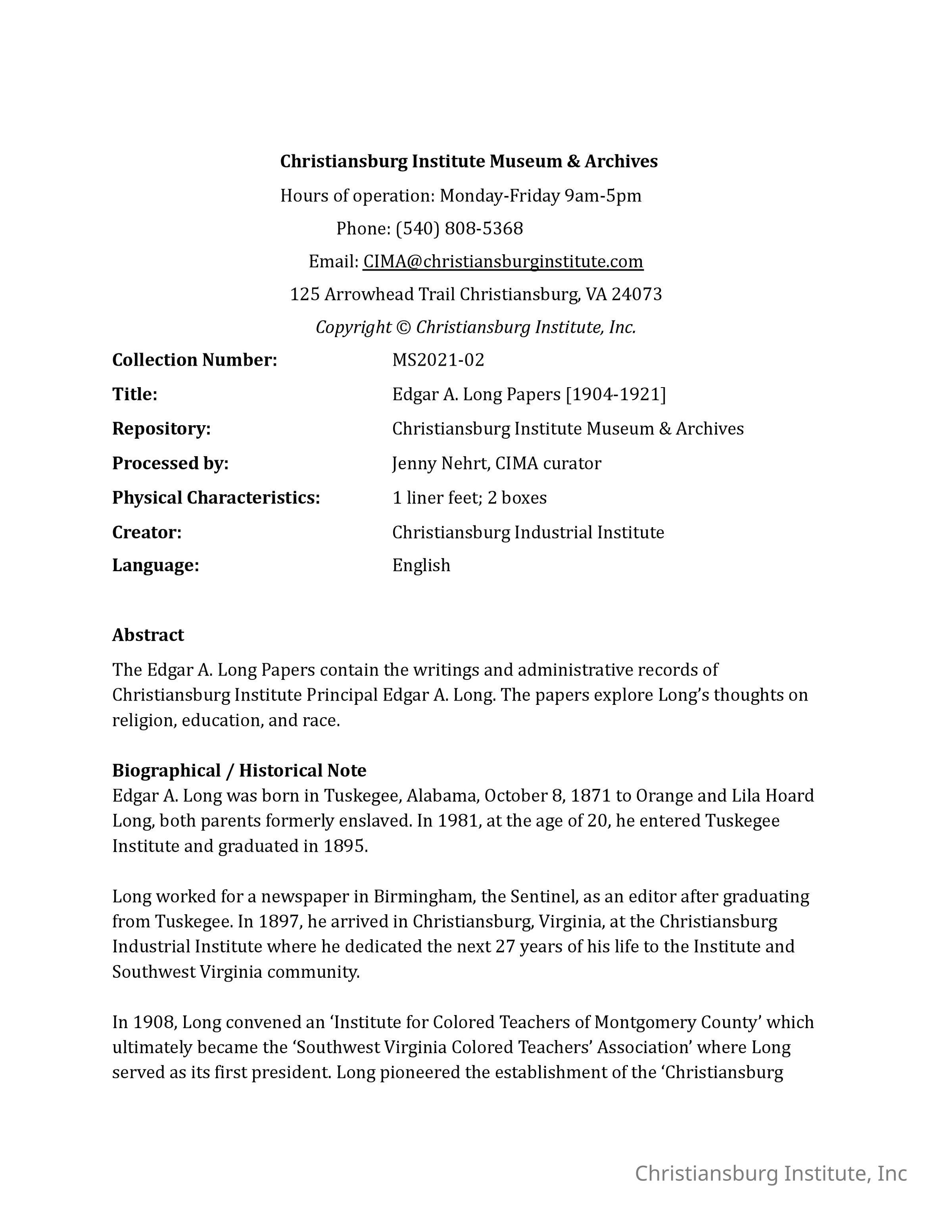 Edgar A. Long Papers Collection Finding Aid