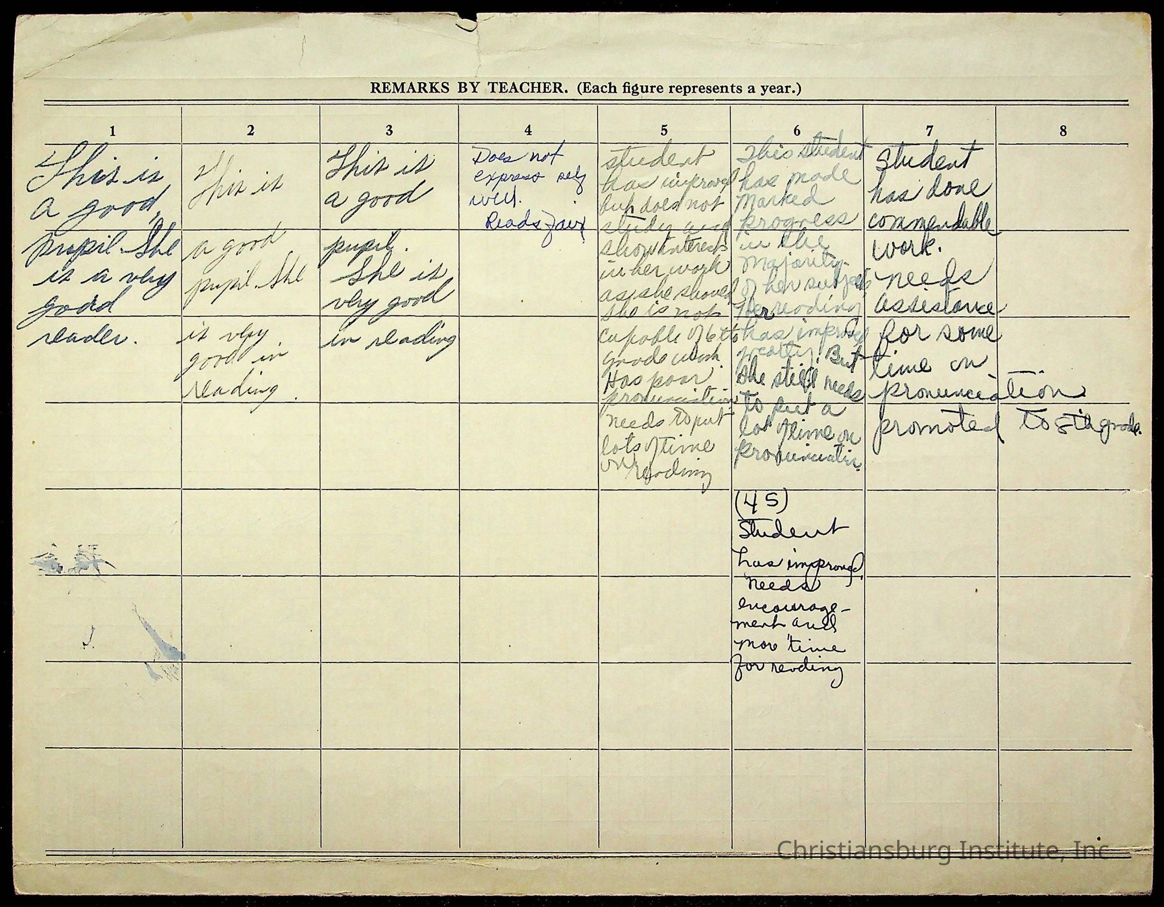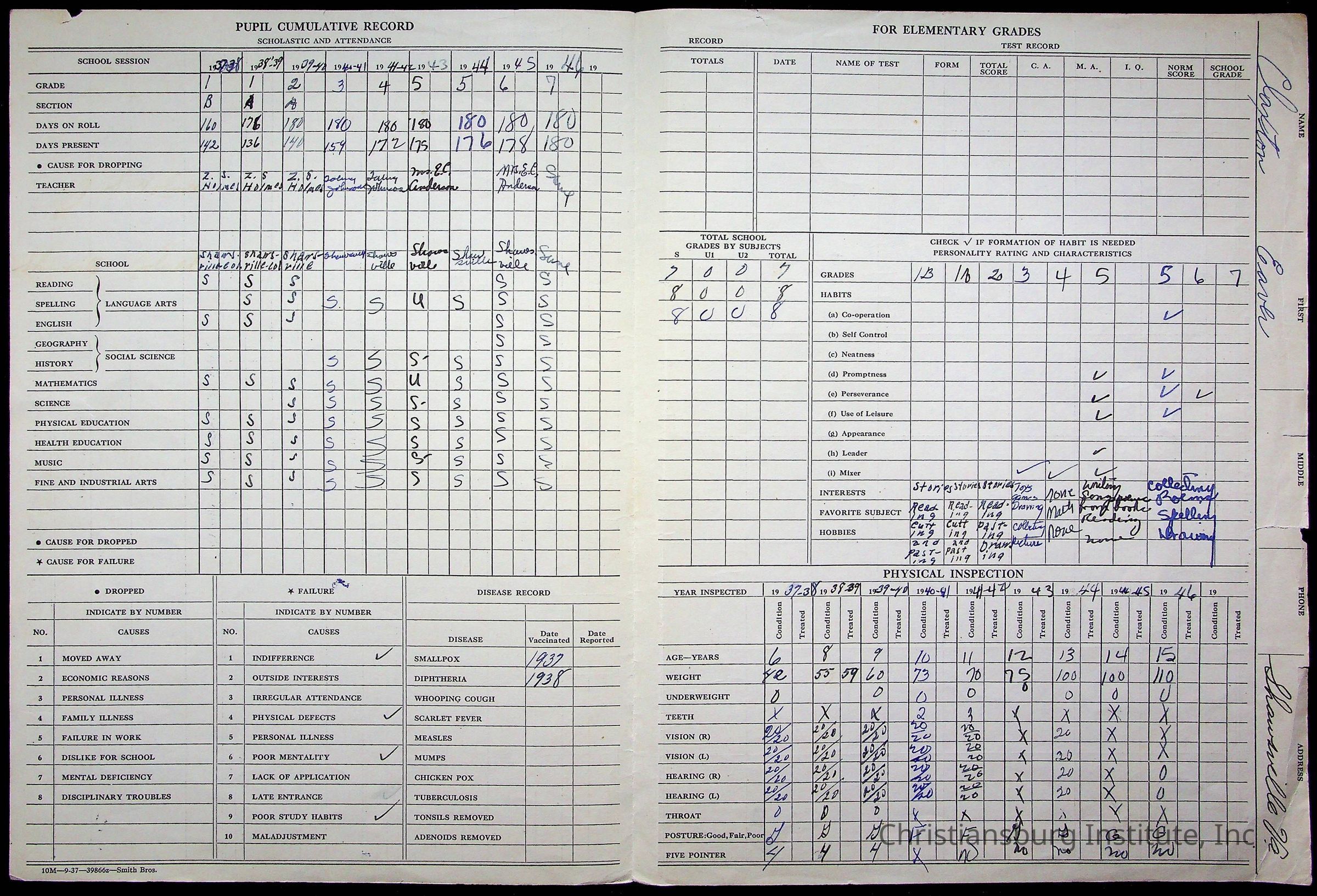 The student file for the Christiansburg Institute student, Evain Charlton circa 1930s-1940s.