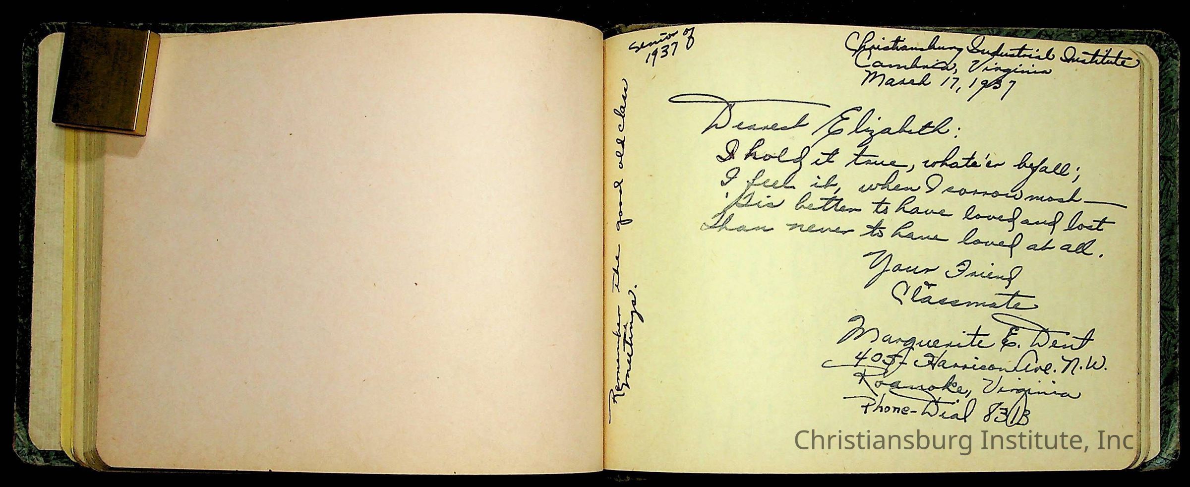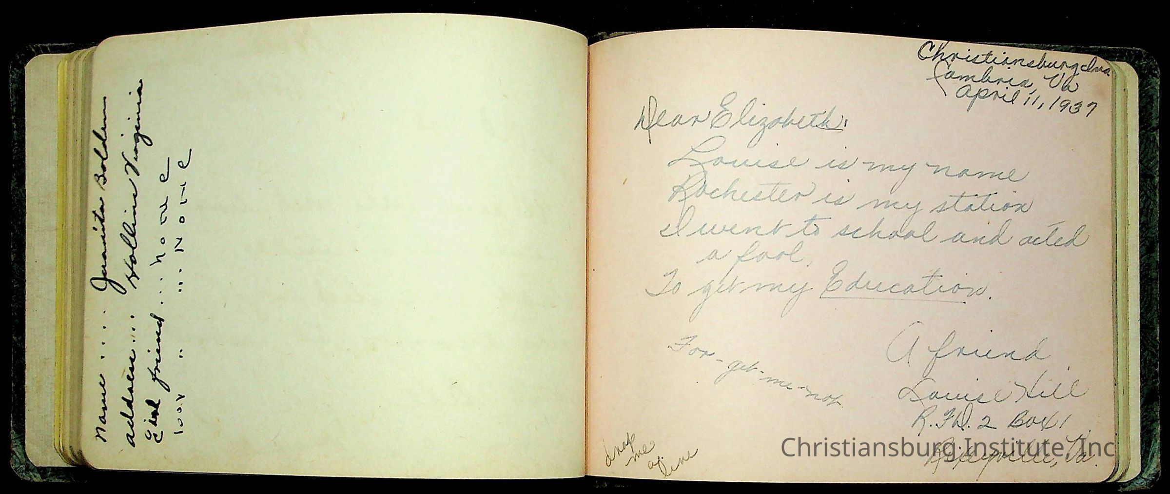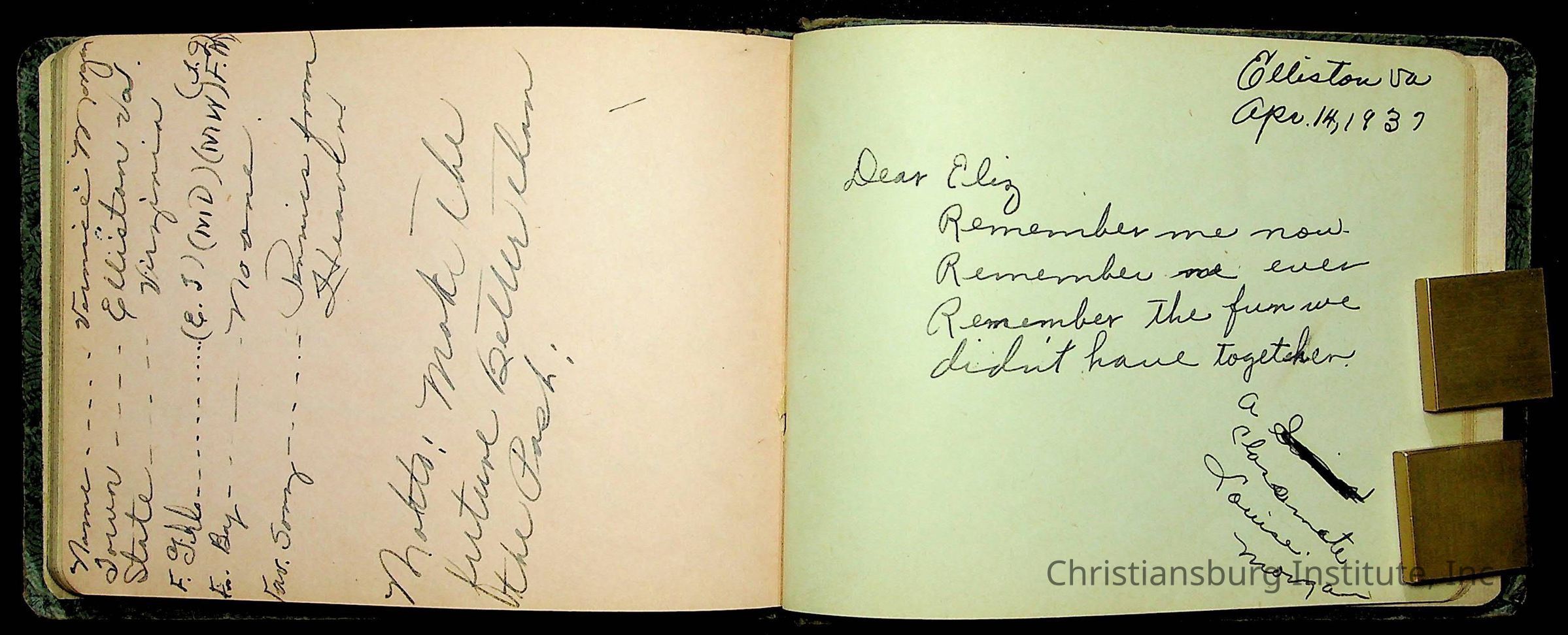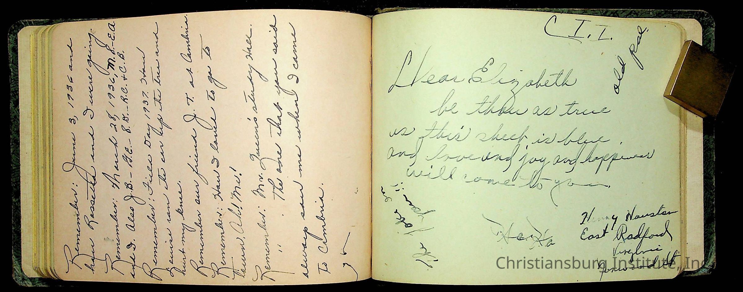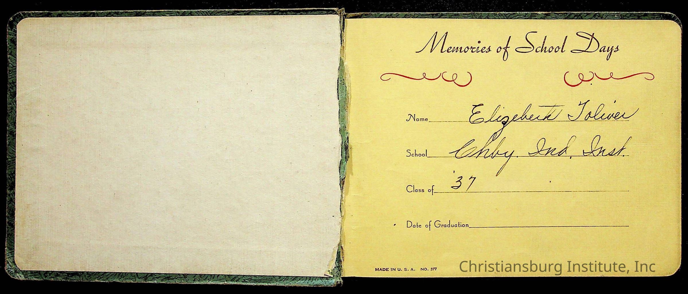 A Christiansburg Industrial Institute autograph book for Elizabeth Toliver, class of 1937.