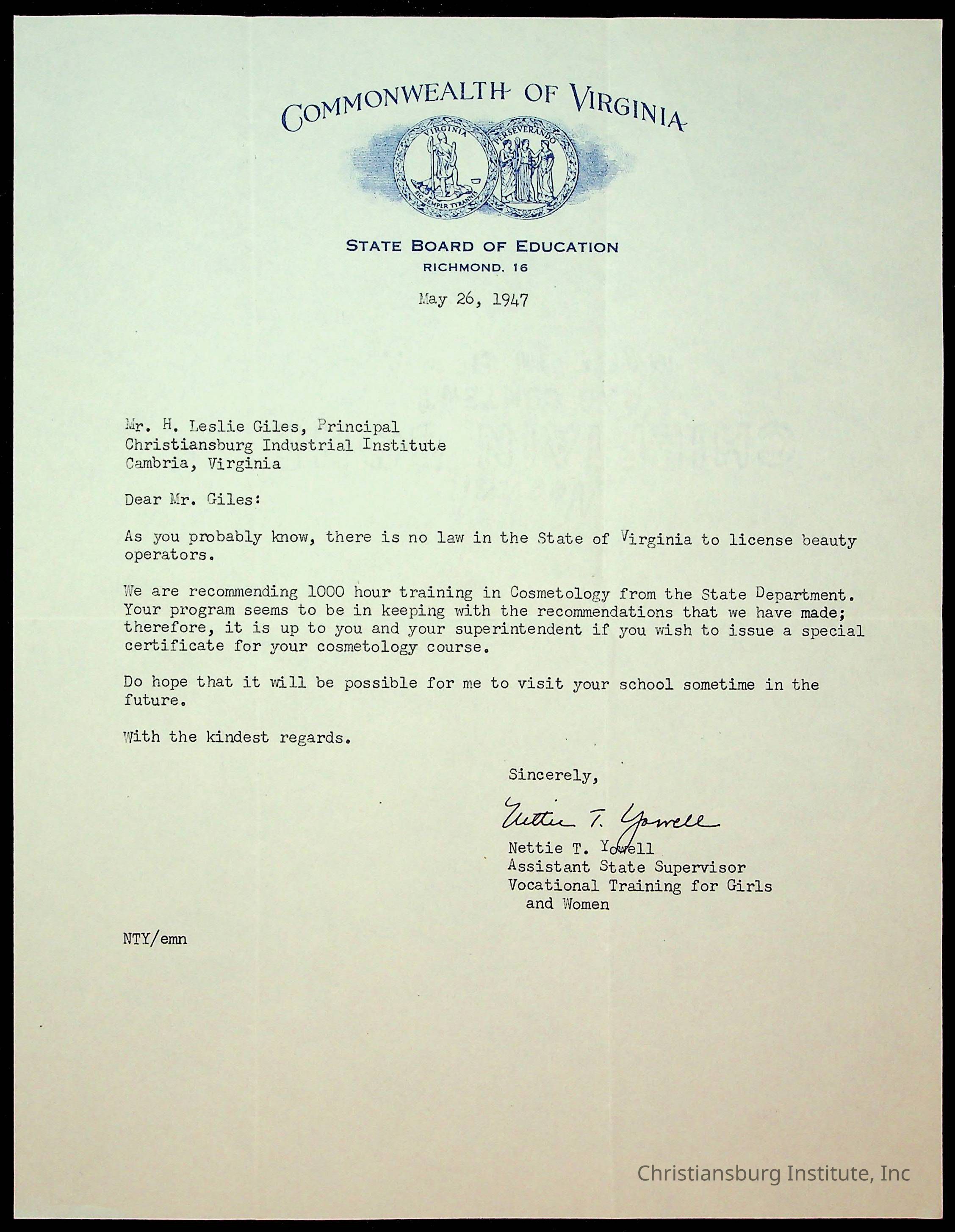 Copyright has been assigned to Christiansburg Institute Museum & Archives by Montgomery County Public Schools. For permission to publish materials created by the donor, contact CIMA@christiansburginstitute.com. Materials not created by Christiansburg Industrial Institute may still be under copyright.