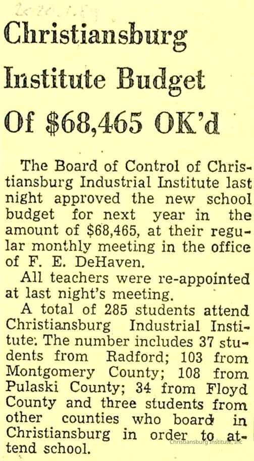 A newspaper clipping featuring a story about Christiansburg Institute's budget titled "CI Budget of $68,465 OK'd", undated. Gifted by Carlton Banks in 2001.Creator