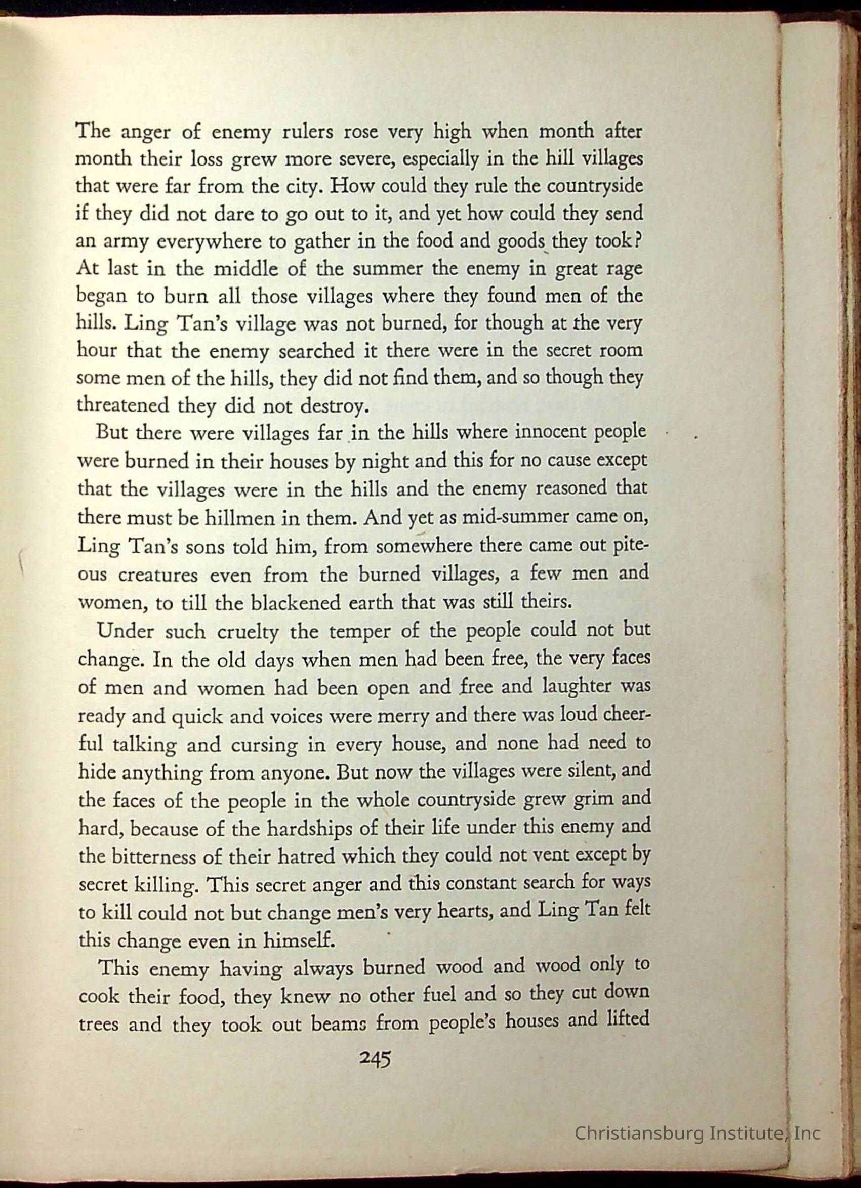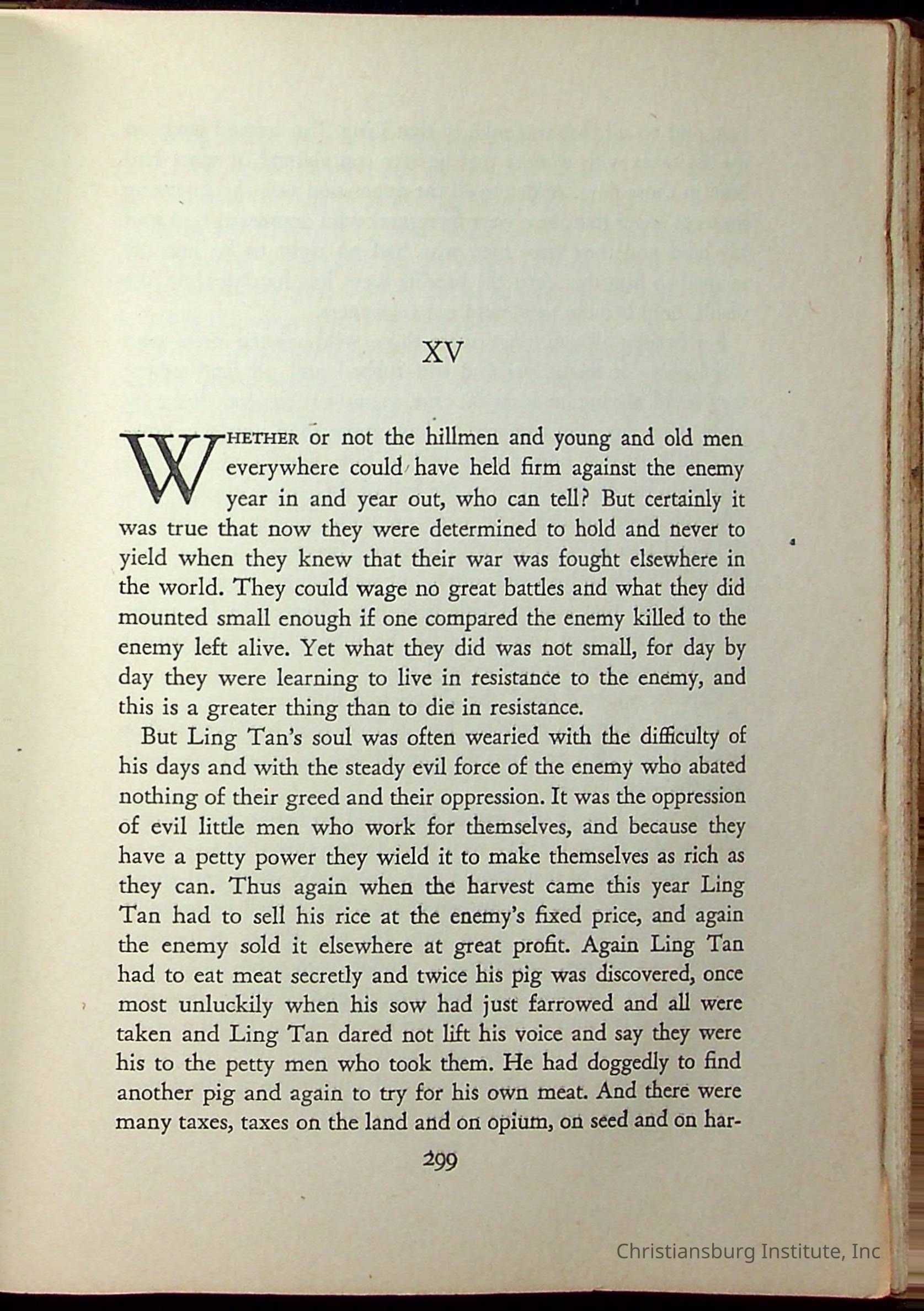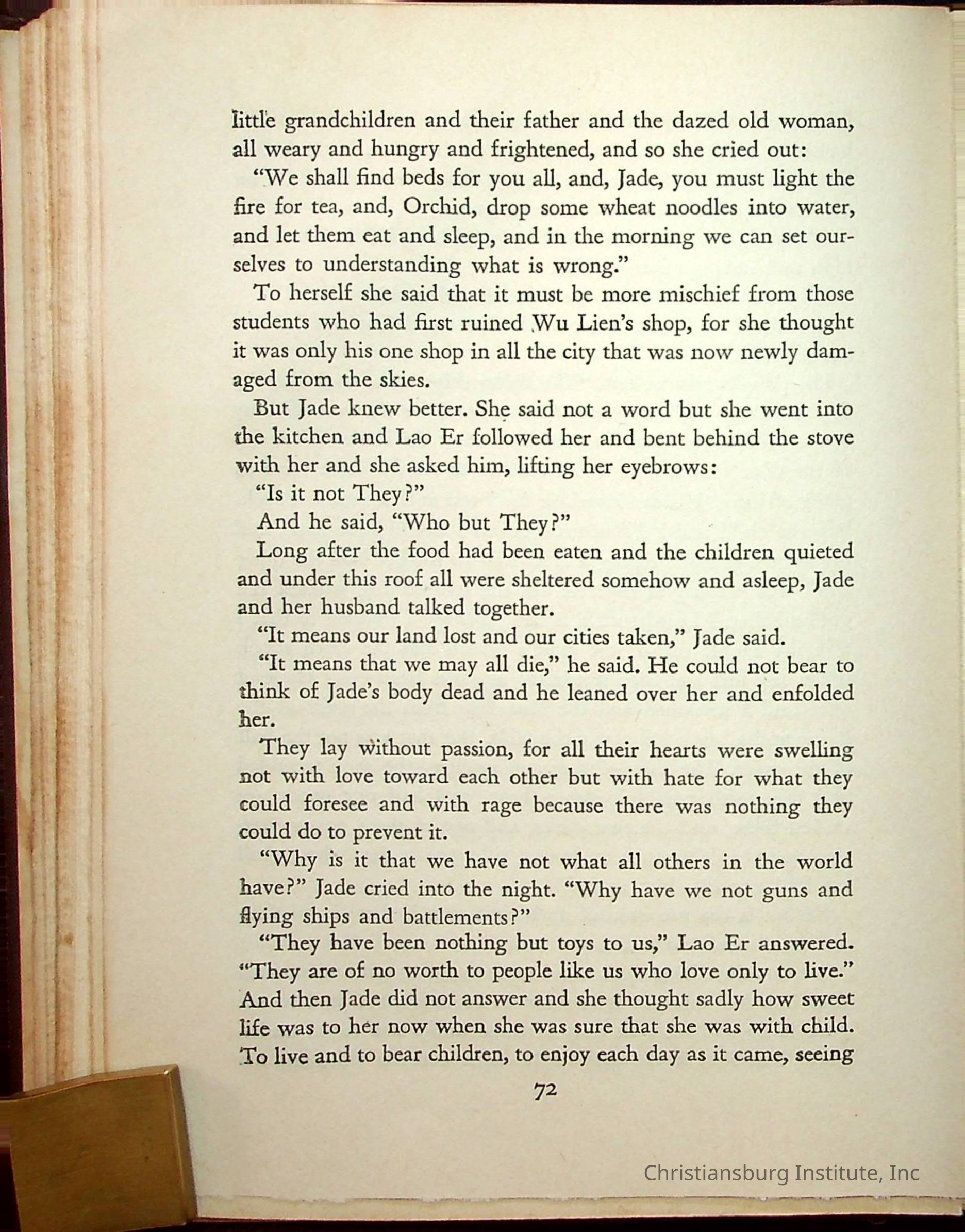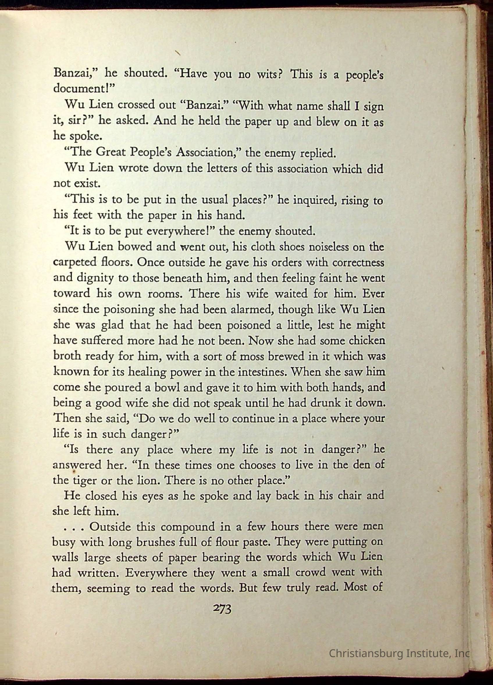Dragon Seed, written by Pearl S. Buck and published in the year 1942. This book was used by Christiansburg Institute teacher, Viola Charlton in her class.Collection