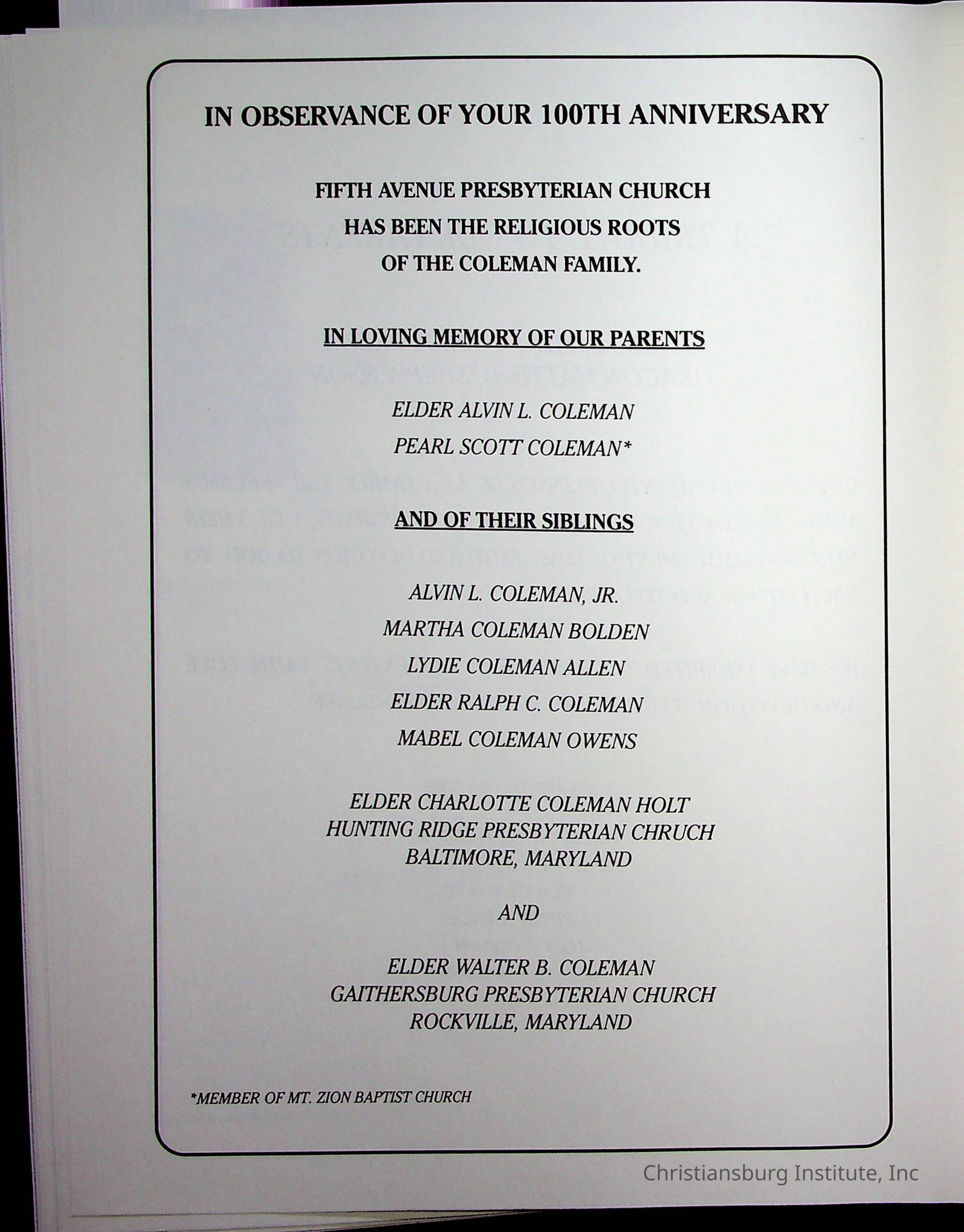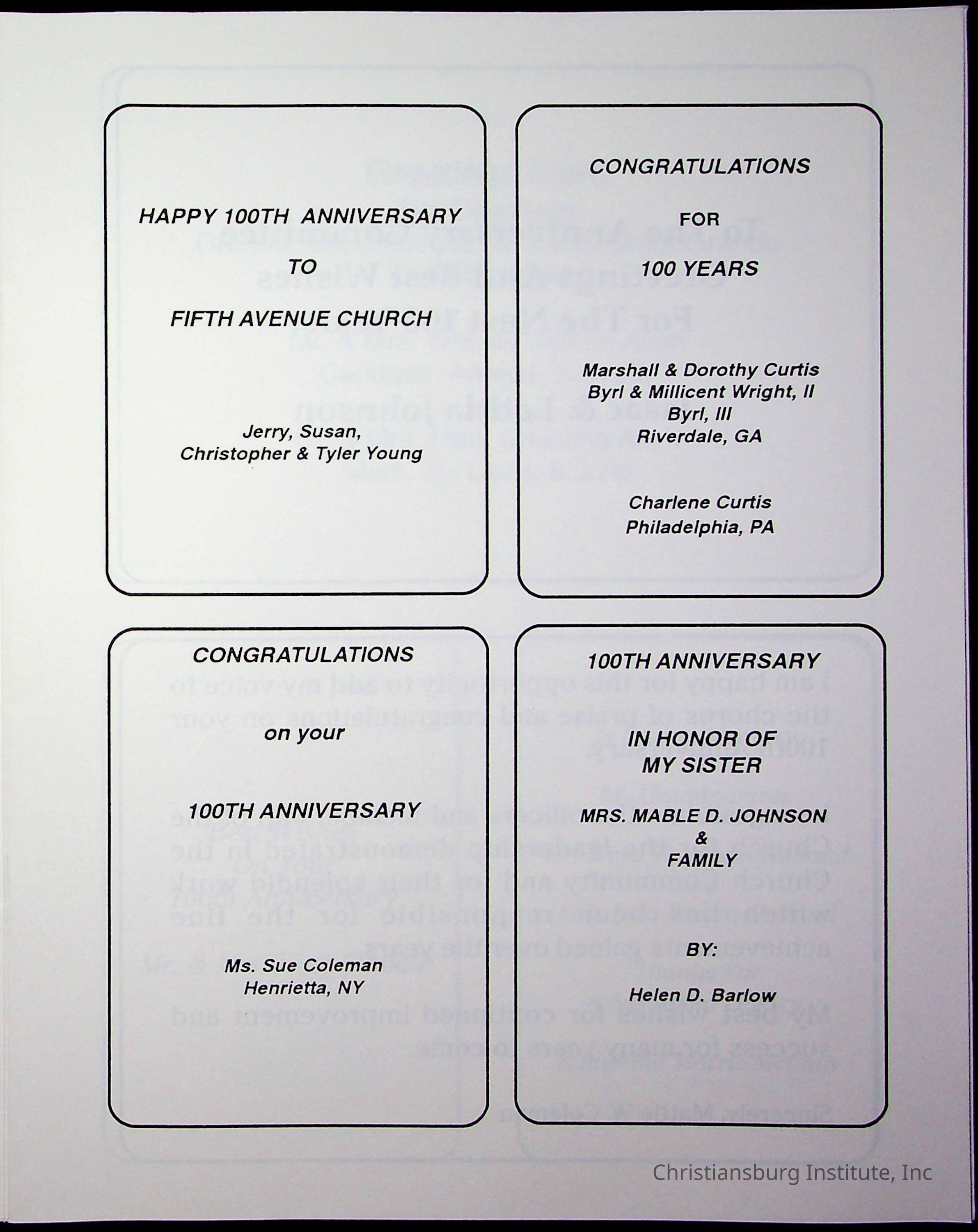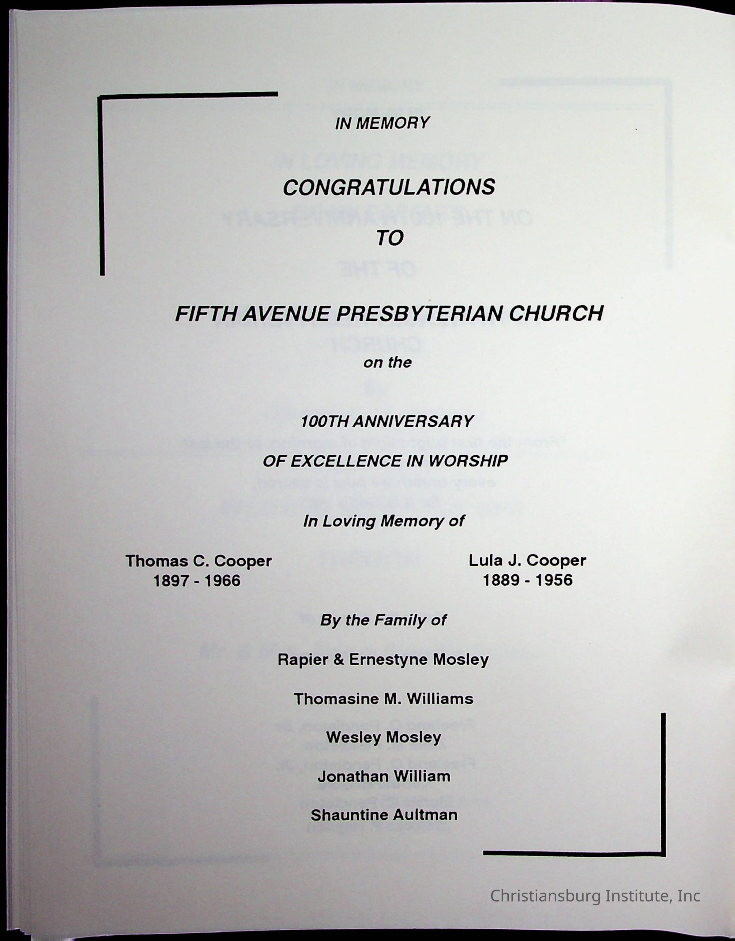 Copyright has been assigned to Christiansburg Institute Museum & Archives by Fifth Avenue Presbyterian Church. For permission to publish materials created by the donor, contact CIMA@christiansburginstitute.com. Materials not created by Fifth Avenue Presbyterian Church may still be under copyright.