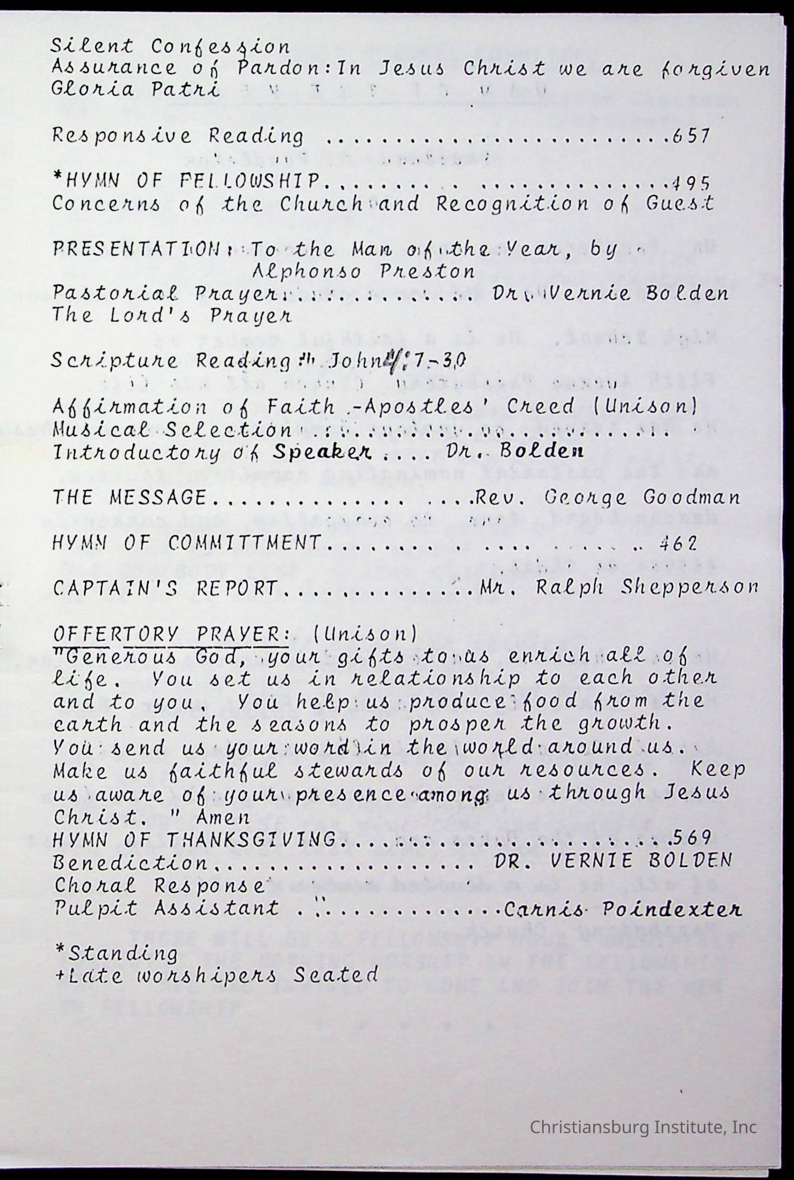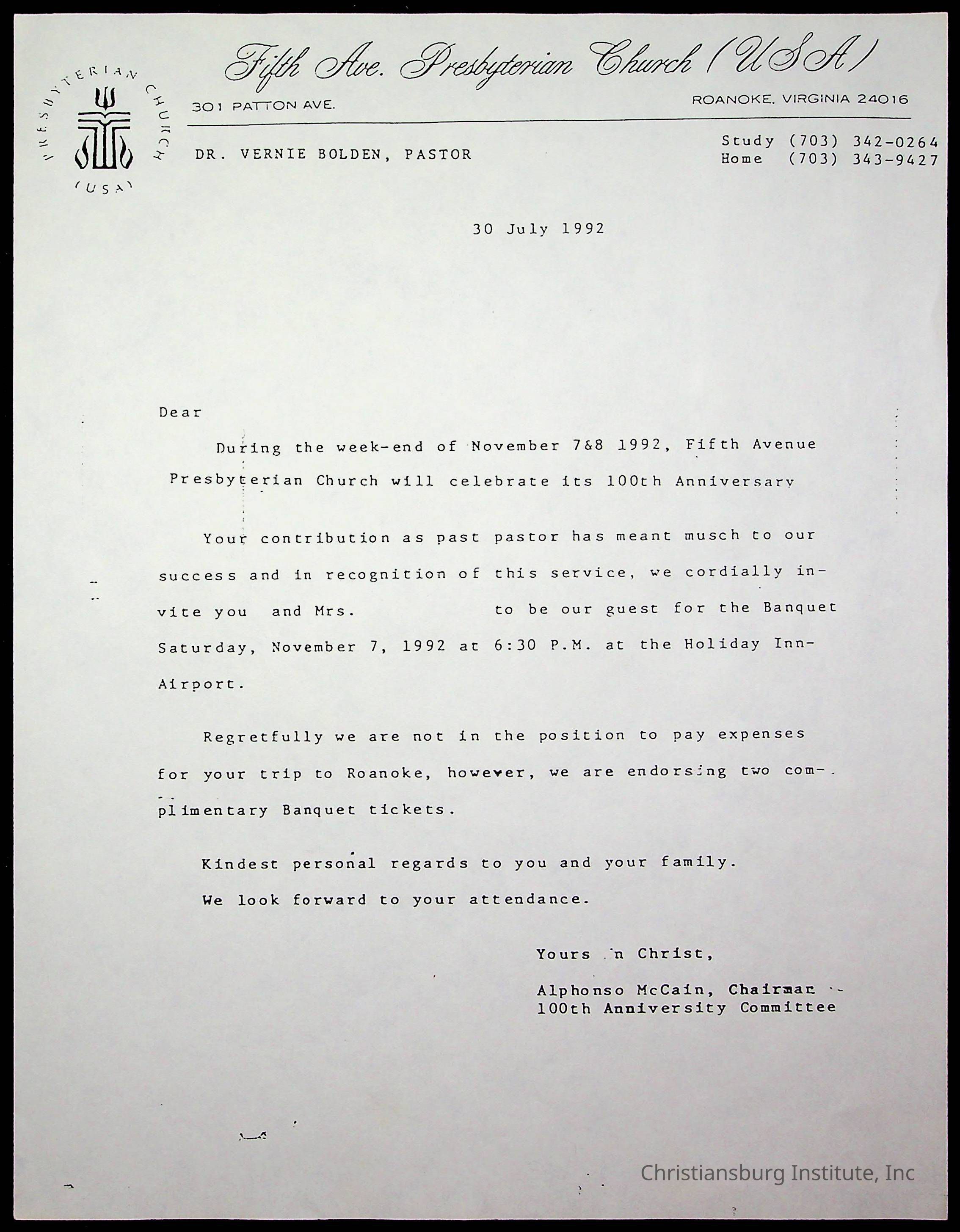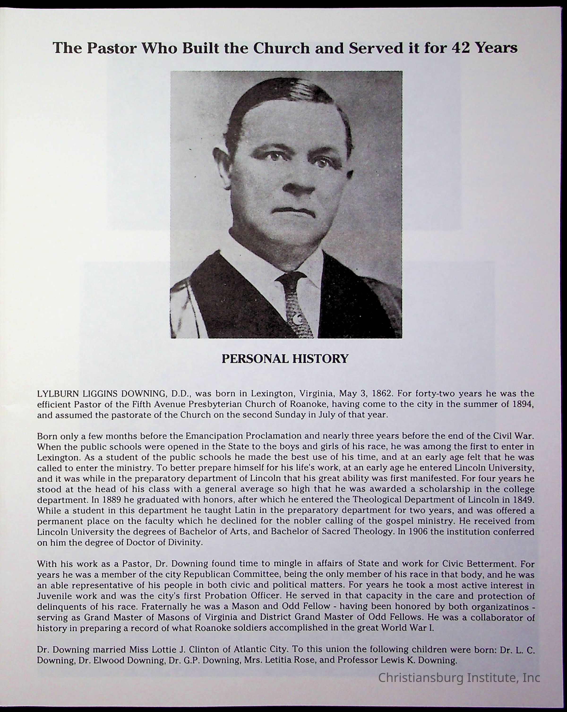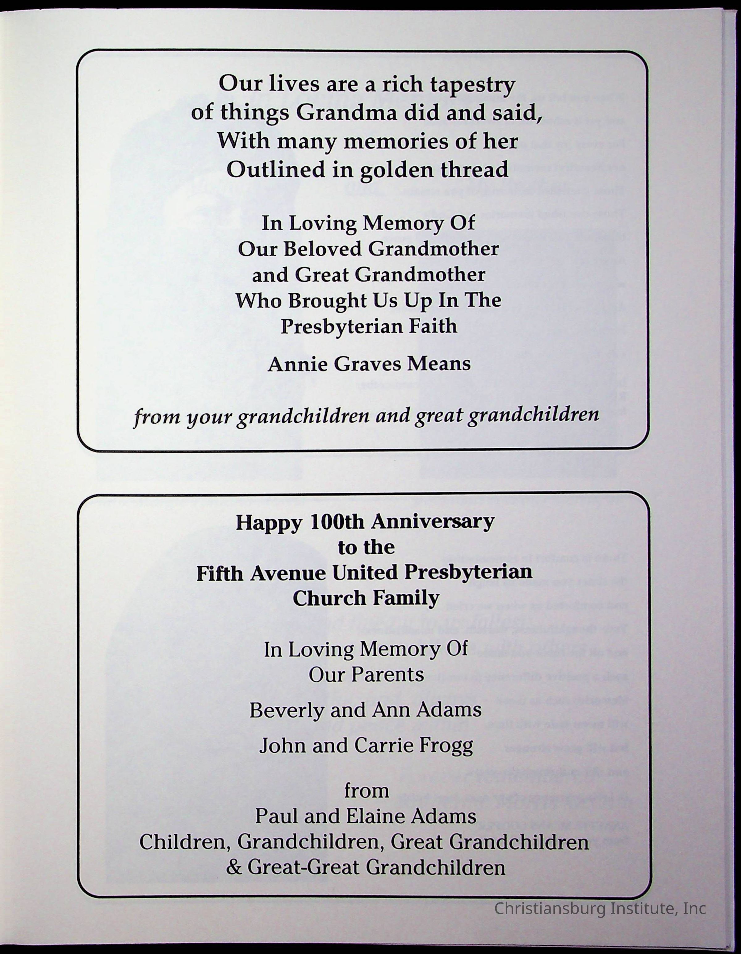 Copyright has been assigned to Christiansburg Institute Museum & Archives by Fifth Avenue Presbyterian Church. For permission to publish materials created by the donor, contact CIMA@christiansburginstitute.com. Materials not created by Fifth Avenue Presbyterian Church may still be under copyright.