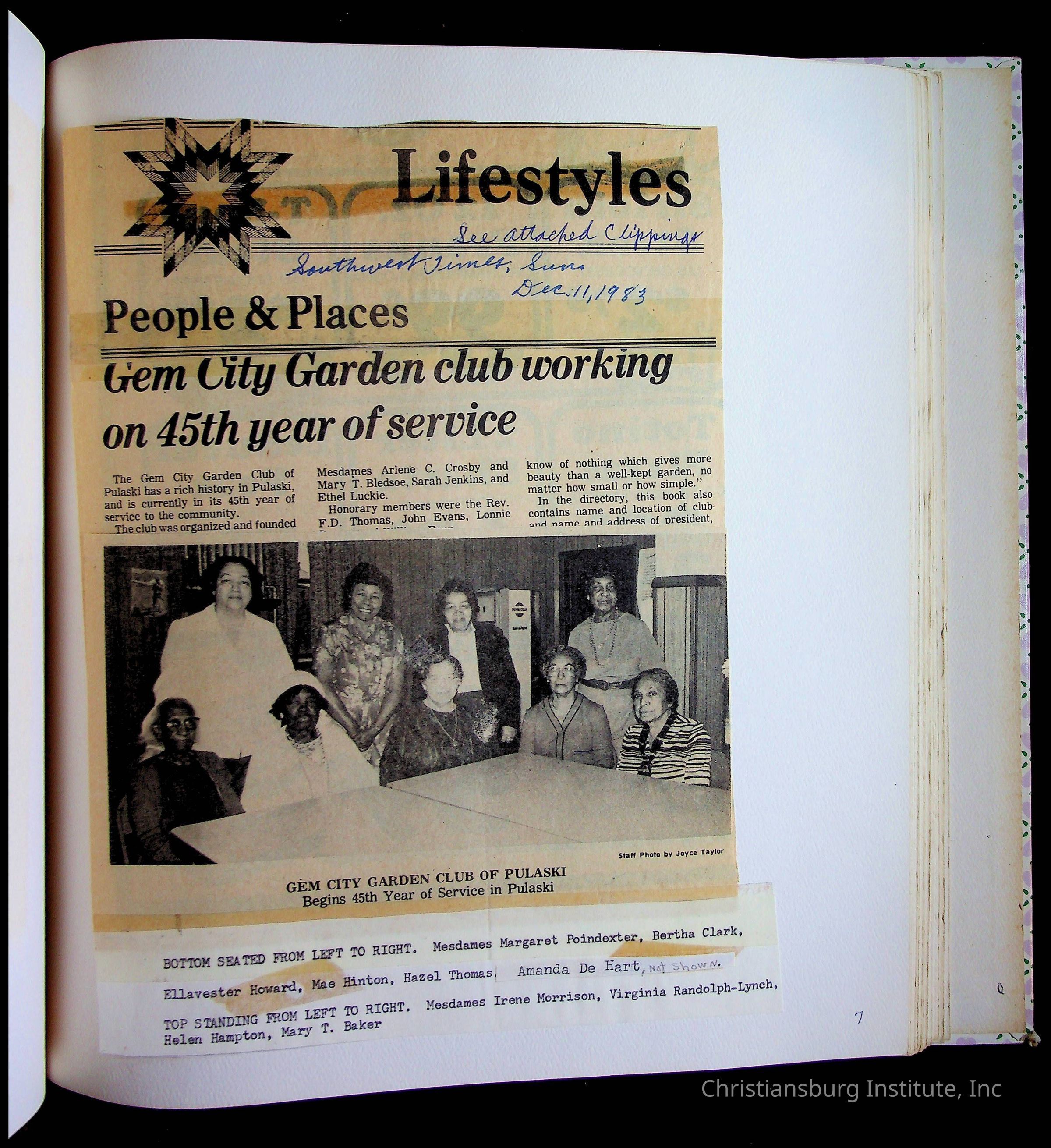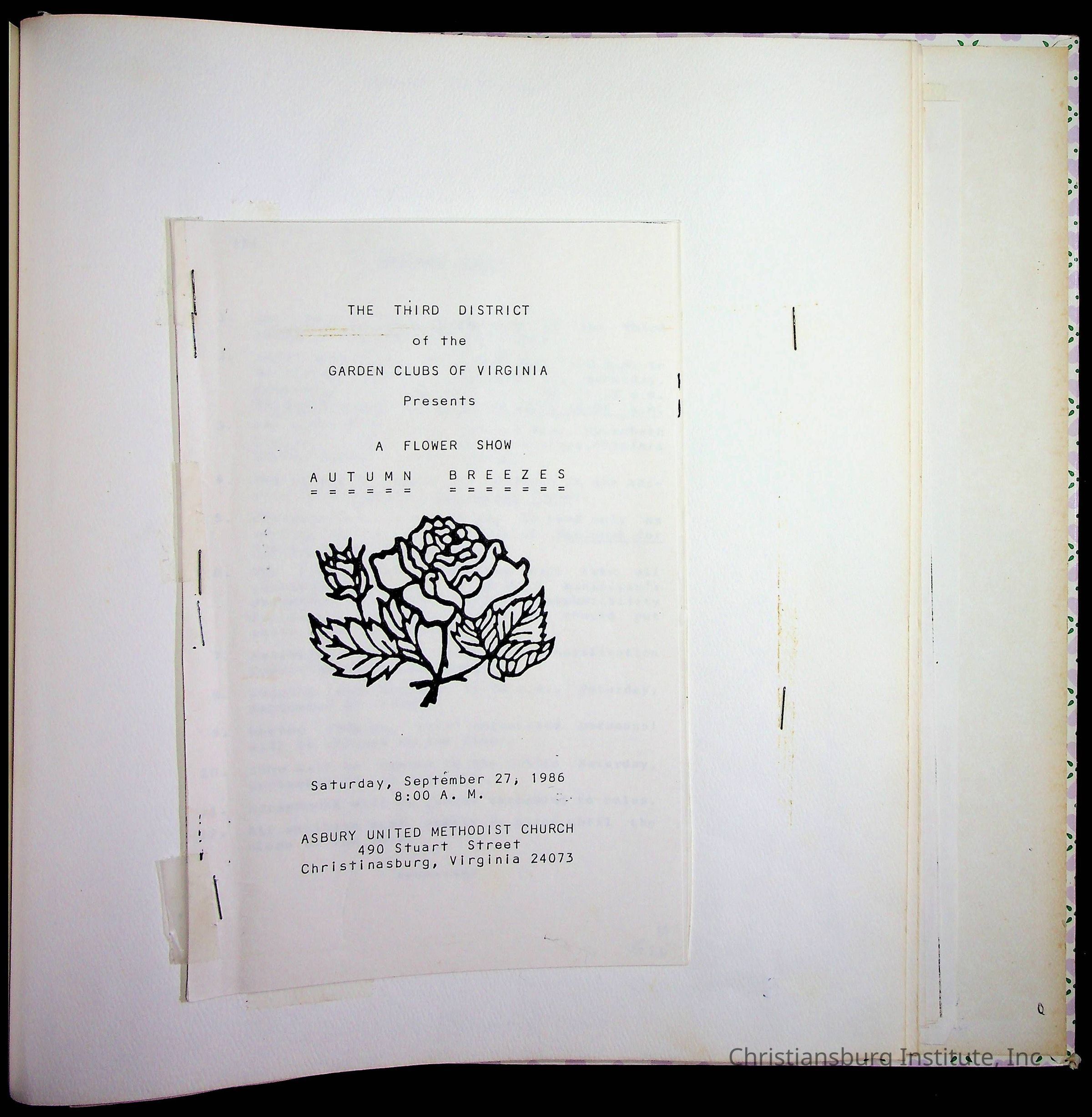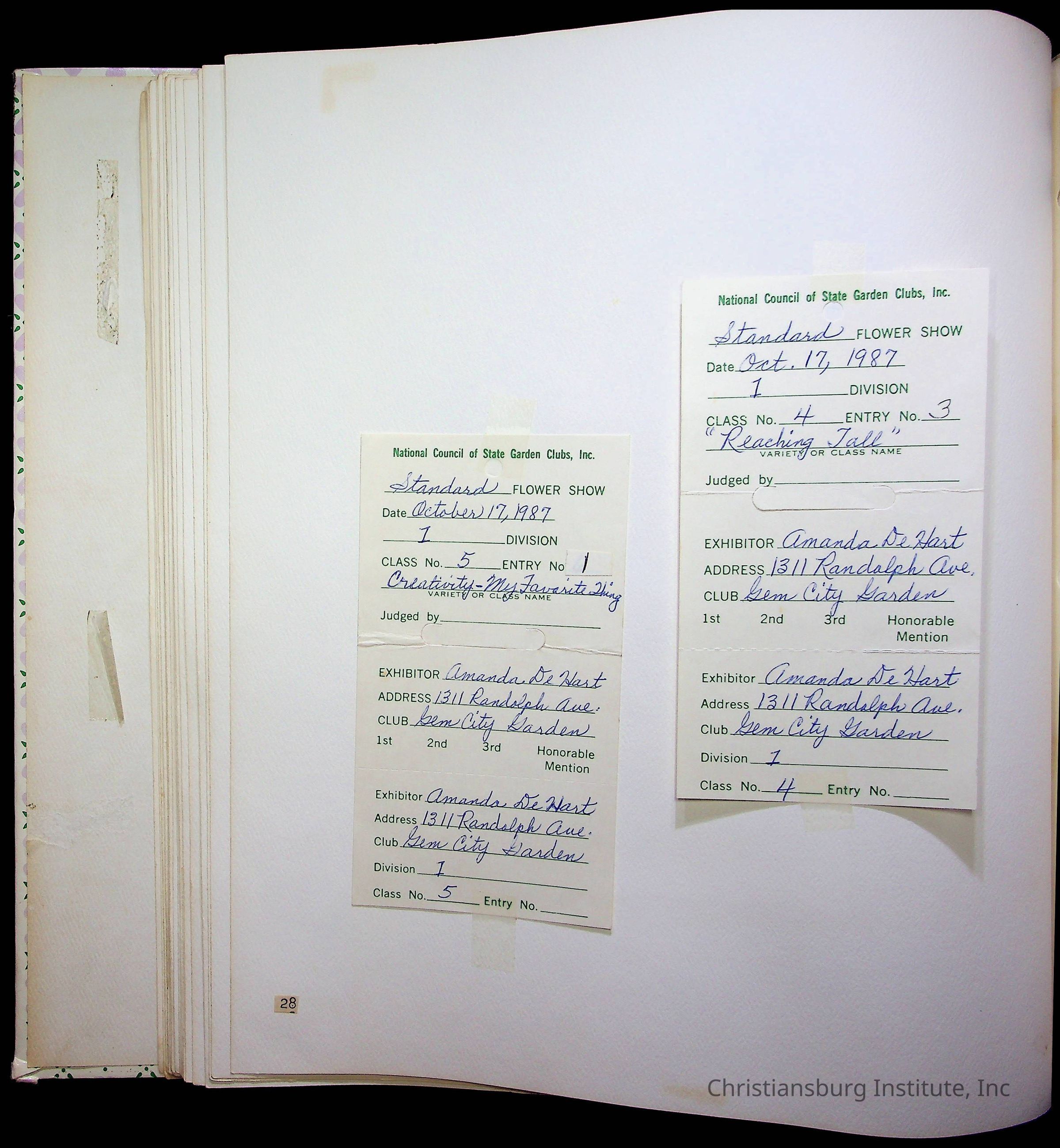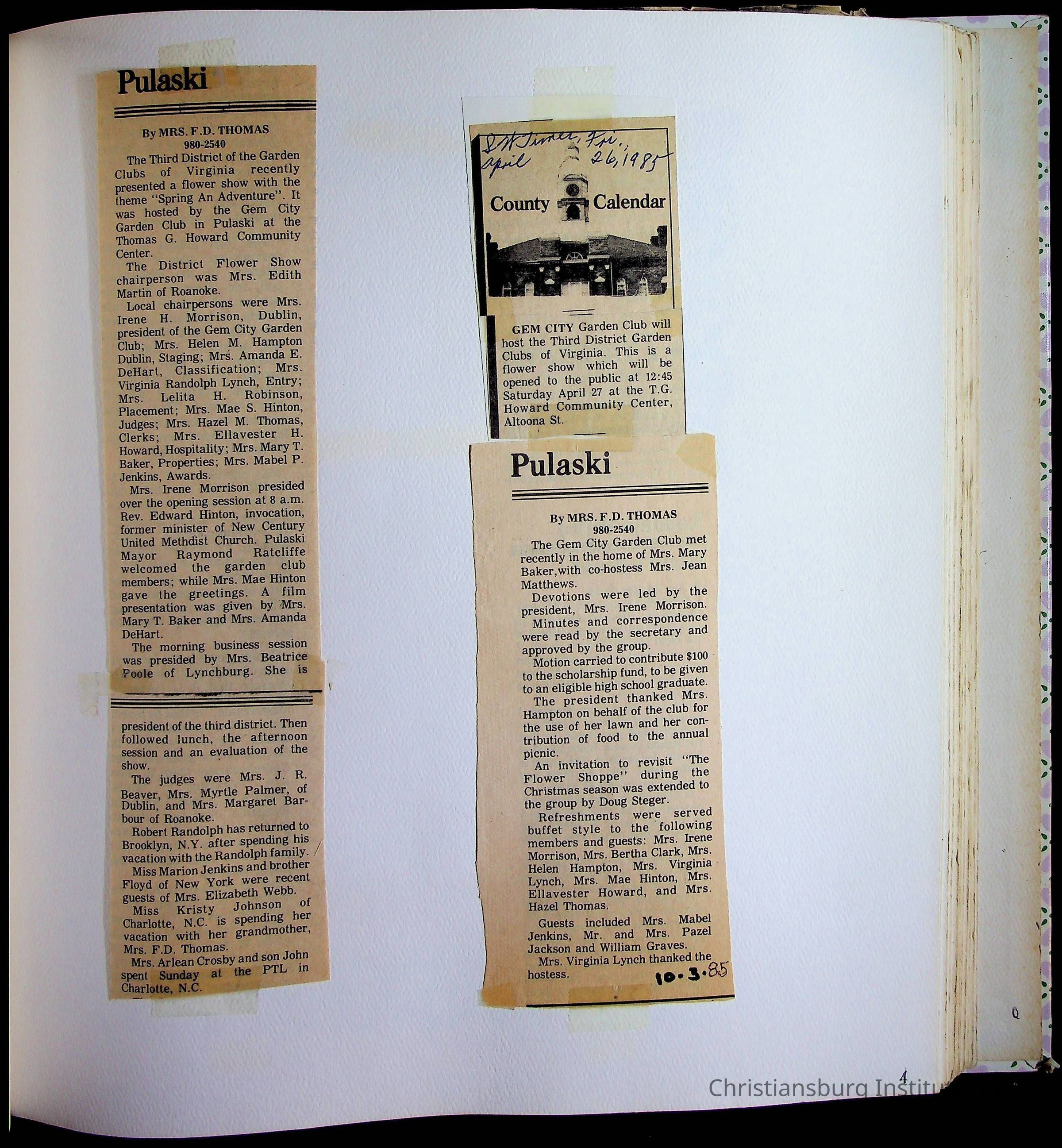 A scrapbook compiled by Amanda DeHart for the Gem City Garden Club of Pulaski, Virginia dated 1985-1989.