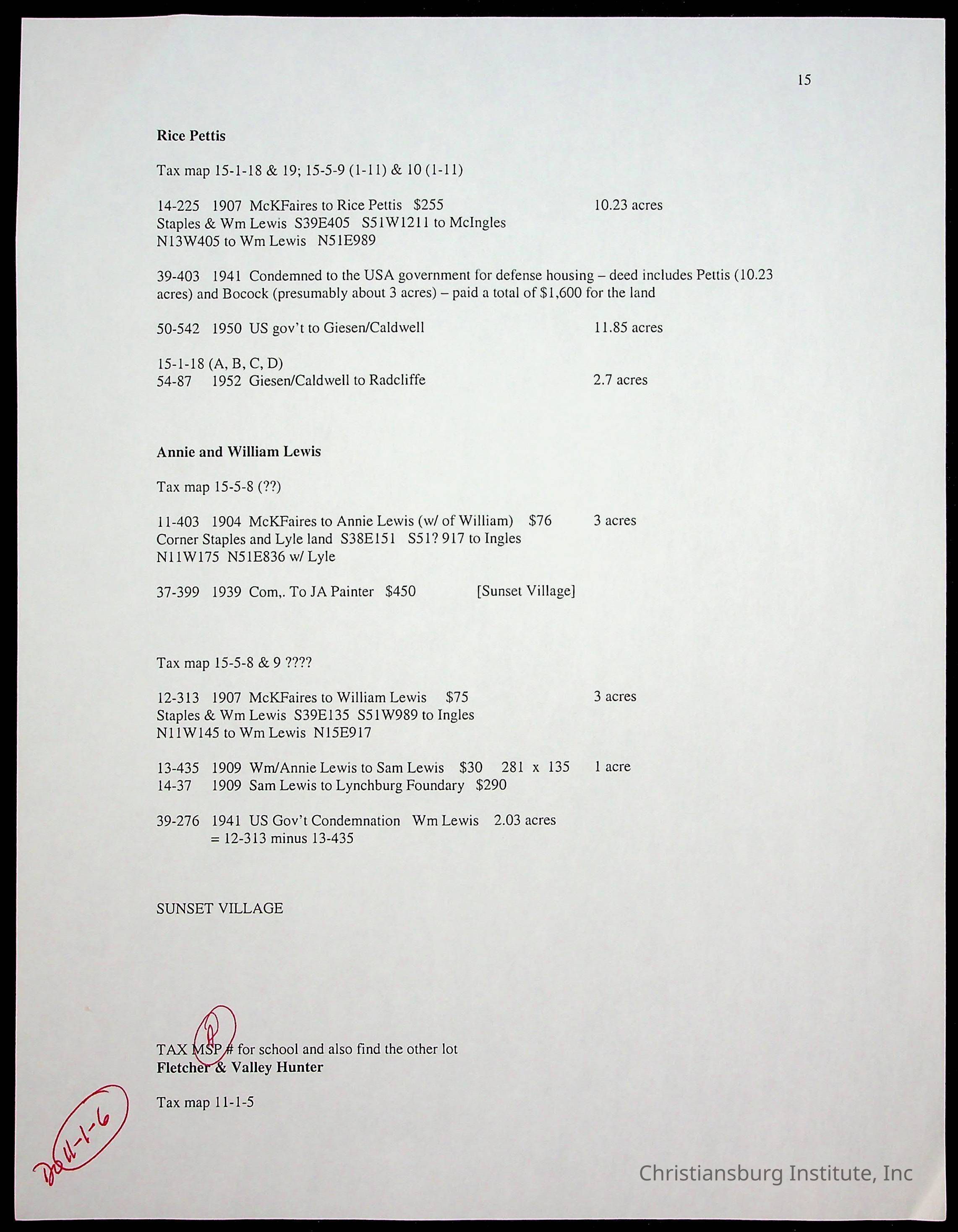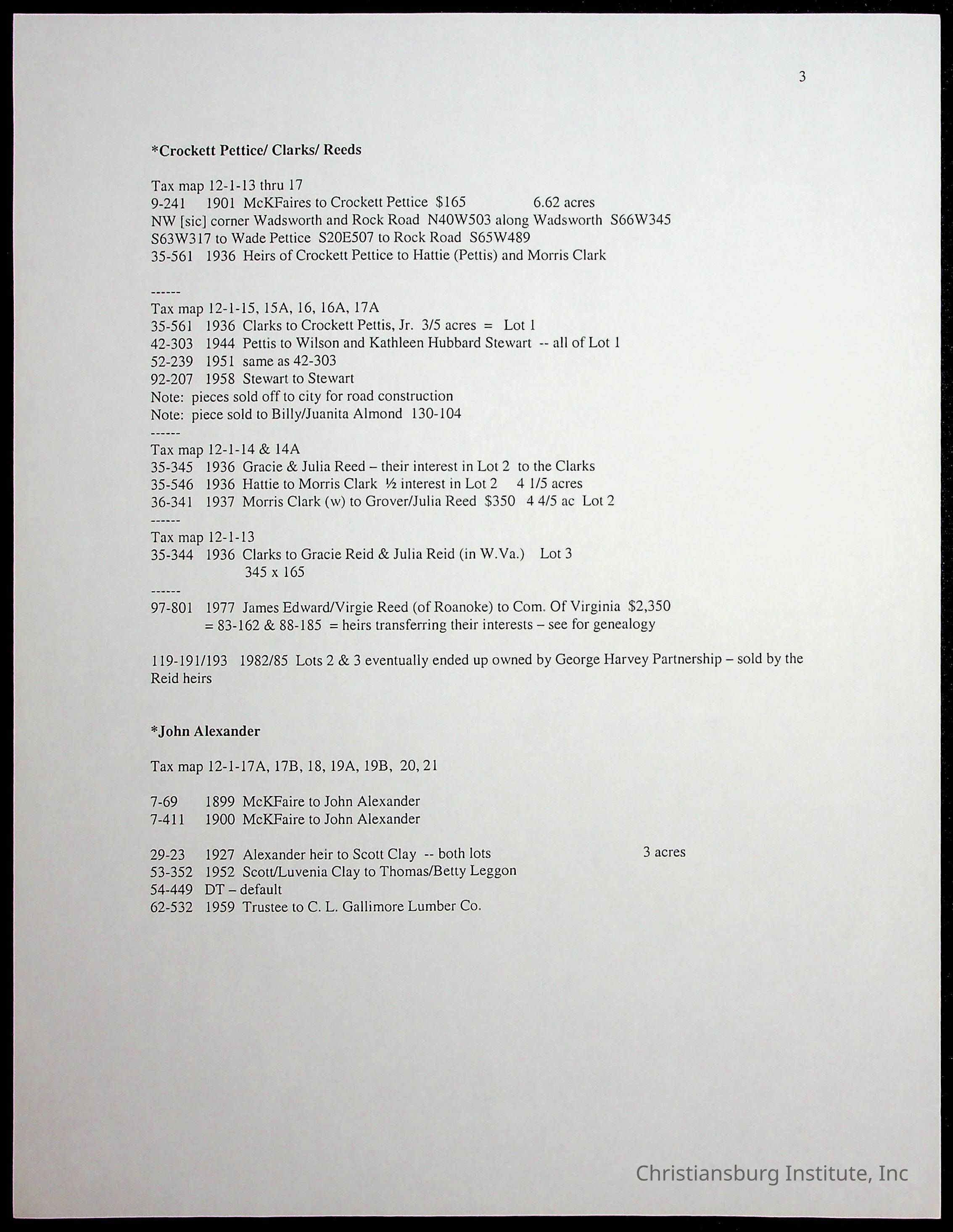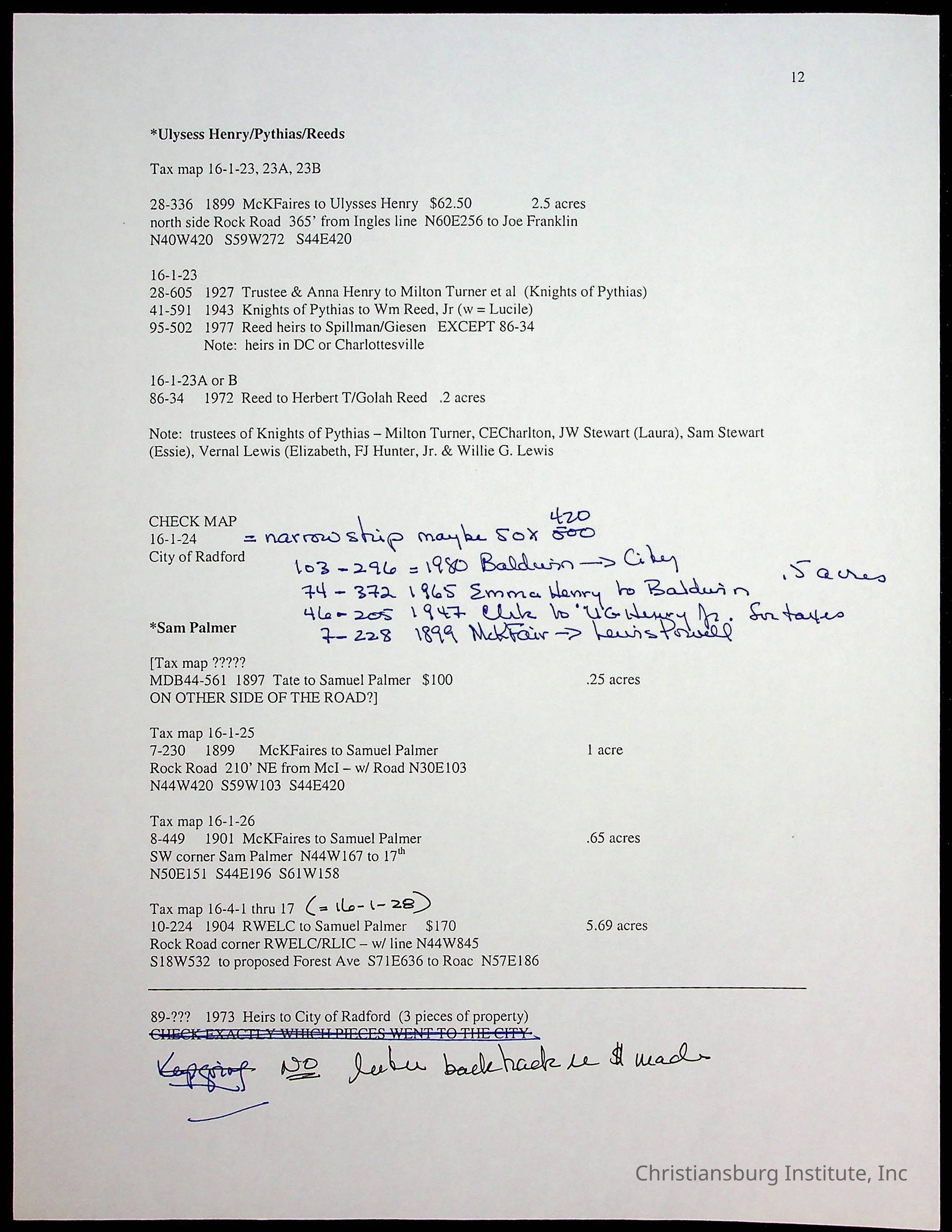 A folder of research materials collected by Radford University professor, Dr. Linda Killen. This folder is titled 'Land/Genealogy Research' and includes various research conducted in Radford, Virginia. This folder includes genealogy records, Dr Killen's notes, and plat maps.