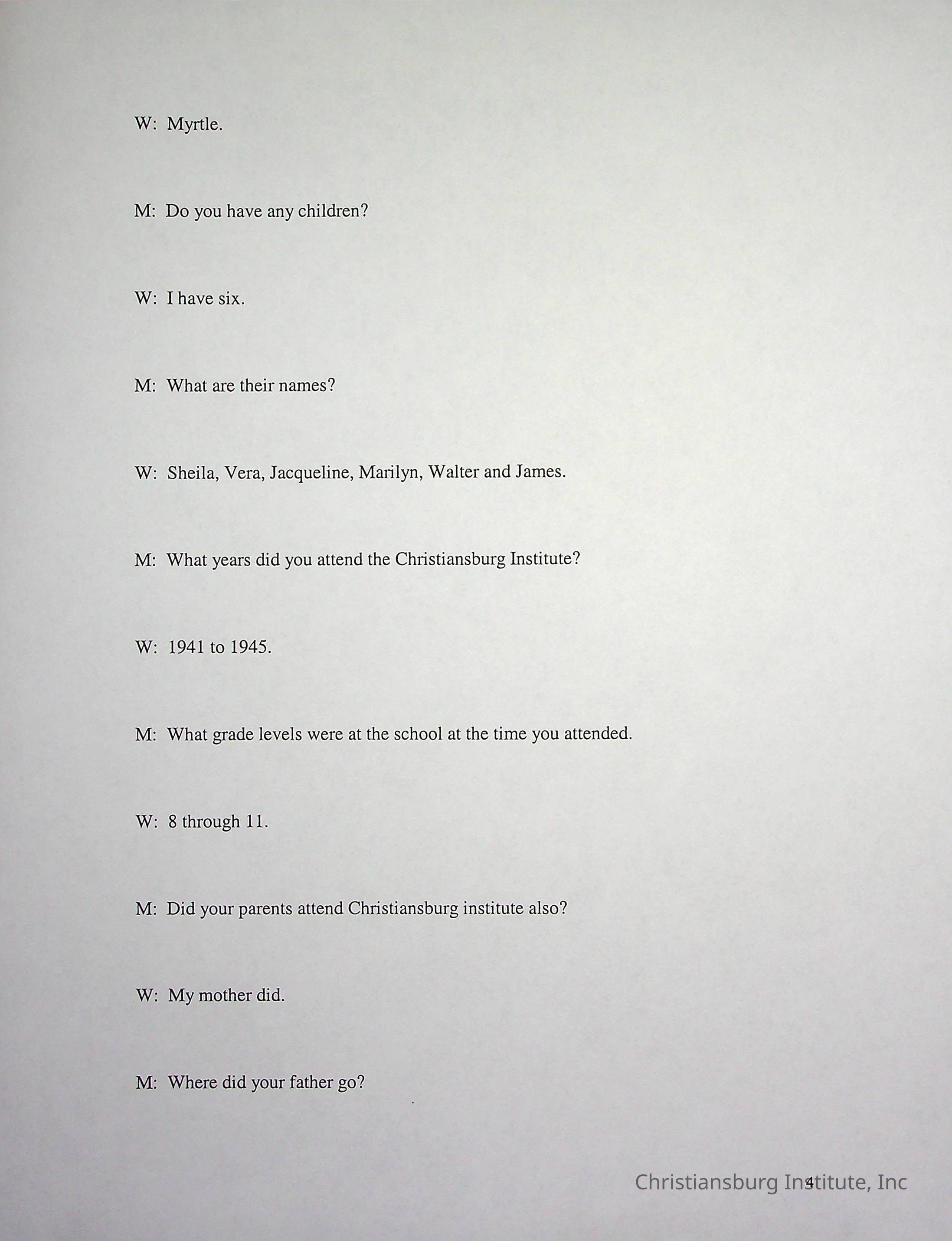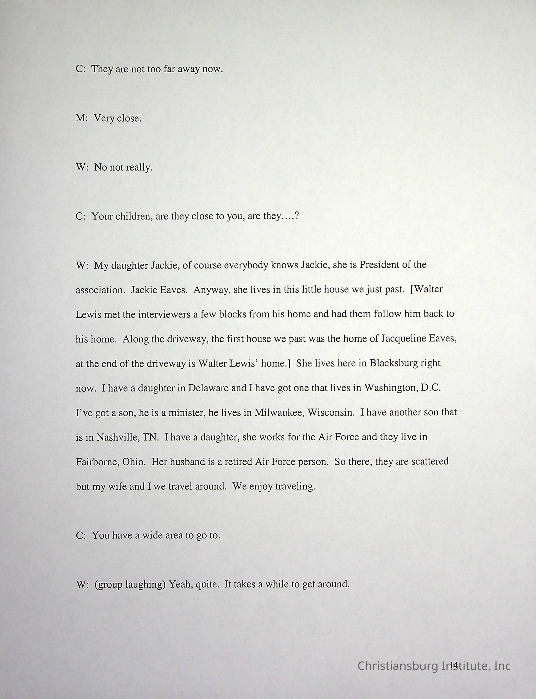 An oral history with Christiansburg Institute alumni, Walter Lewis conducted by Mitchell Housewick and Cheryl Trull on November 3rd, 2000.