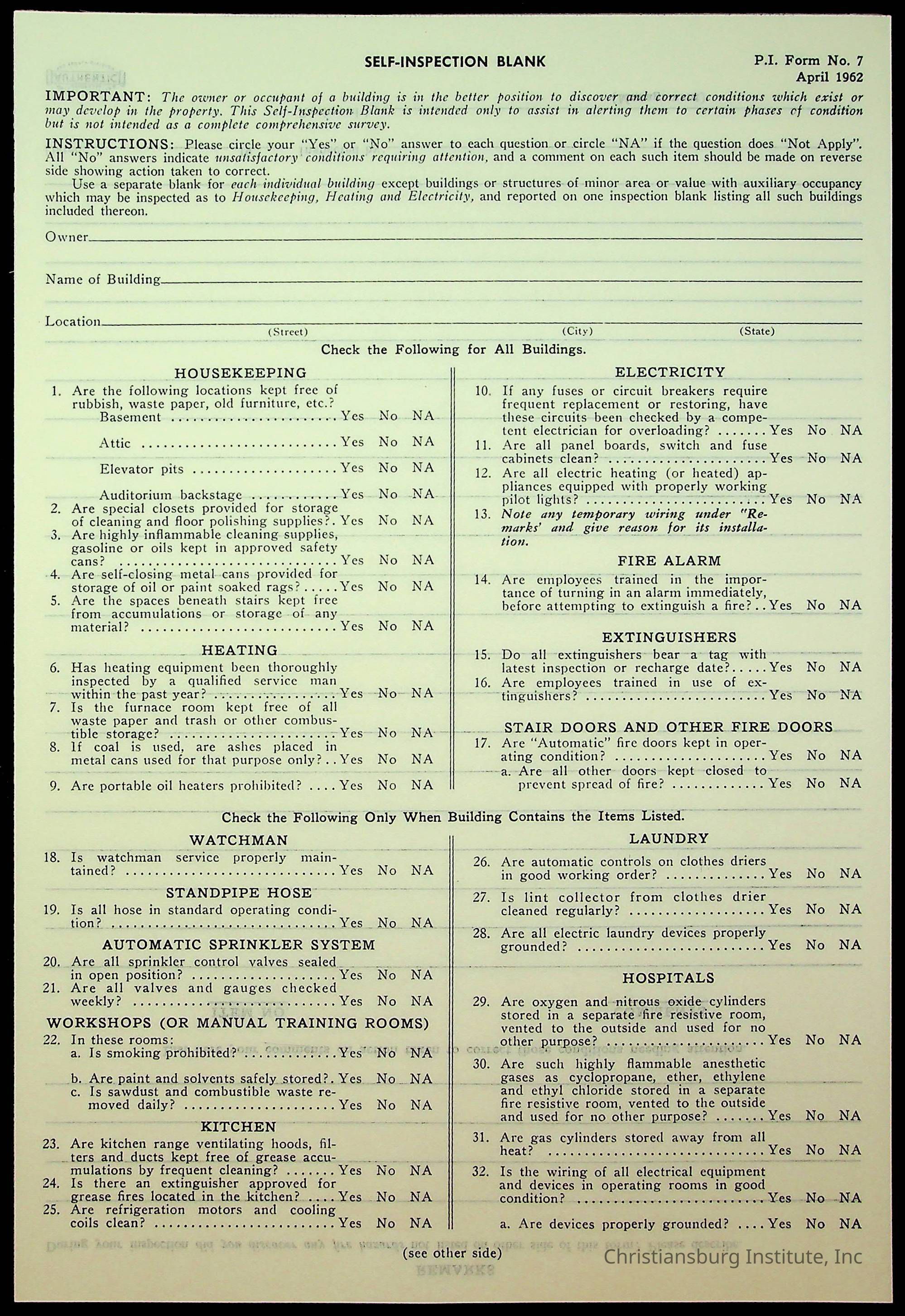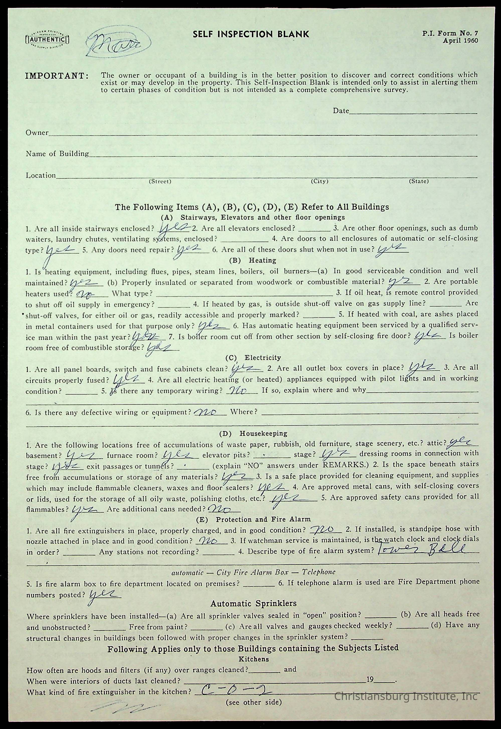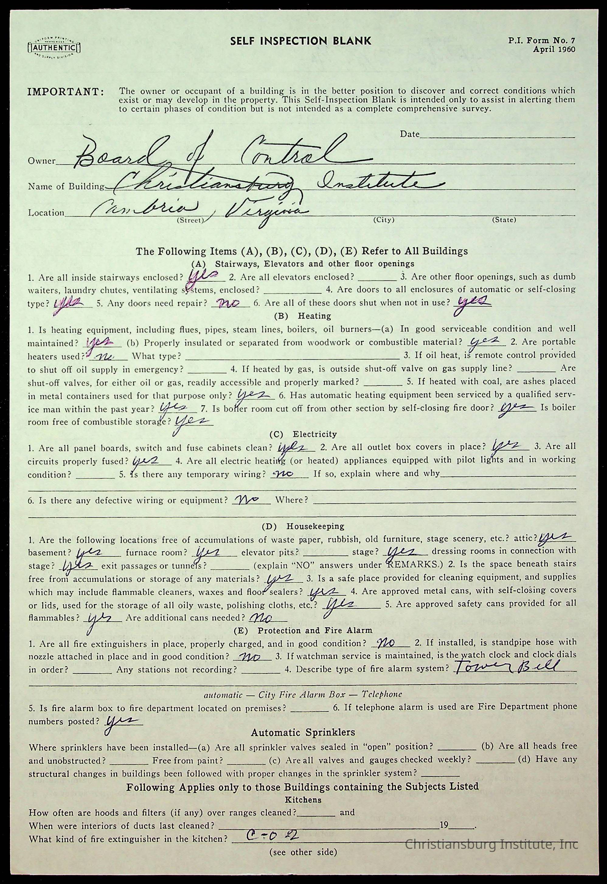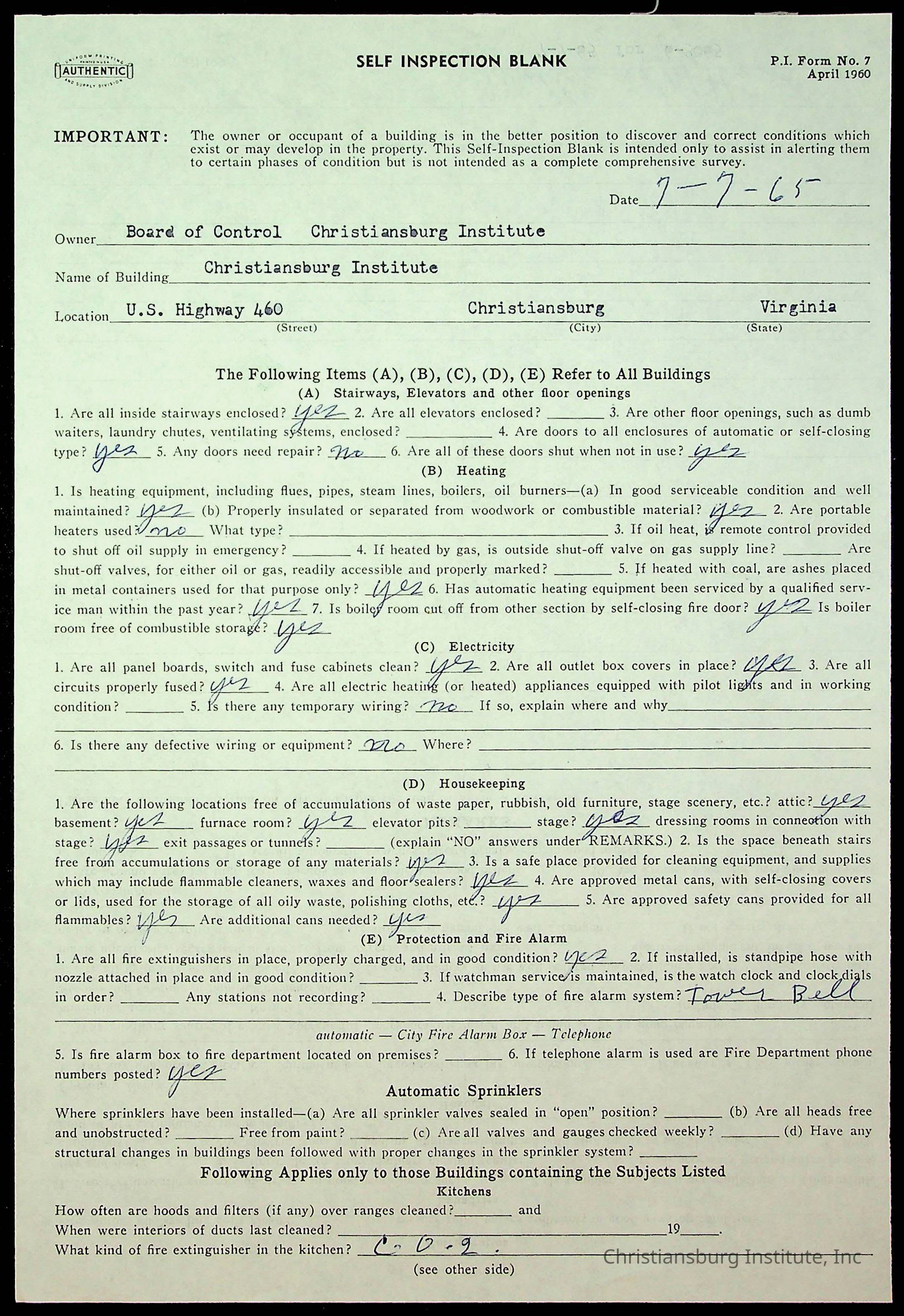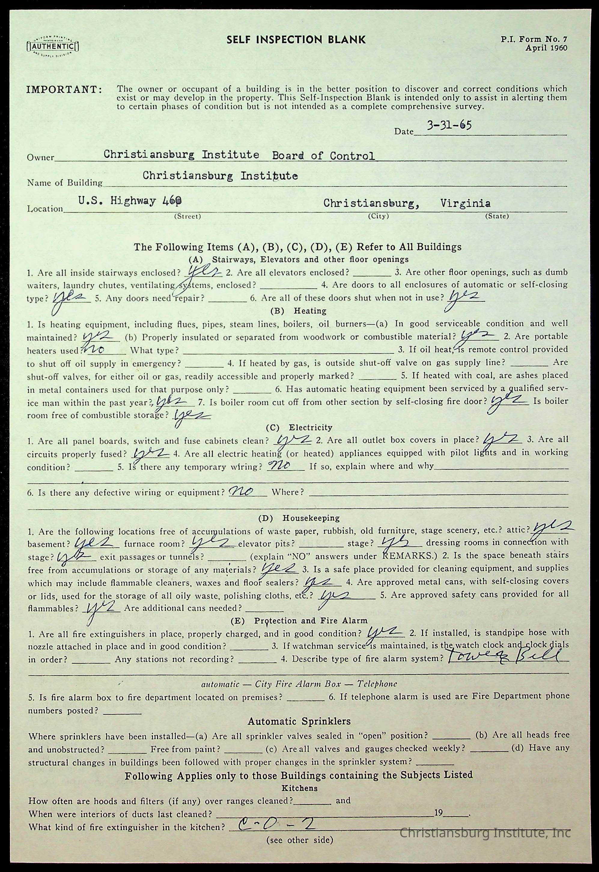 An archive of several fire self-inspection forms filled out by Christiansburg Institute from 1964 through 1966.
