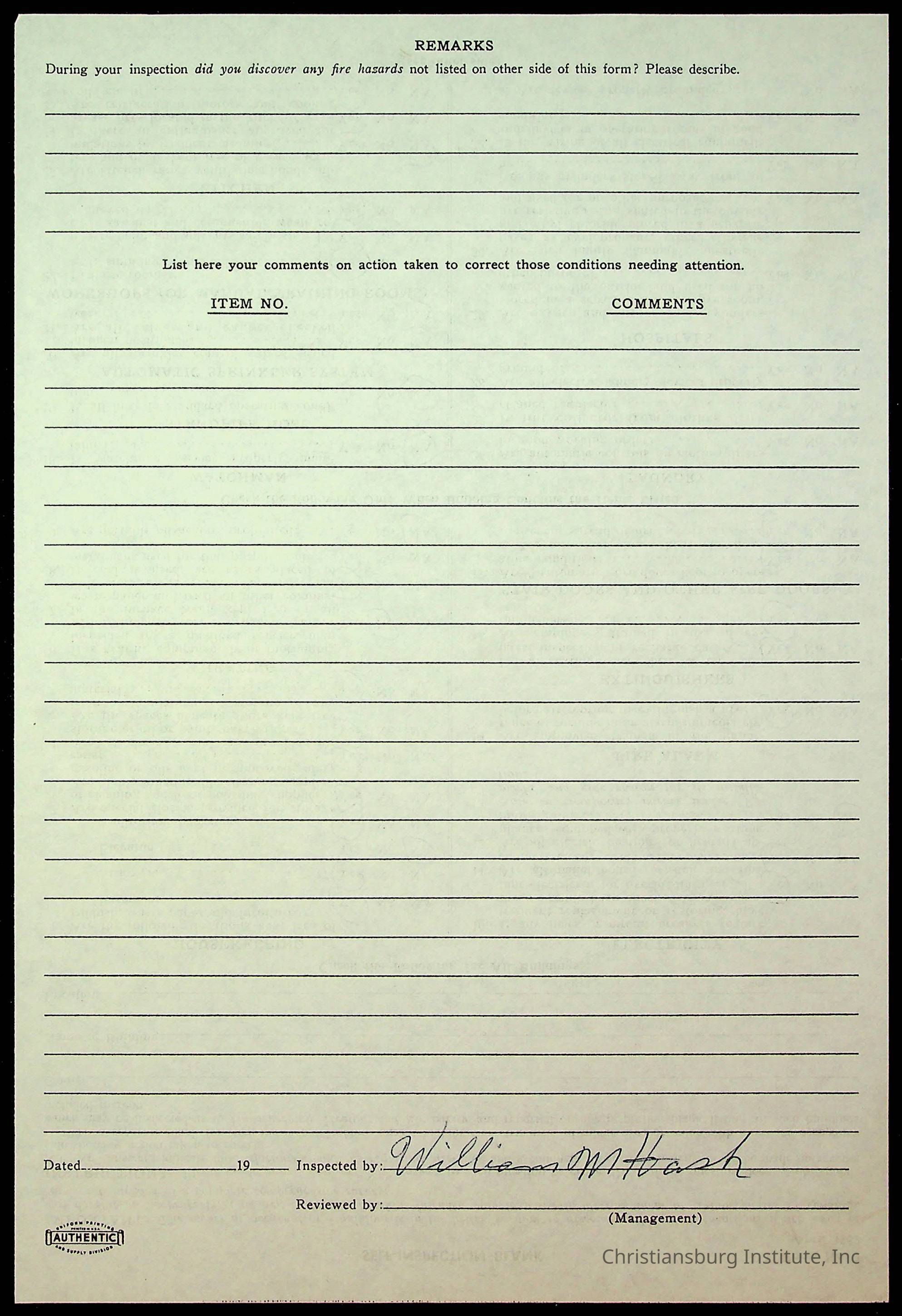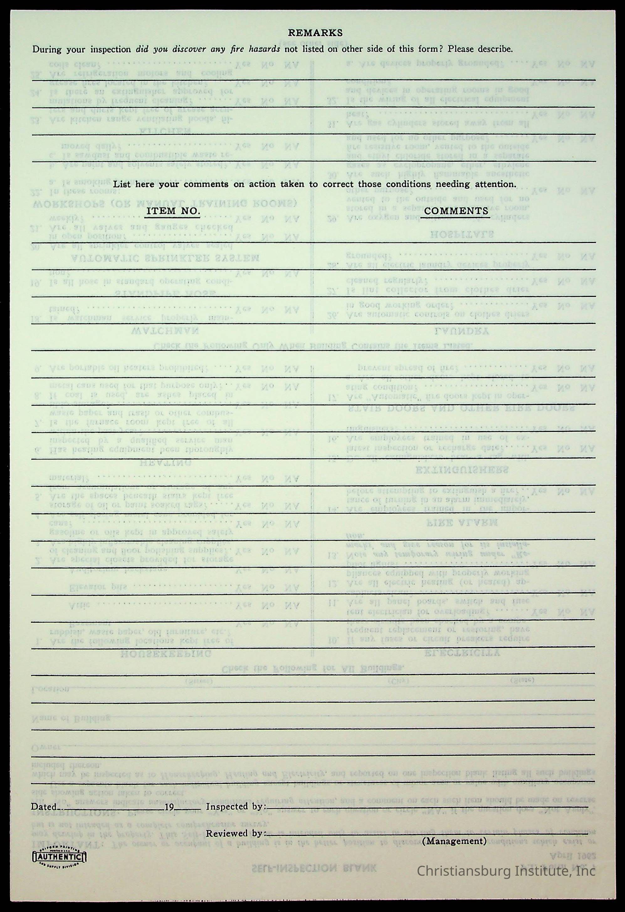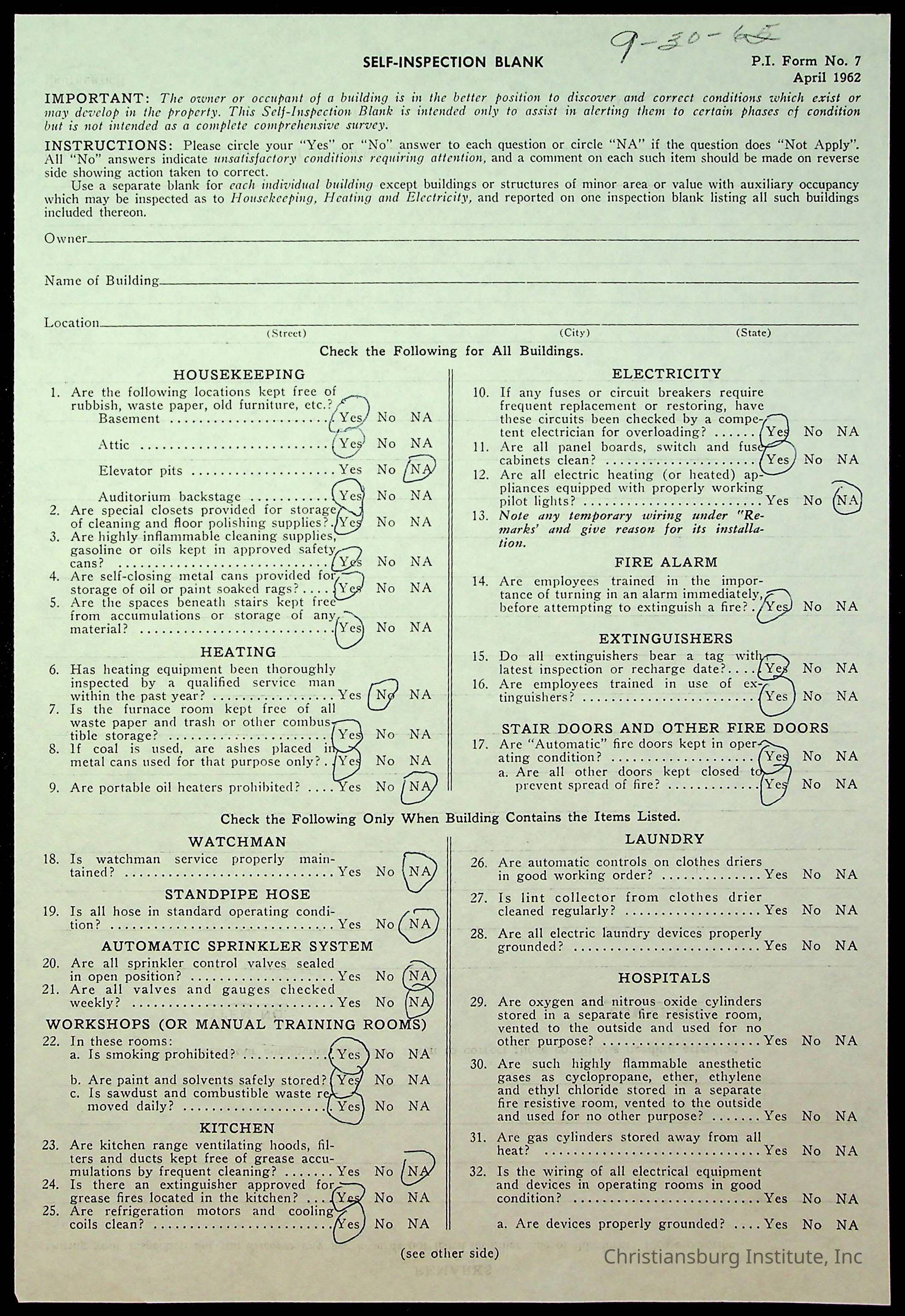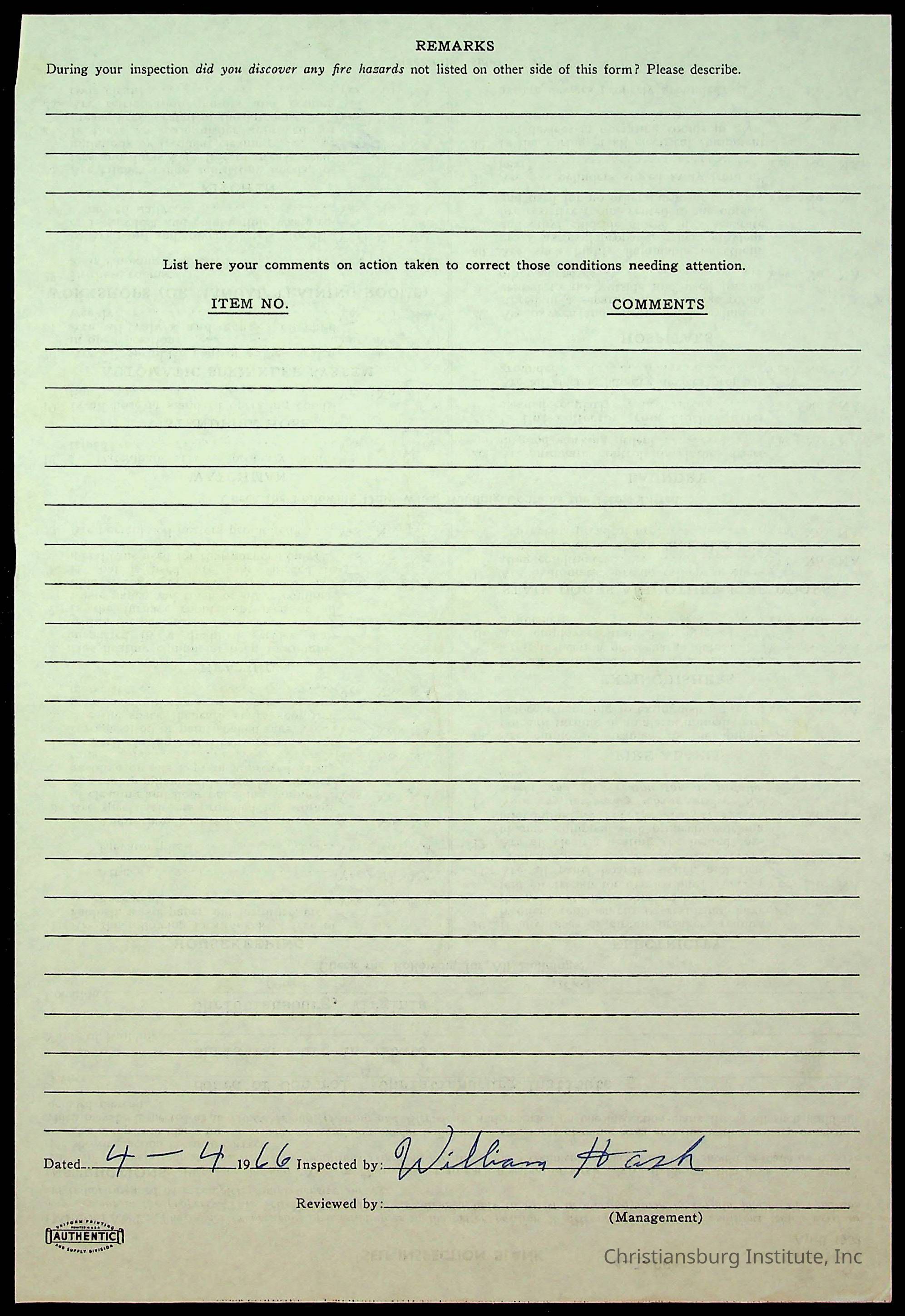 An archive of several fire self-inspection forms filled out by Christiansburg Institute from 1964 through 1966.