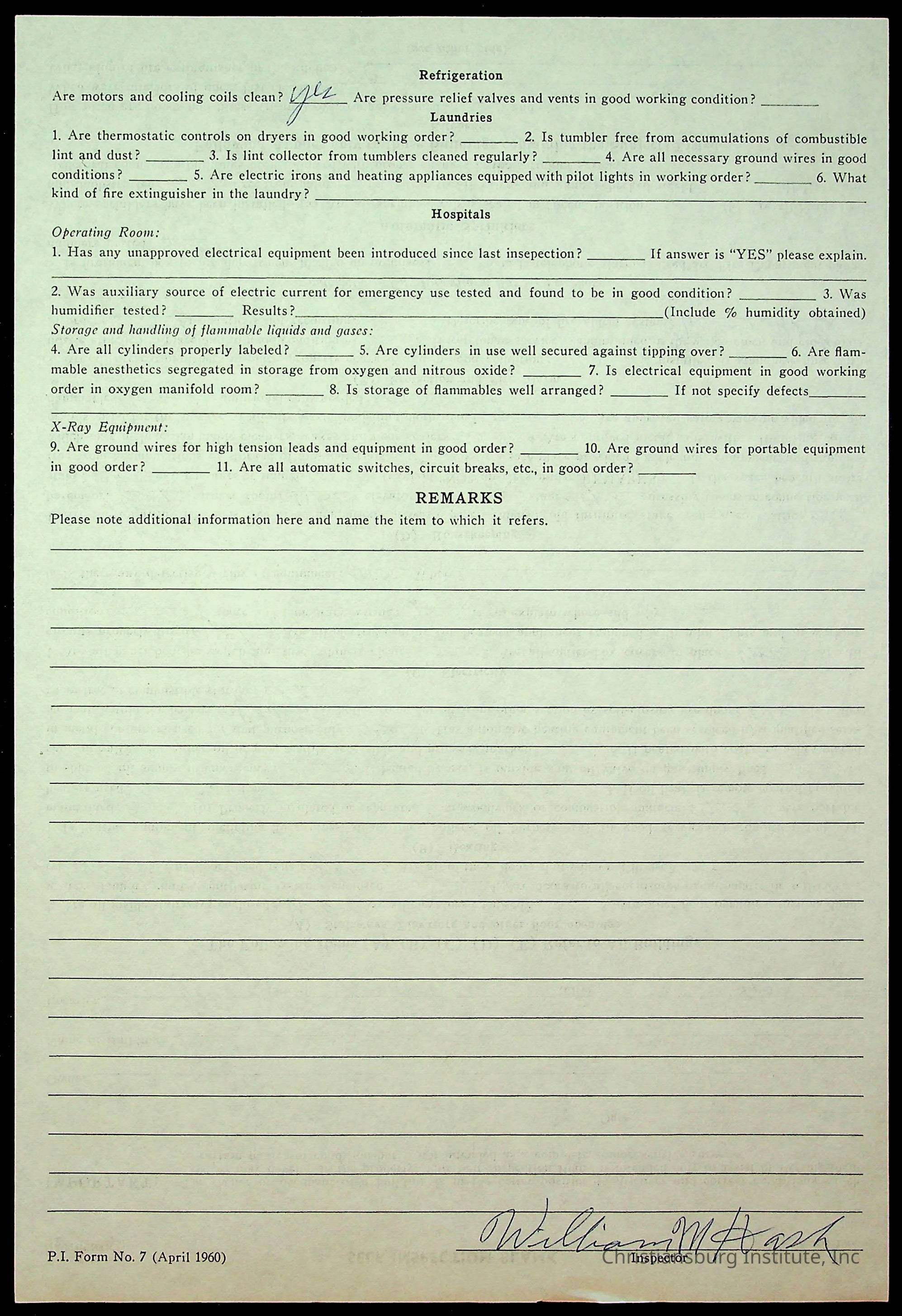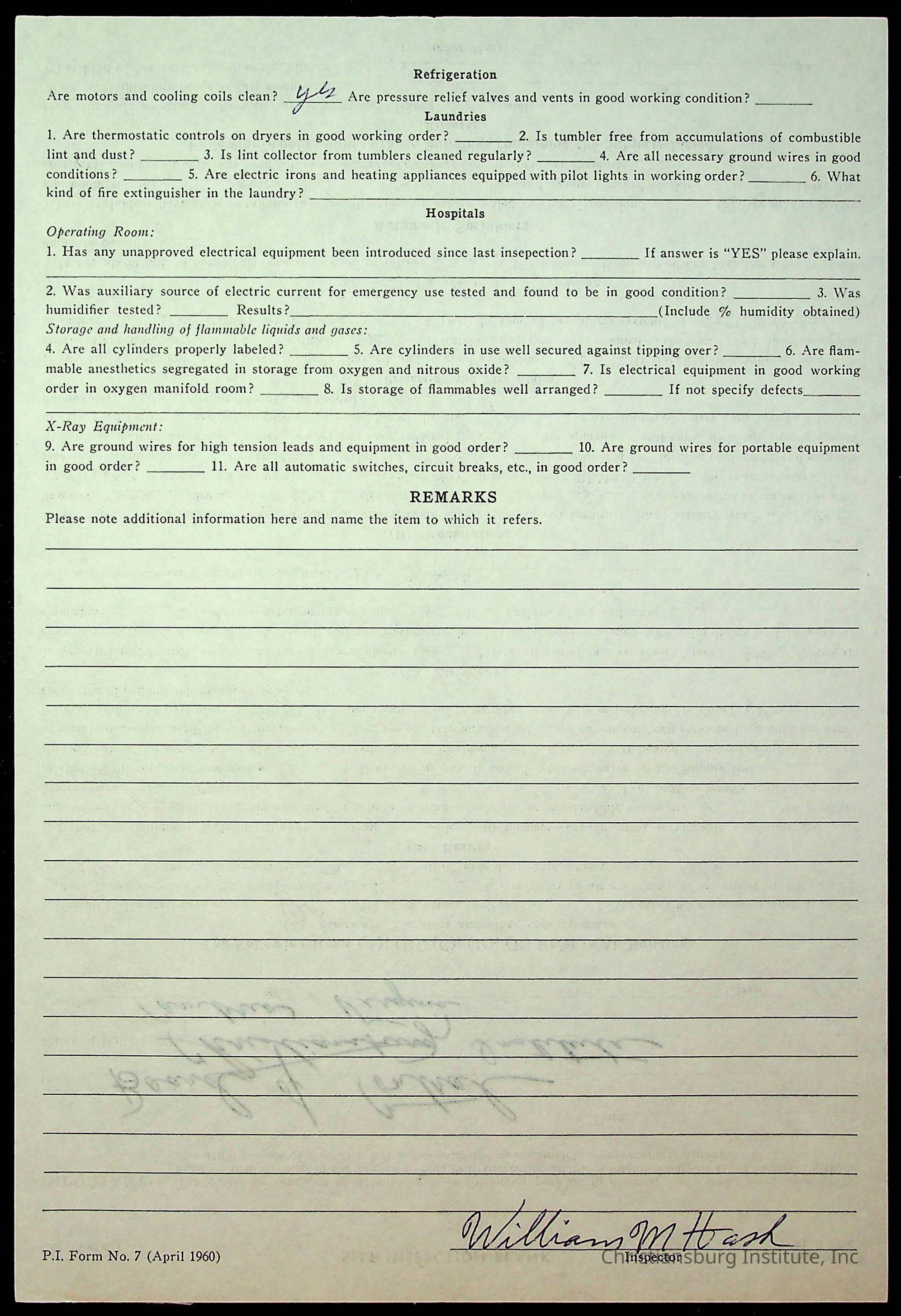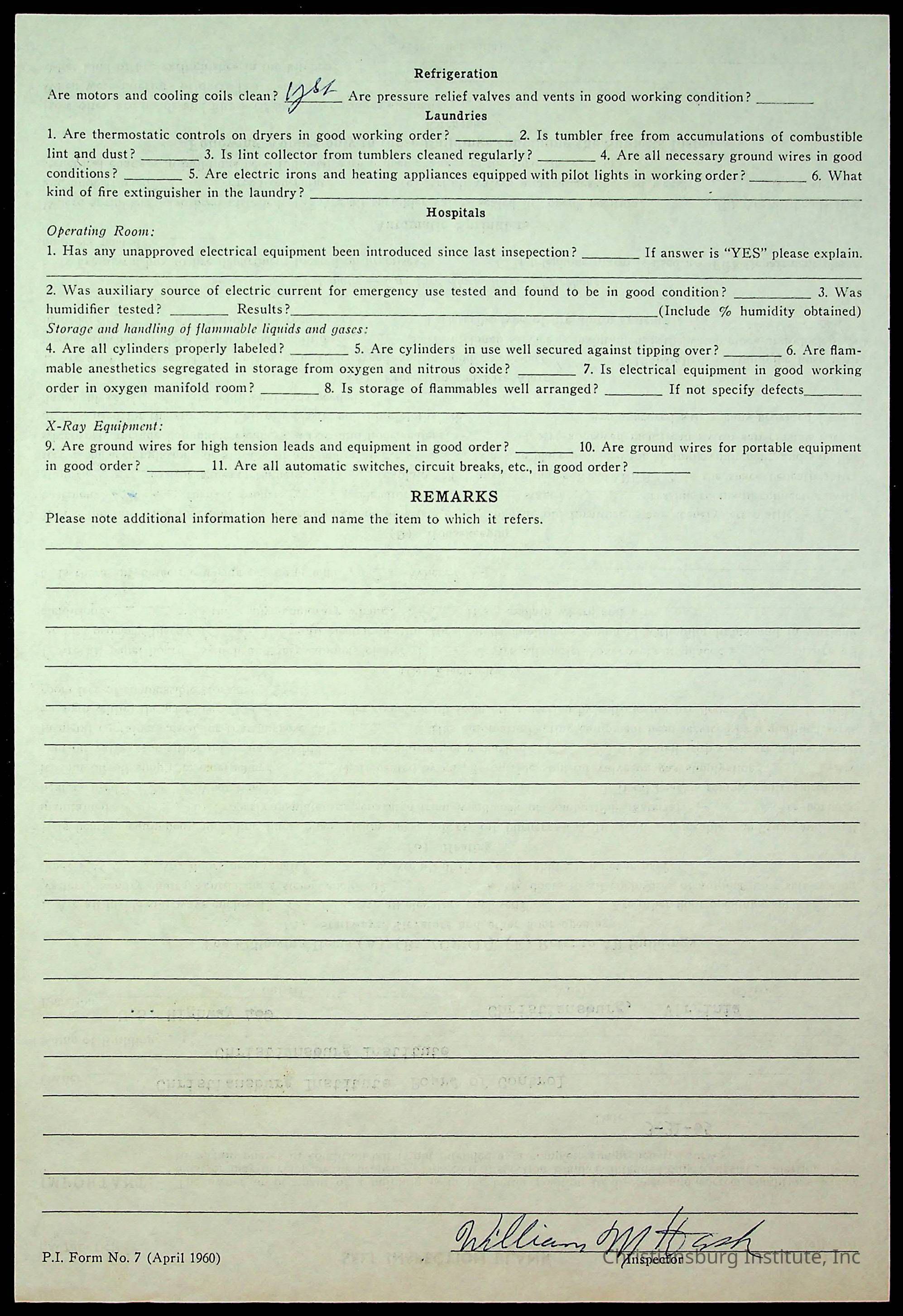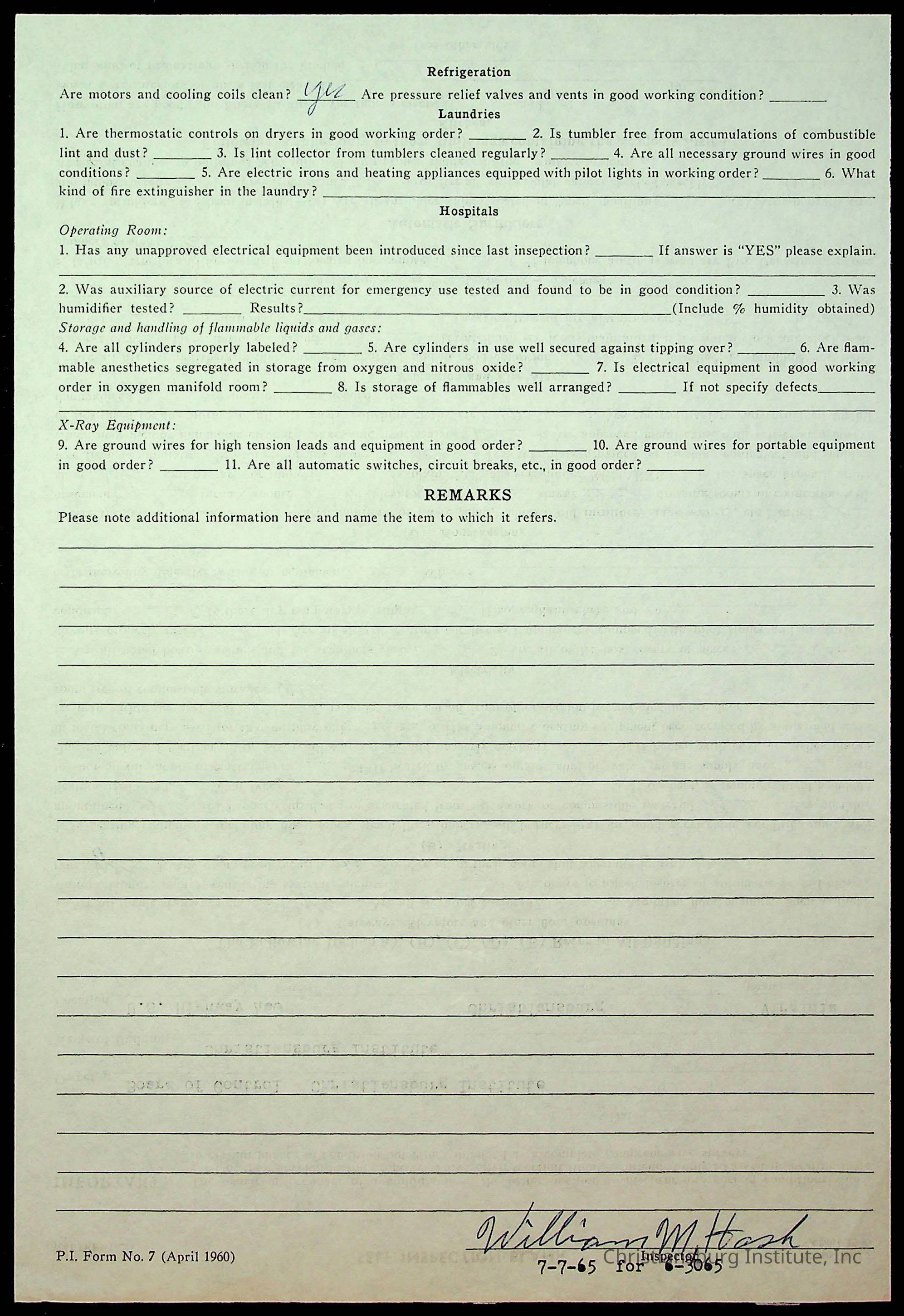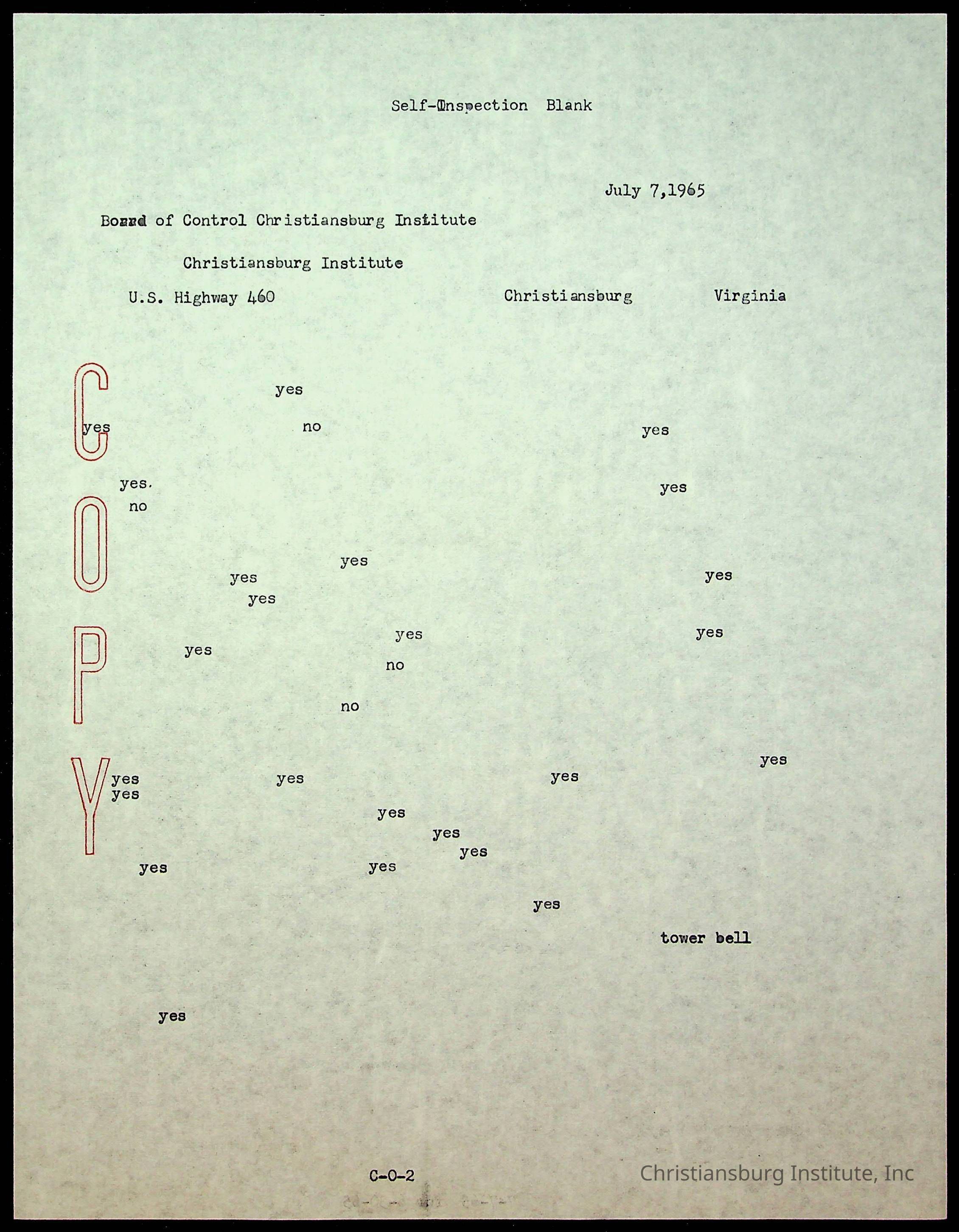 An archive of several fire self-inspection forms filled out by Christiansburg Institute from 1964 through 1966.