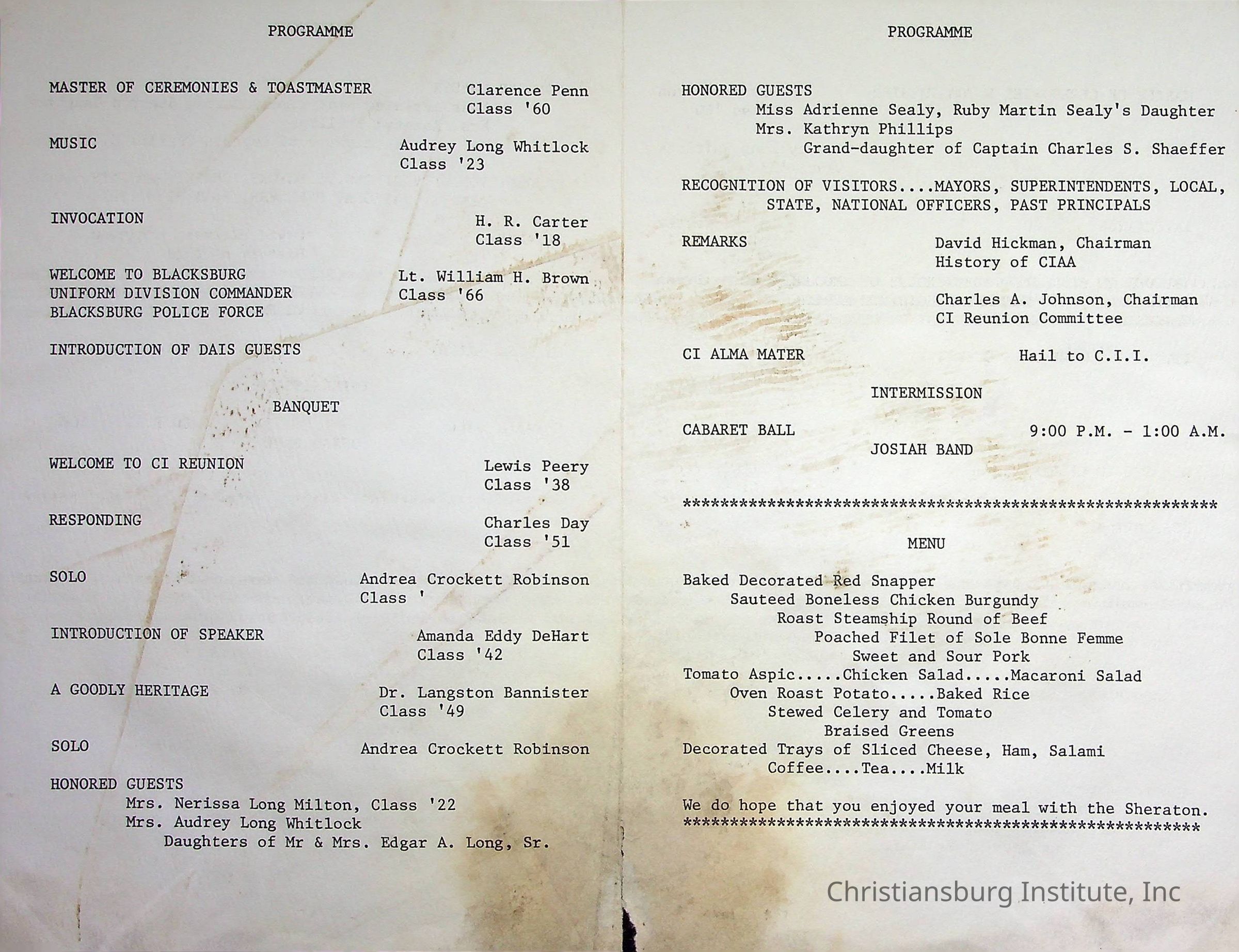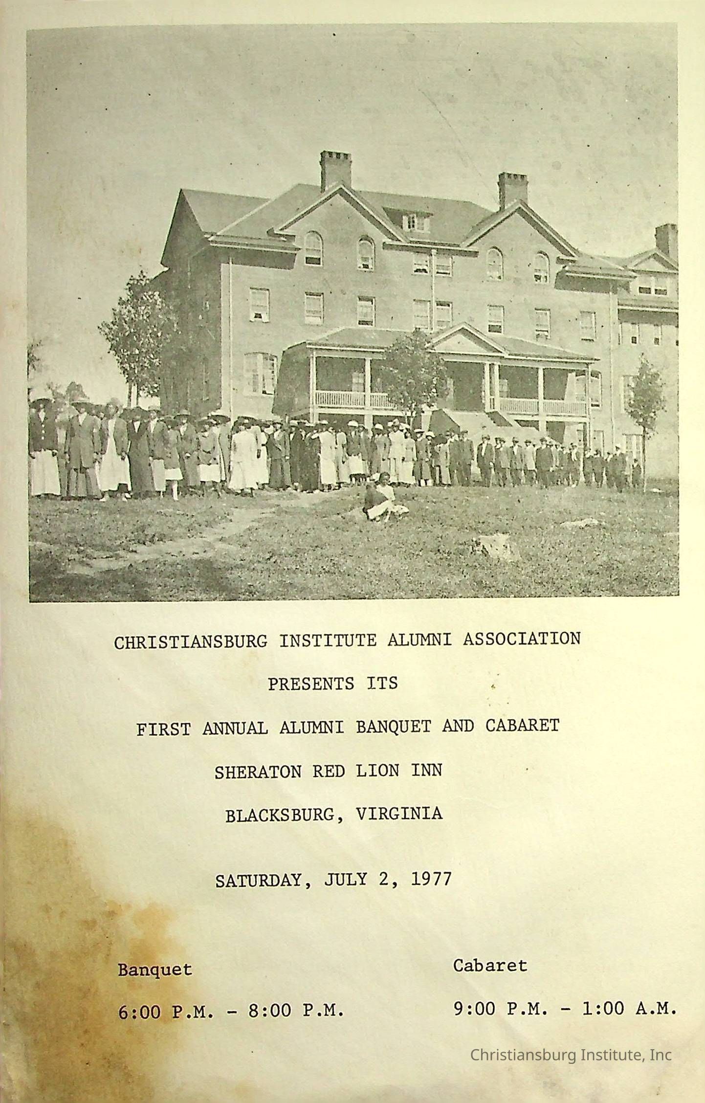 An event program for the first annual alumni banquet and cabaret for the Christiansburg Institute Alumni Association at the Sheraton Red Lion Inn in Blacksburg, Virginia on July 2nd, 1977.Creator