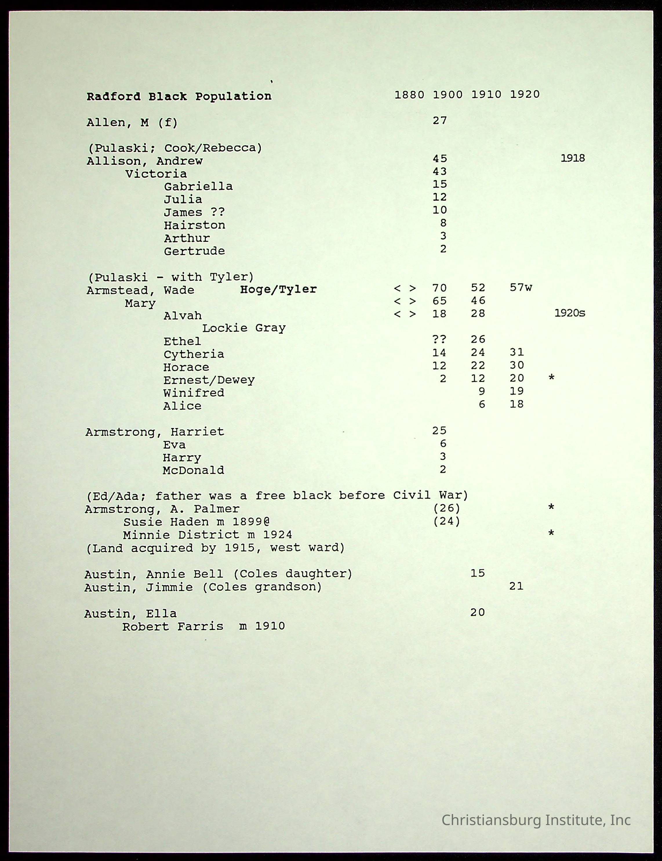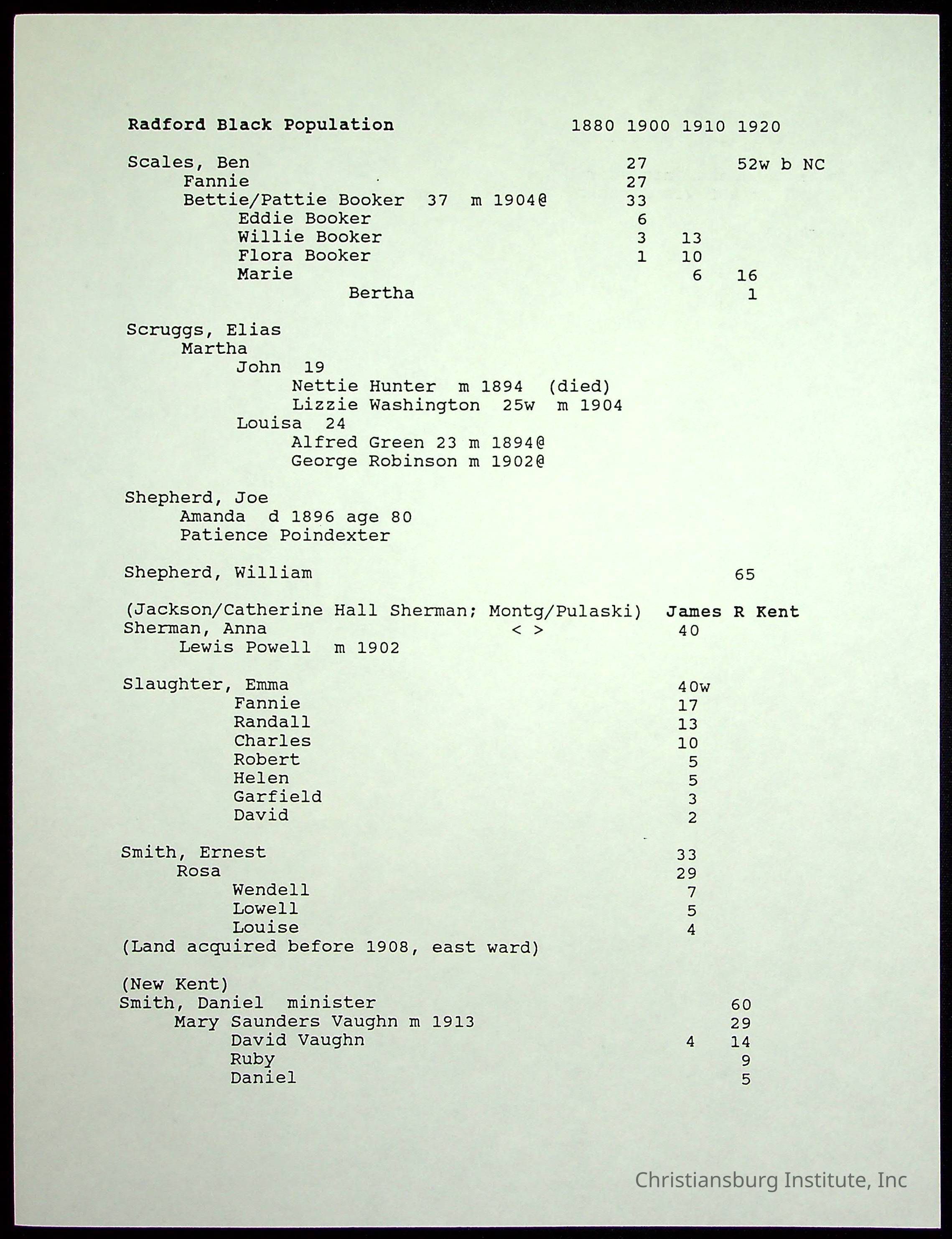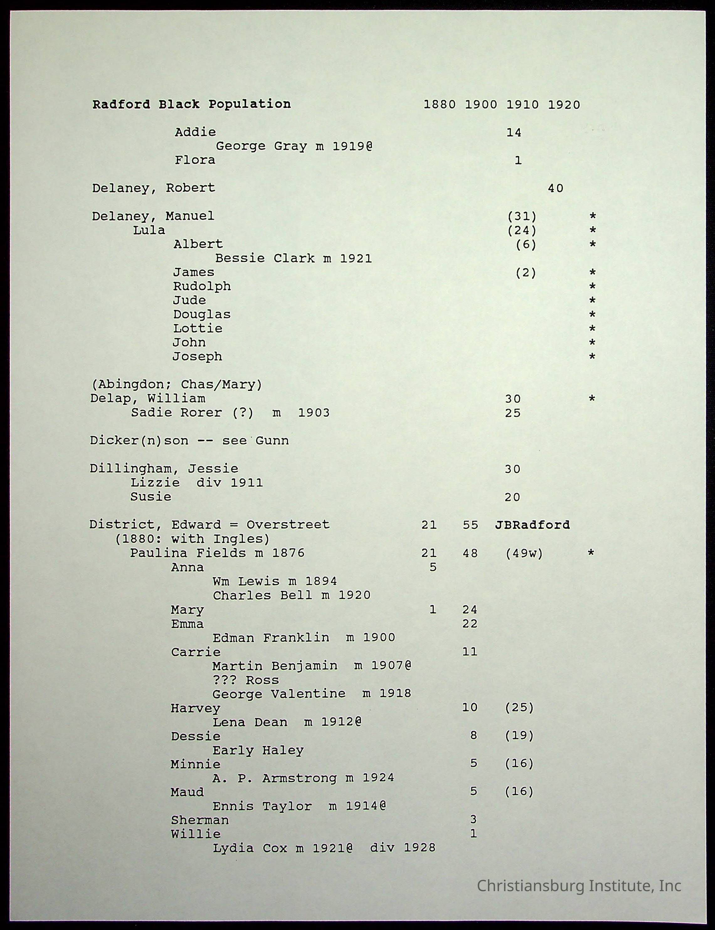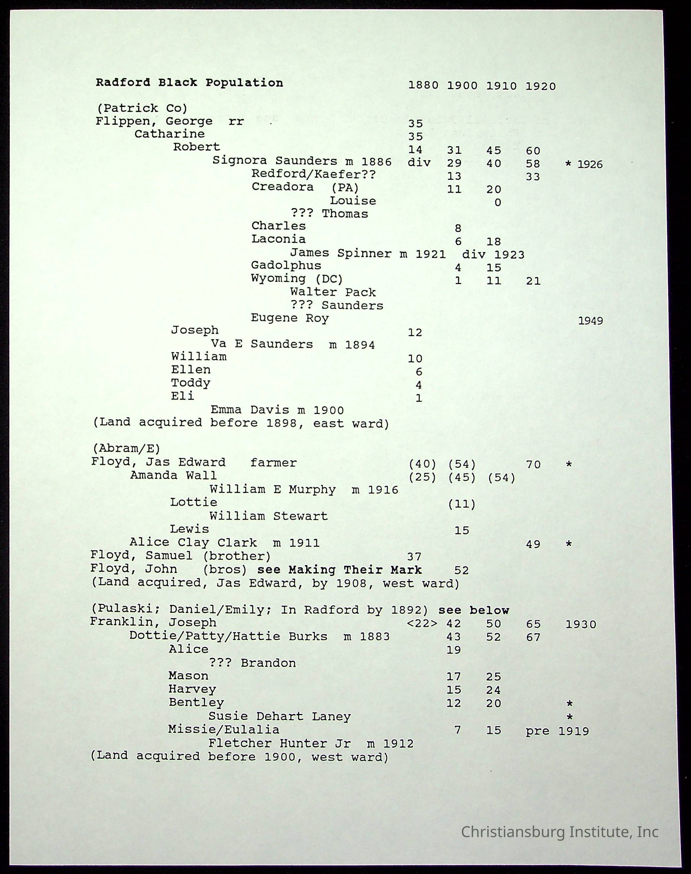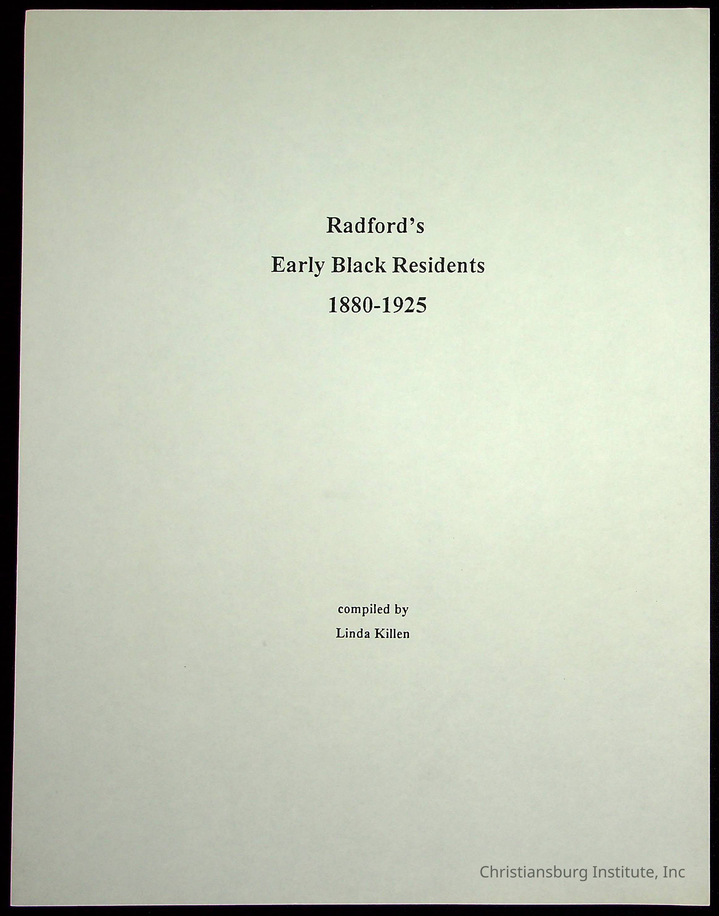 A folder of research materials collected by Radford University professor, Dr Linda Killen. This folder is titled 'Radford's Early Black Residents' and includes Killen's research on the Black population of Radford, Virginia. This research file includes census records.
