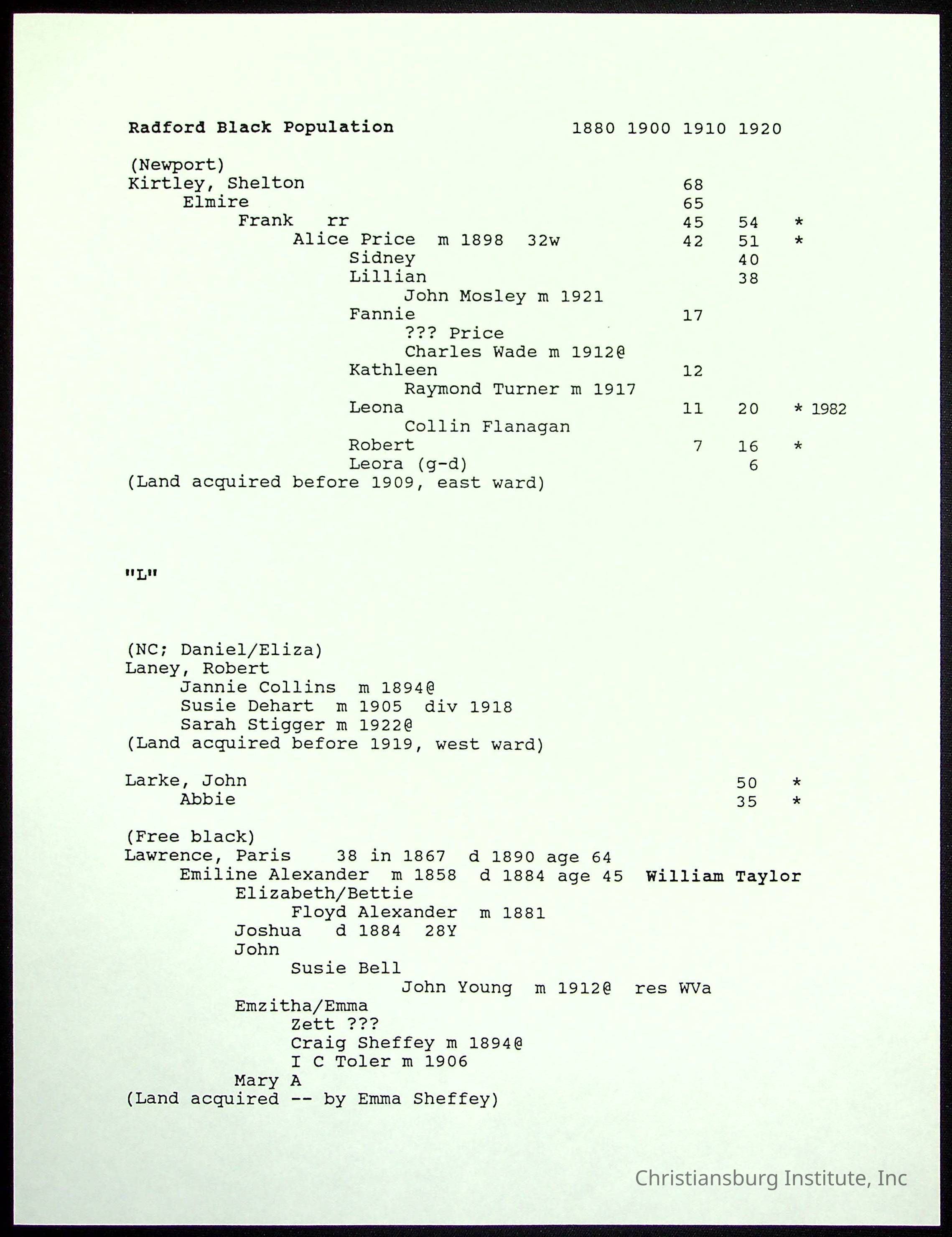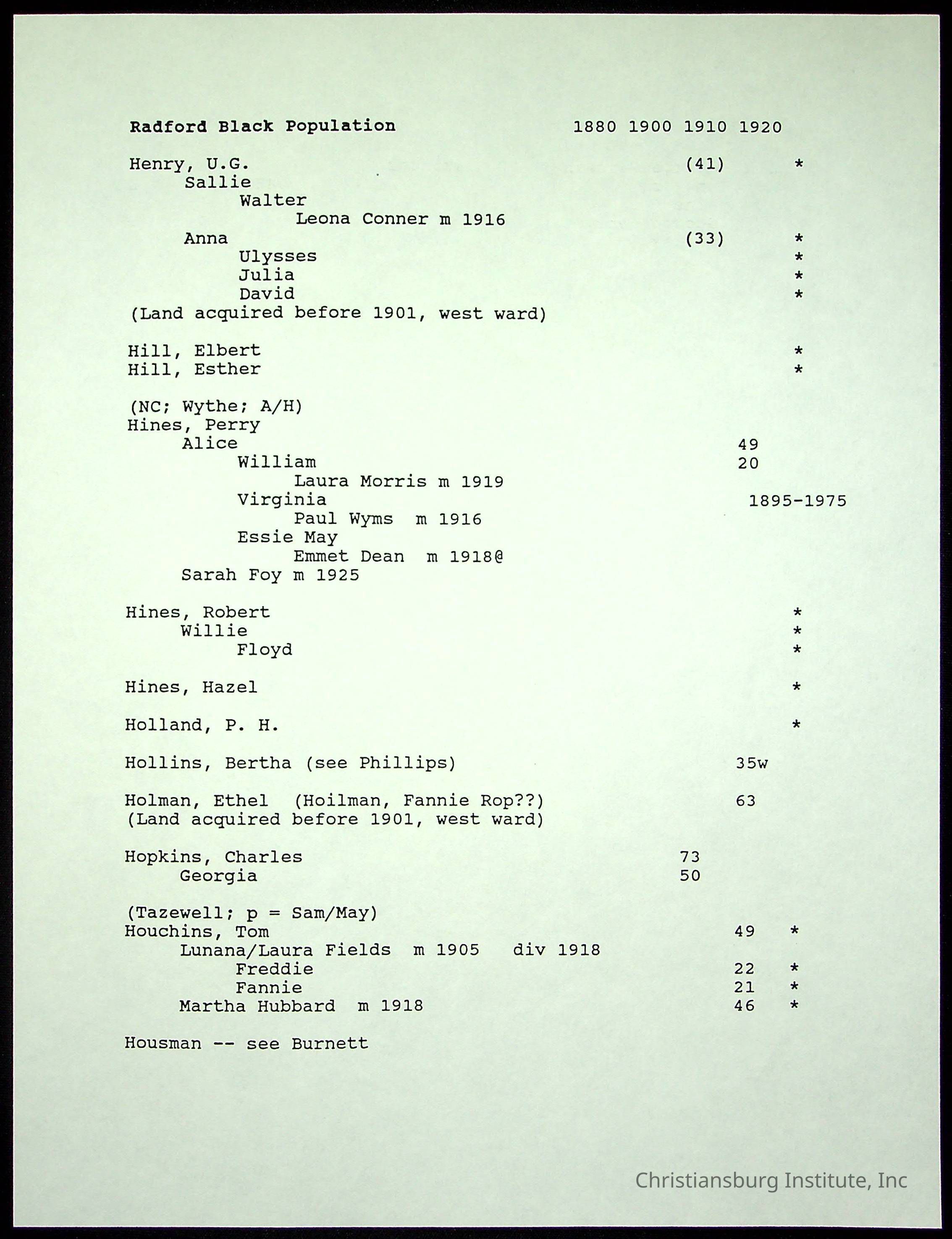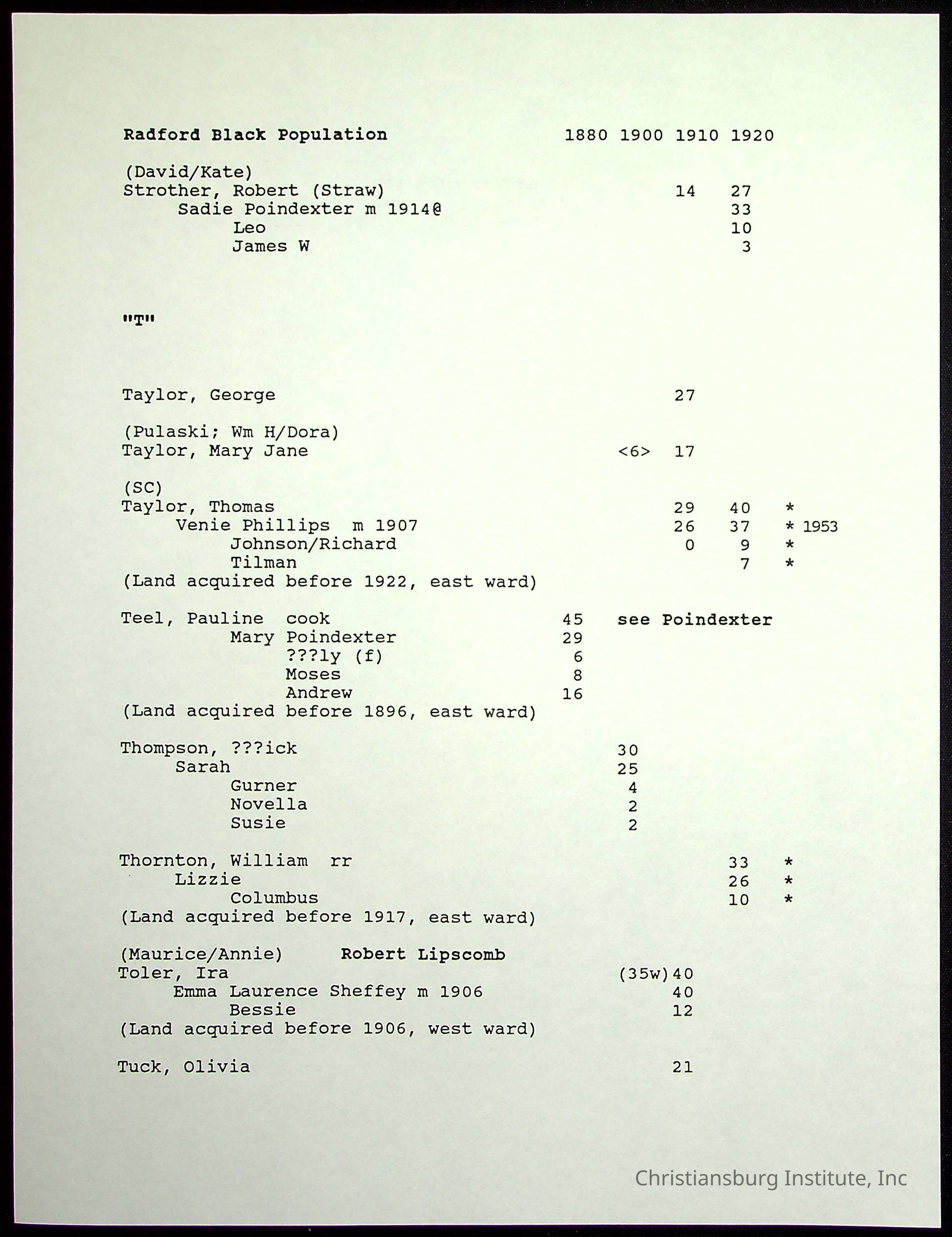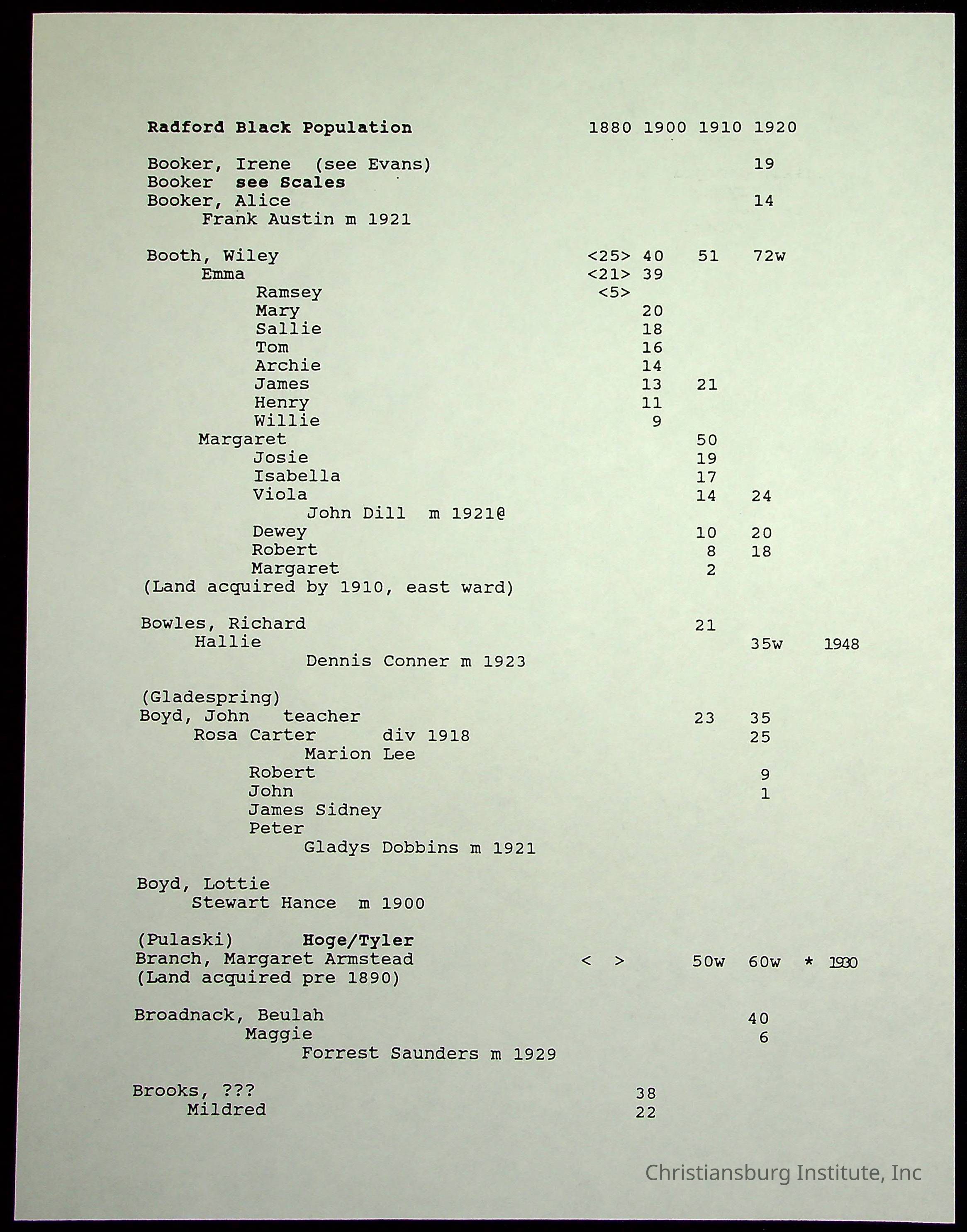 A folder of research materials collected by Radford University professor, Dr Linda Killen. This folder is titled 'Radford's Early Black Residents' and includes Killen's research on the Black population of Radford, Virginia. This research file includes census records.