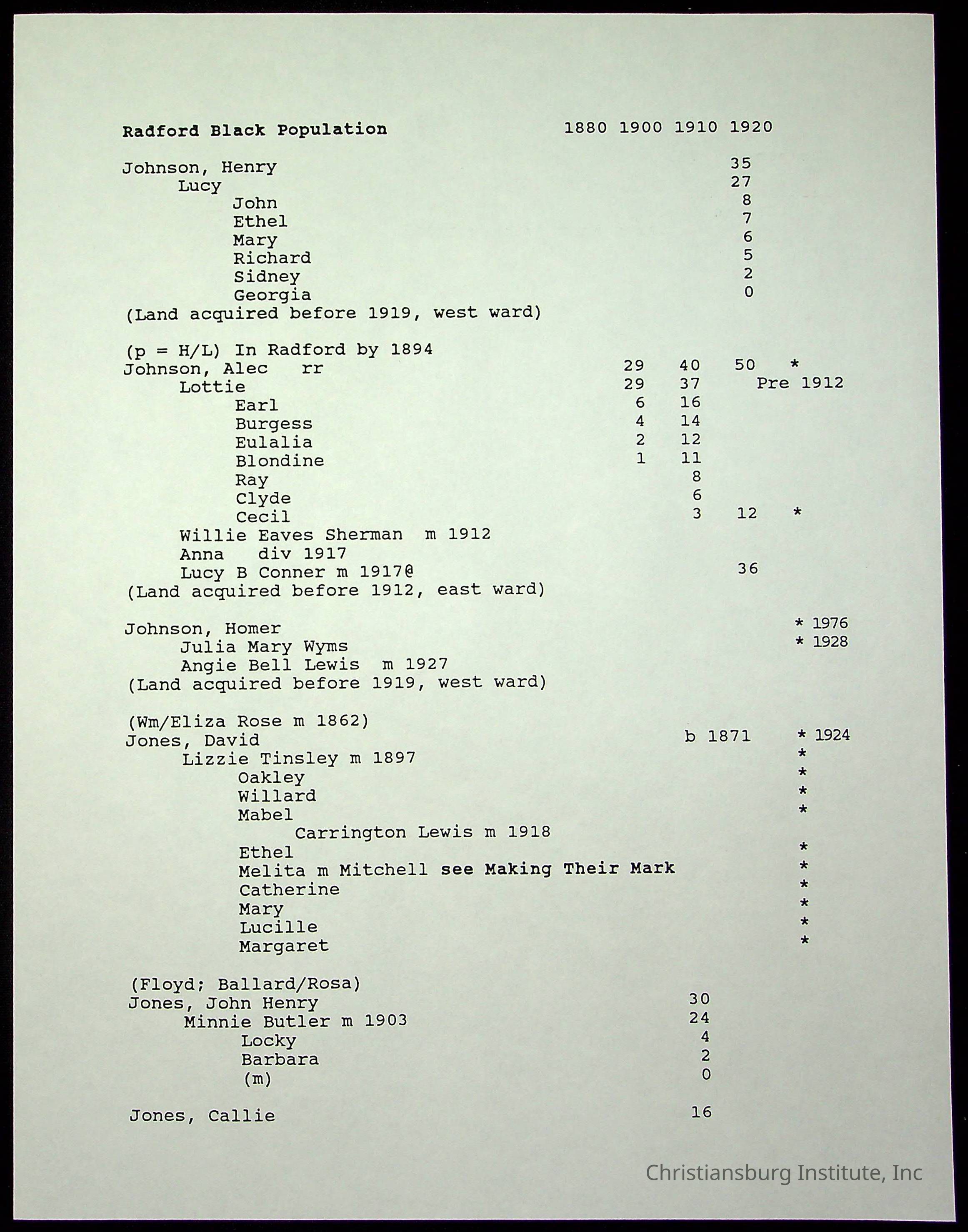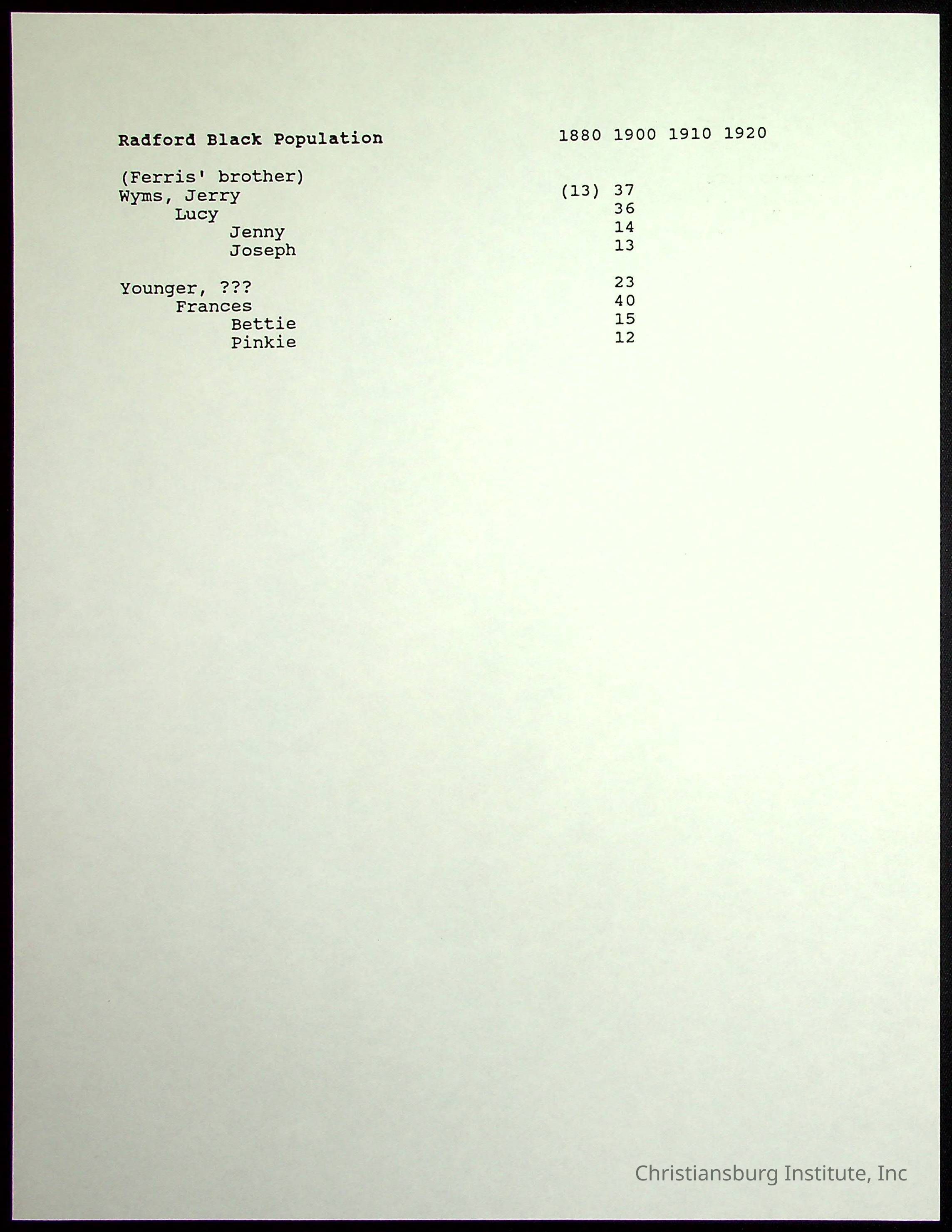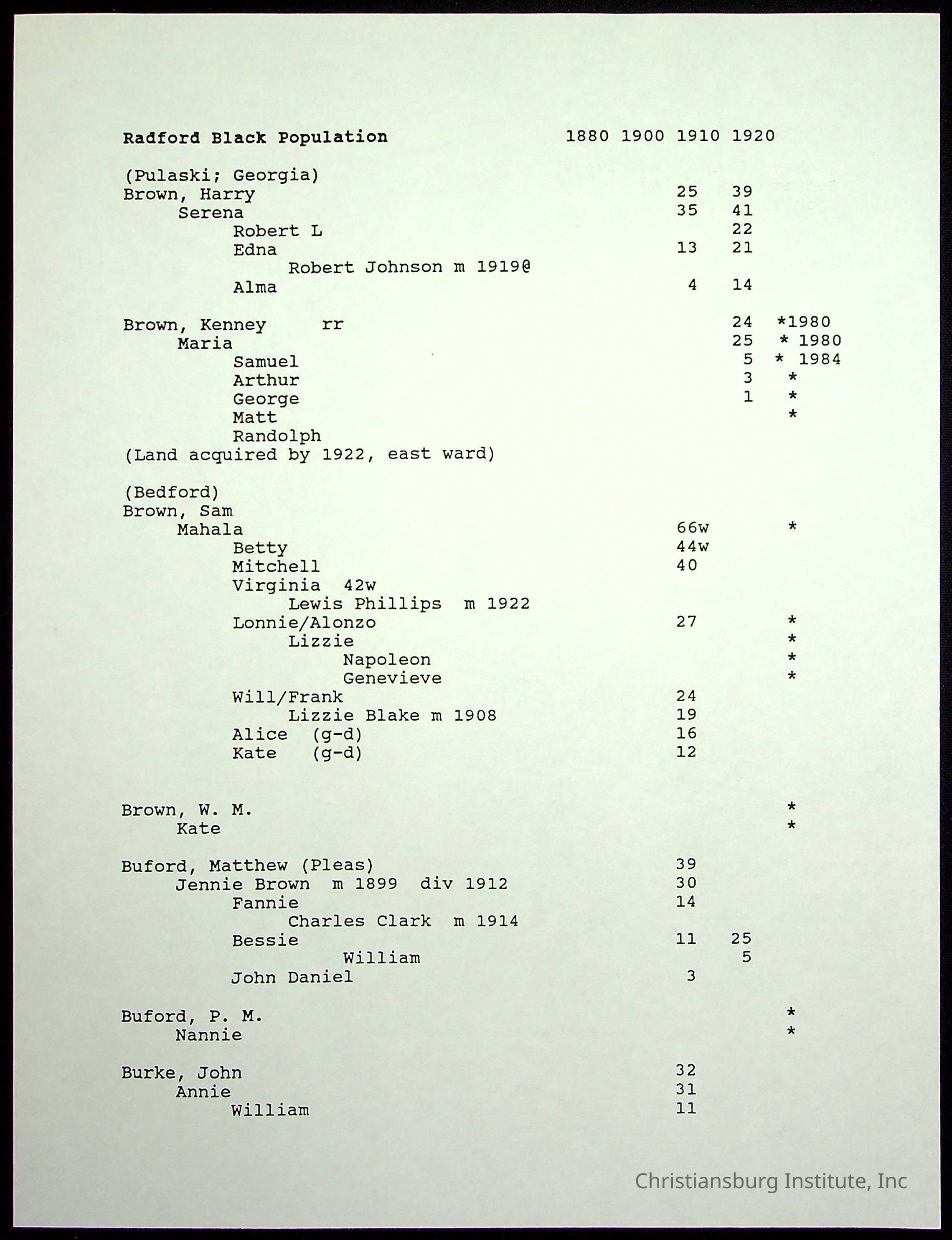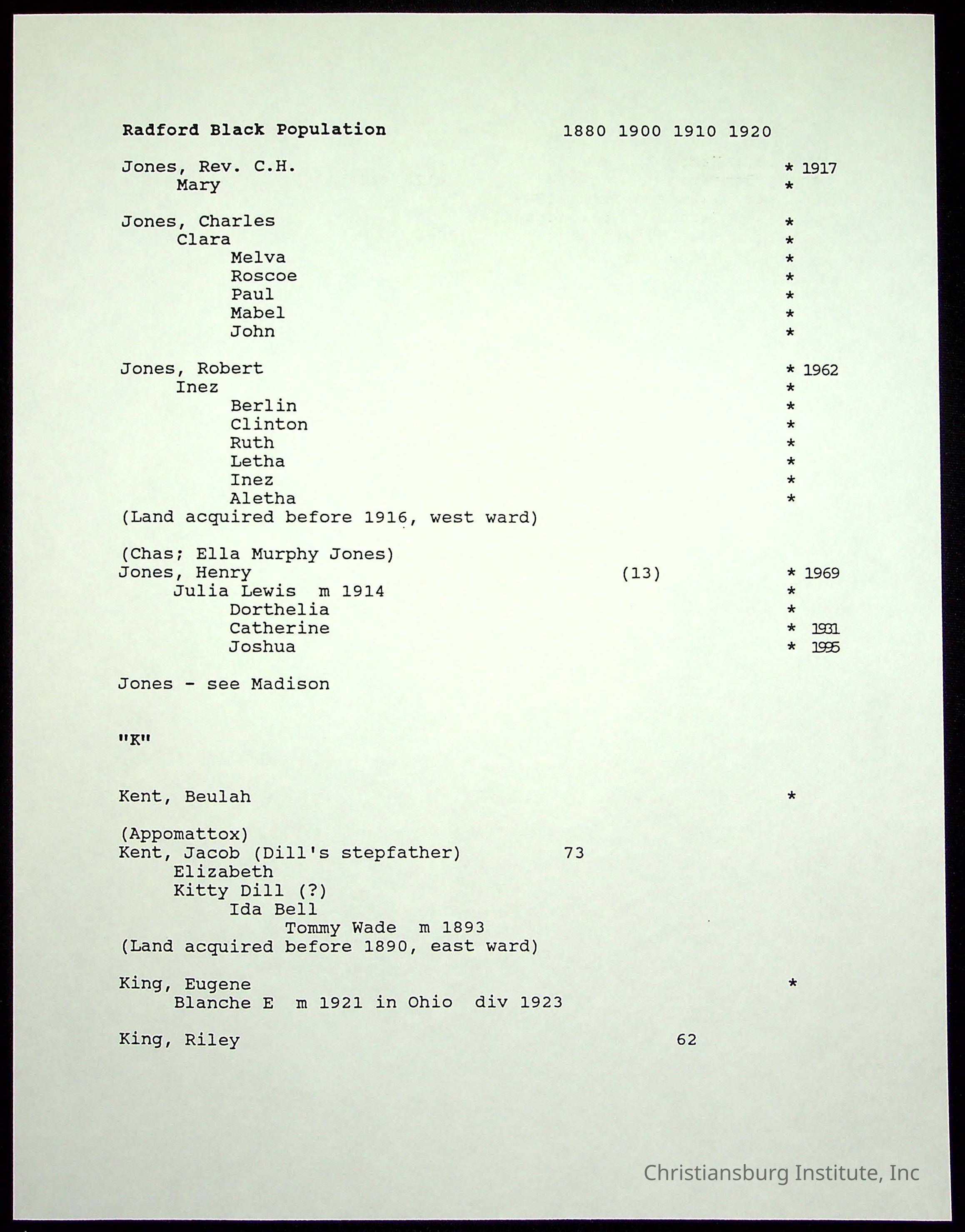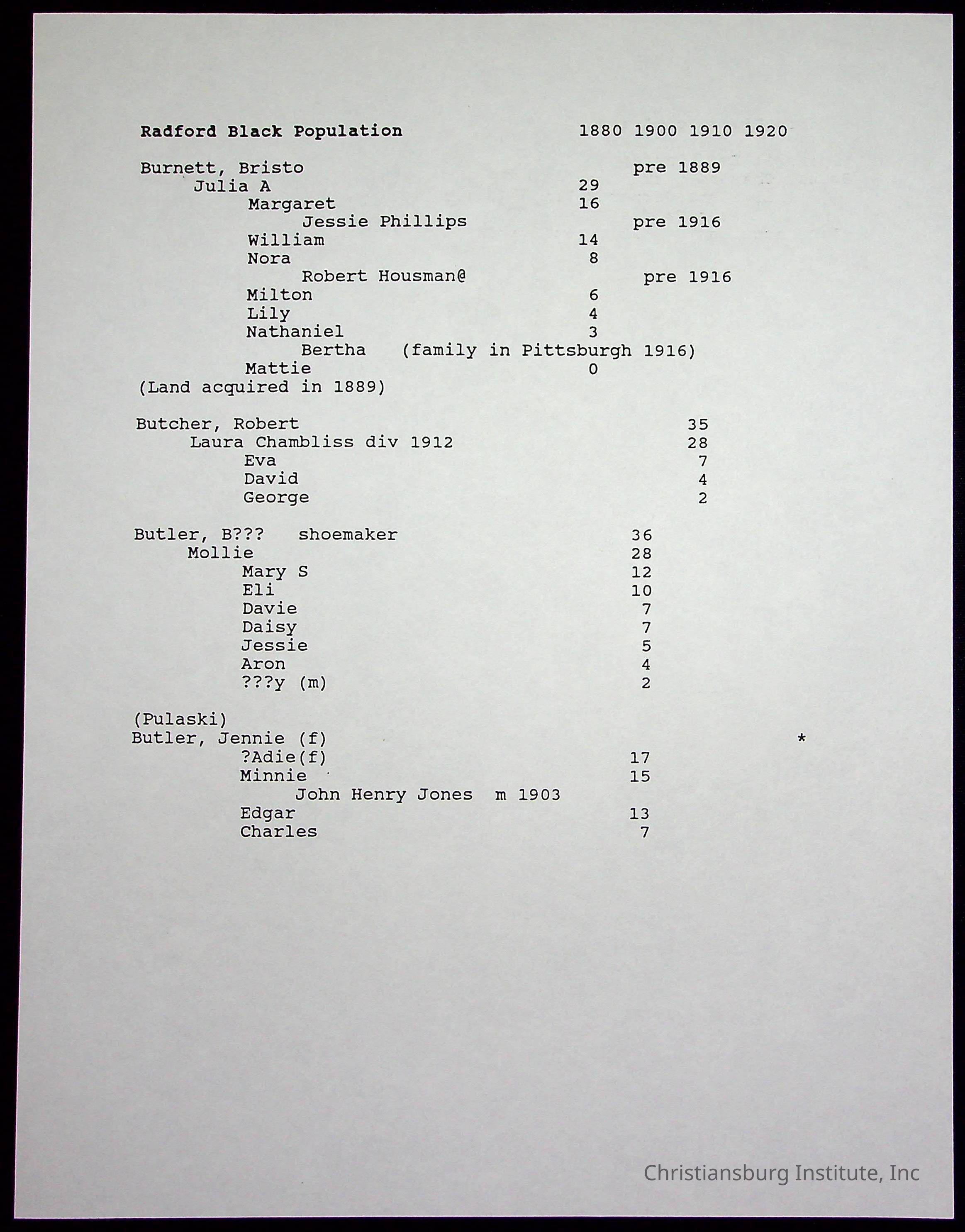 A folder of research materials collected by Radford University professor, Dr Linda Killen. This folder is titled 'Radford's Early Black Residents' and includes Killen's research on the Black population of Radford, Virginia. This research file includes census records.