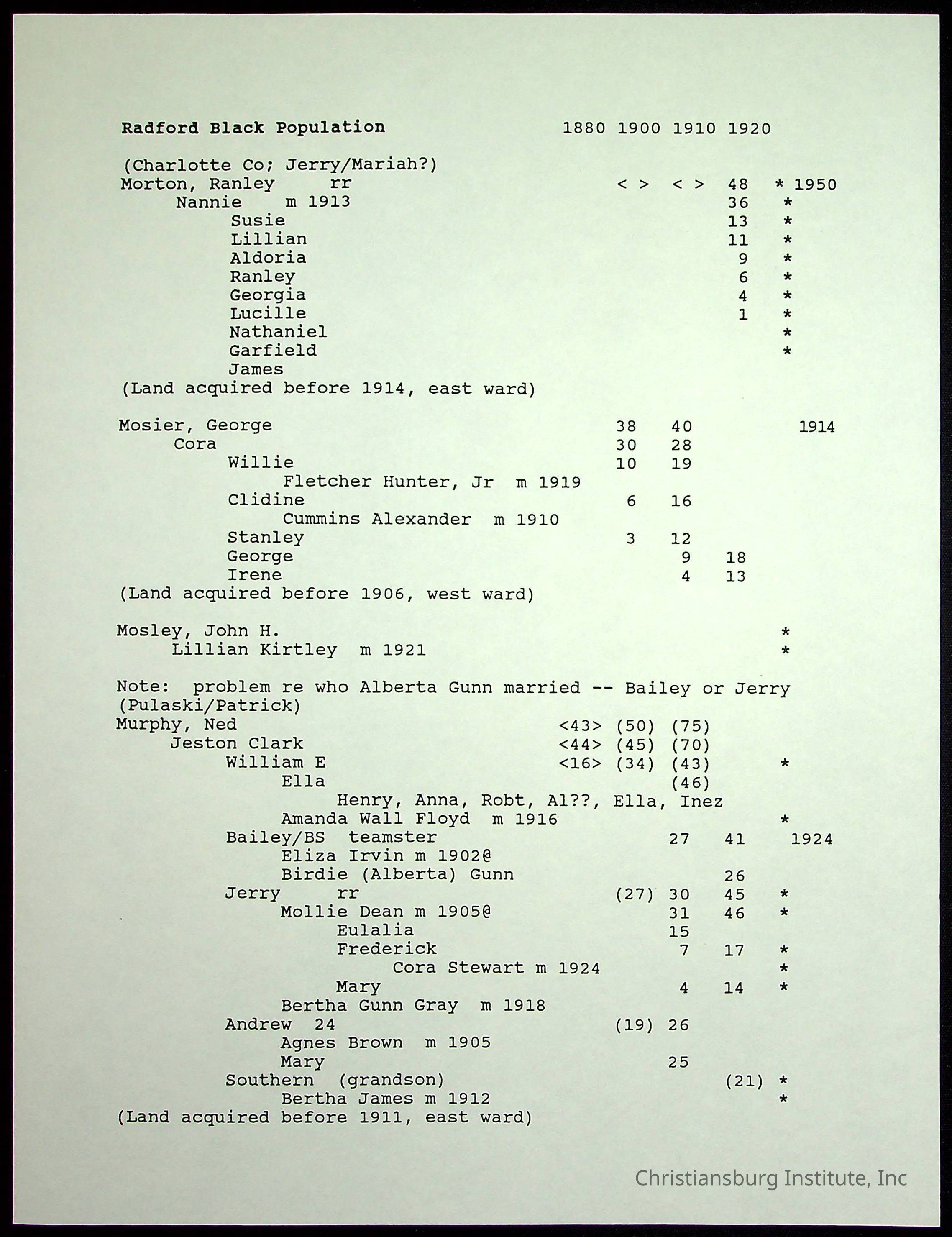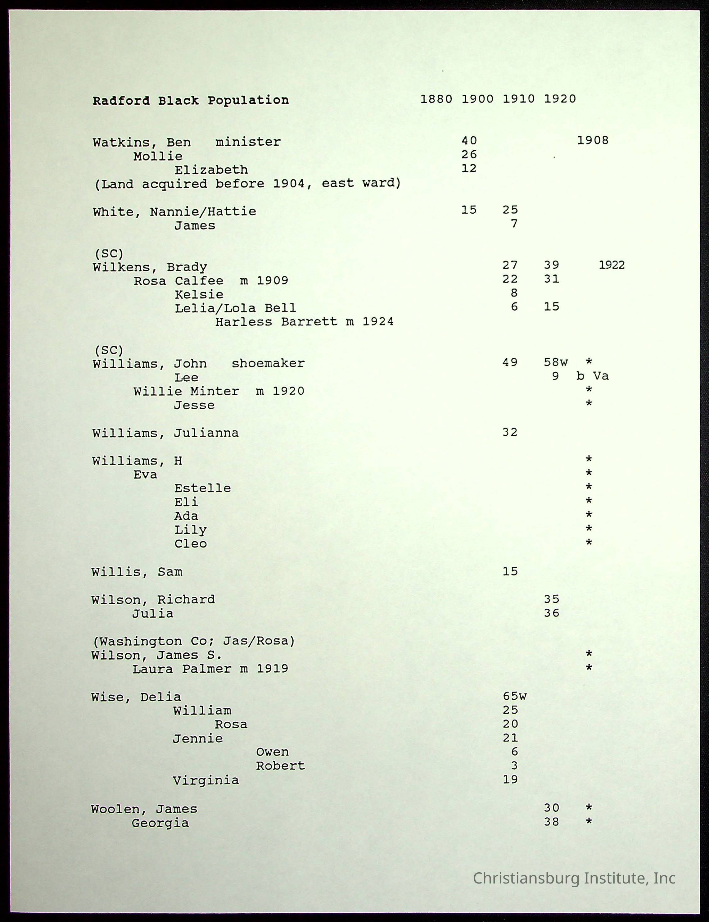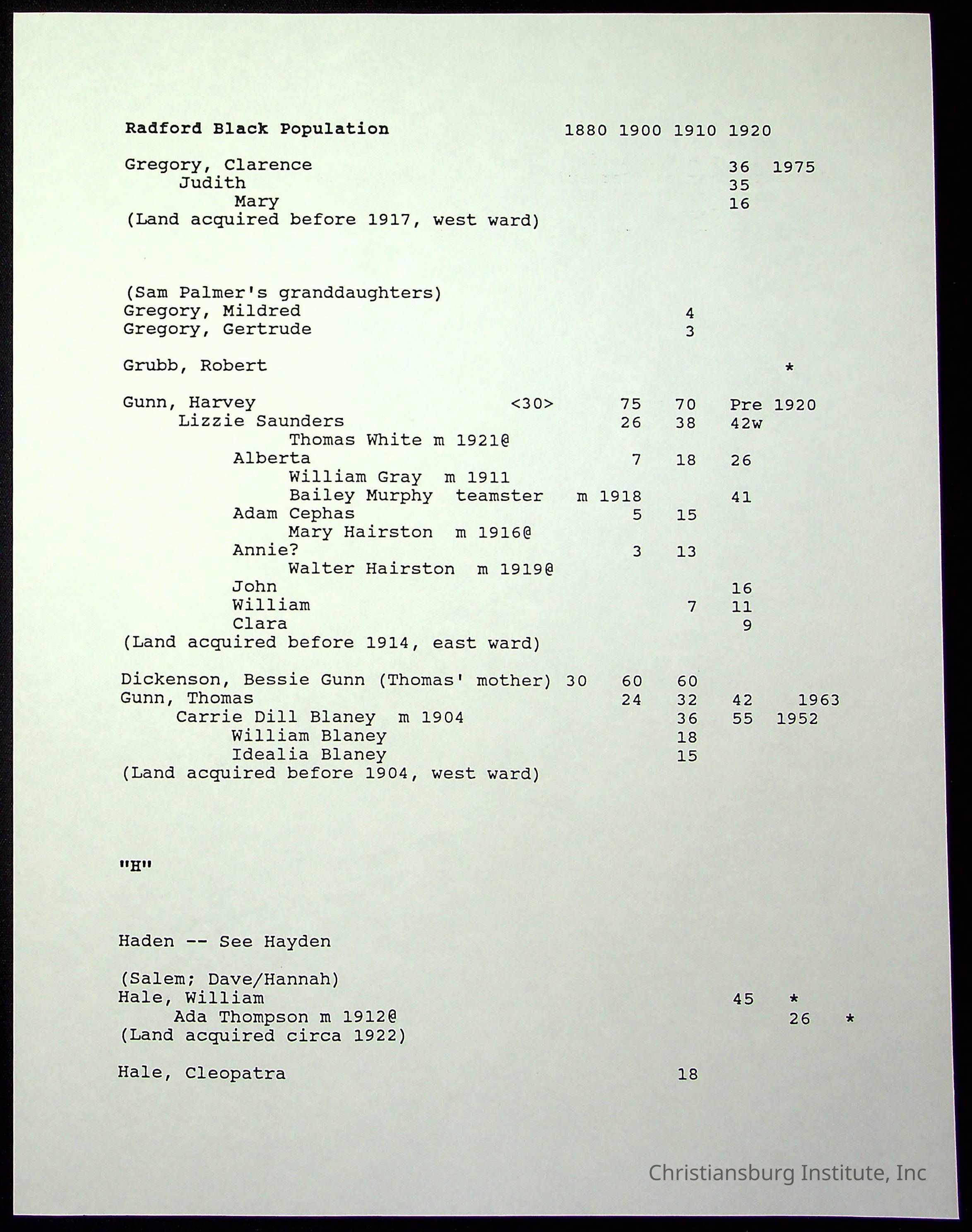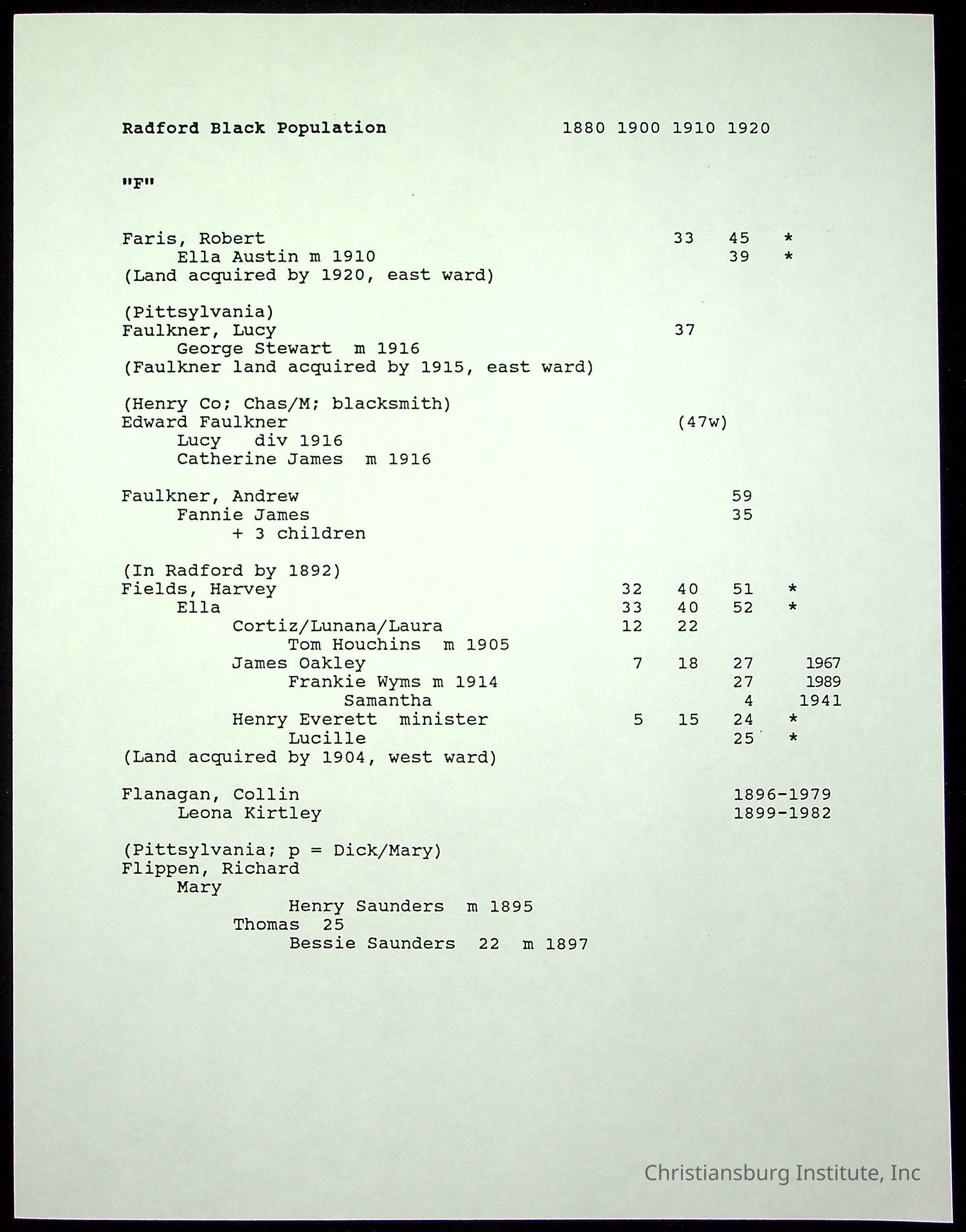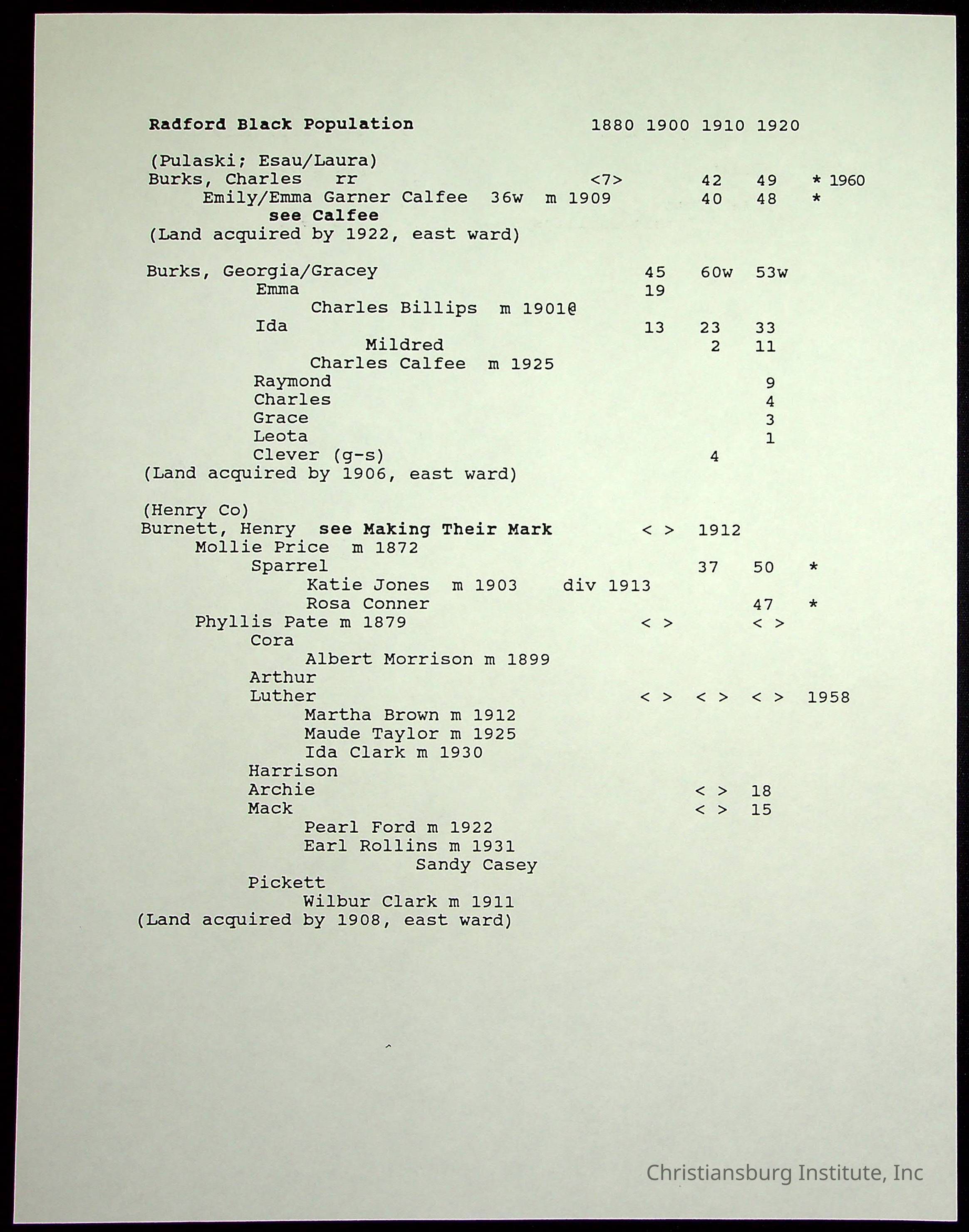 A folder of research materials collected by Radford University professor, Dr Linda Killen. This folder is titled 'Radford's Early Black Residents' and includes Killen's research on the Black population of Radford, Virginia. This research file includes census records.
