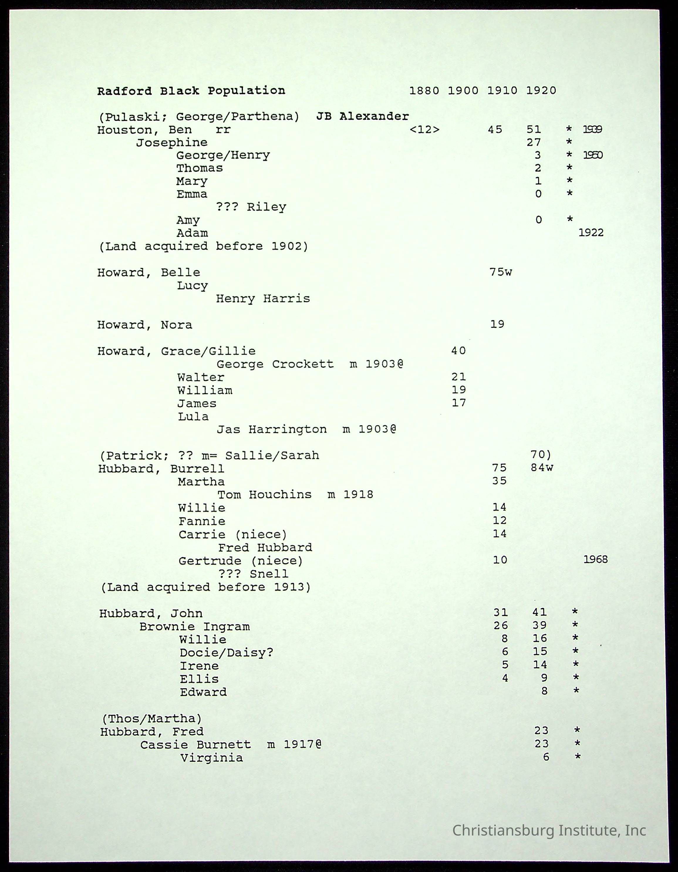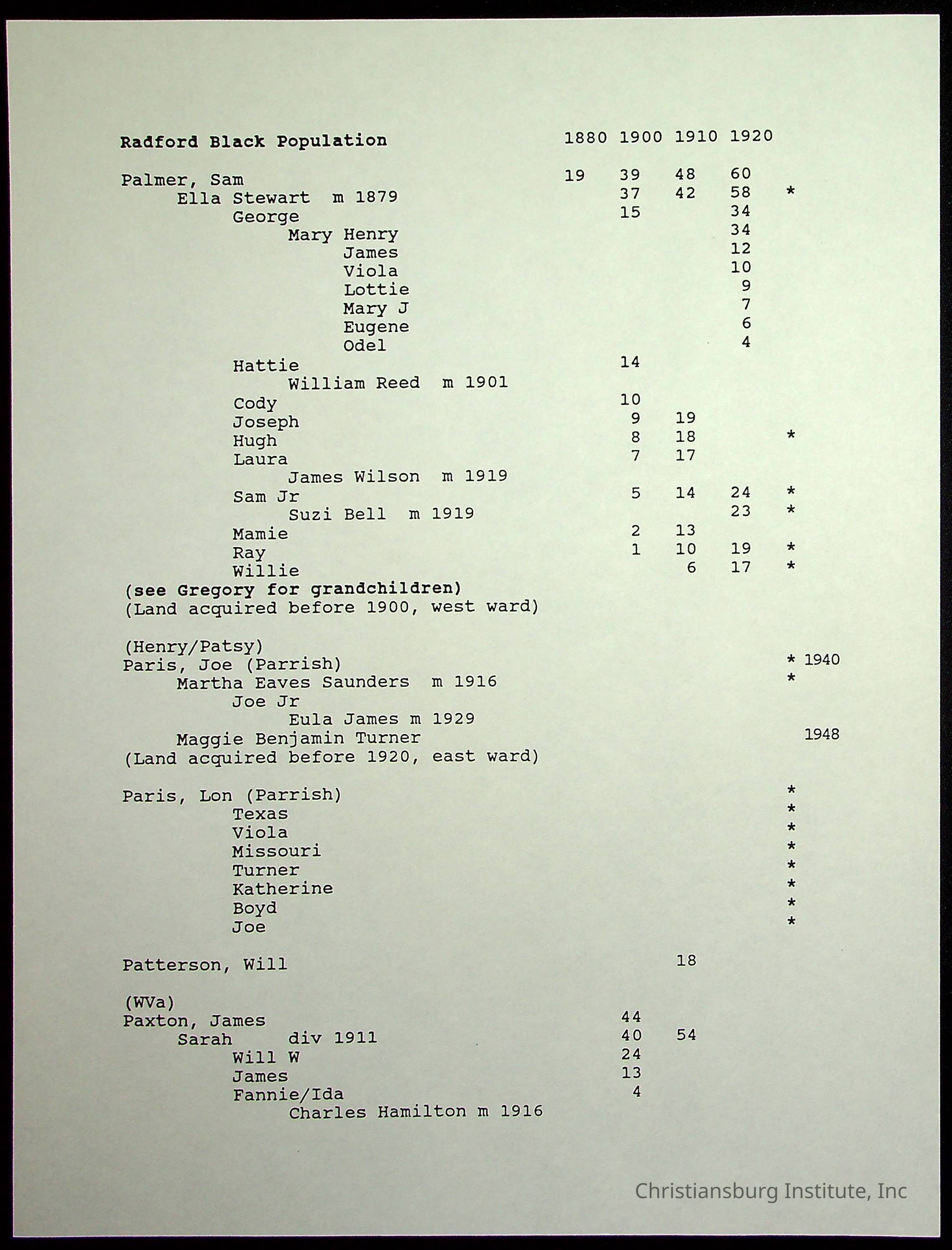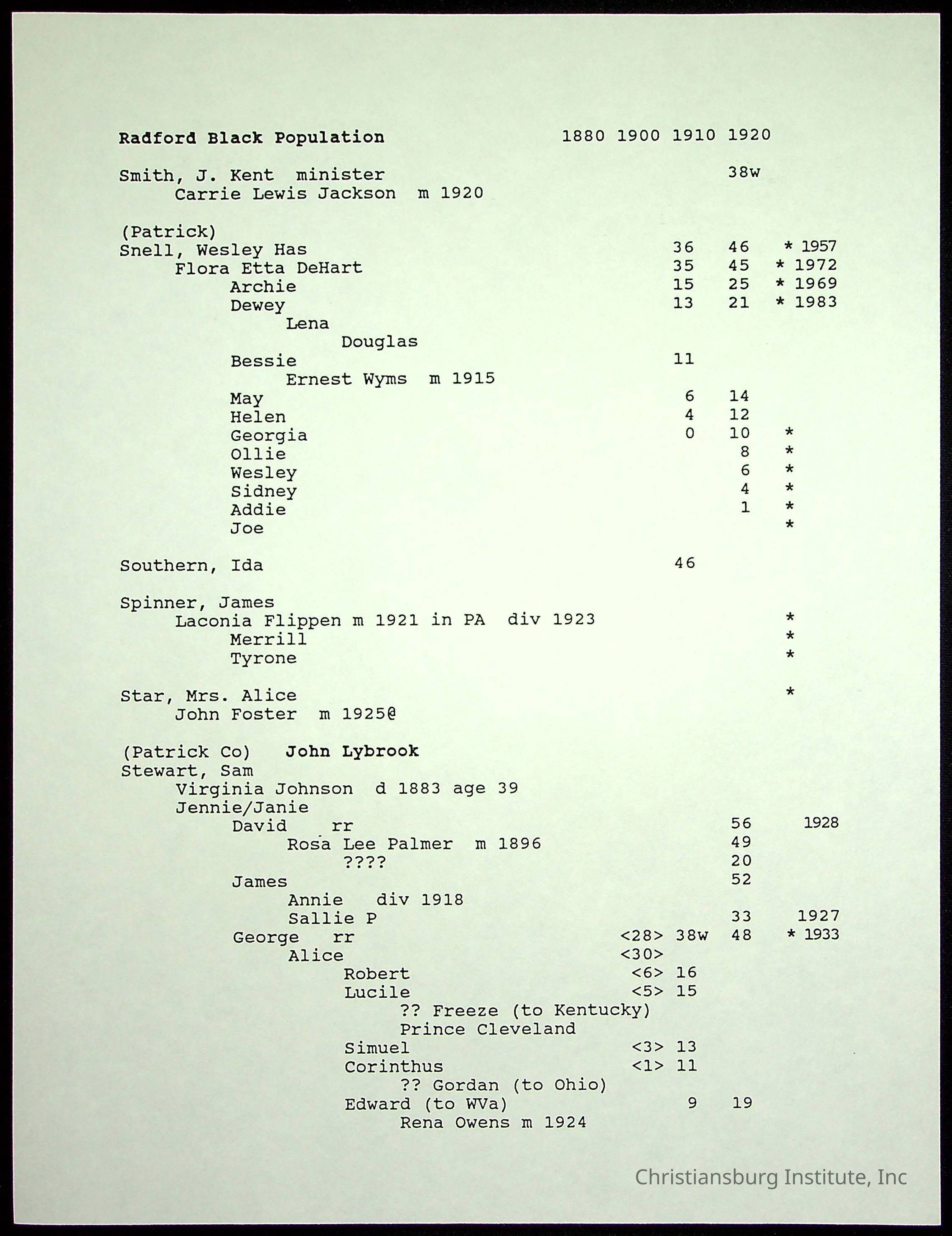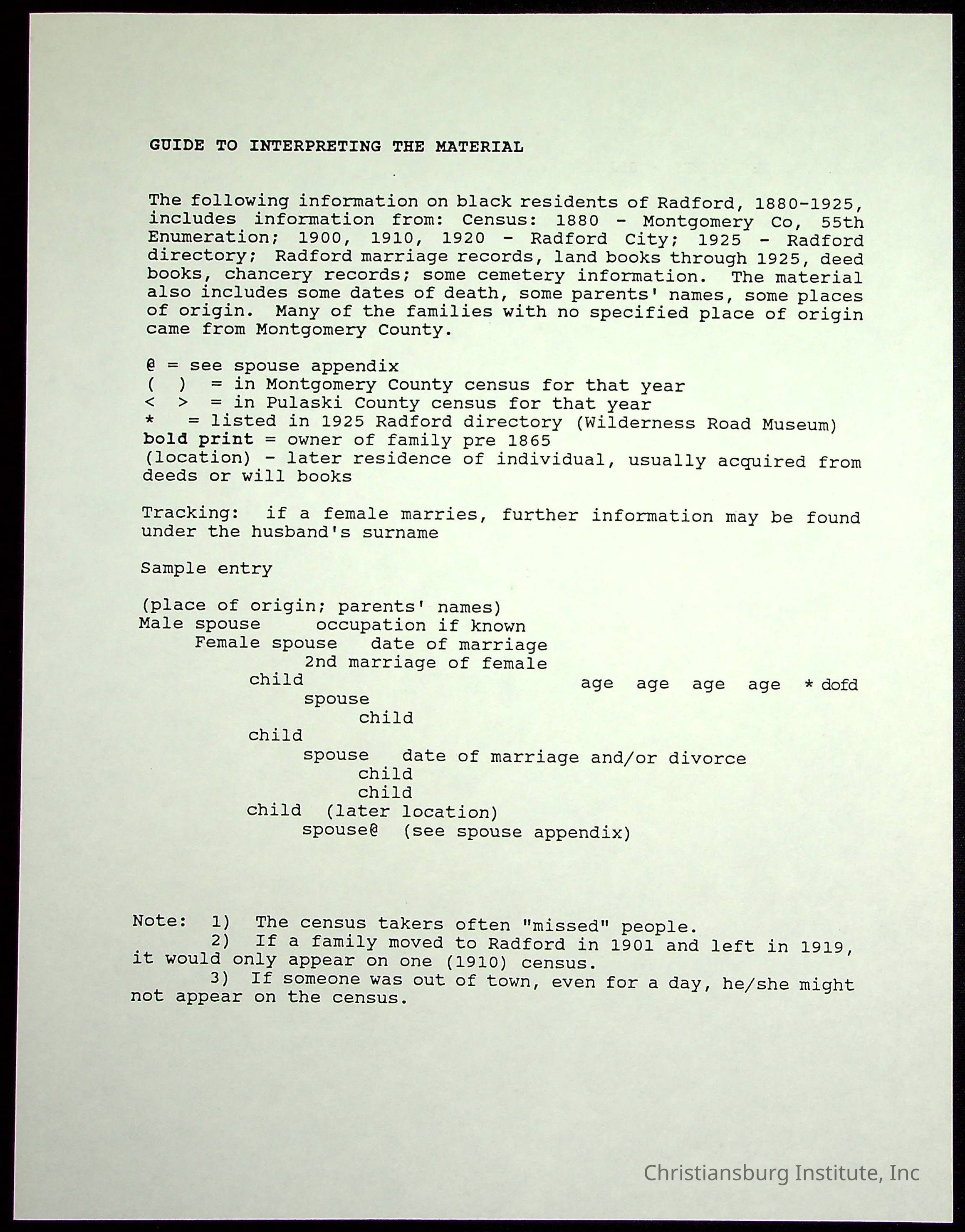 A folder of research materials collected by Radford University professor, Dr Linda Killen. This folder is titled 'Radford's Early Black Residents' and includes Killen's research on the Black population of Radford, Virginia. This research file includes census records.
